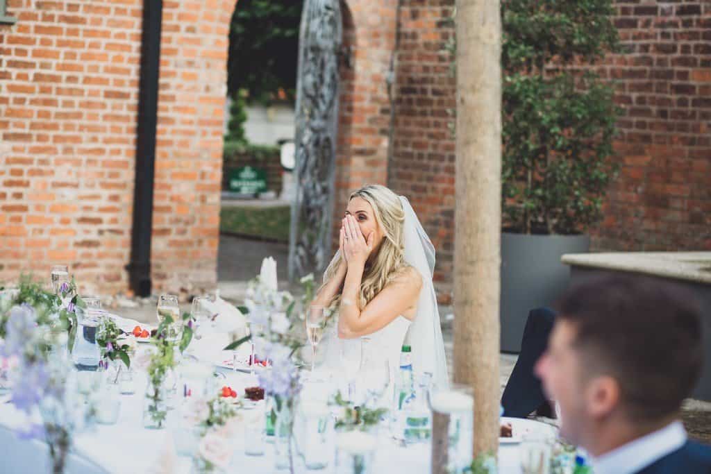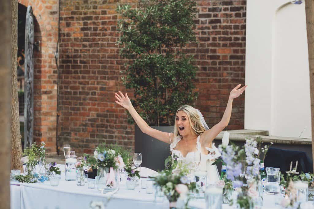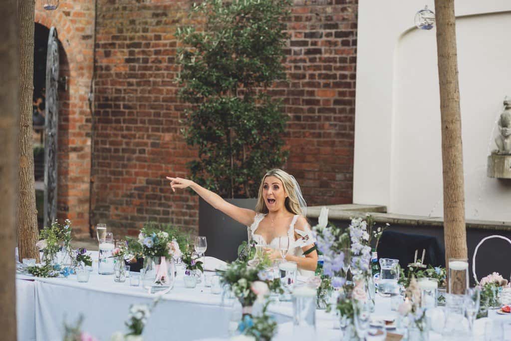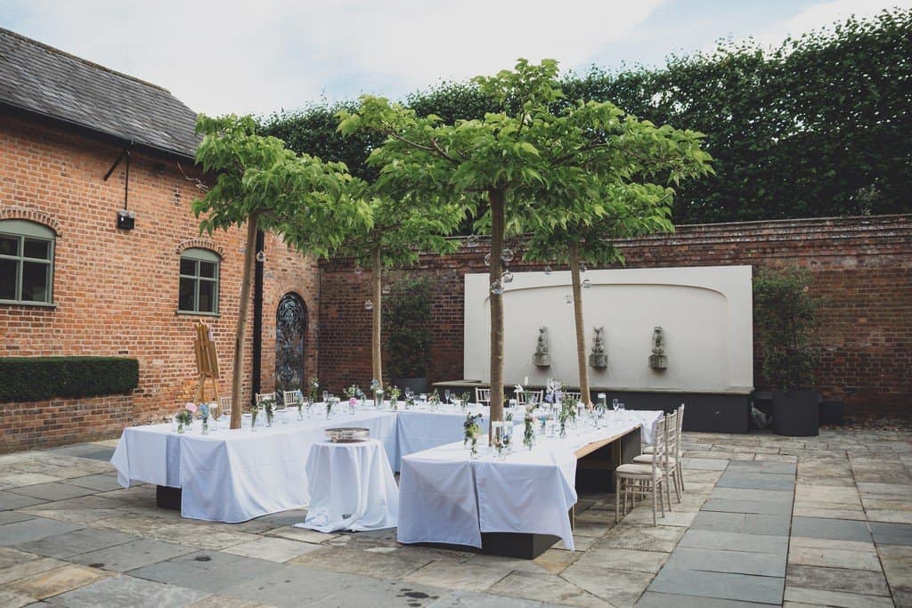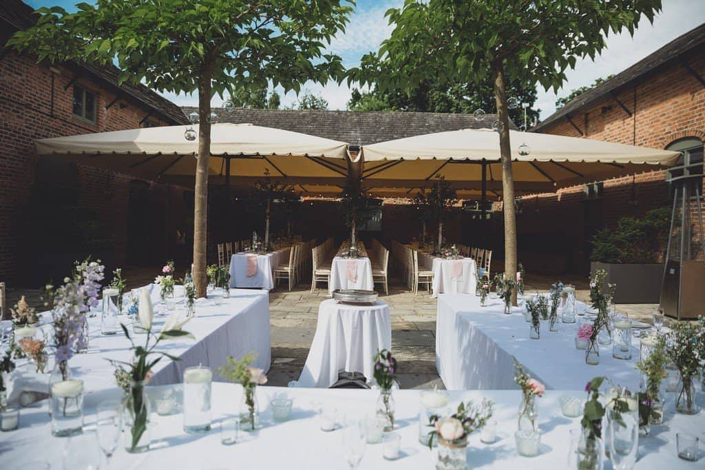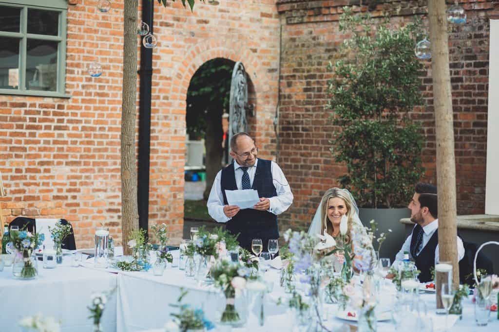 The courtyard had been beautifully decorated with long banqueting style tables and festoon lights and it looked amazing with the pale pink and blue flowers that complimented the bridesmaid’s dresses and Jade’s bouquet.