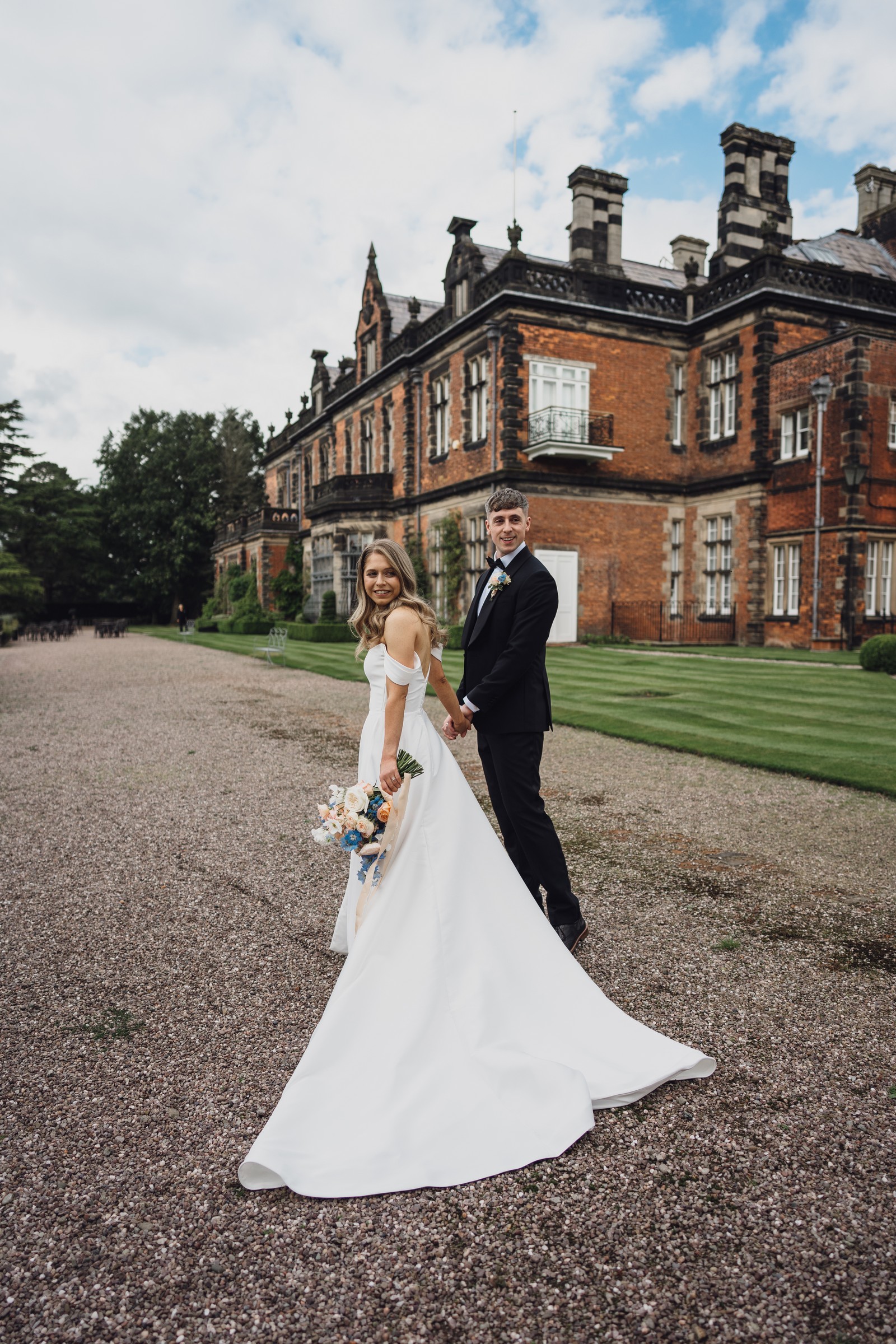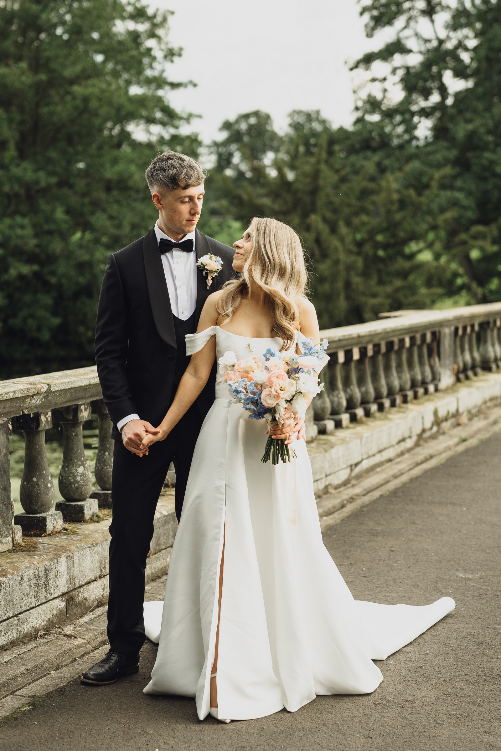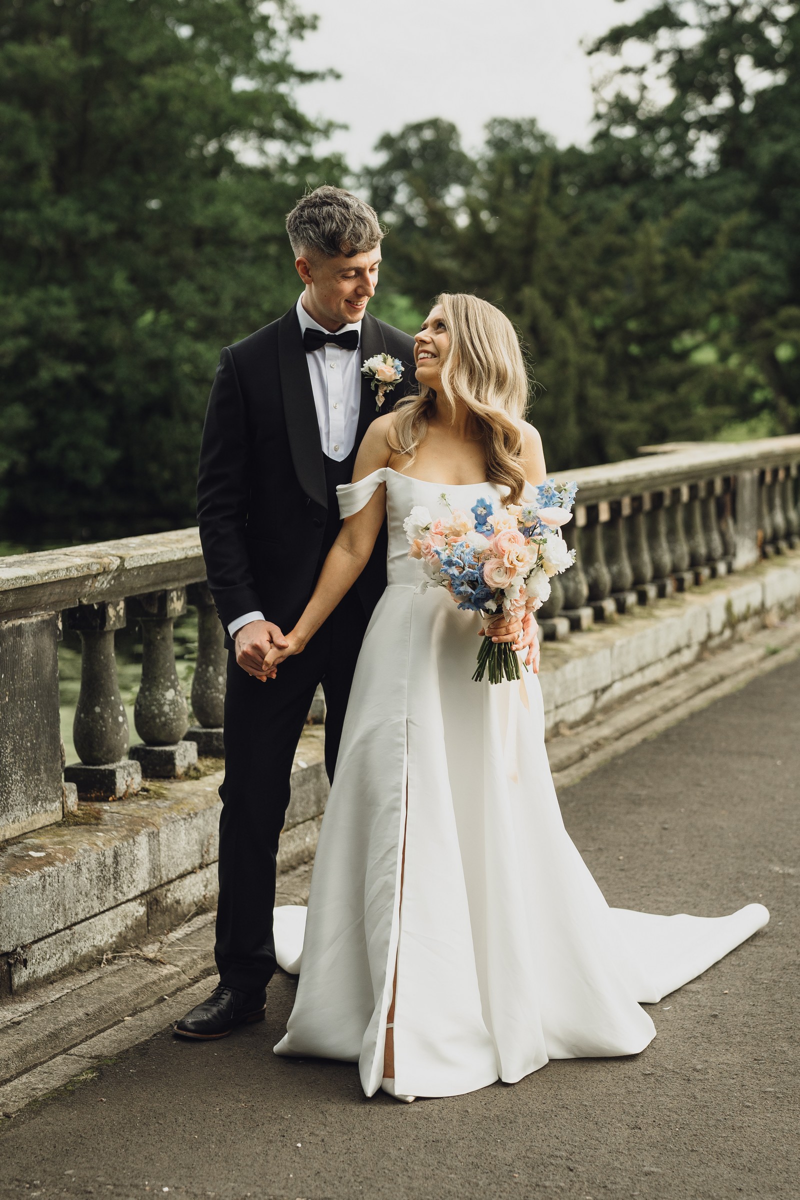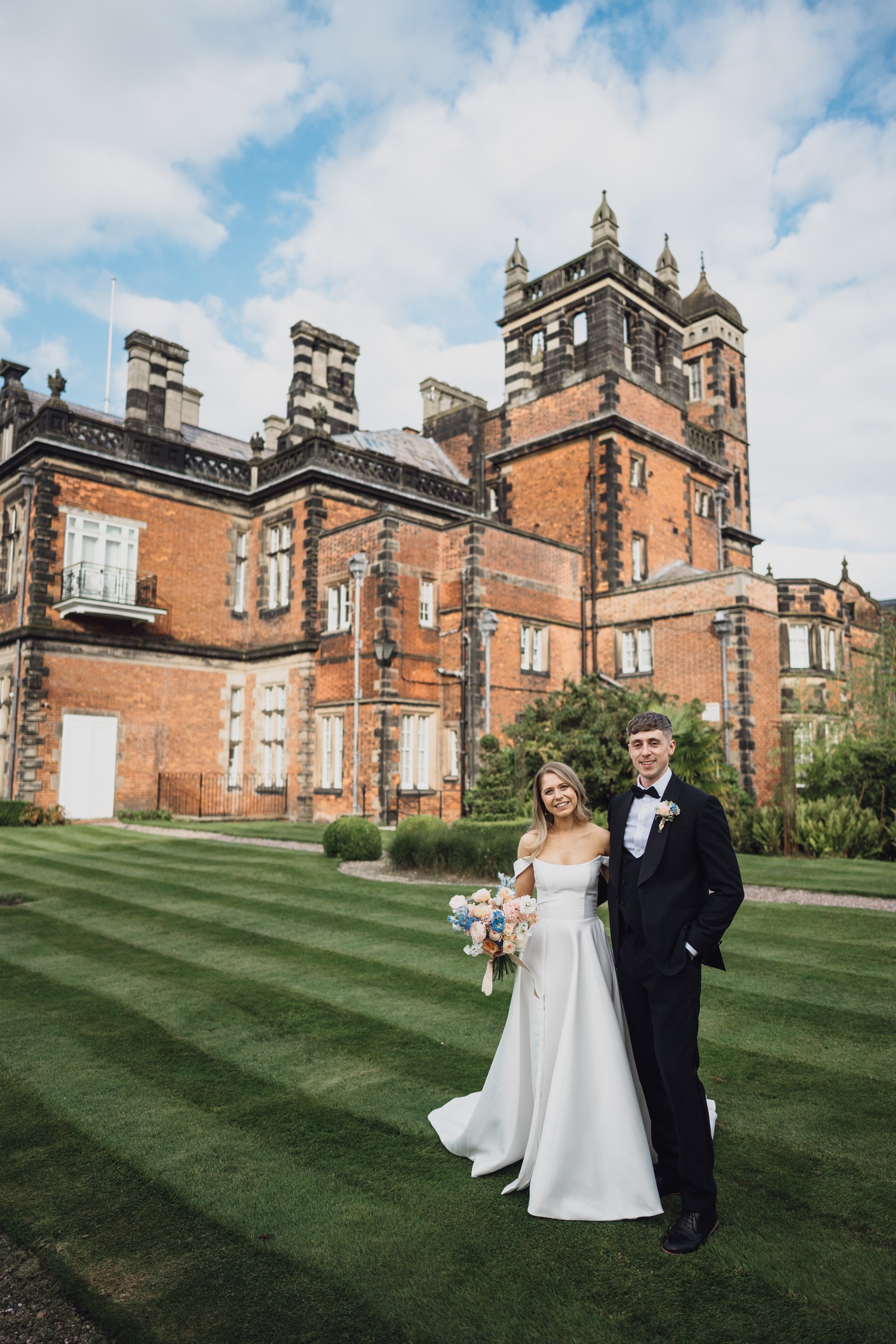 Capesthorne Hall, an impressive manor house nestled in the Cheshire countryside, provided a breathtaking backdrop for their nuptials. The venue’s grandeur is evident from the moment you approach, with its beautifully landscaped gardens, tranquil river, and picturesque bridge. Inside, the hall boasts a bold yellow staircase, offering a striking setting for wedding photographs. The ornate ceremony room, bathed in beautiful light, added to the day’s elegance.