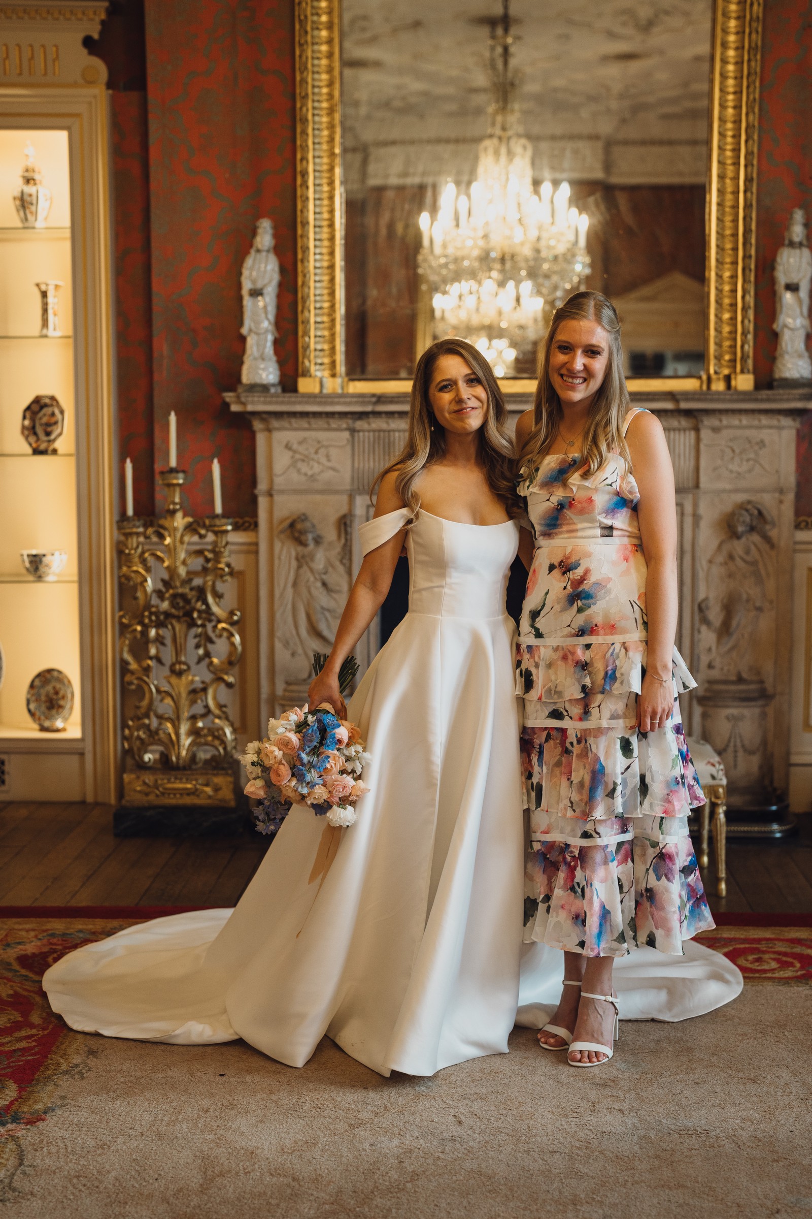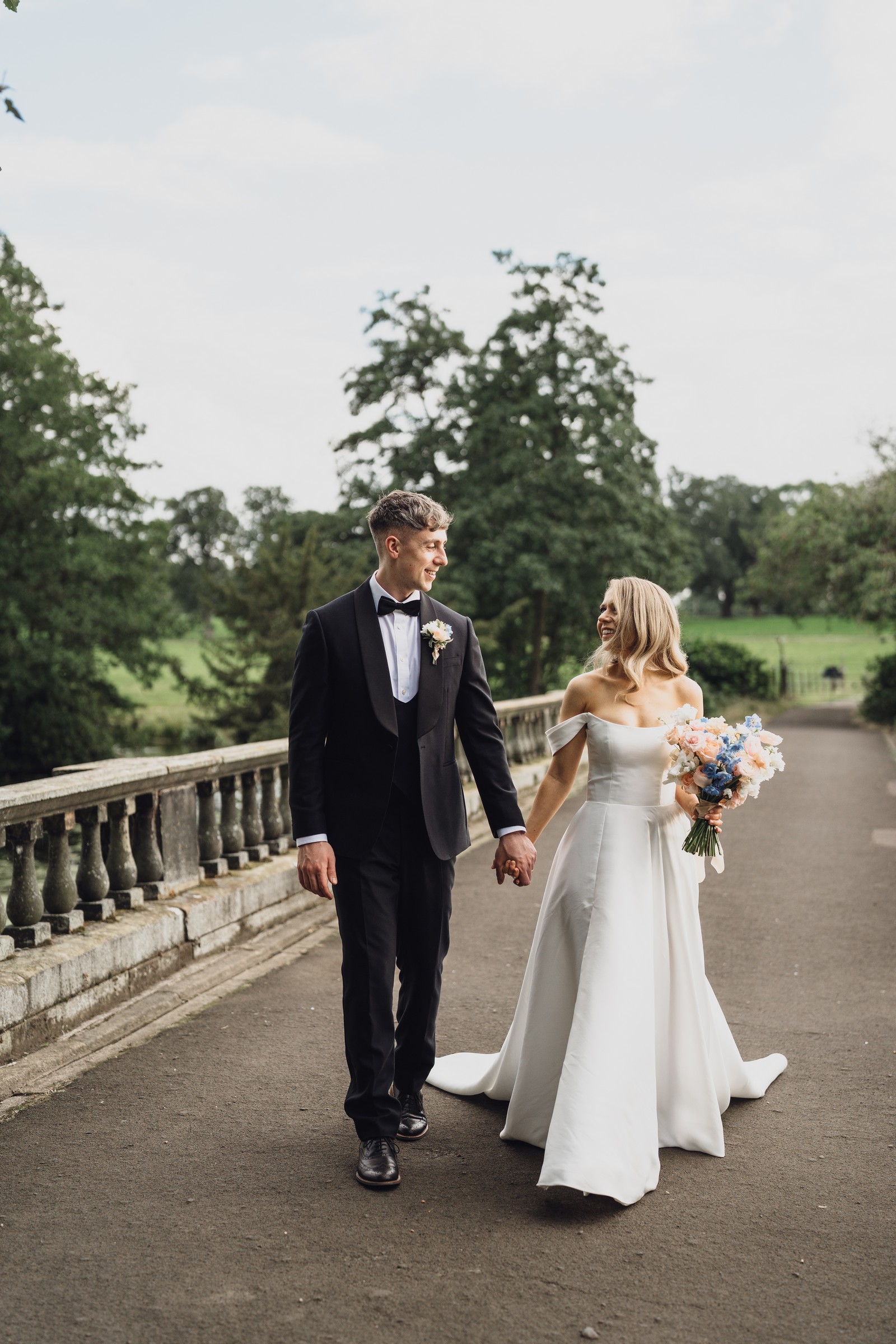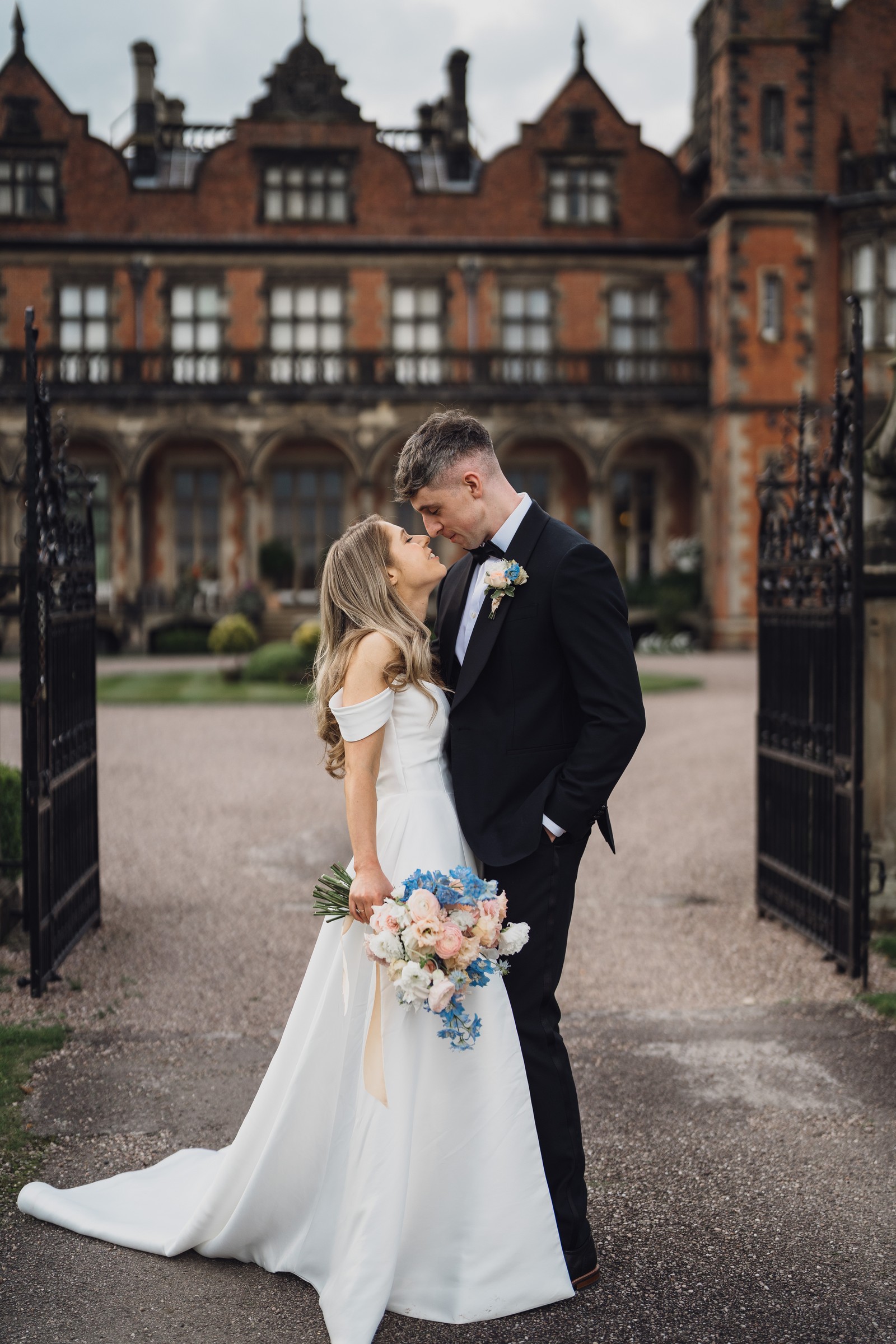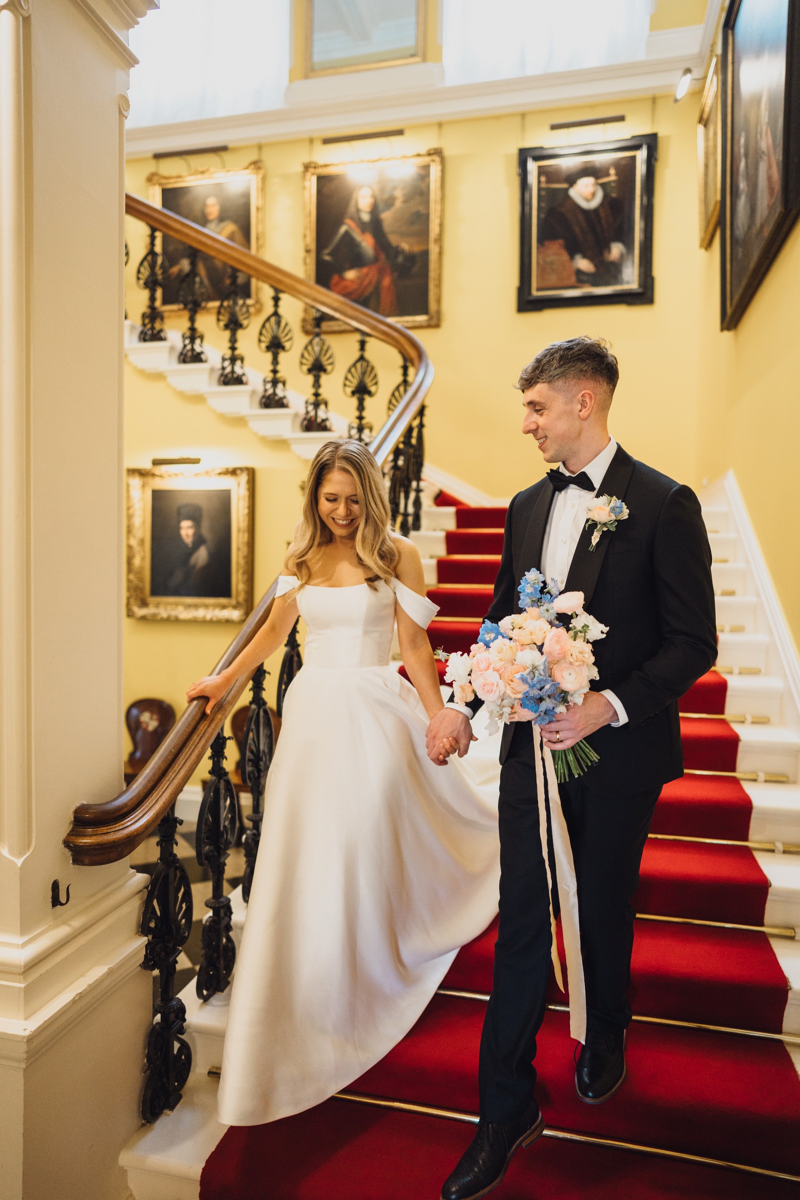 Capesthorne Hall, an impressive manor house nestled in the Cheshire countryside, provided a breathtaking backdrop for their nuptials. The venue’s grandeur is evident from the moment you approach, with its beautifully landscaped gardens, tranquil river, and picturesque bridge. Inside, the hall boasts a bold yellow staircase, offering a striking setting for wedding photographs. The ornate ceremony room, bathed in beautiful light, added to the day’s elegance.