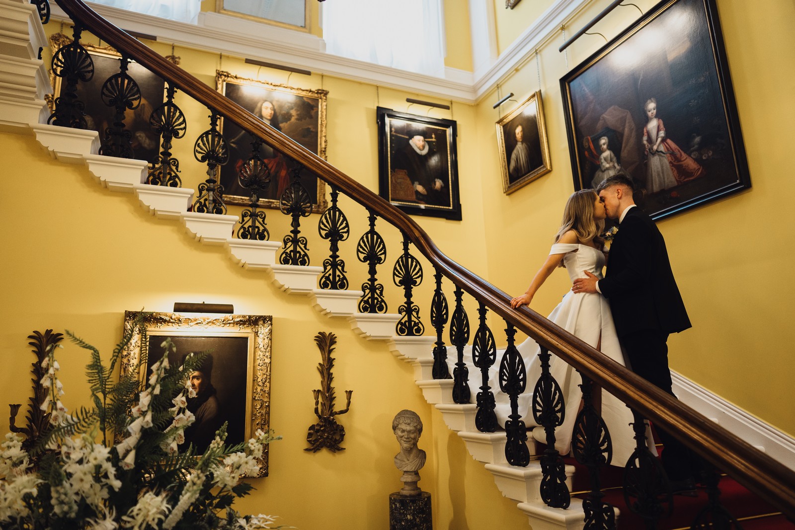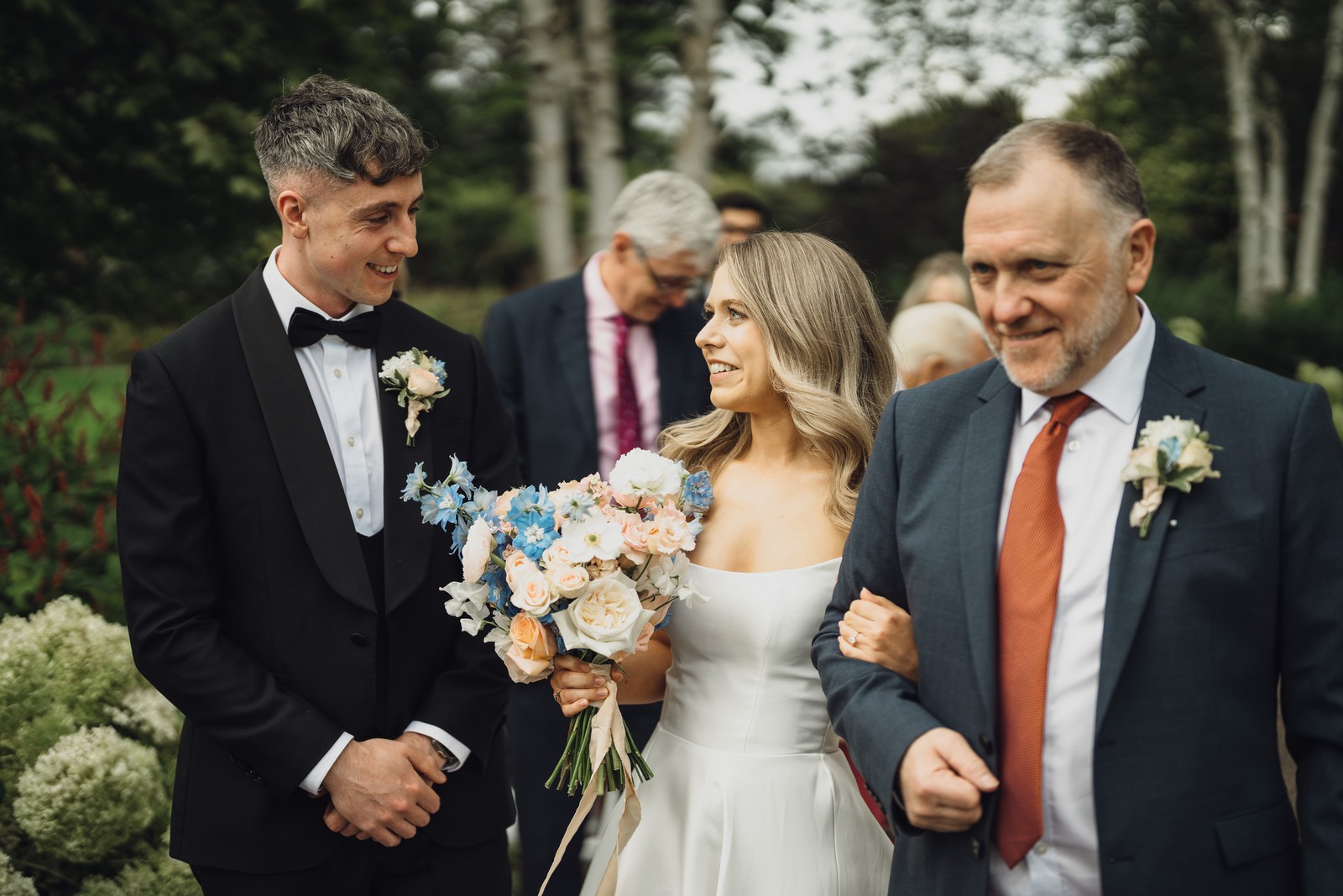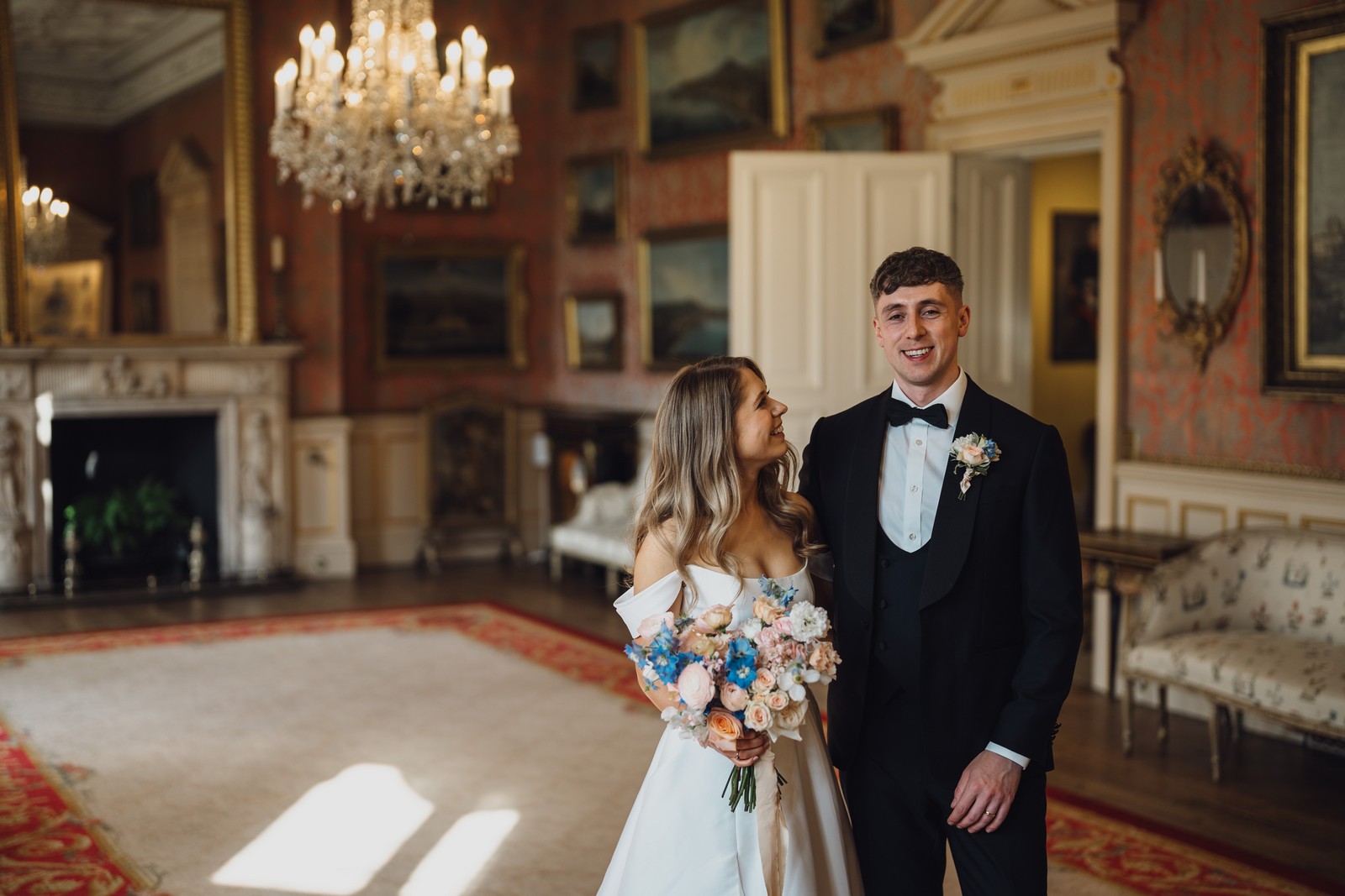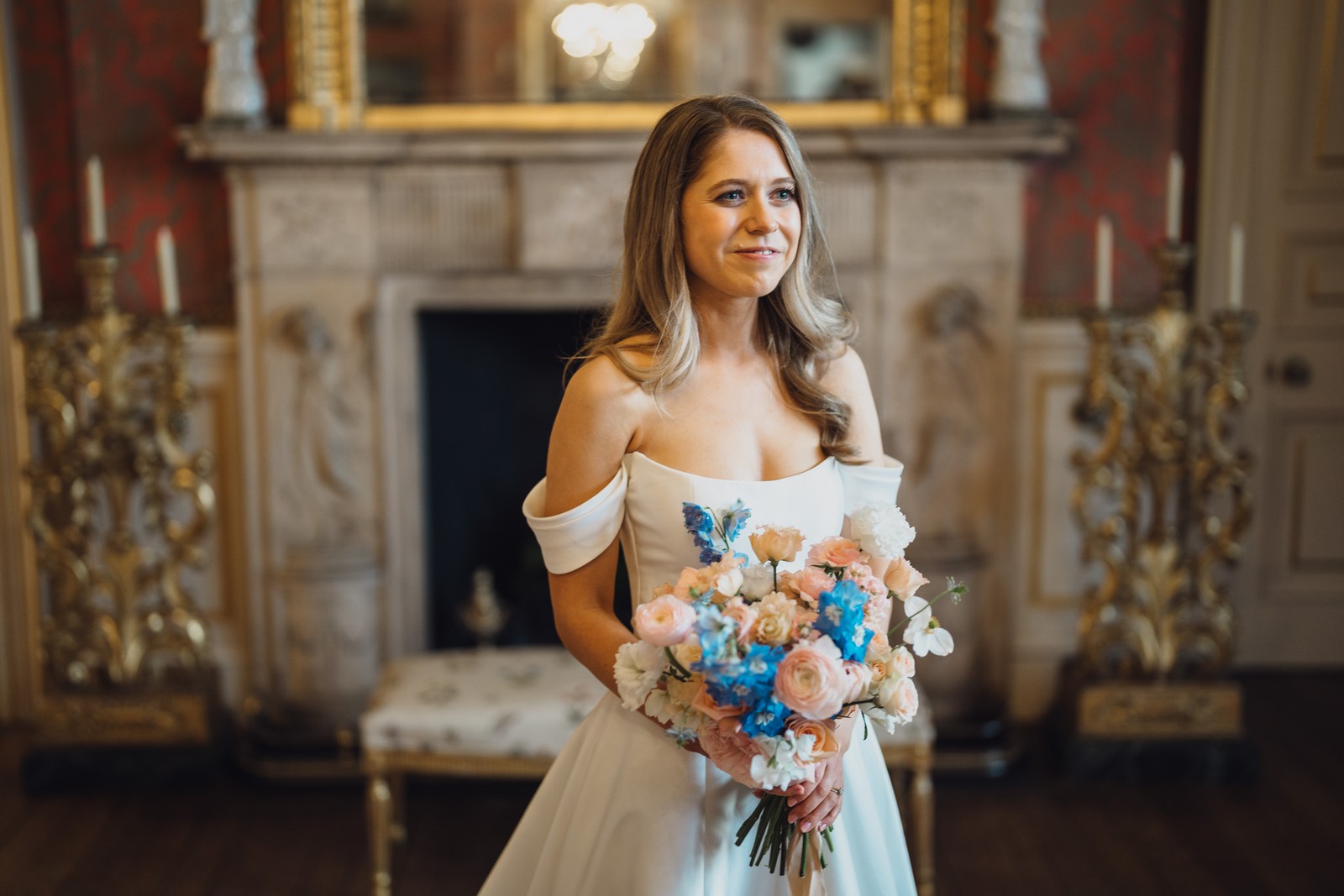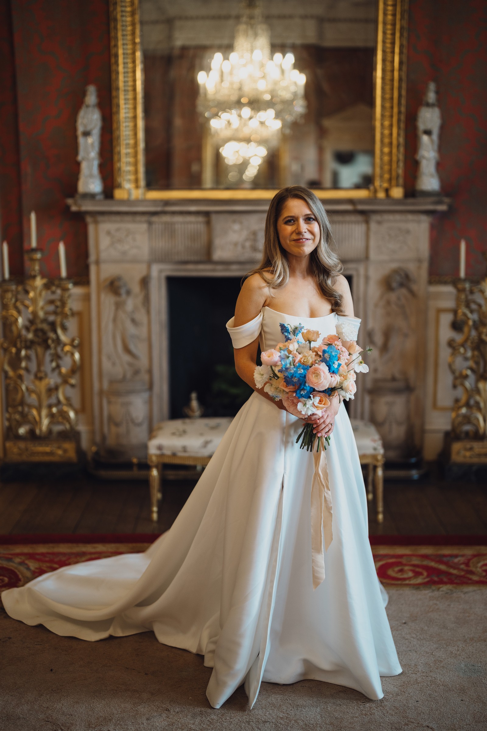 Capesthorne Hall, an impressive manor house nestled in the Cheshire countryside, provided a breathtaking backdrop for their nuptials. The venue’s grandeur is evident from the moment you approach, with its beautifully landscaped gardens, tranquil river, and picturesque bridge. Inside, the hall boasts a bold yellow staircase, offering a striking setting for wedding photographs. The ornate ceremony room, bathed in beautiful light, added to the day’s elegance.