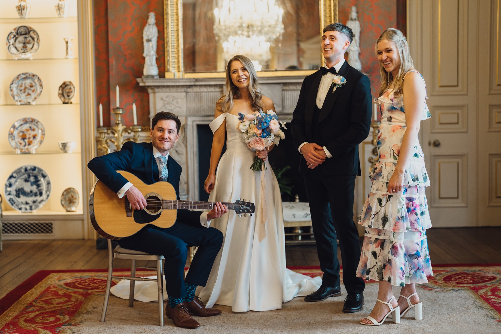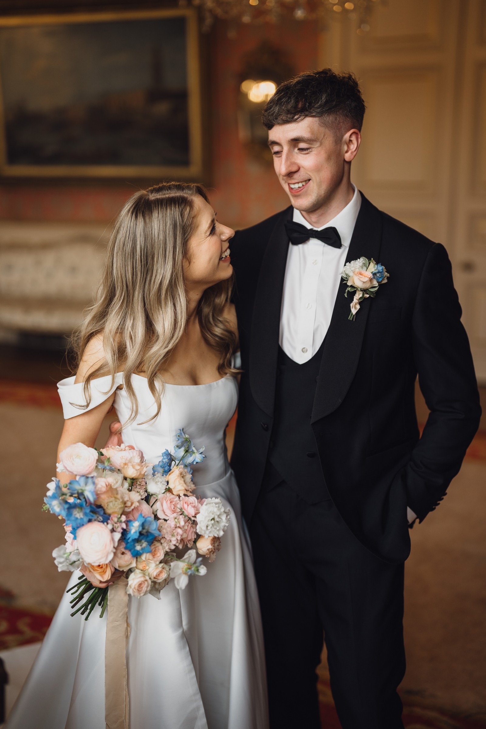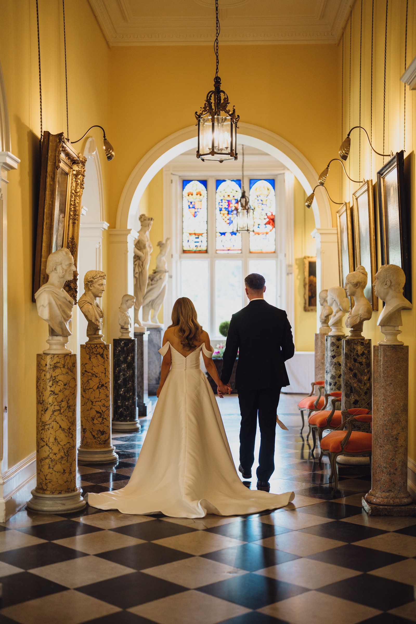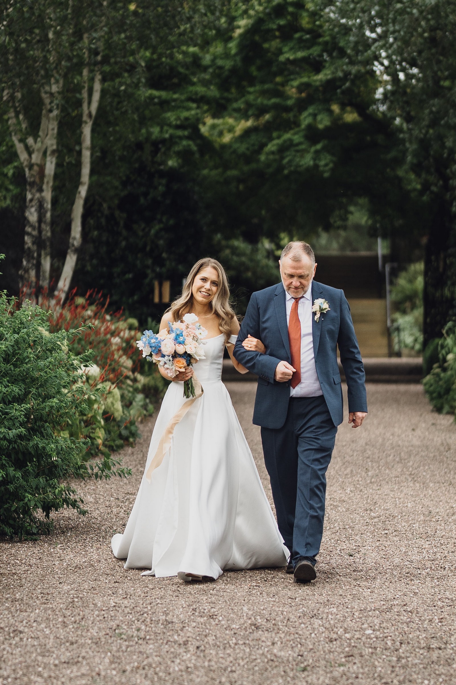 Capesthorne Hall, an impressive manor house nestled in the Cheshire countryside, provided a breathtaking backdrop for their nuptials. The venue’s grandeur is evident from the moment you approach, with its beautifully landscaped gardens, tranquil river, and picturesque bridge. Inside, the hall boasts a bold yellow staircase, offering a striking setting for wedding photographs. The ornate ceremony room, bathed in beautiful light, added to the day’s elegance.