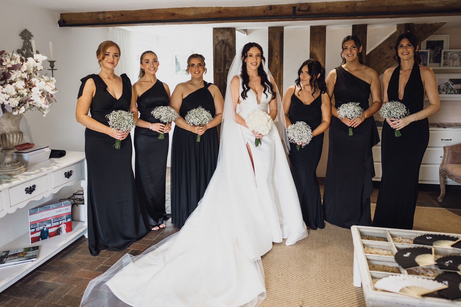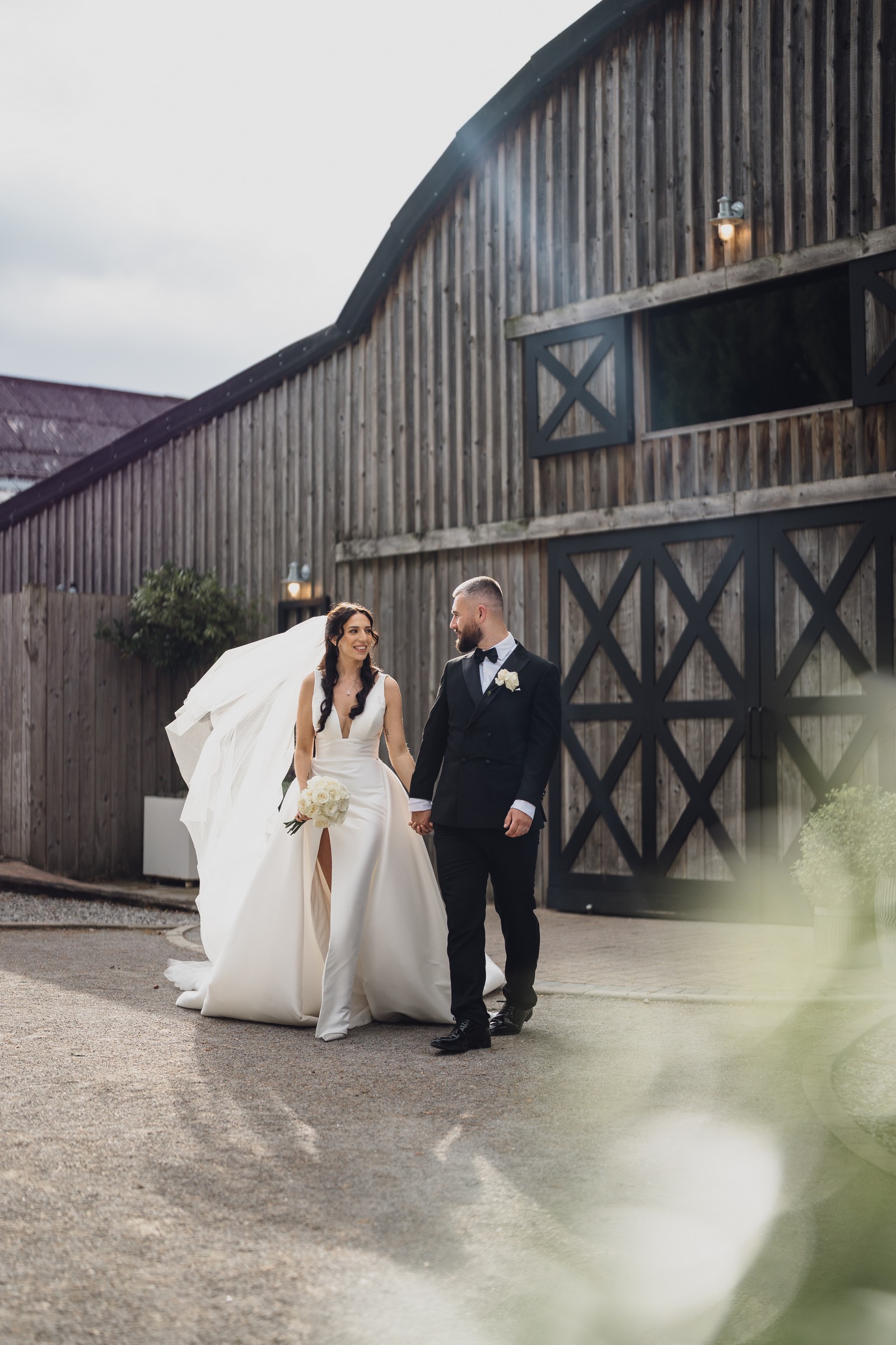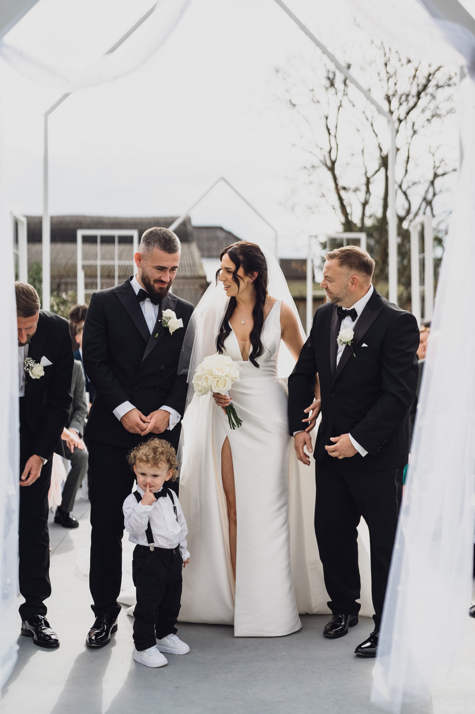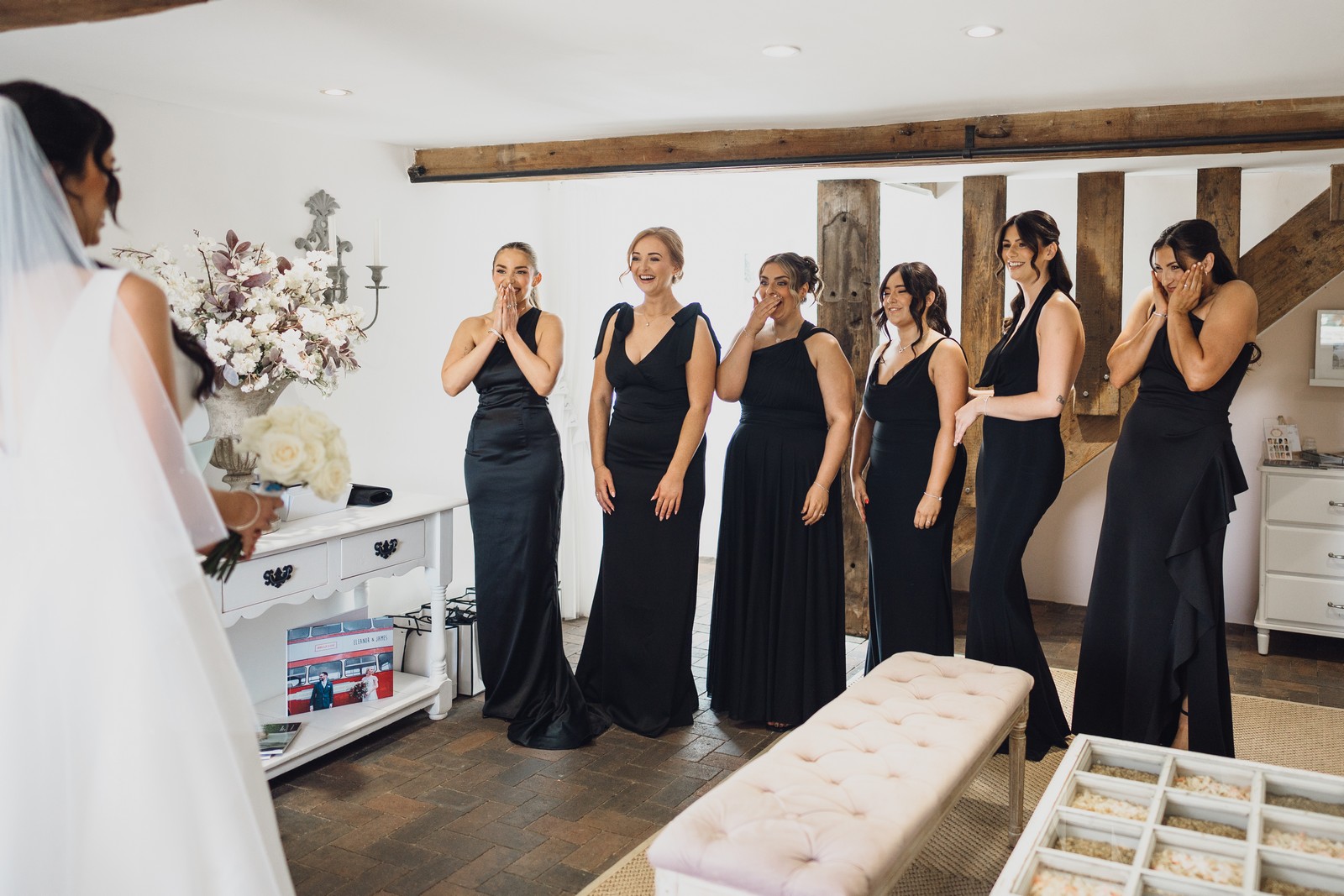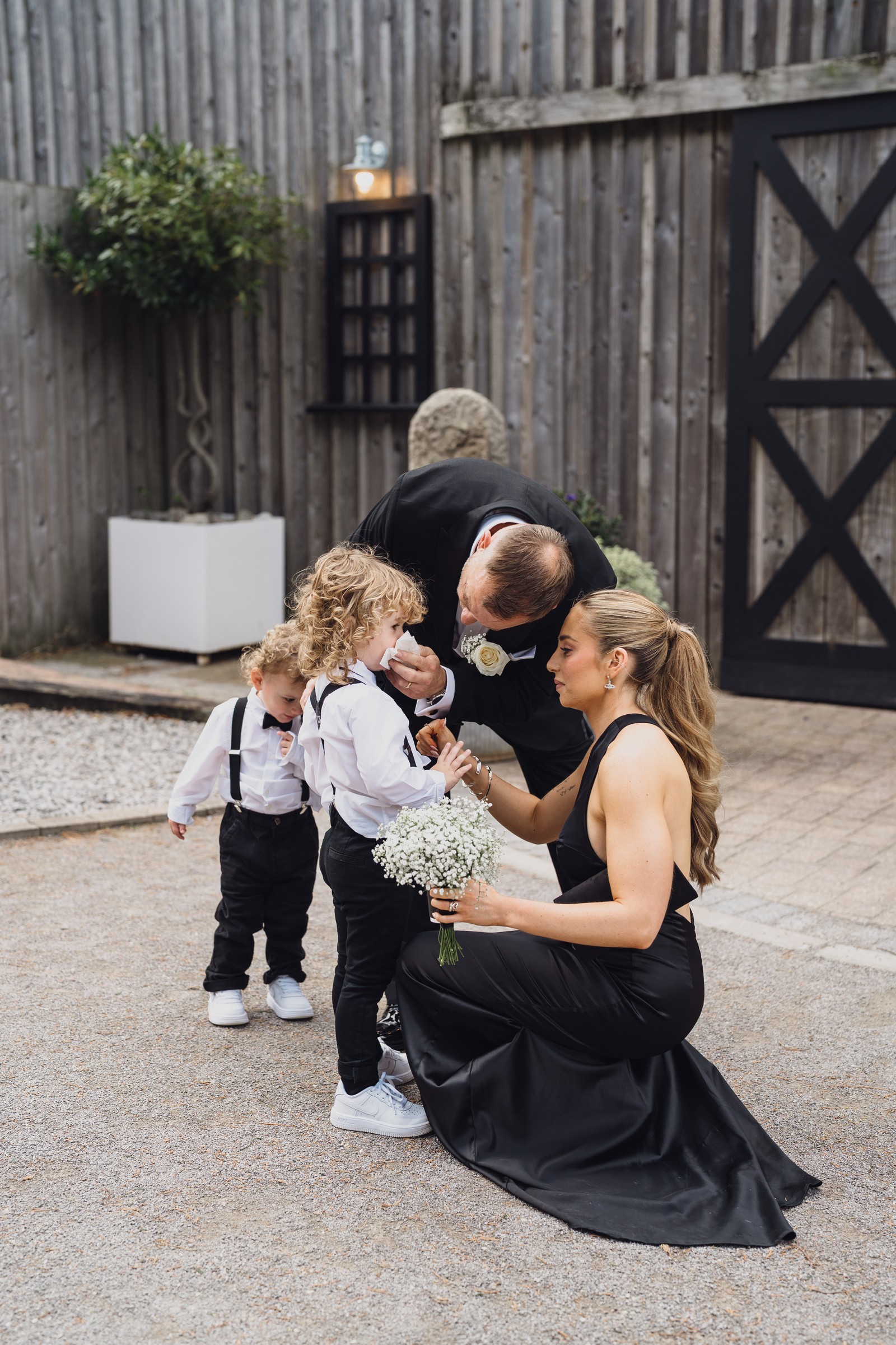 The black-tie theme added a luxurious polish to the day, pairing beautifully with Alcumlow Barn’s natural textures and countryside setting. Think sharp suits, sweeping gowns, crisp whites, and classic florals – all brought to life against weathered wood, stone paths, and open skies.