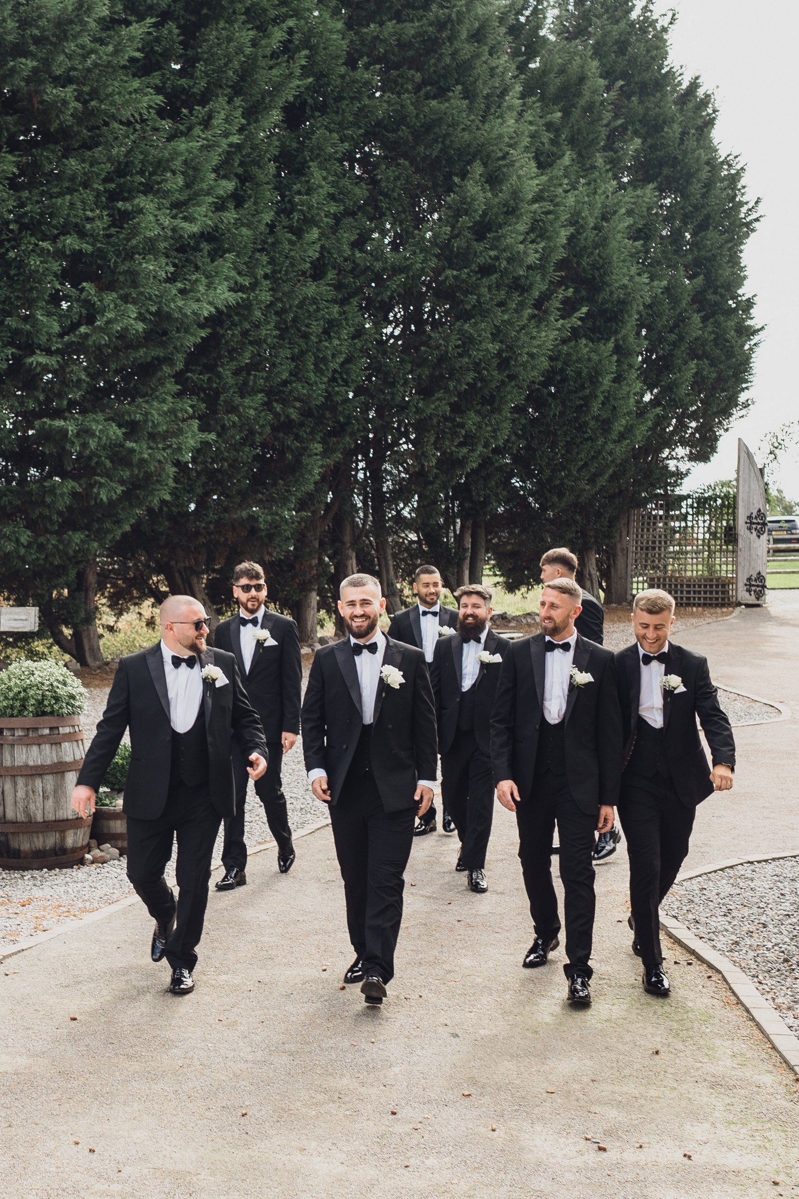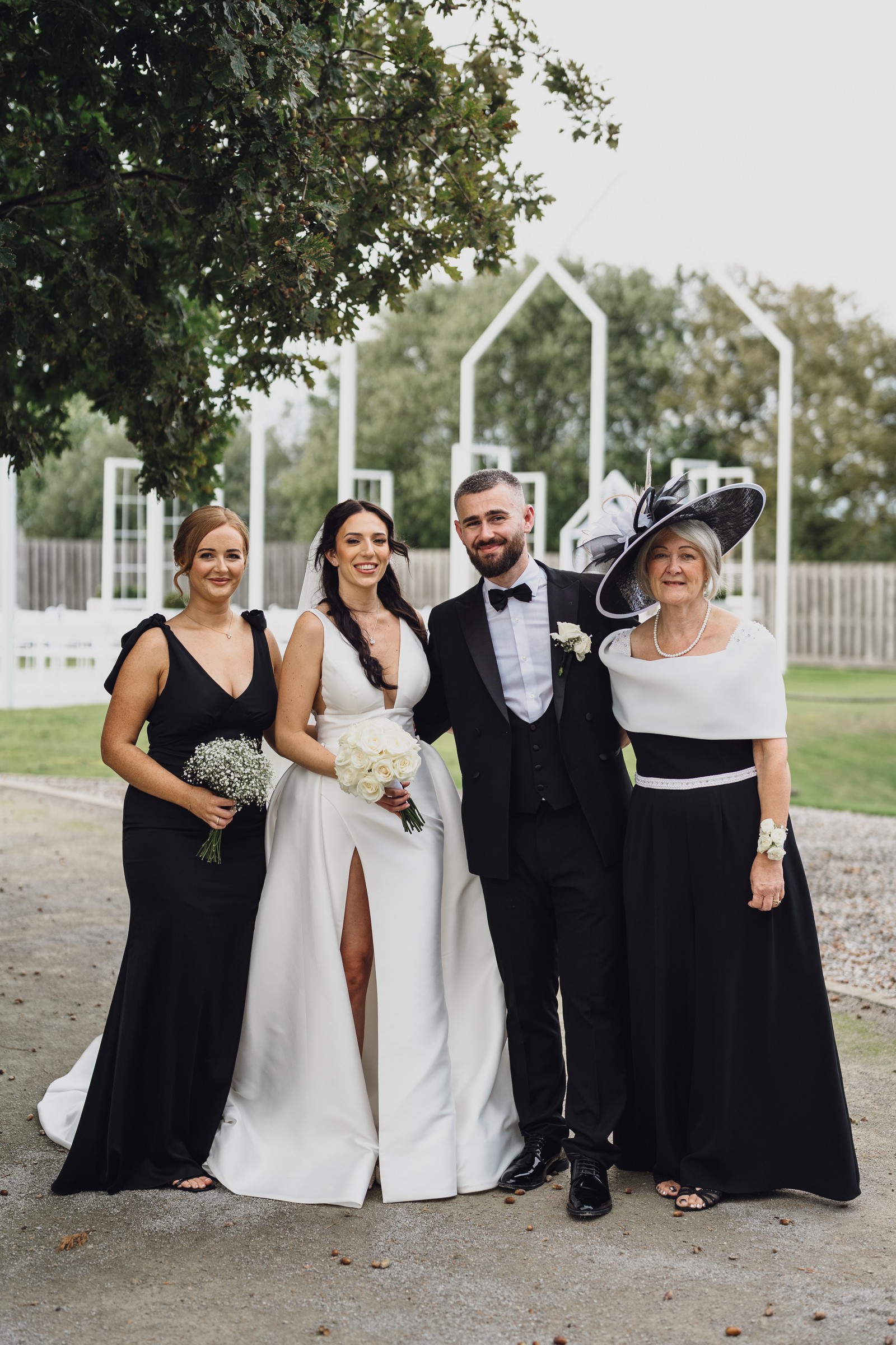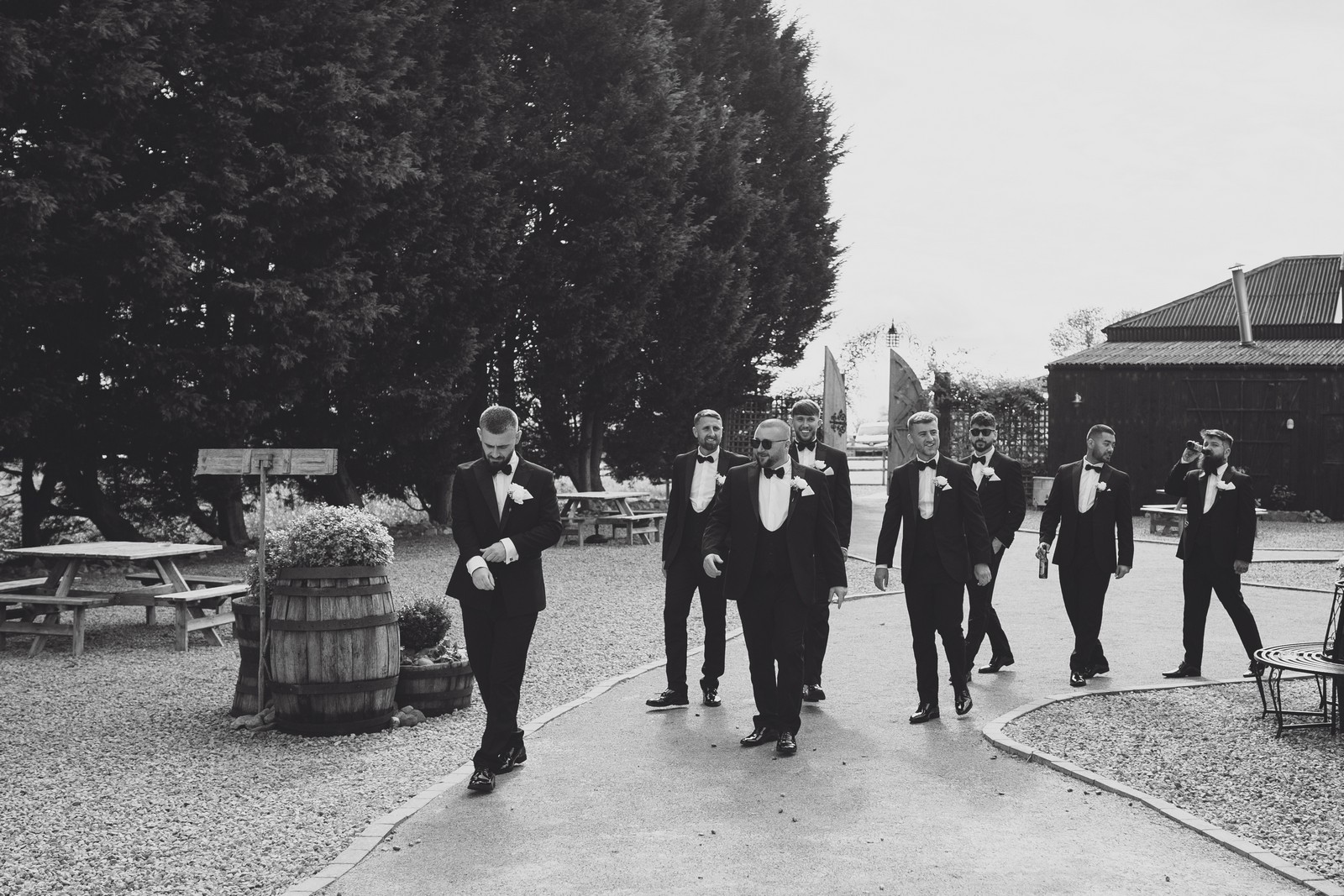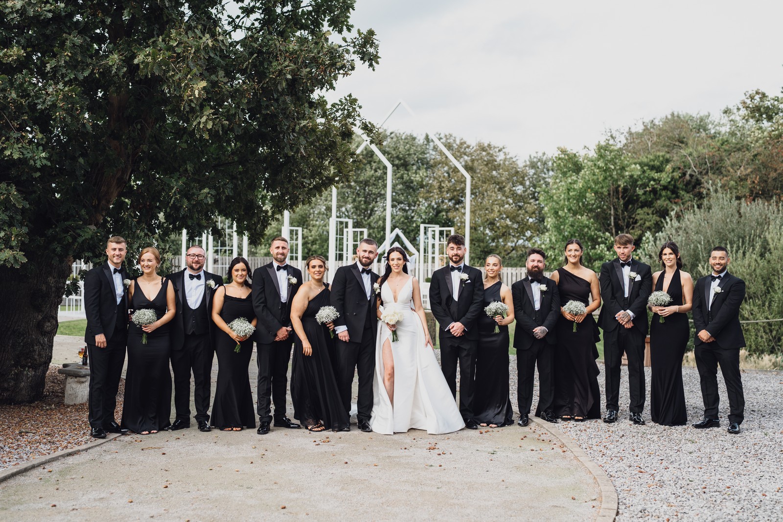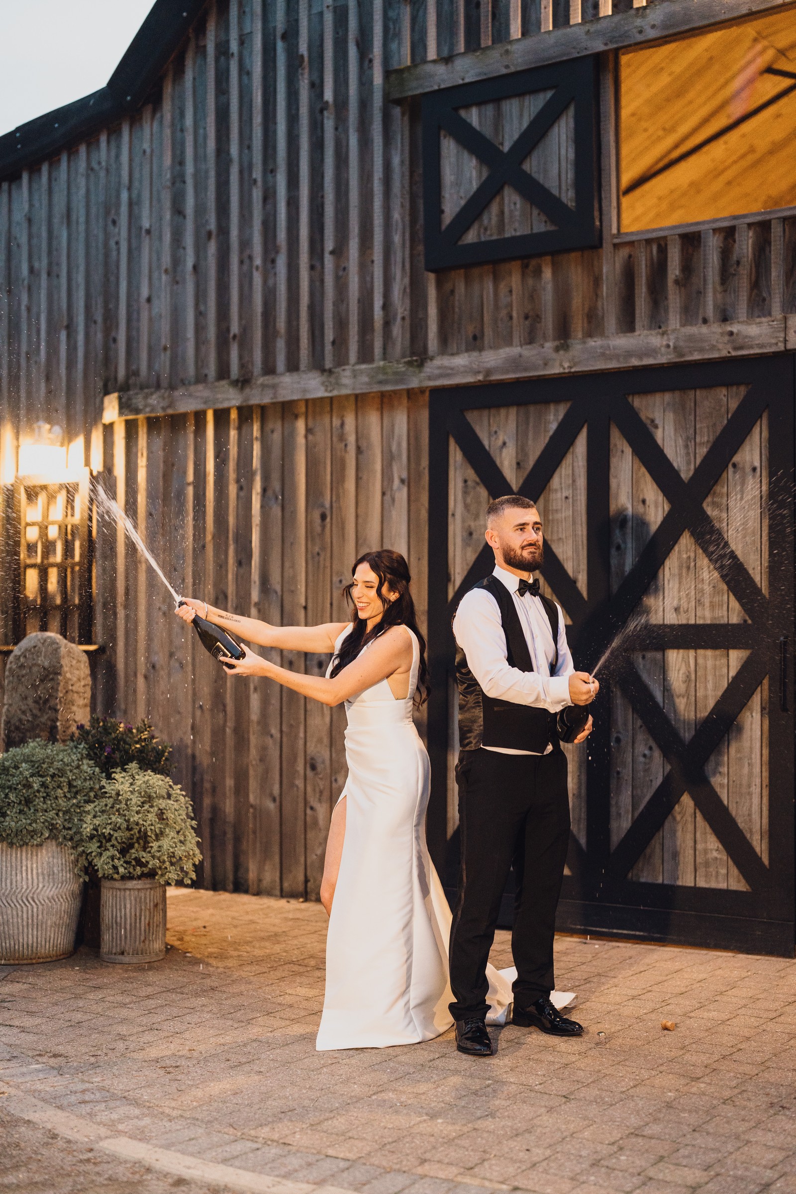 The black-tie theme added a luxurious polish to the day, pairing beautifully with Alcumlow Barn’s natural textures and countryside setting. Think sharp suits, sweeping gowns, crisp whites, and classic florals – all brought to life against weathered wood, stone paths, and open skies.