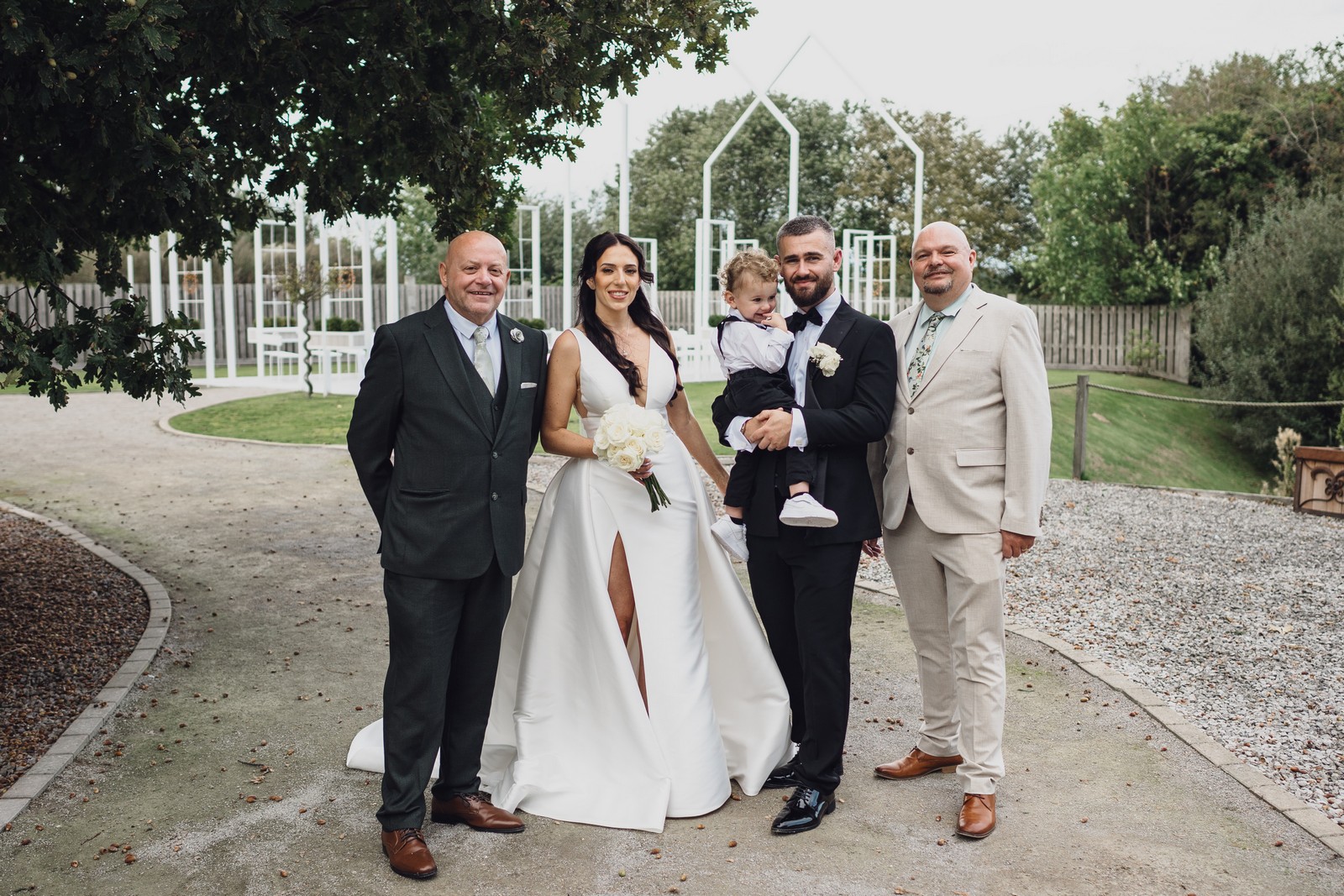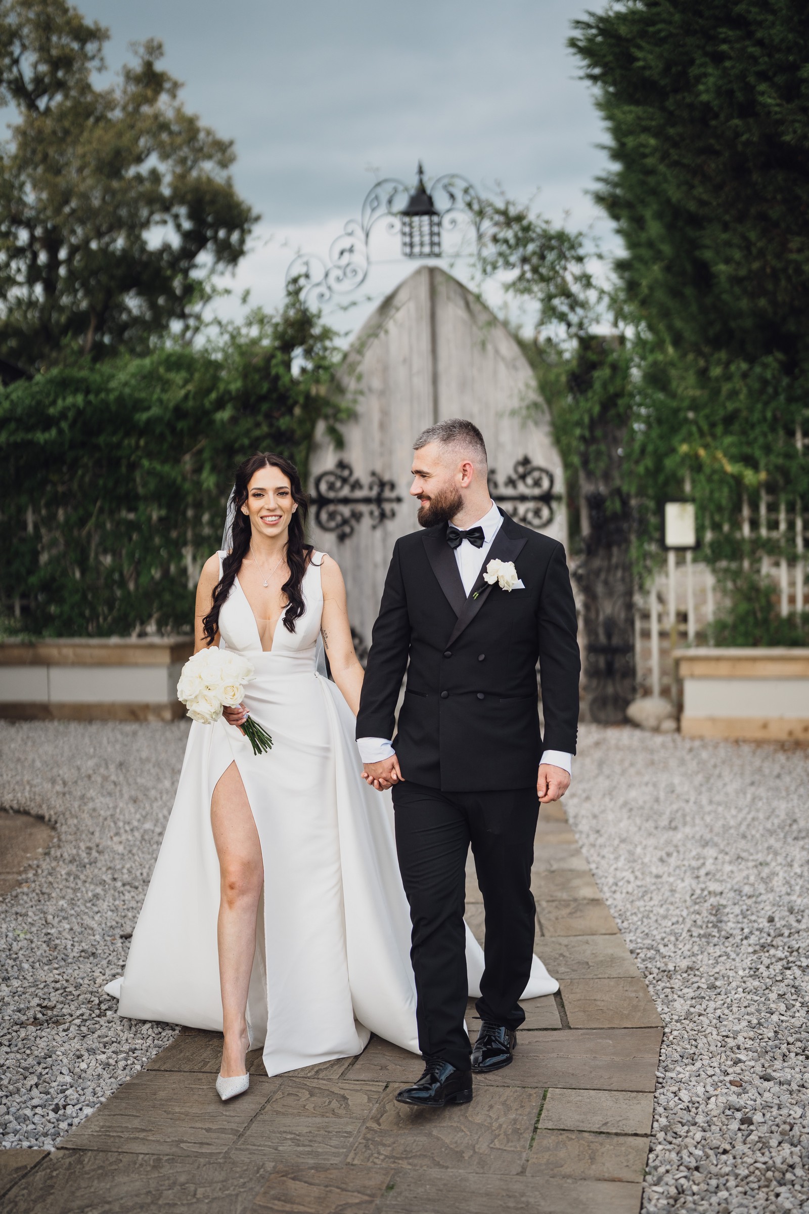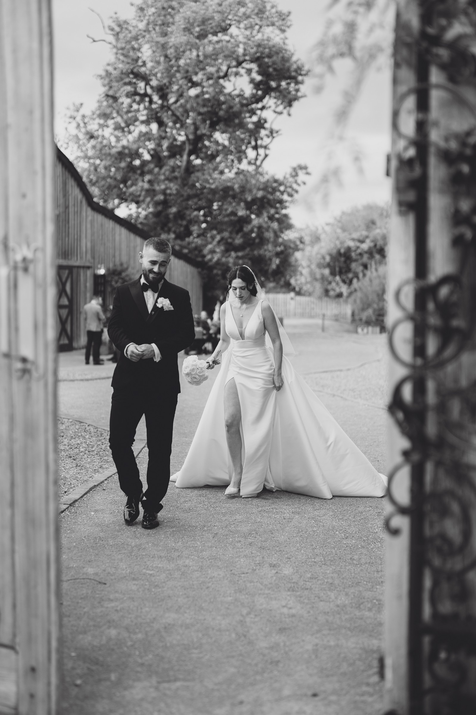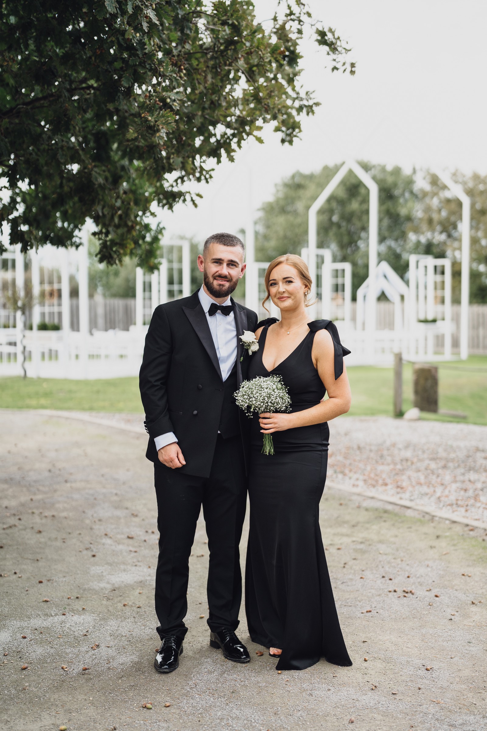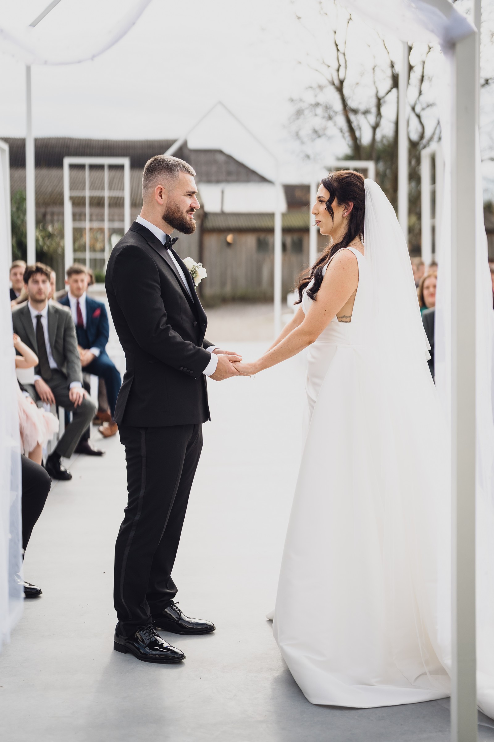Chelsea looked absolutely radiant in her flowing gown with its gracefully draped train and deep V neckline – timeless yet modern. Elliot matched her elegance perfectly in a sharp black-tie suit, bringing a refined edge to the rustic surroundings.