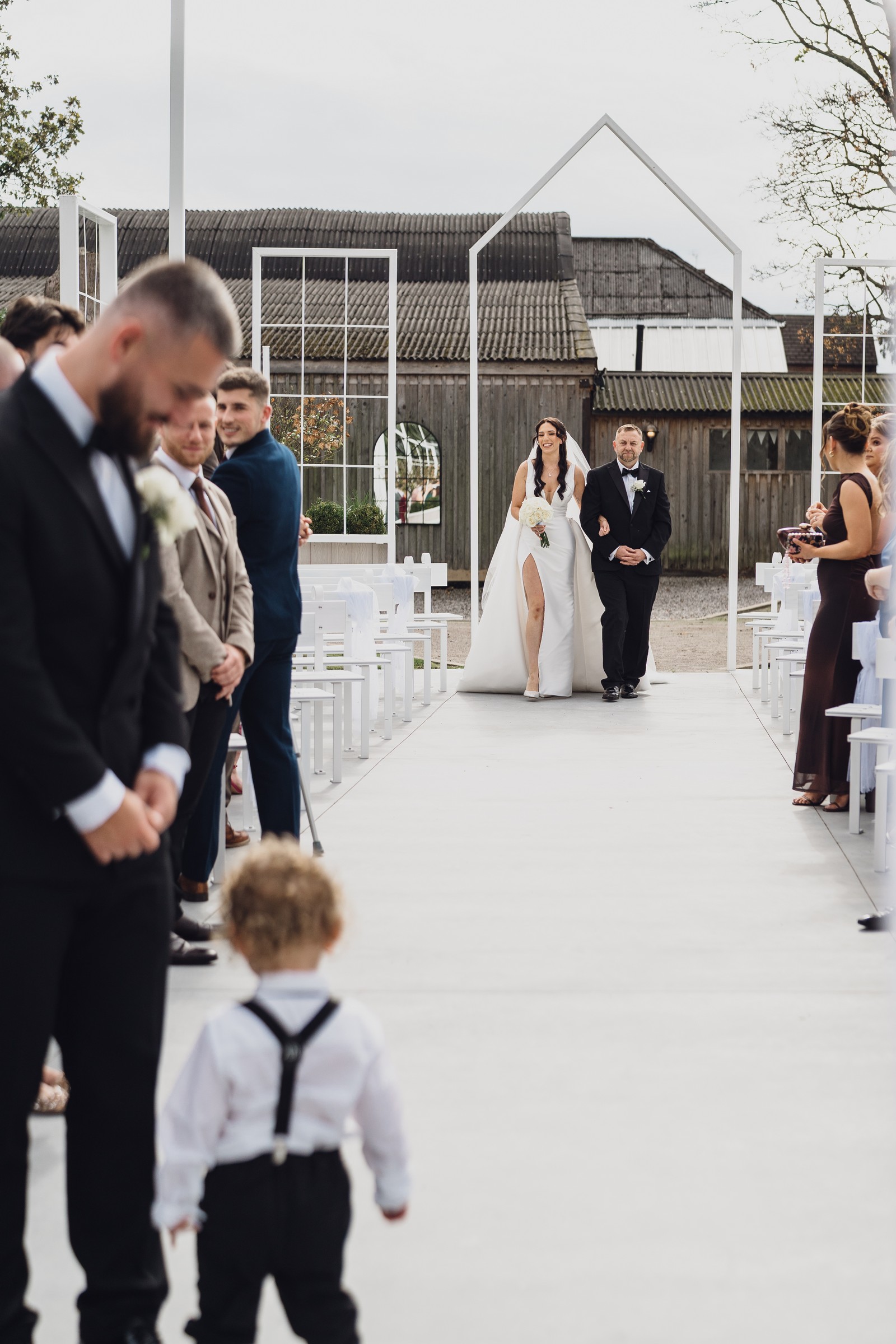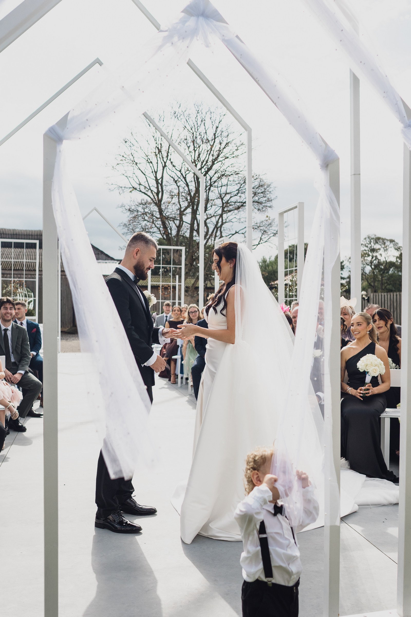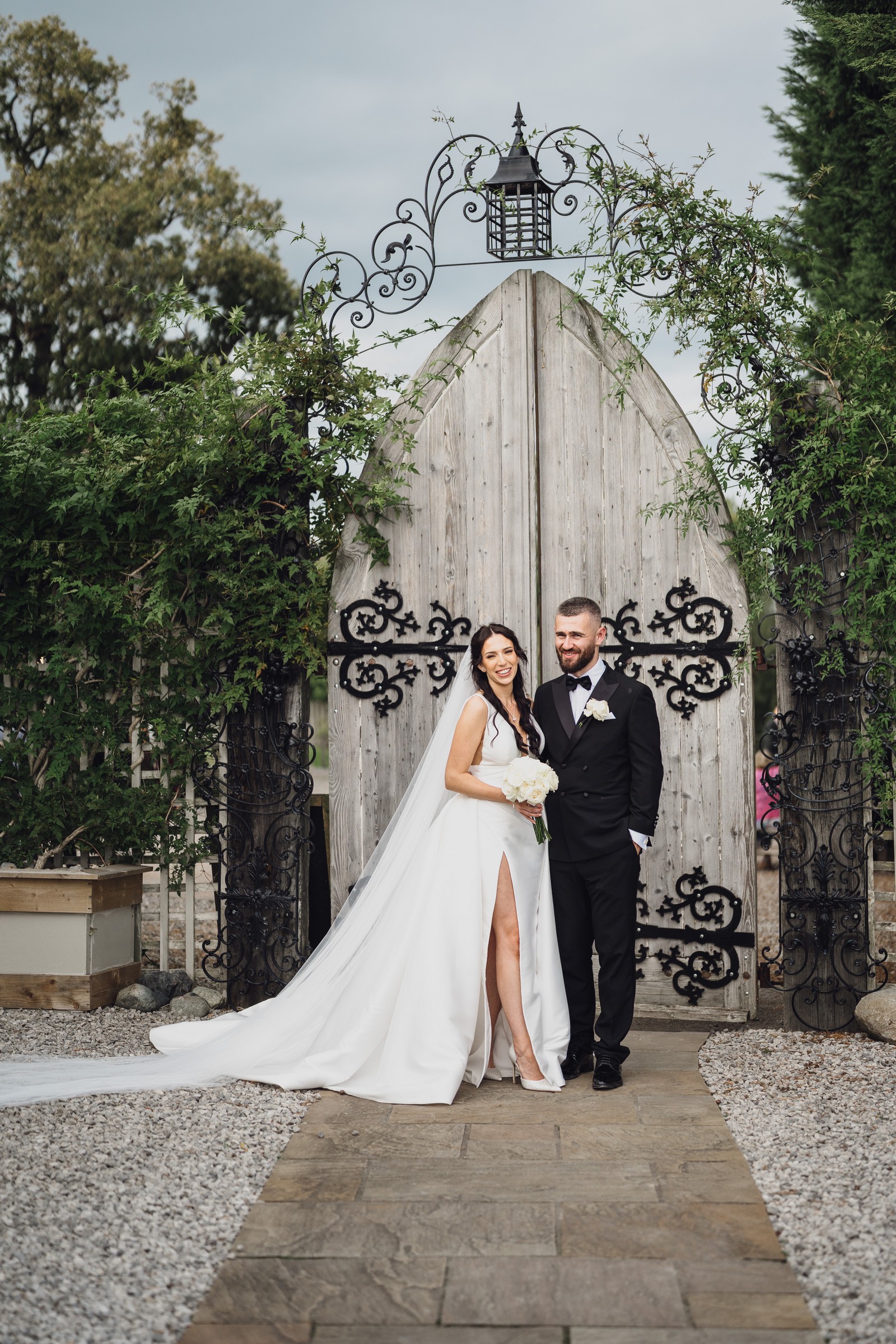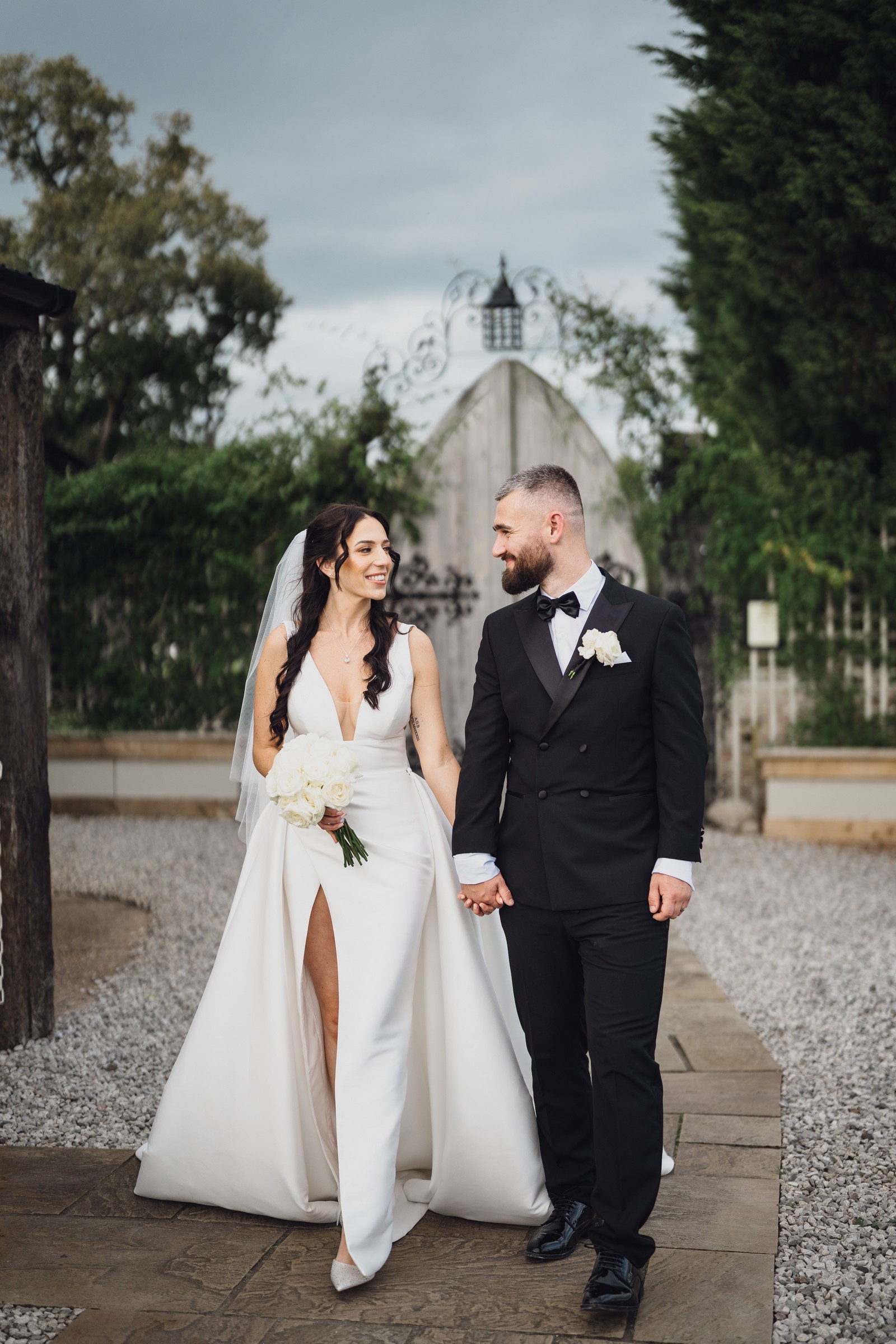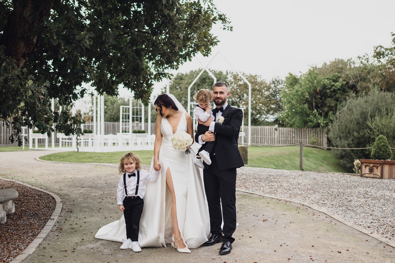 Chelsea looked absolutely radiant in her flowing gown with its gracefully draped train and deep V neckline – timeless yet modern. Elliot matched her elegance perfectly in a sharp black-tie suit, bringing a refined edge to the rustic surroundings.