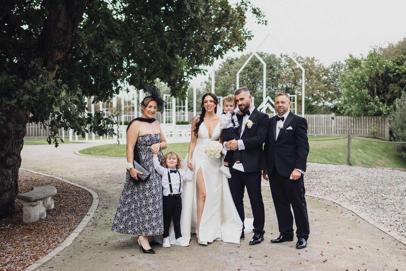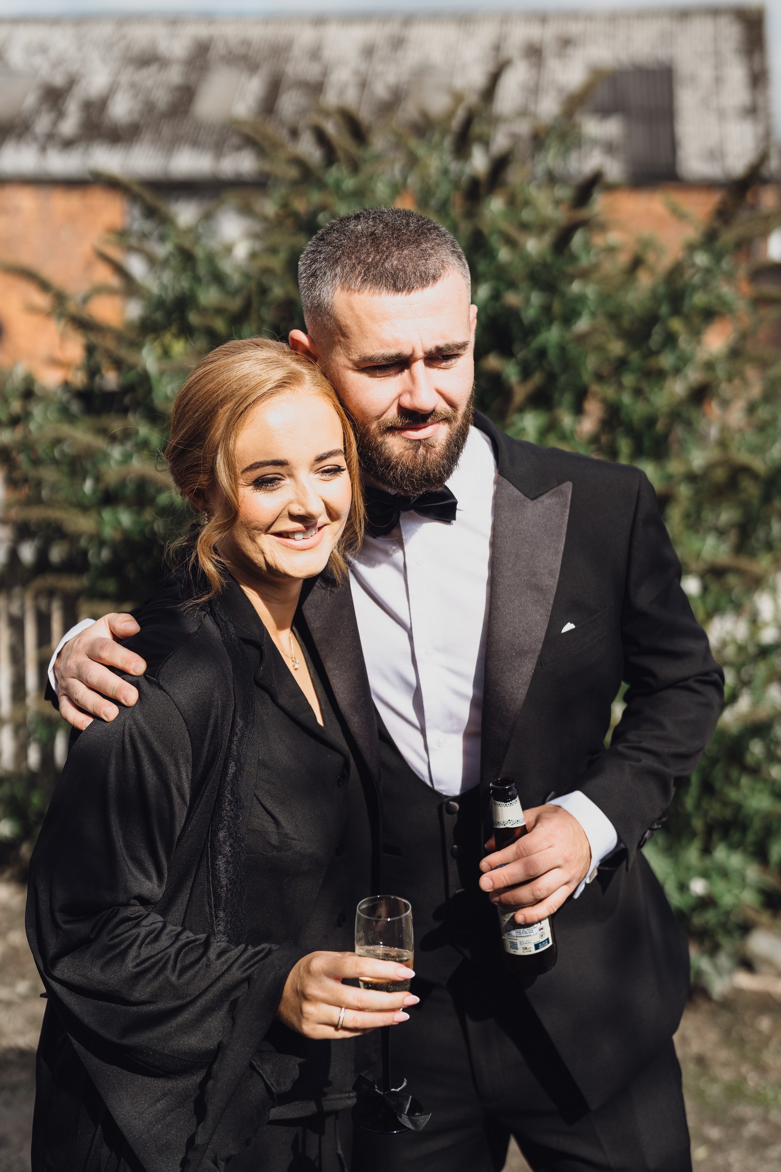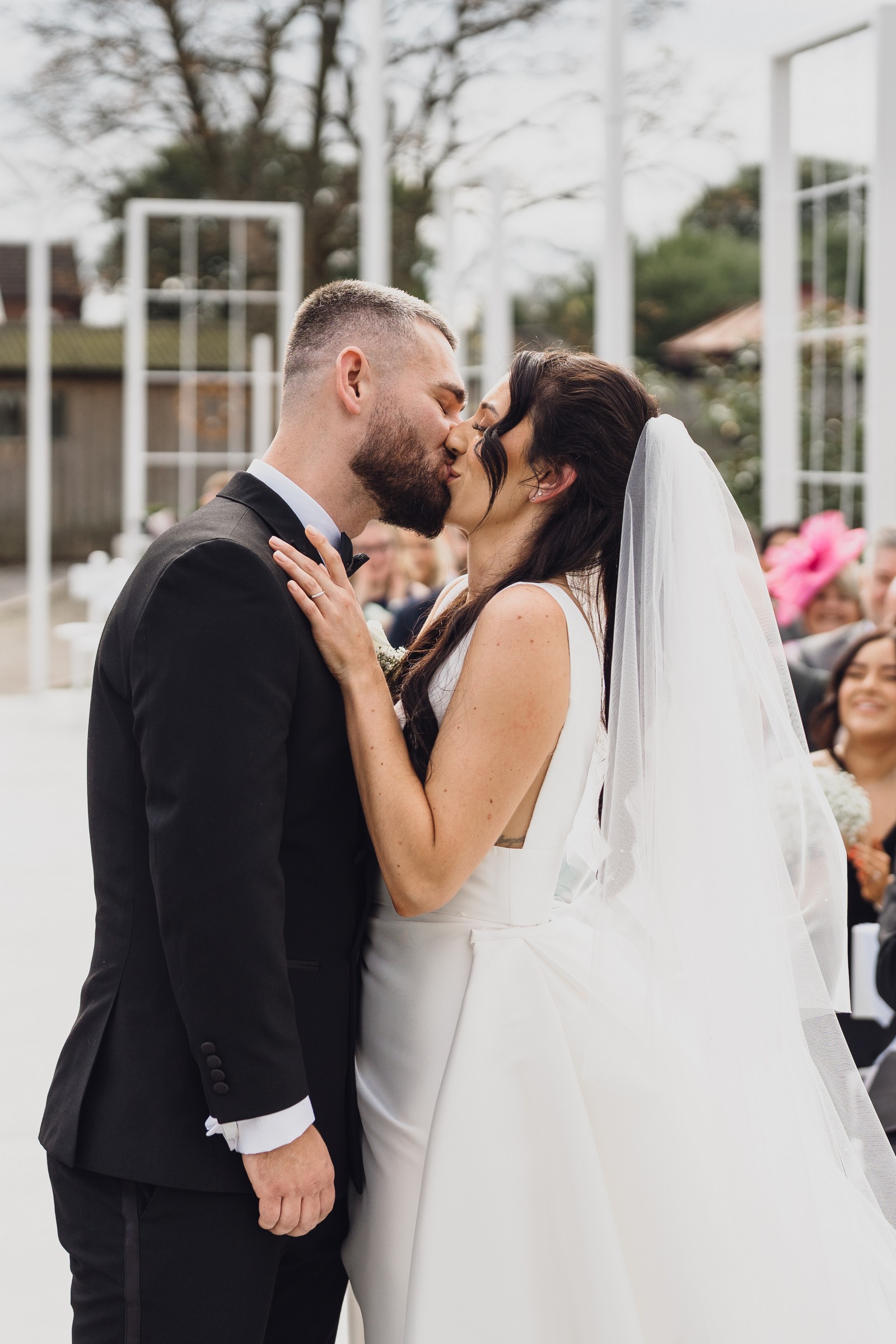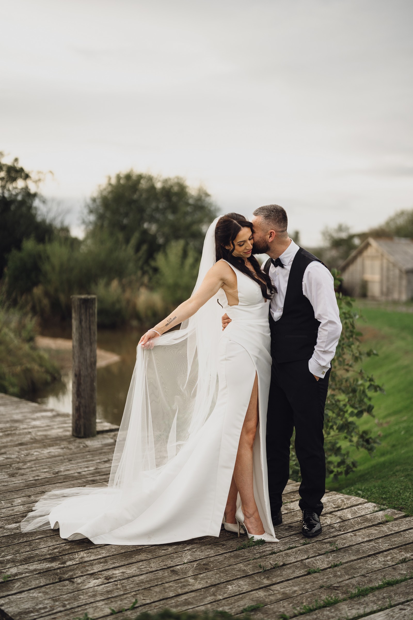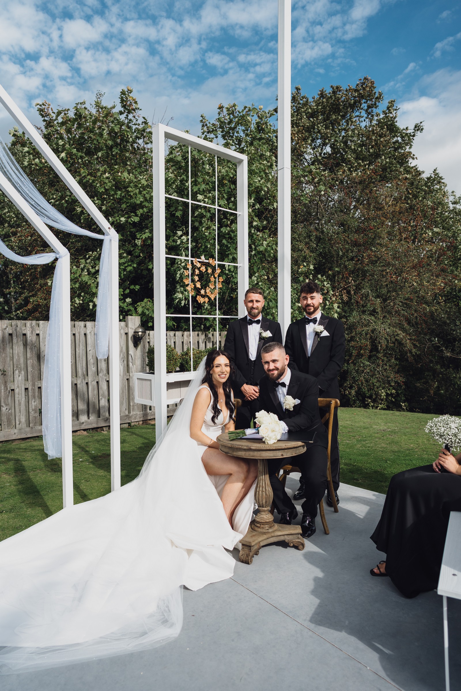 Chelsea looked absolutely radiant in her flowing gown with its gracefully draped train and deep V neckline – timeless yet modern. Elliot matched her elegance perfectly in a sharp black-tie suit, bringing a refined edge to the rustic surroundings.
