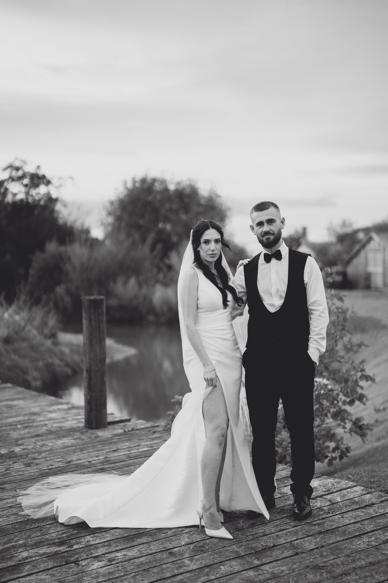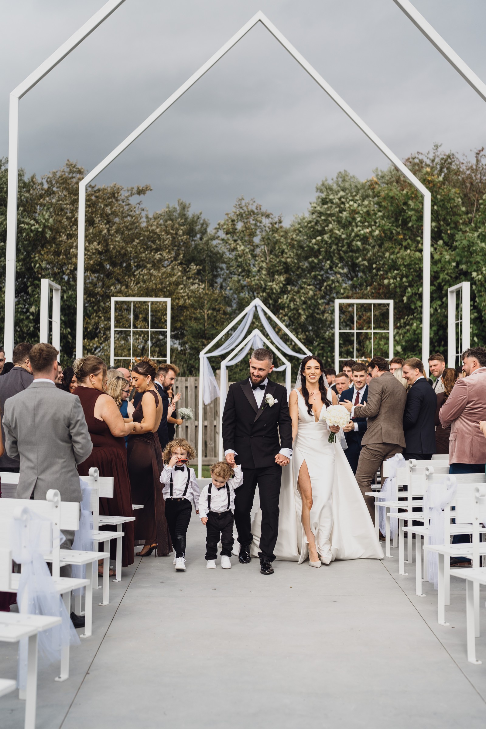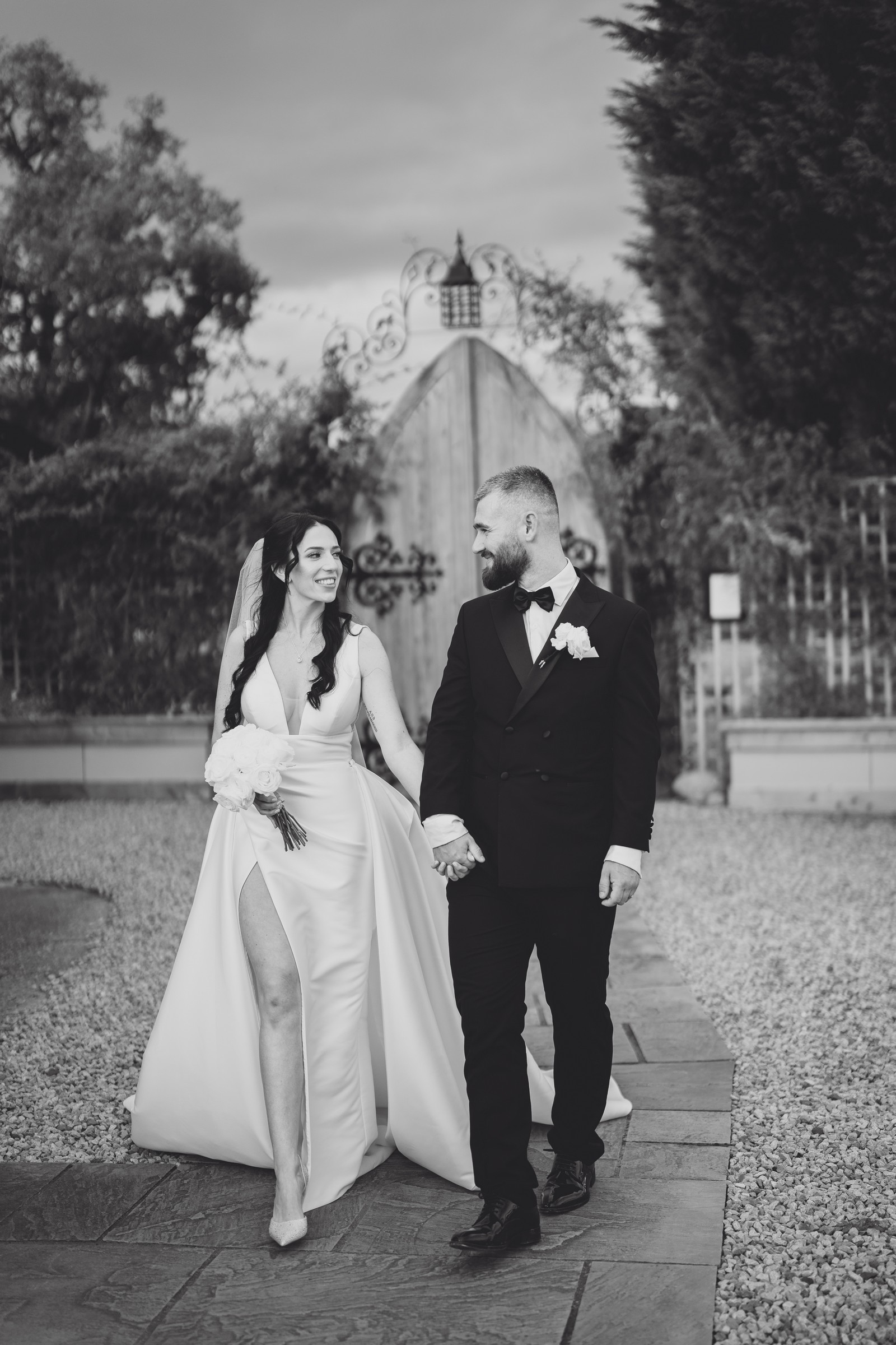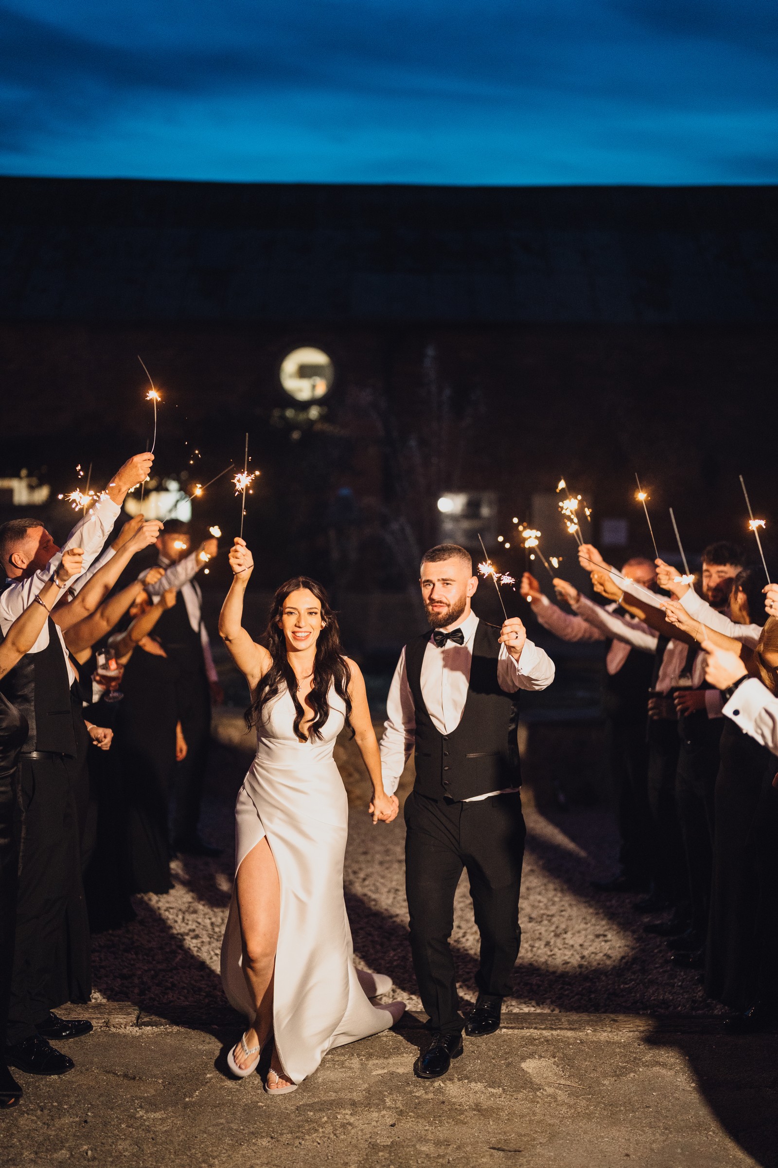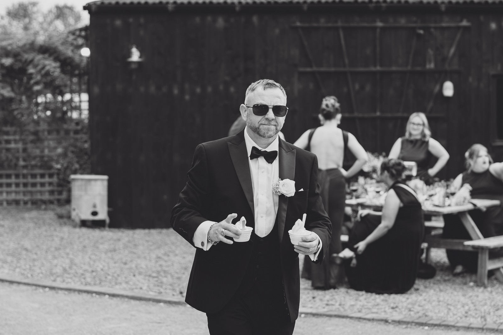 Chelsea looked absolutely radiant in her flowing gown with its gracefully draped train and deep V neckline – timeless yet modern. Elliot matched her elegance perfectly in a sharp black-tie suit, bringing a refined edge to the rustic surroundings.