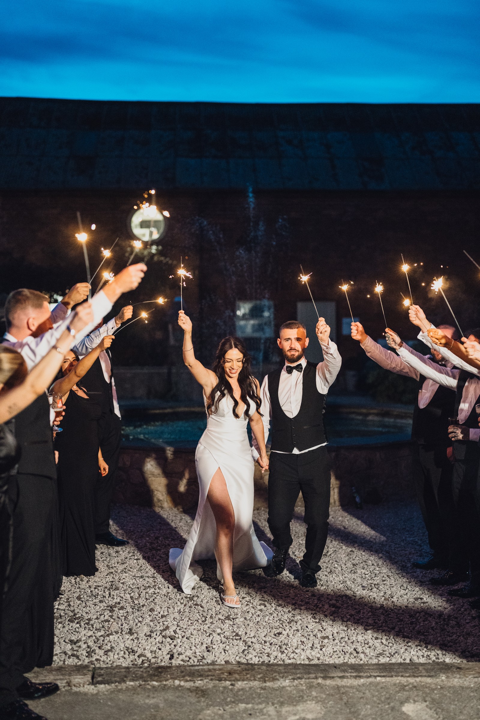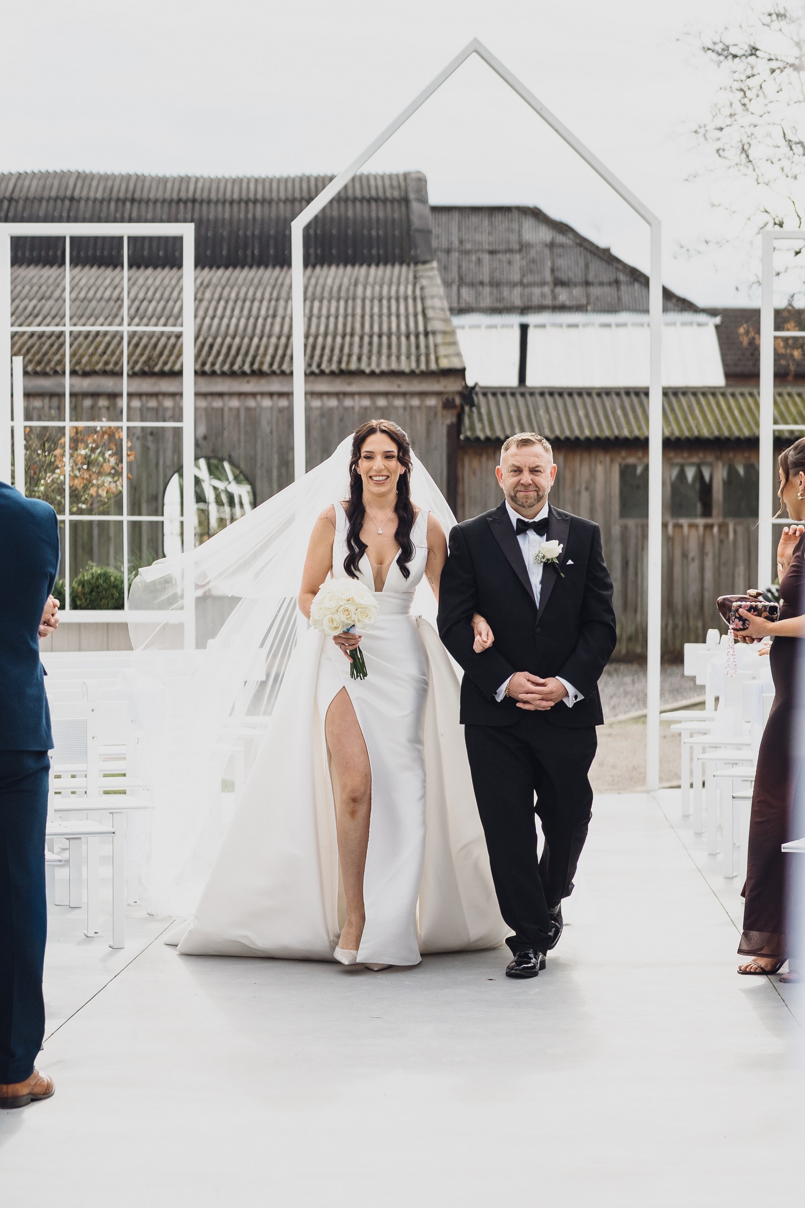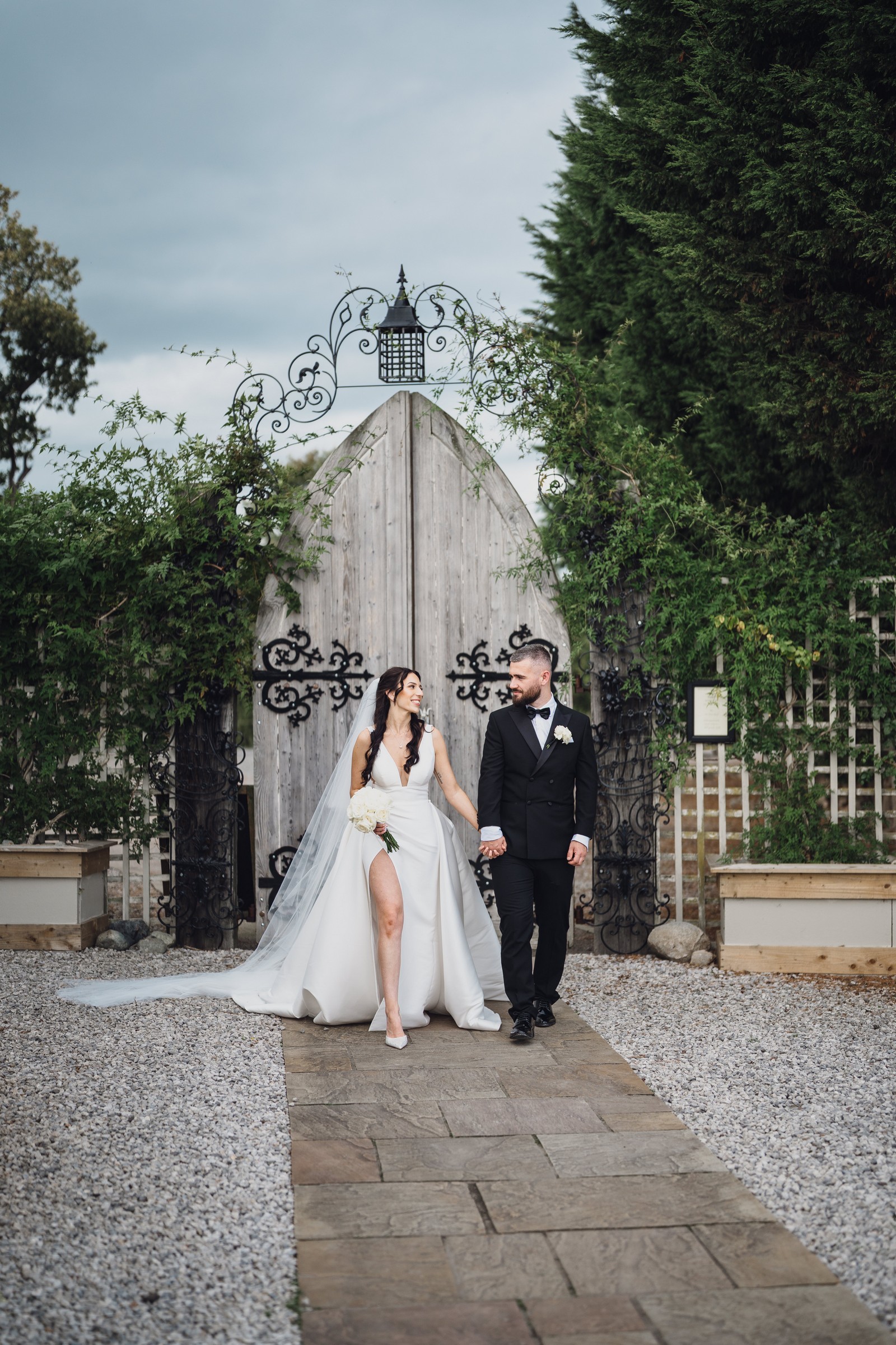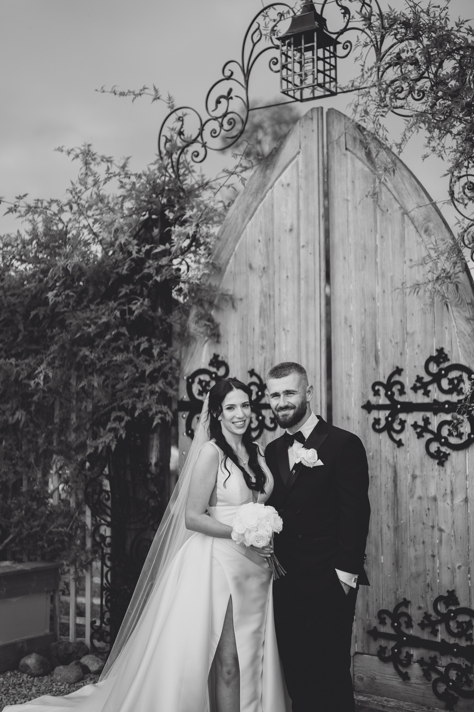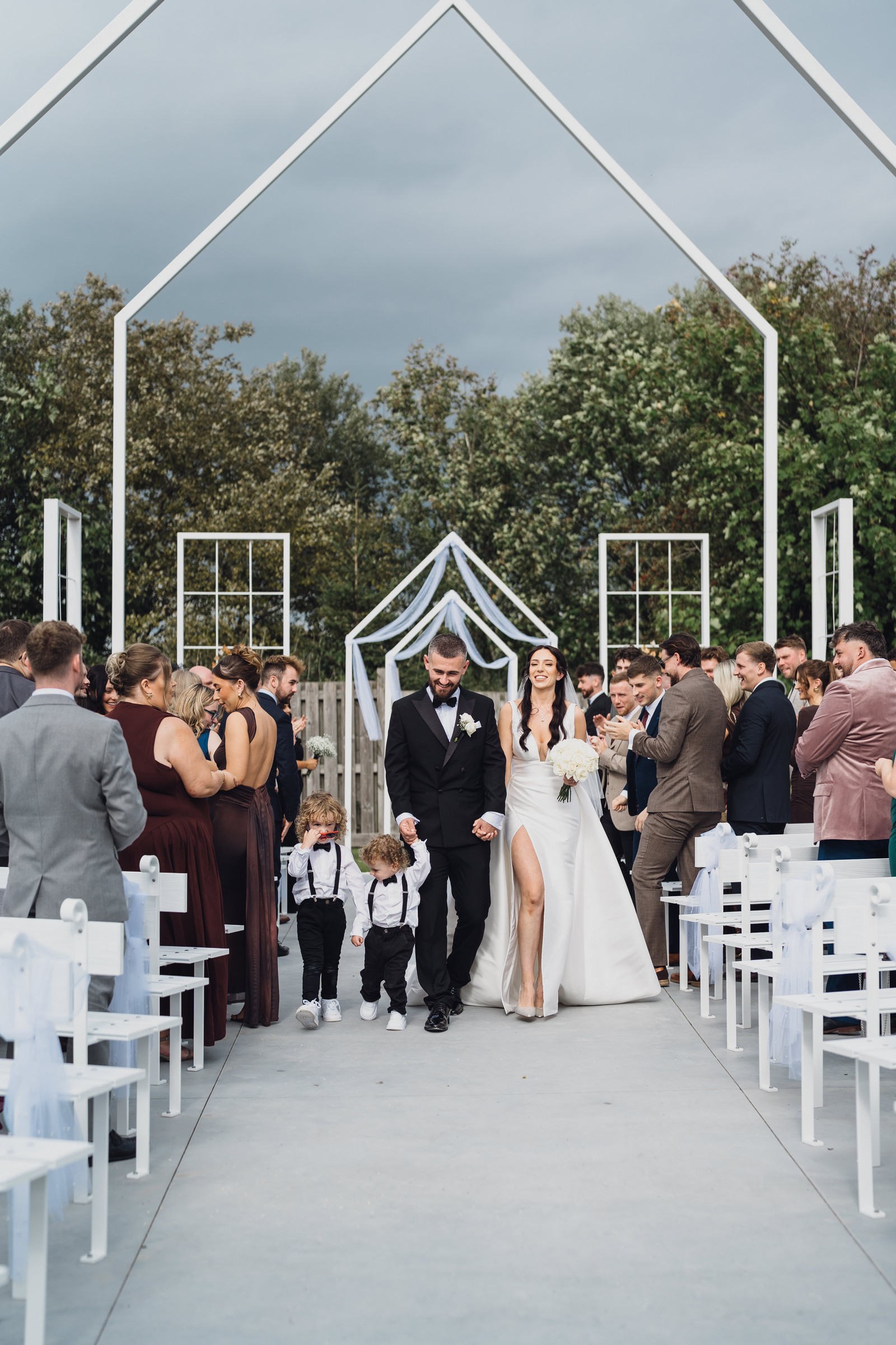 Chelsea looked absolutely radiant in her flowing gown with its gracefully draped train and deep V neckline – timeless yet modern. Elliot matched her elegance perfectly in a sharp black-tie suit, bringing a refined edge to the rustic surroundings.