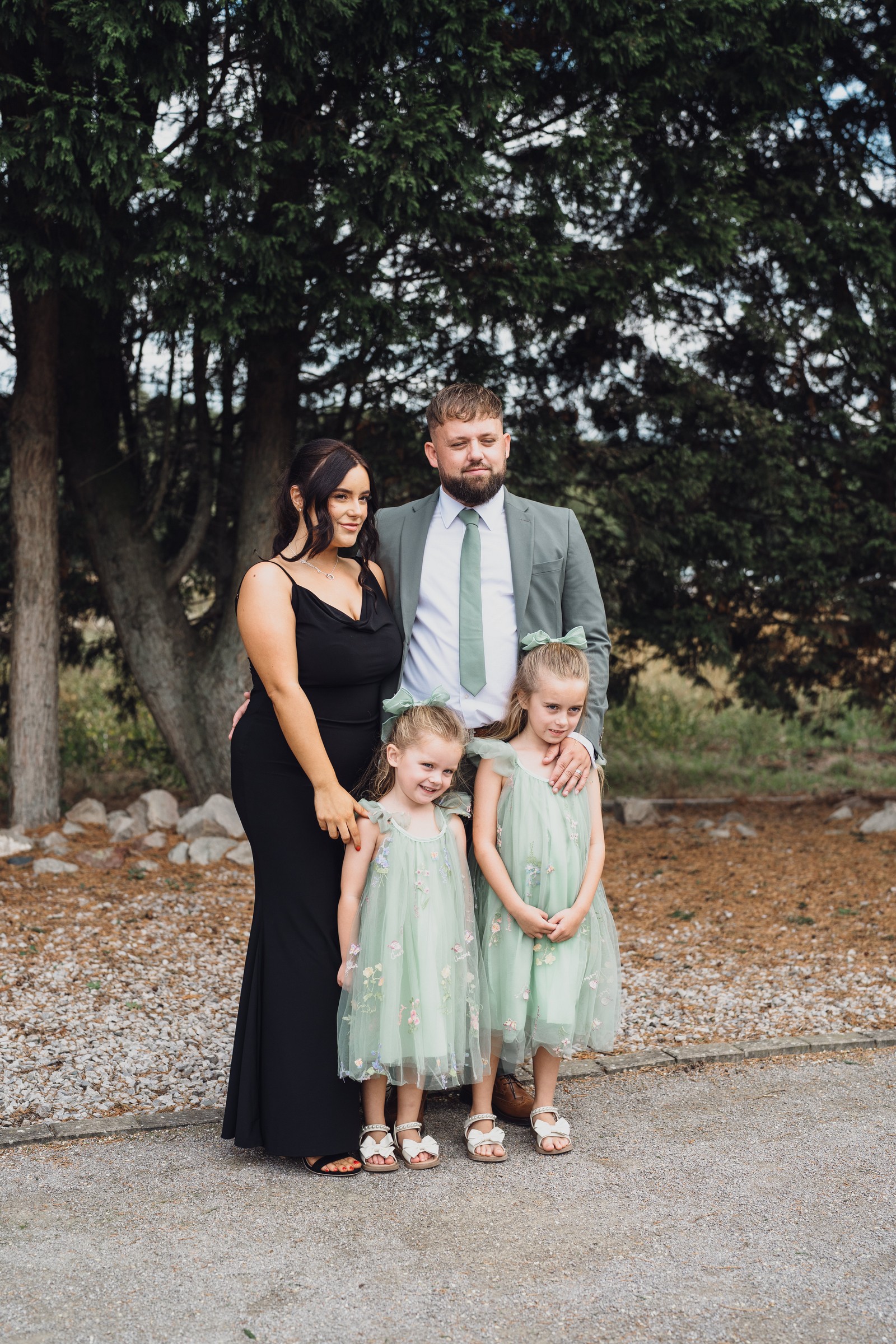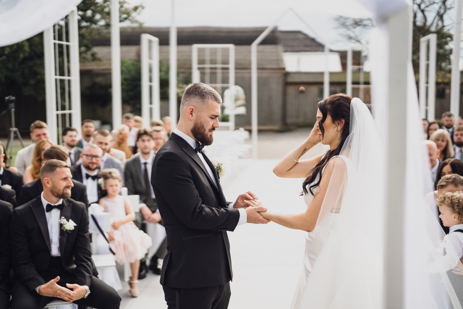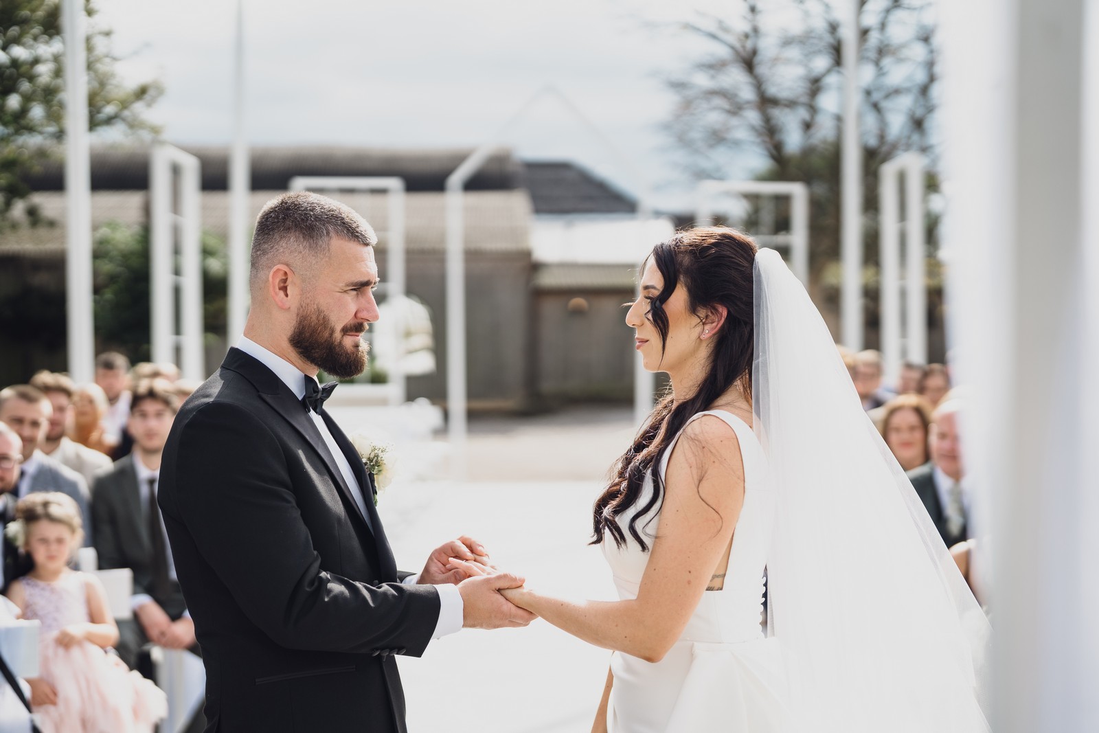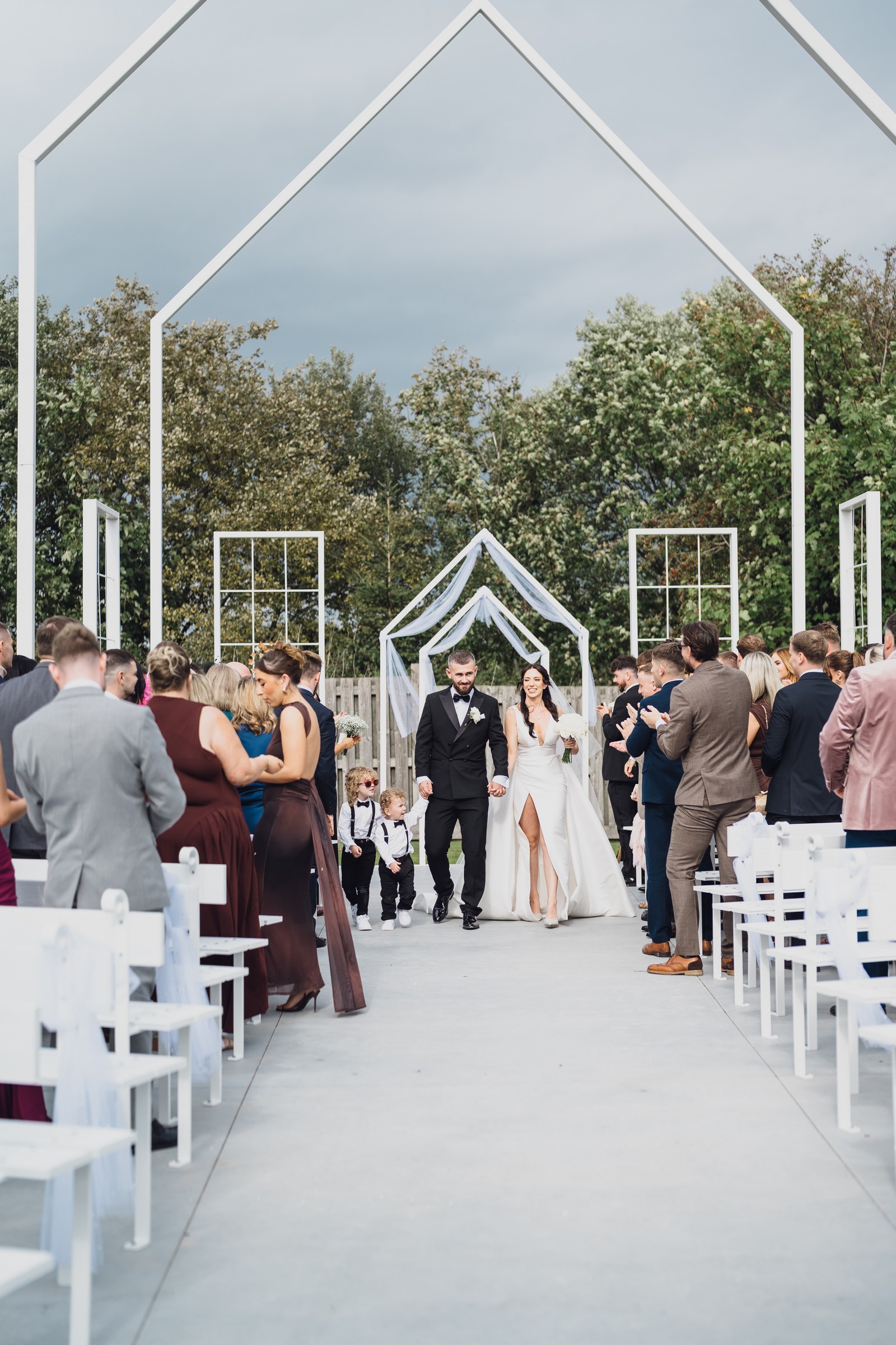 Chelsea looked absolutely radiant in her flowing gown with its gracefully draped train and deep V neckline – timeless yet modern. Elliot matched her elegance perfectly in a sharp black-tie suit, bringing a refined edge to the rustic surroundings.