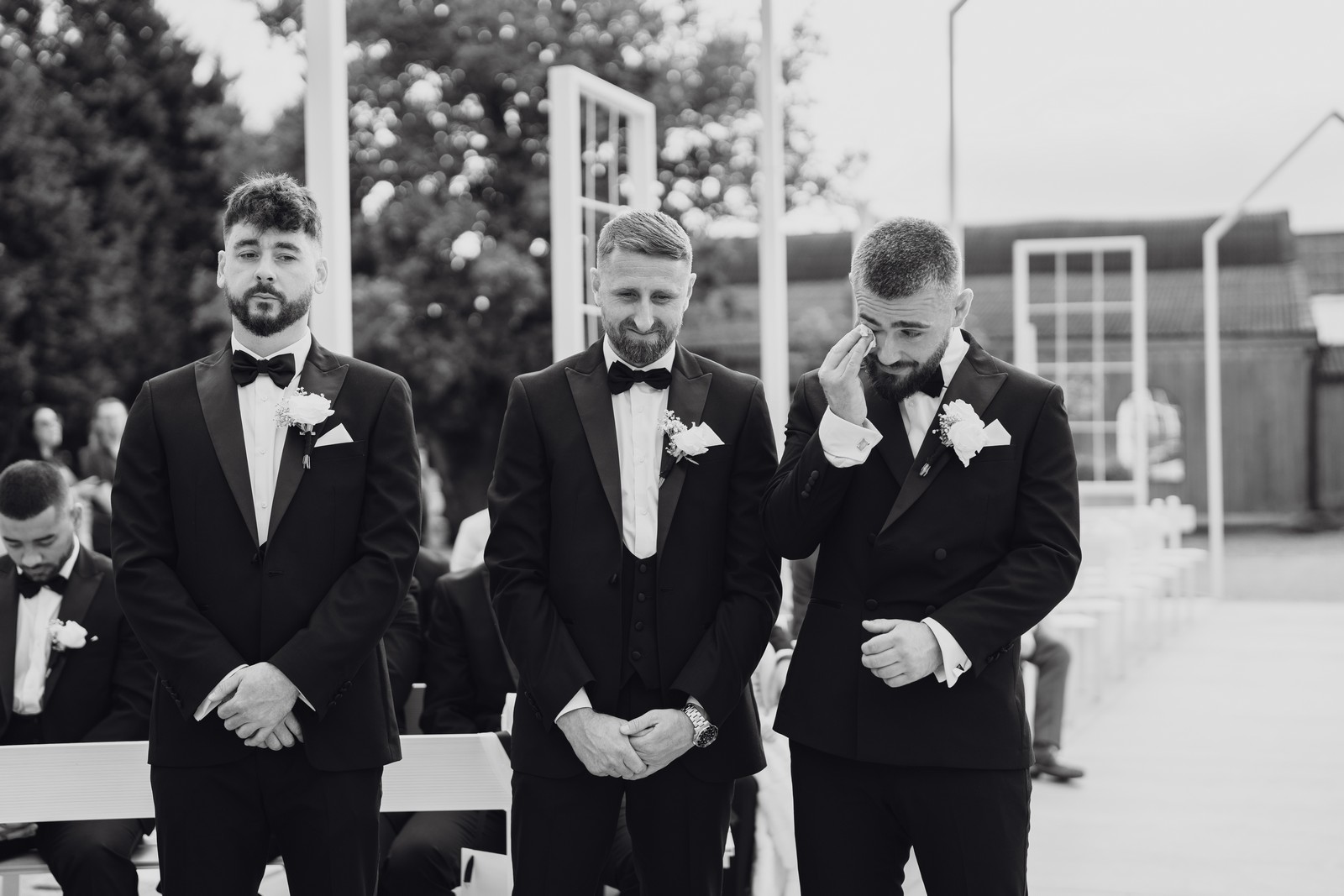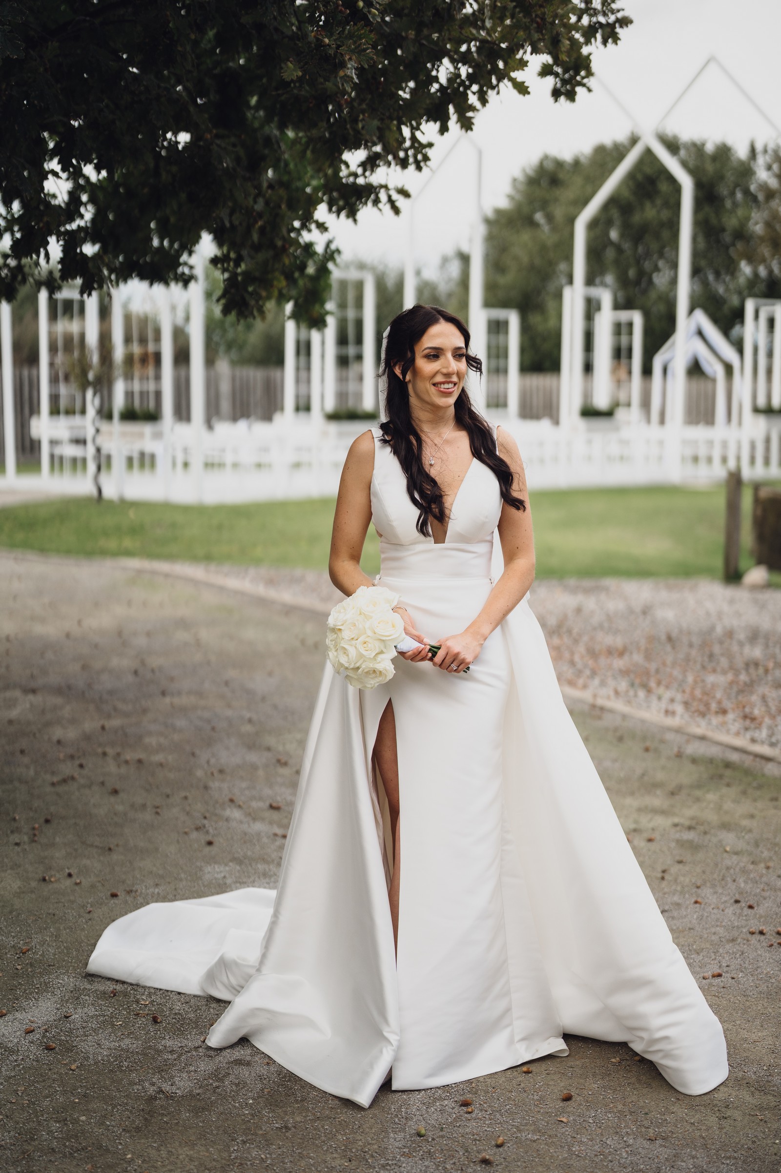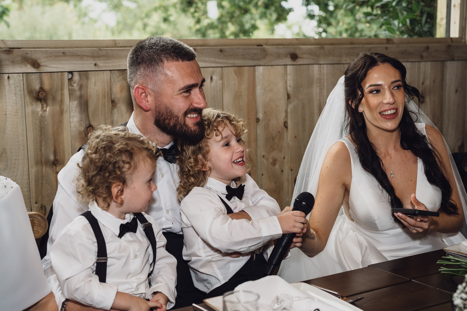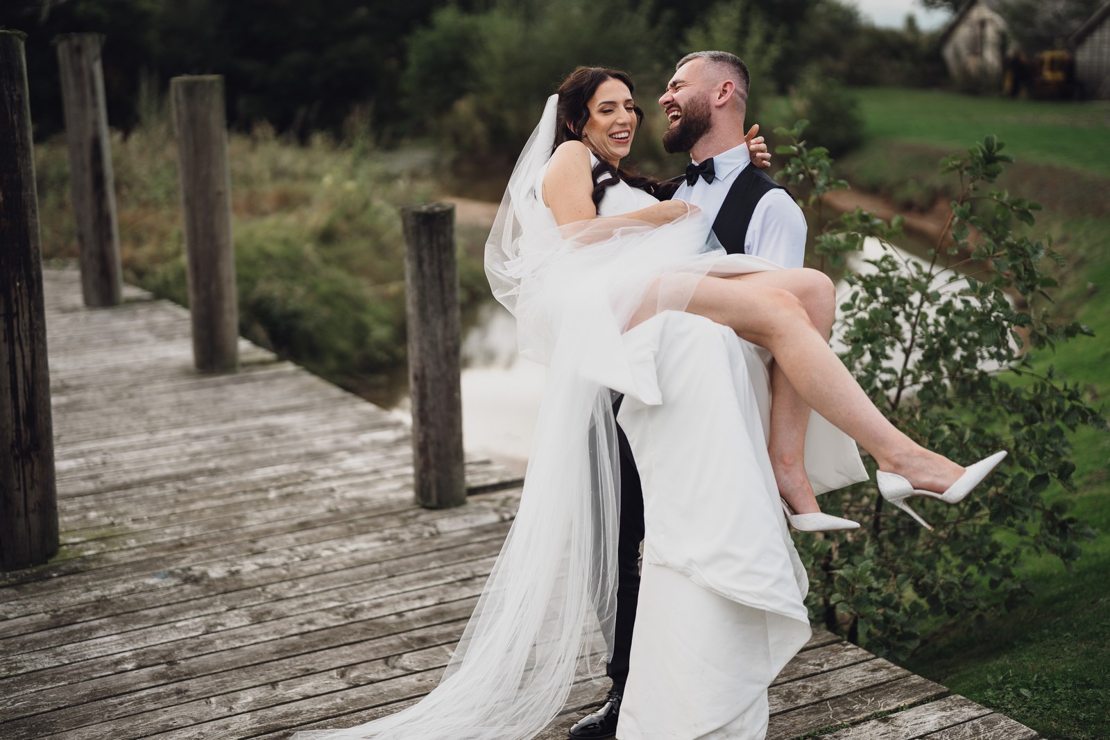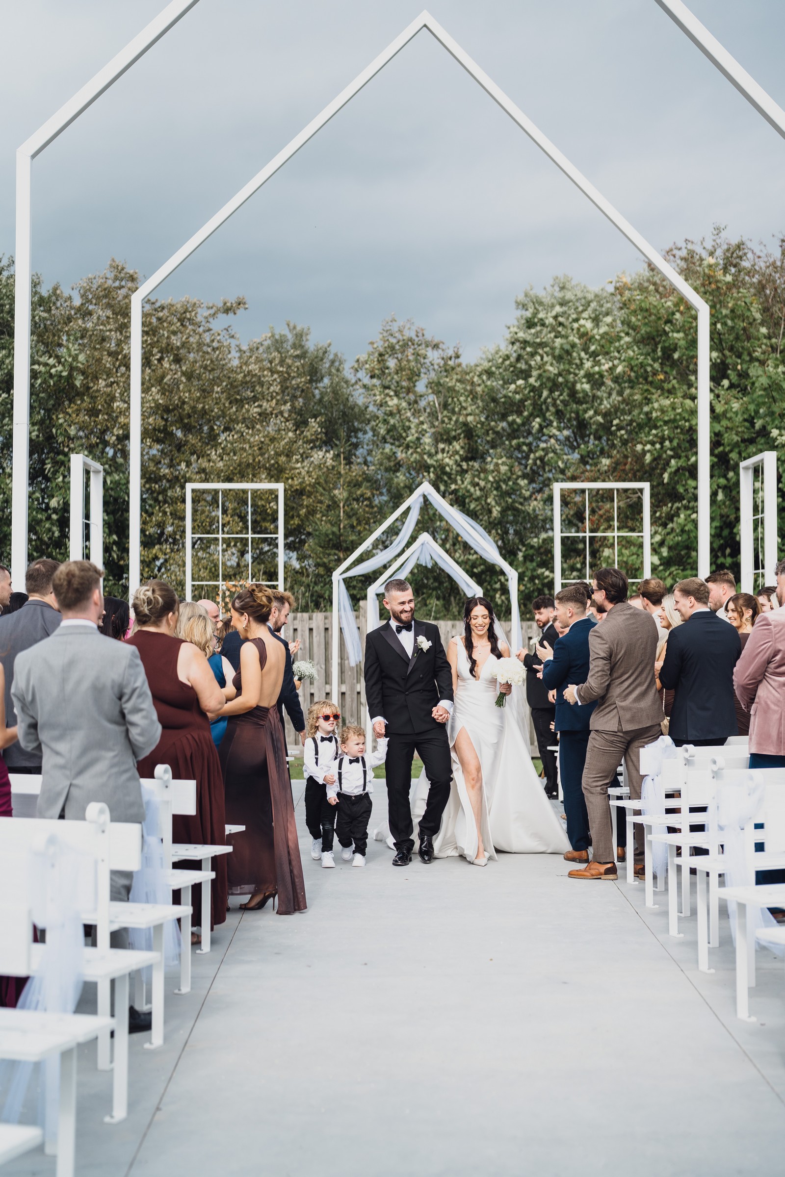 Chelsea looked absolutely radiant in her flowing gown with its gracefully draped train and deep V neckline – timeless yet modern. Elliot matched her elegance perfectly in a sharp black-tie suit, bringing a refined edge to the rustic surroundings.