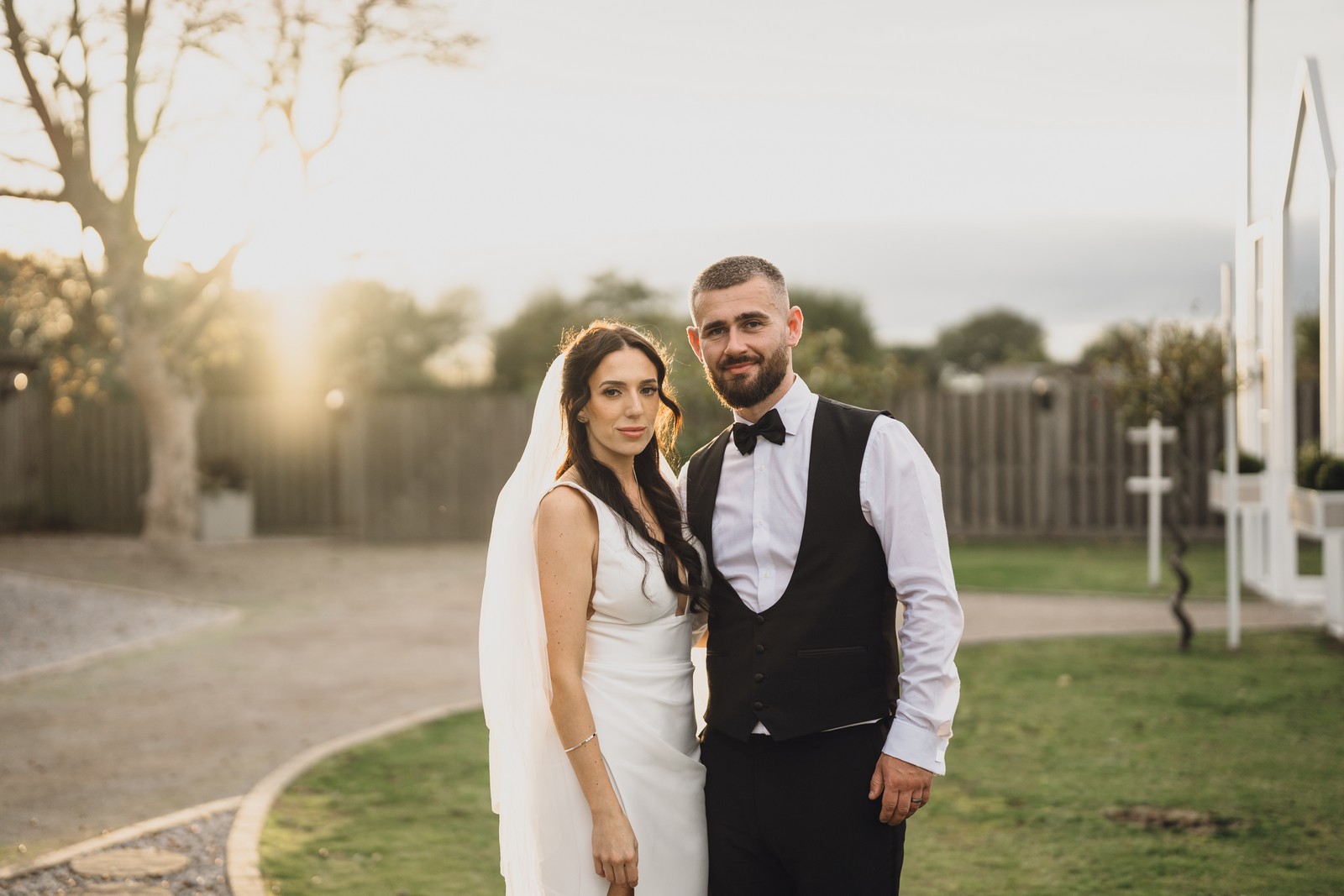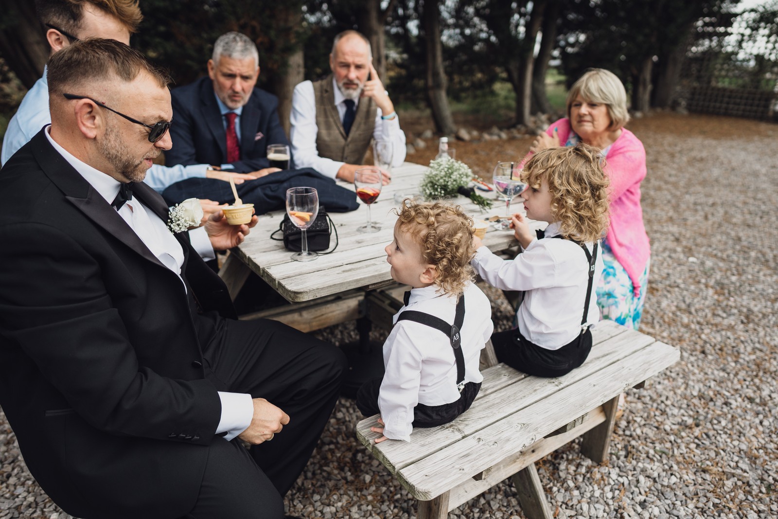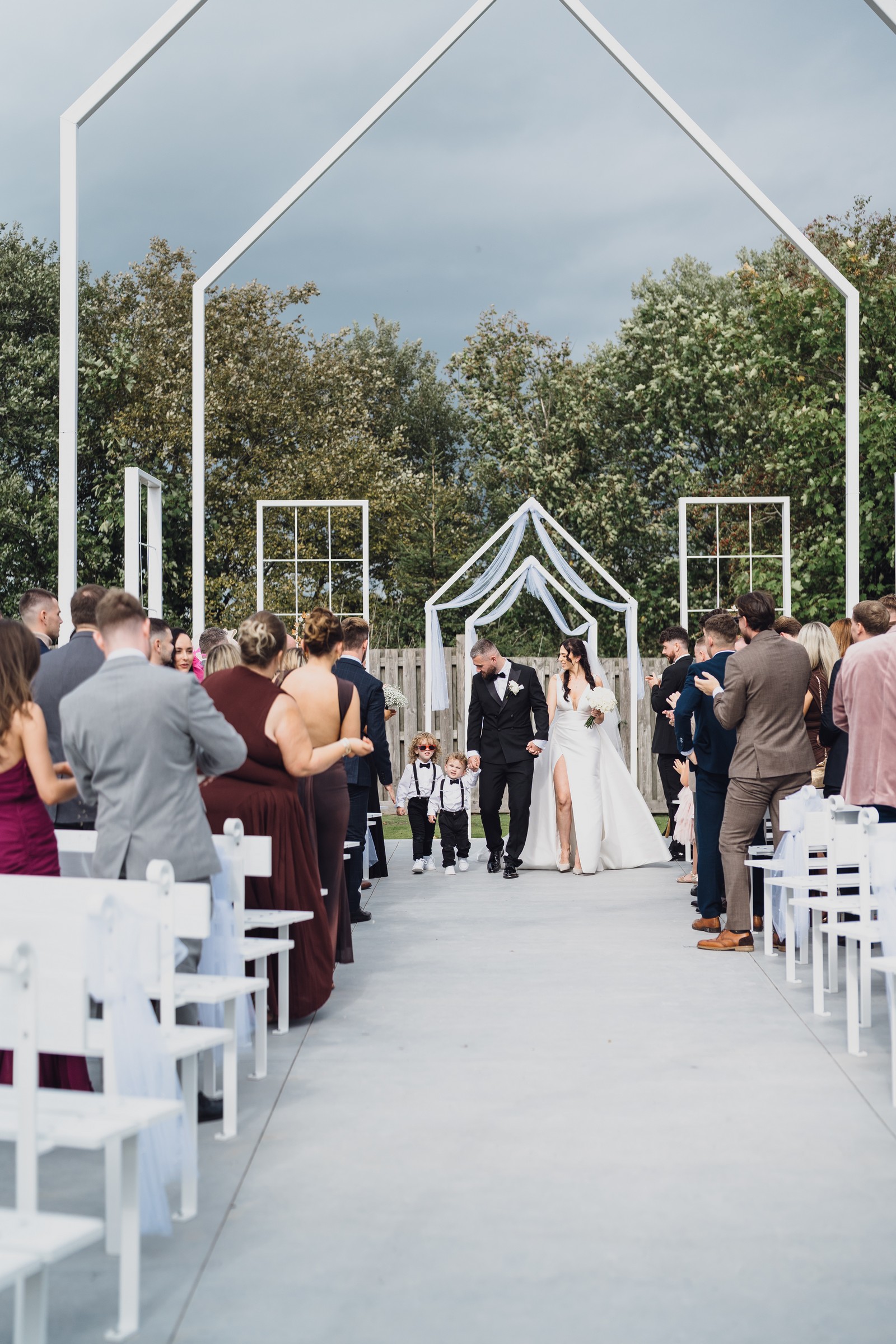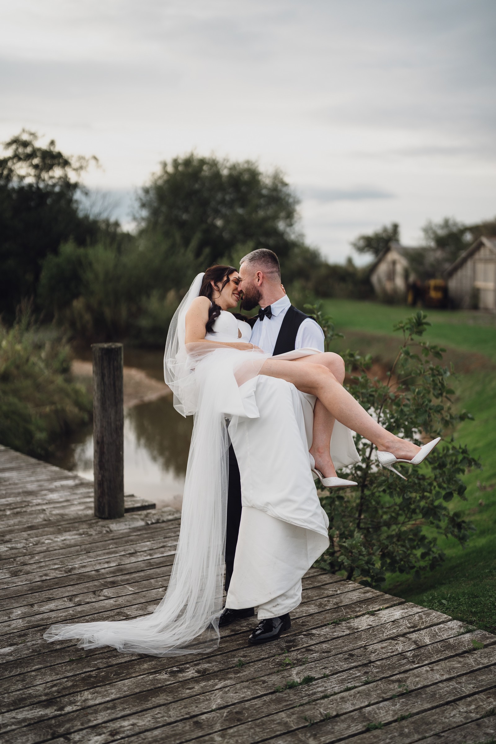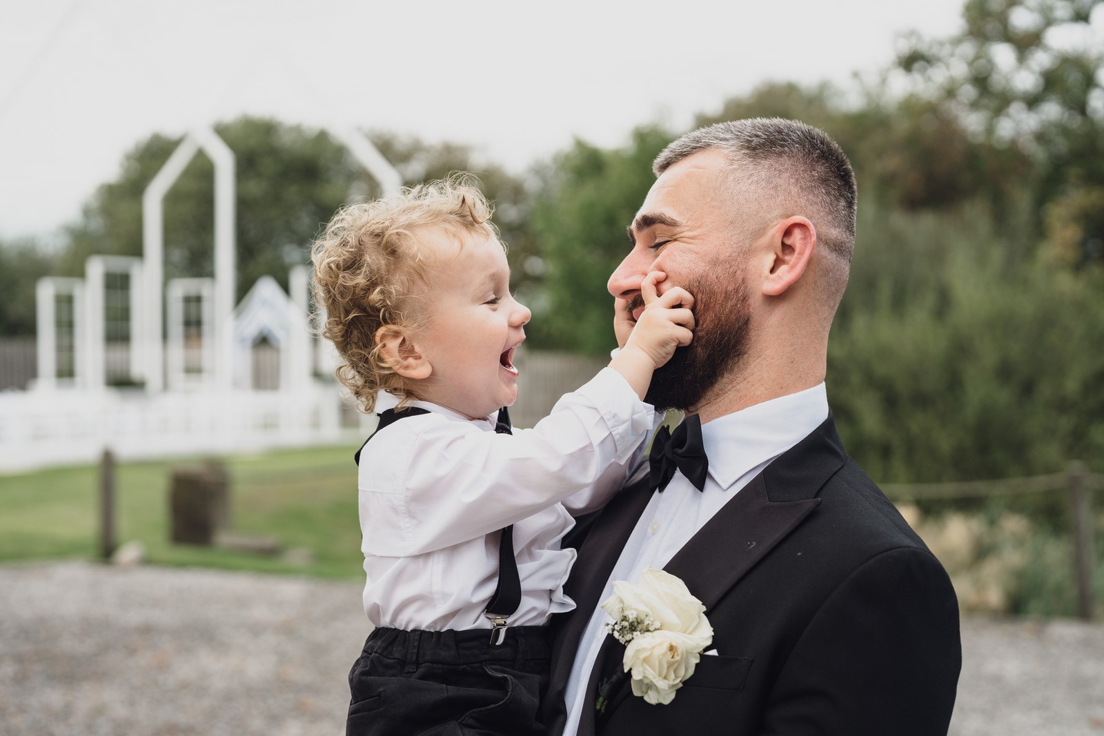 Chelsea looked absolutely radiant in her flowing gown with its gracefully draped train and deep V neckline – timeless yet modern. Elliot matched her elegance perfectly in a sharp black-tie suit, bringing a refined edge to the rustic surroundings.