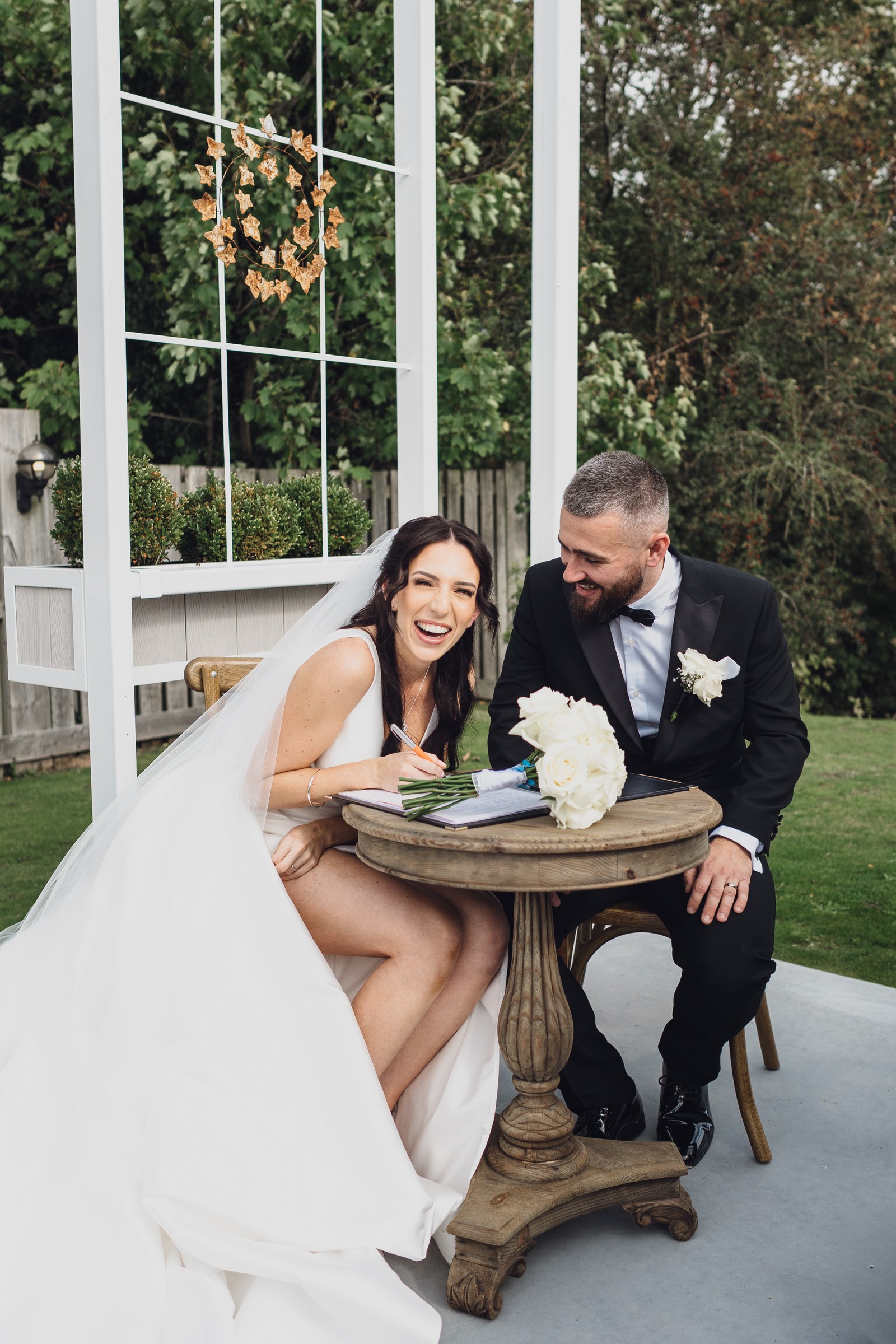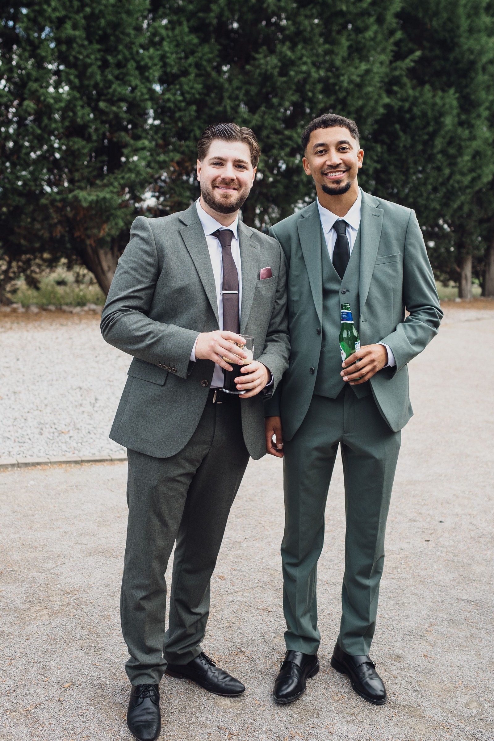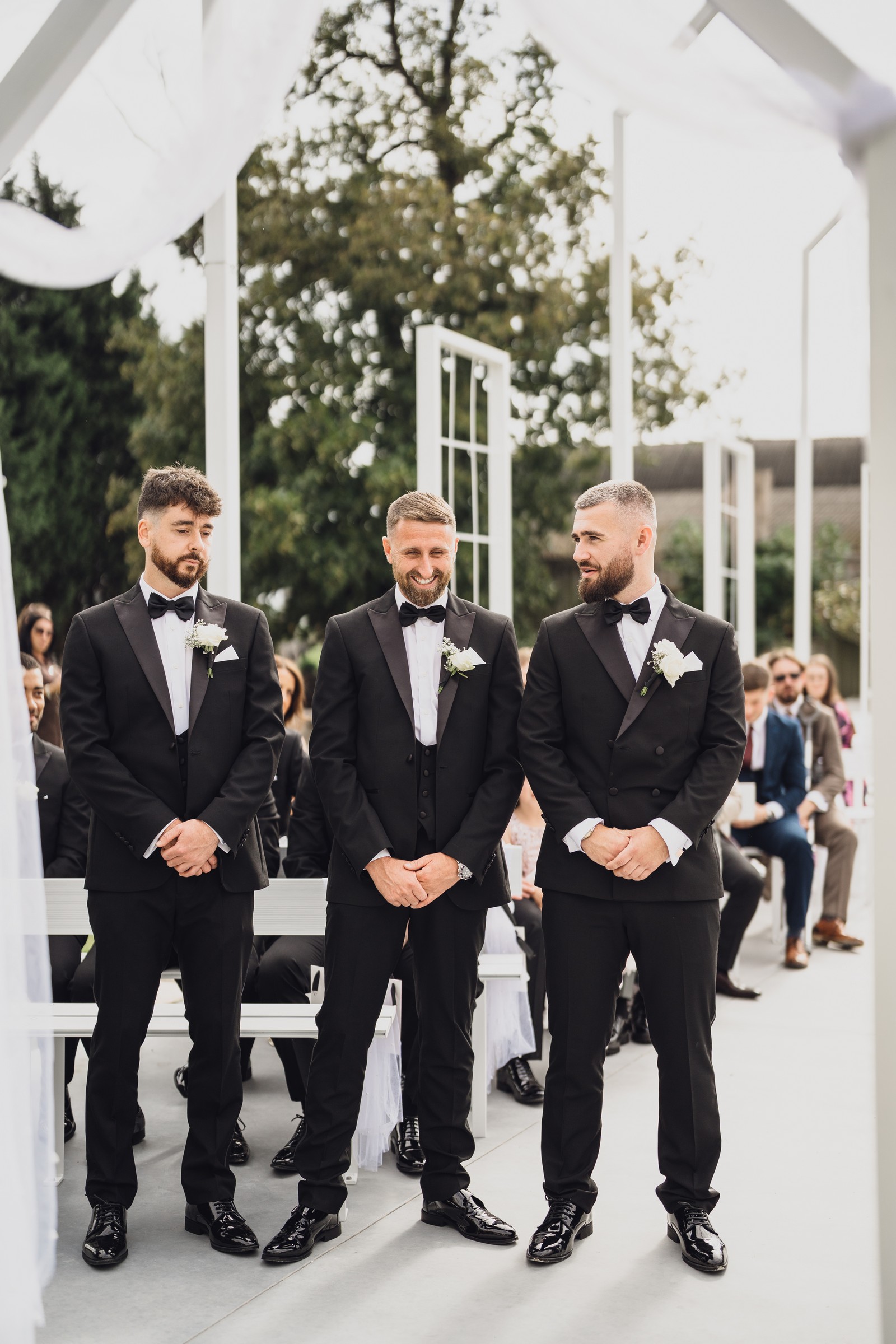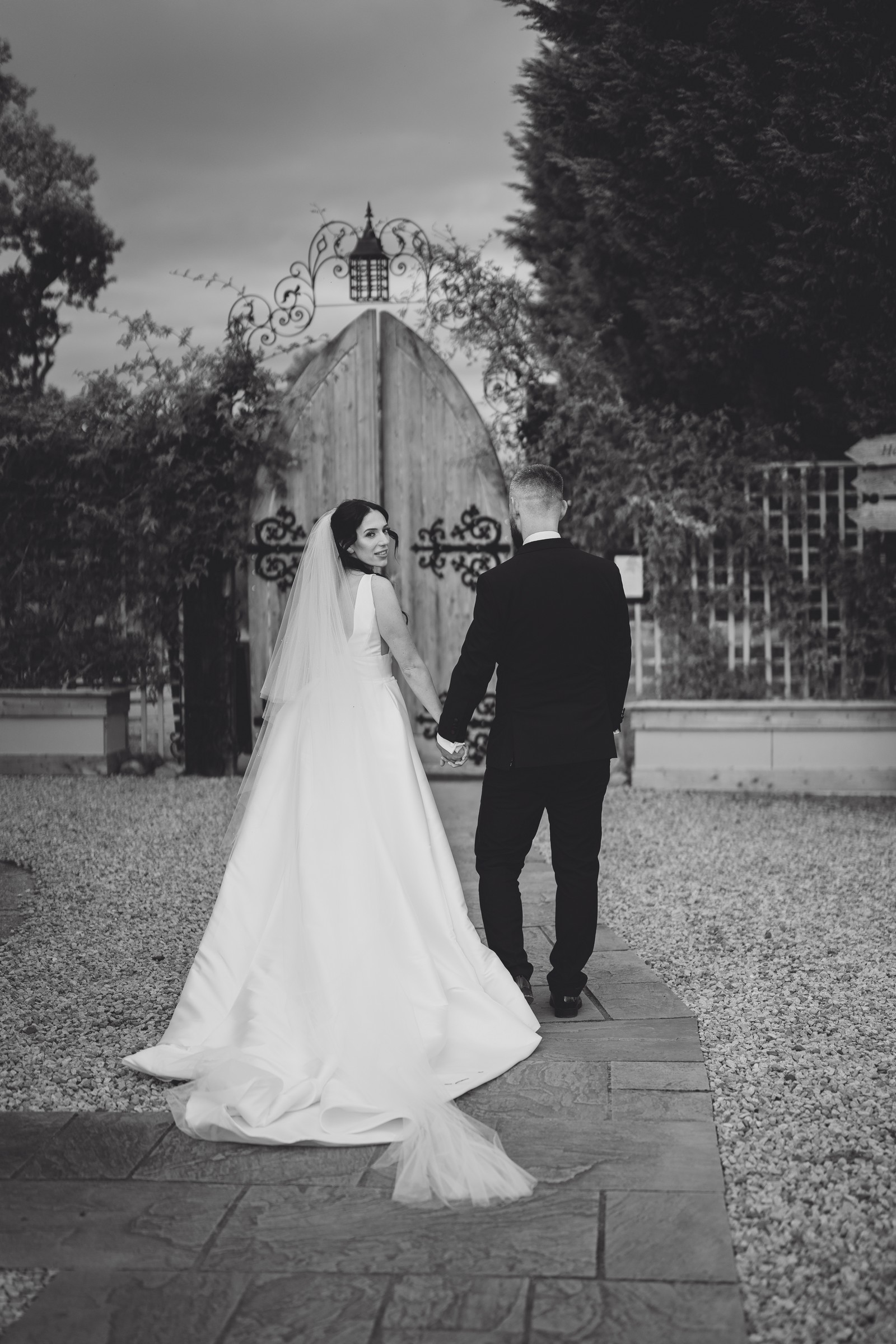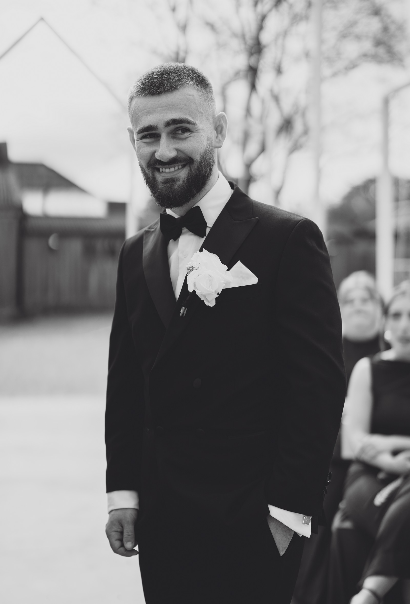 Chelsea looked absolutely radiant in her flowing gown with its gracefully draped train and deep V neckline – timeless yet modern. Elliot matched her elegance perfectly in a sharp black-tie suit, bringing a refined edge to the rustic surroundings.