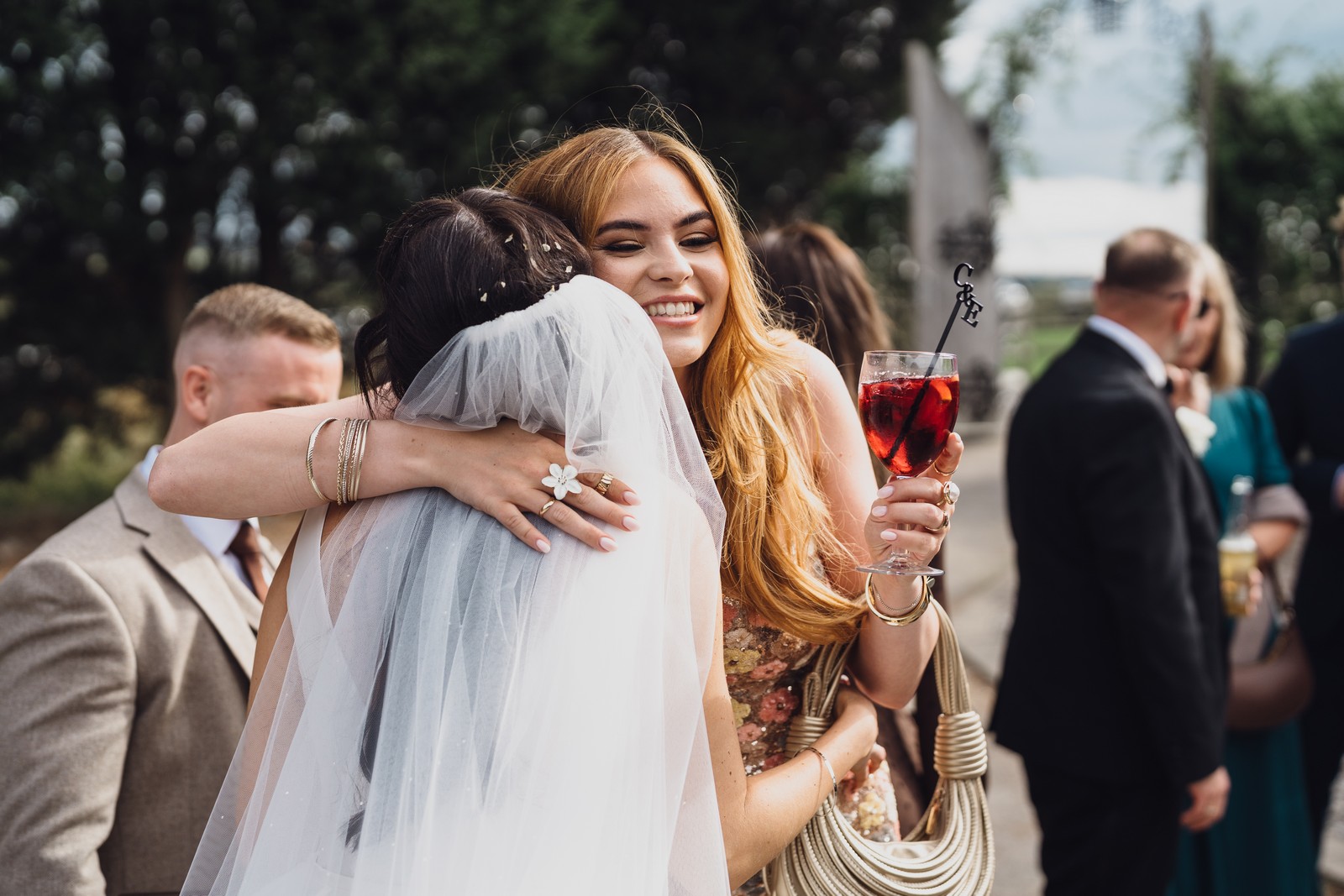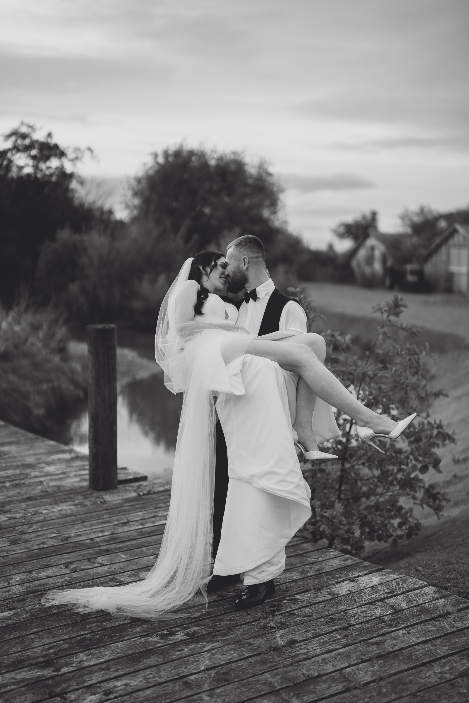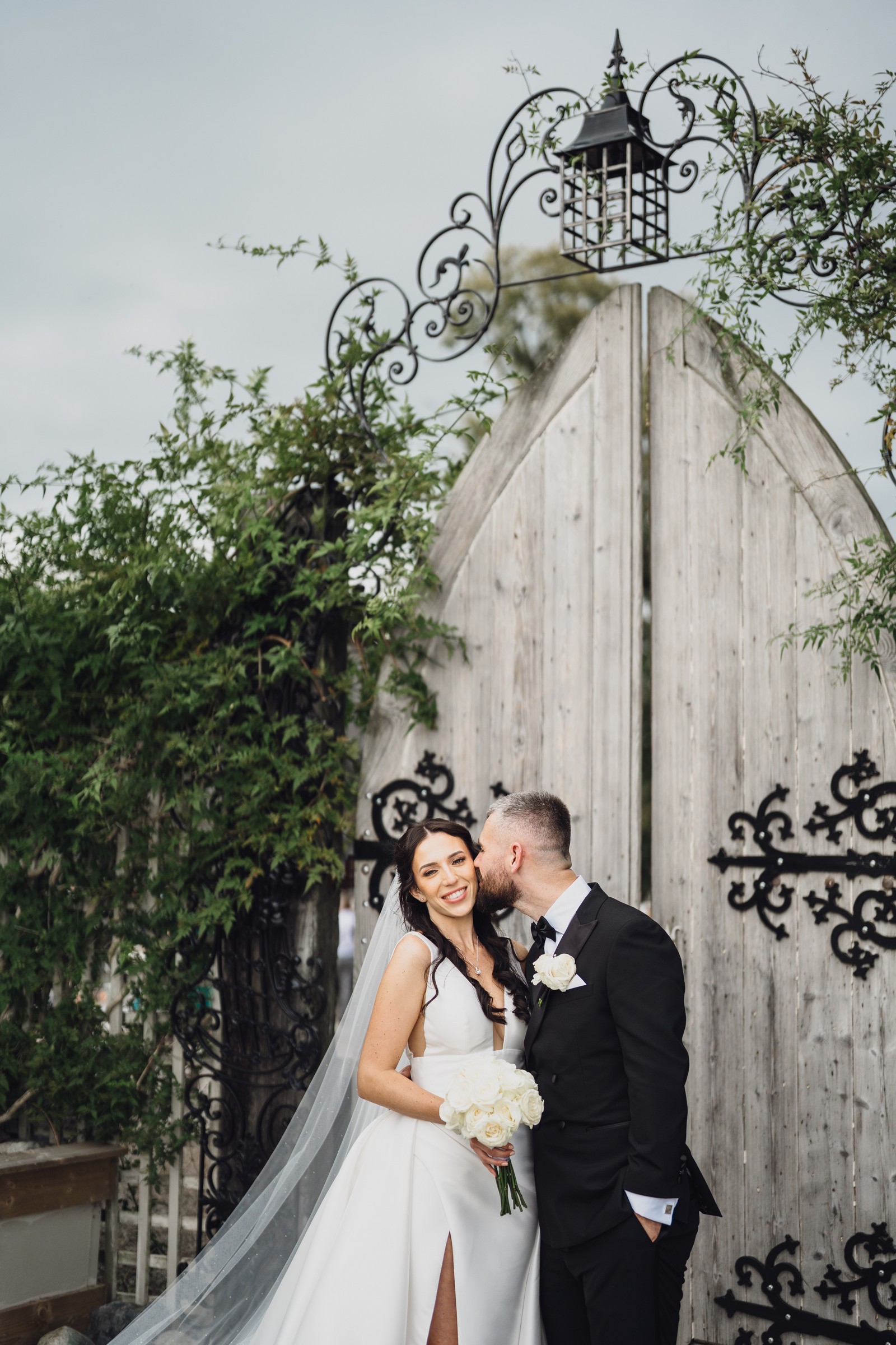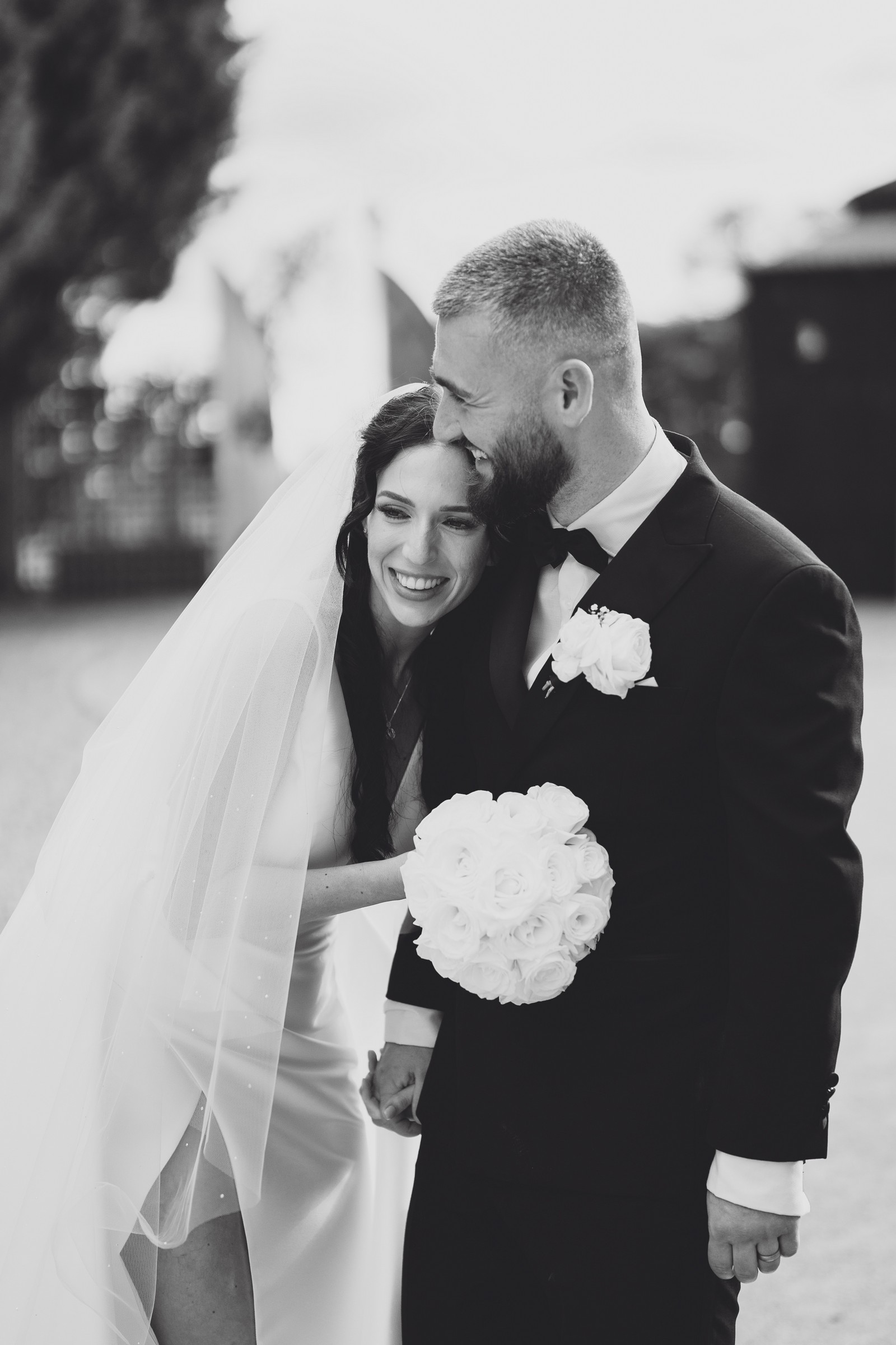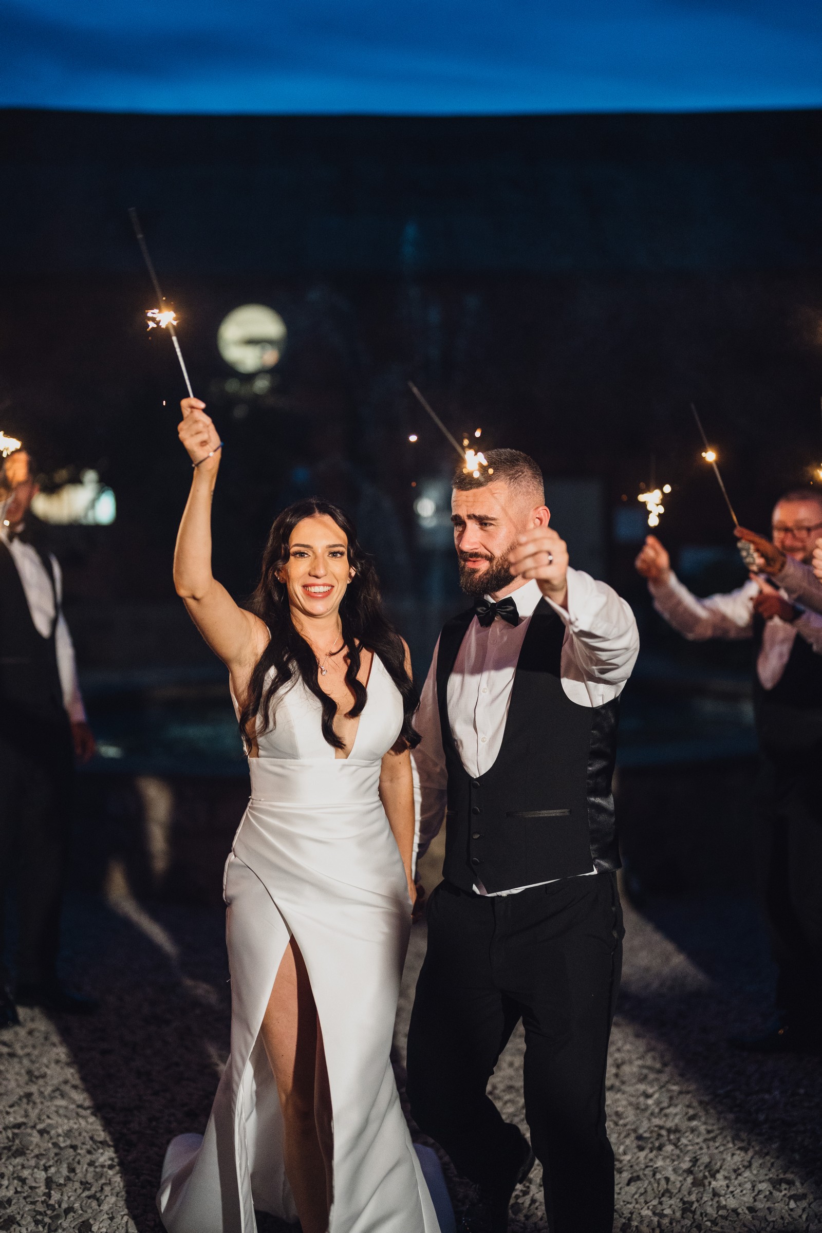 Chelsea looked absolutely radiant in her flowing gown with its gracefully draped train and deep V neckline – timeless yet modern. Elliot matched her elegance perfectly in a sharp black-tie suit, bringing a refined edge to the rustic surroundings.