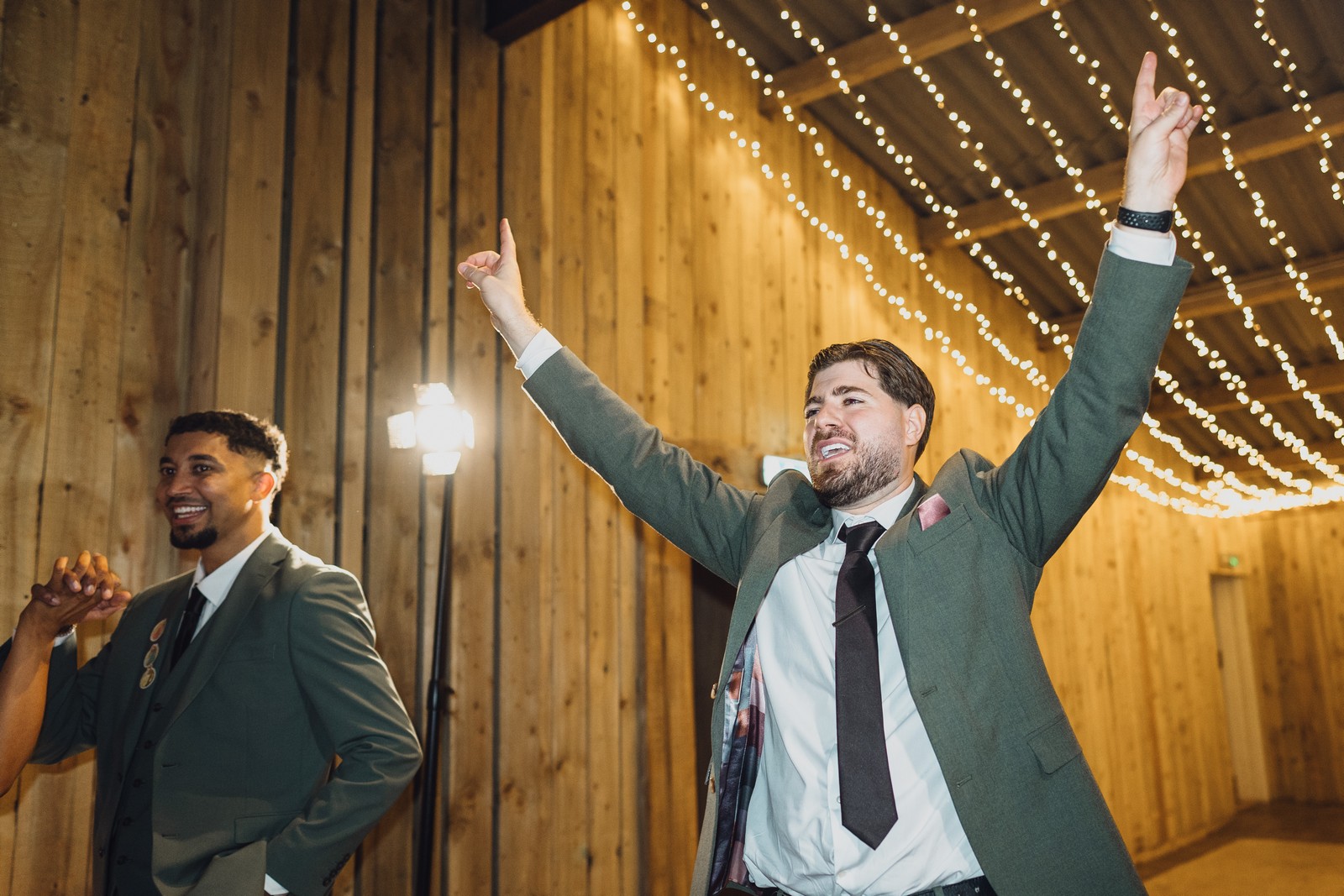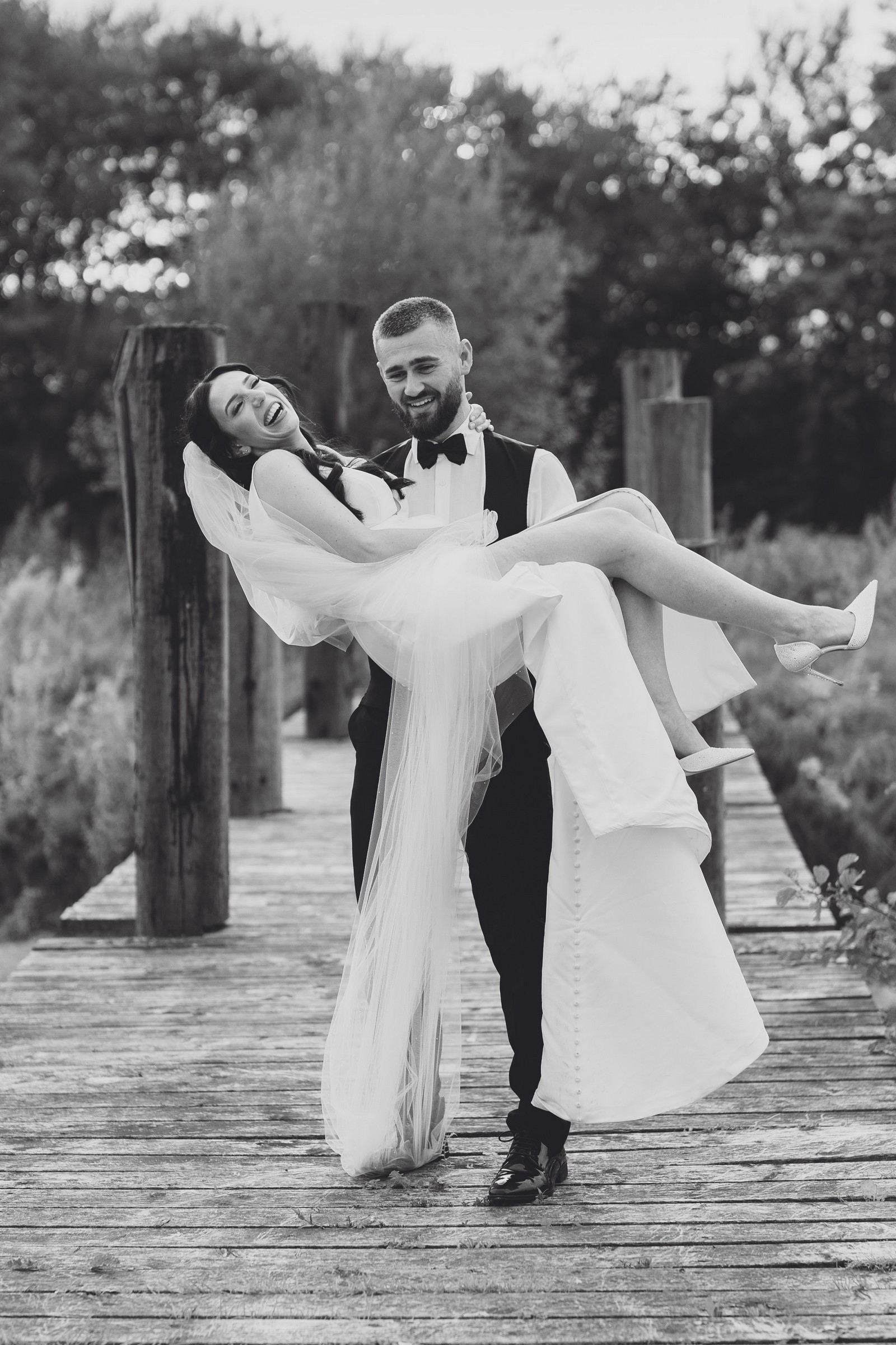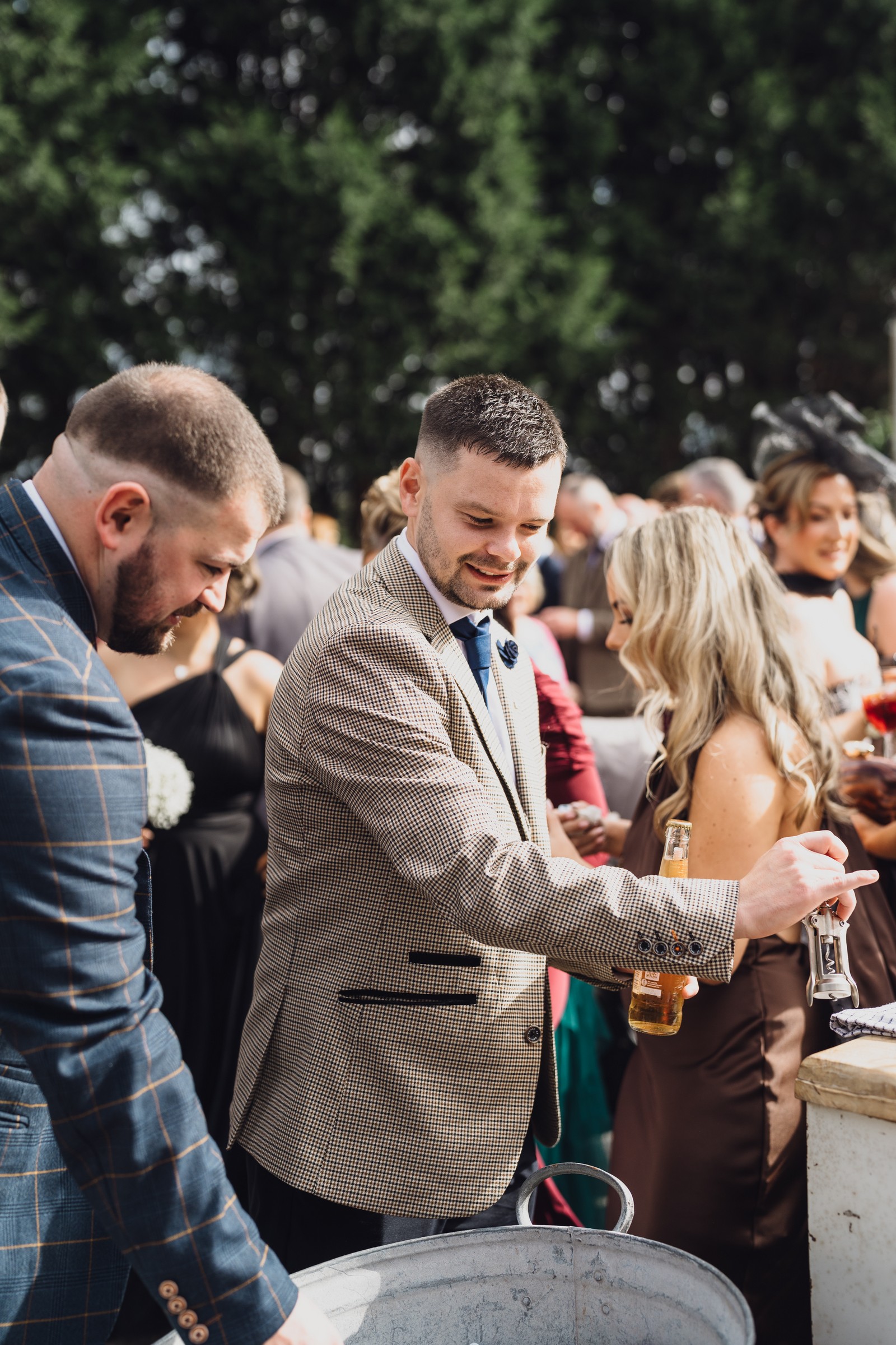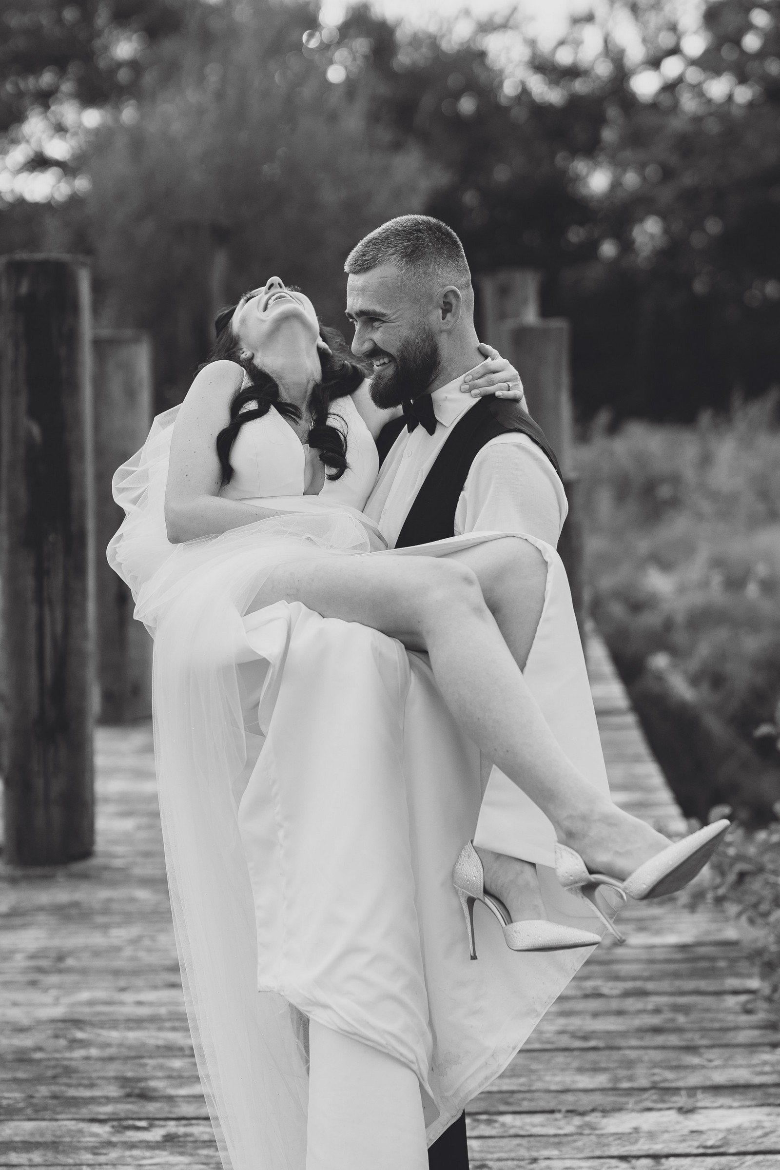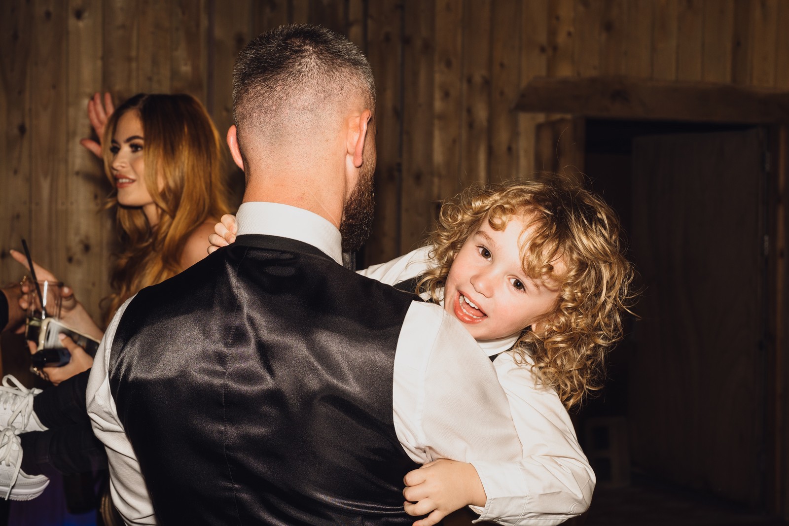 Chelsea looked absolutely radiant in her flowing gown with its gracefully draped train and deep V neckline – timeless yet modern. Elliot matched her elegance perfectly in a sharp black-tie suit, bringing a refined edge to the rustic surroundings.