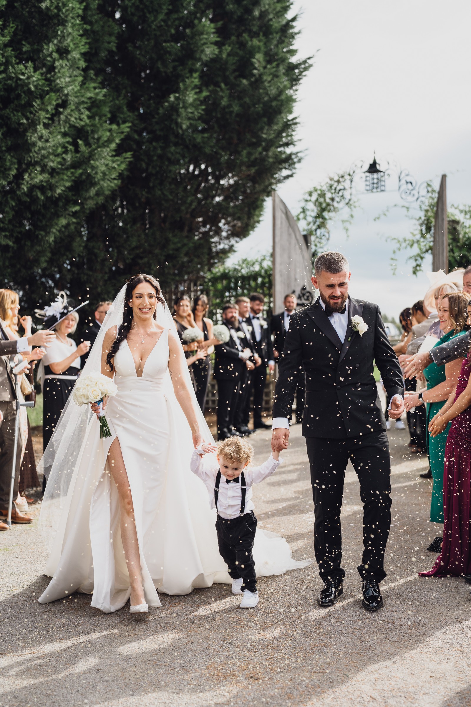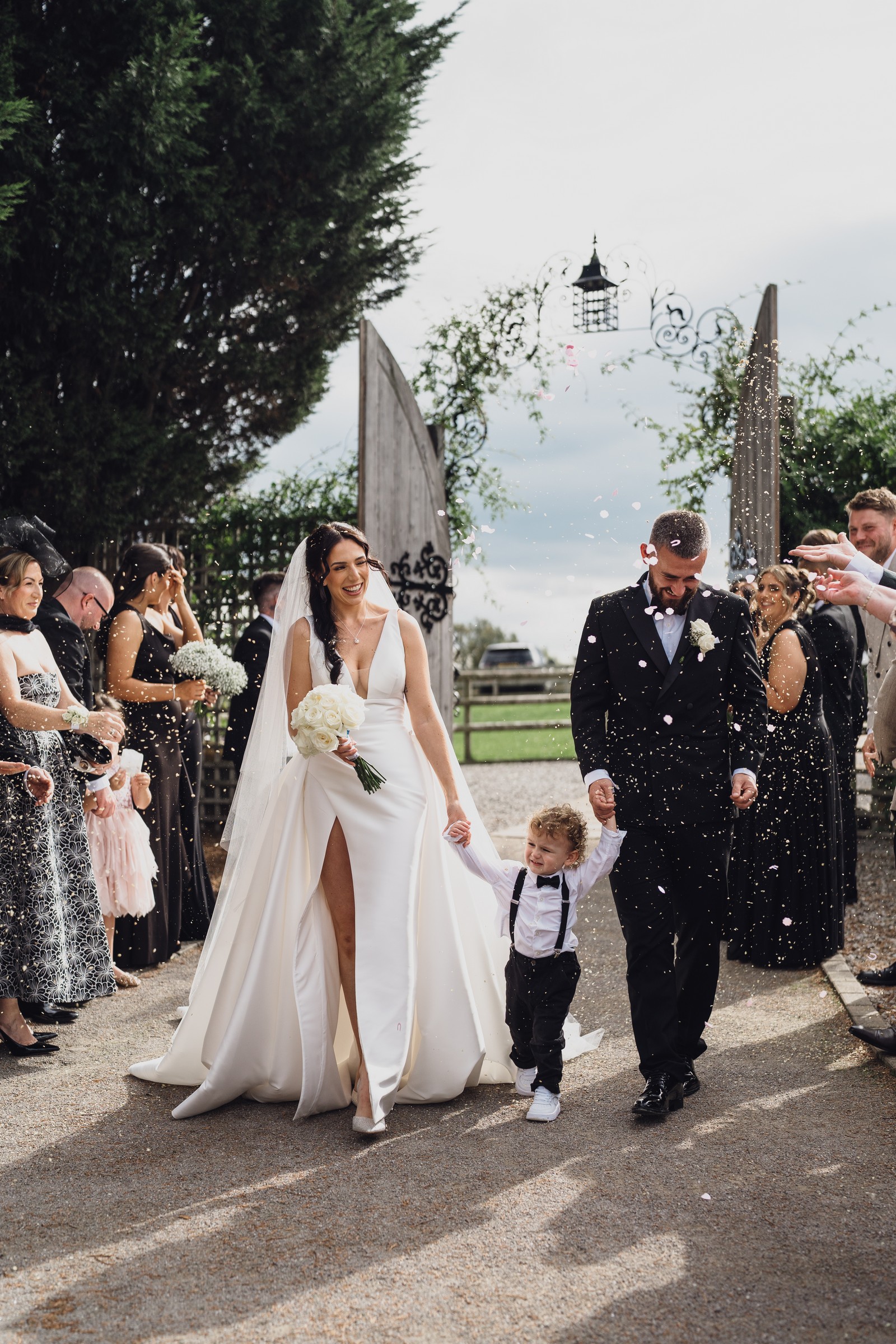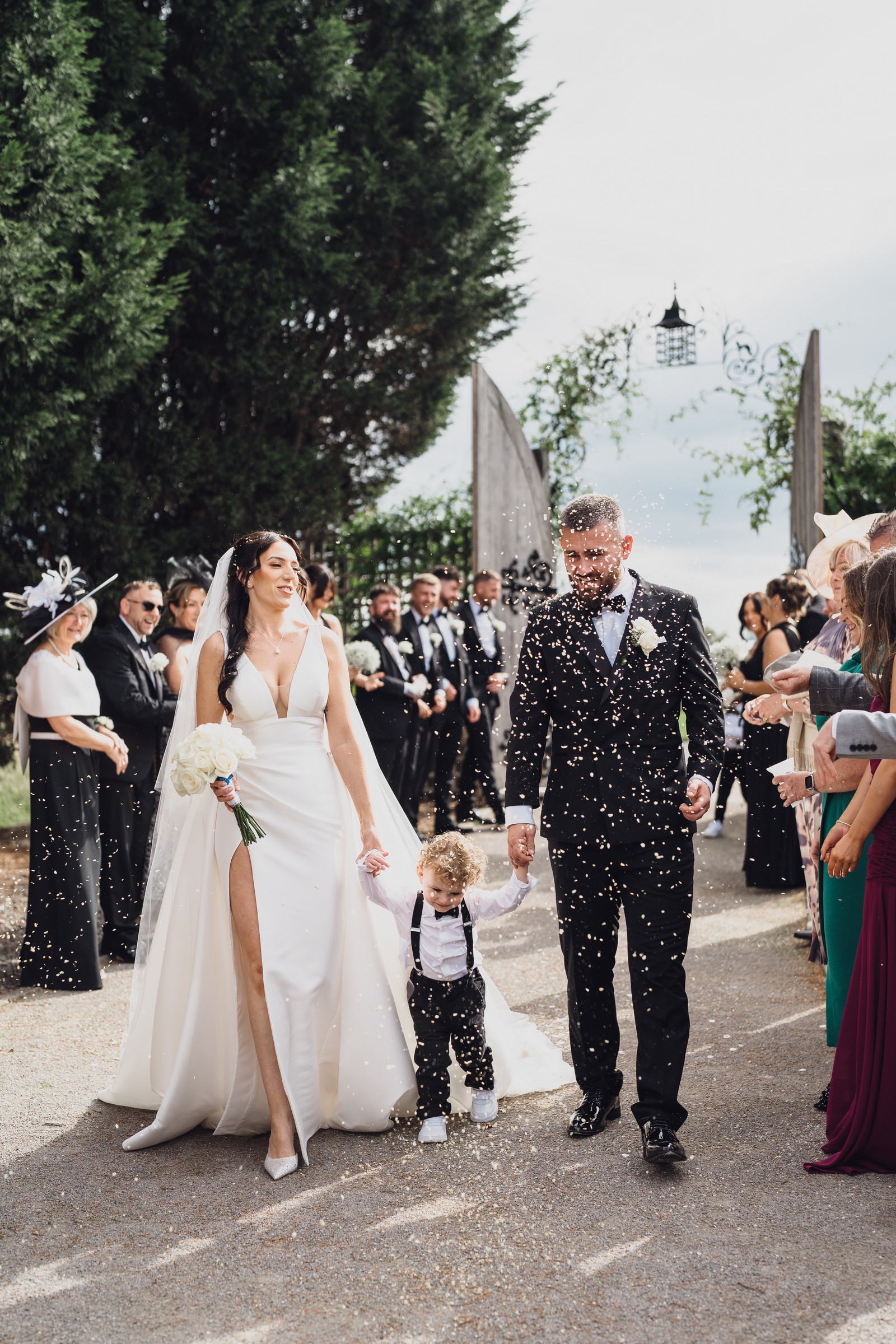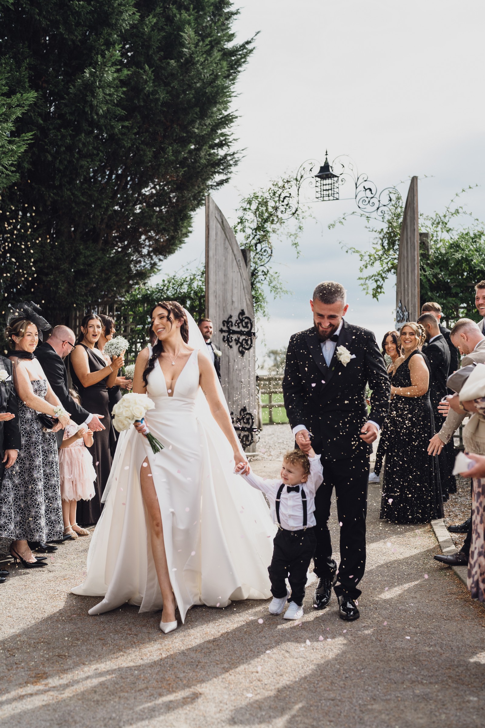 As the newlyweds stepped out hand-in-hand, guests lined the pathway, cheering and filling the air with fluttering petals. The images show pure joy – Chelsea laughing as confetti swirls around her, Elliot smiling proudly, and their little one holding their hands, taking in the excitement with adorable curiosity.