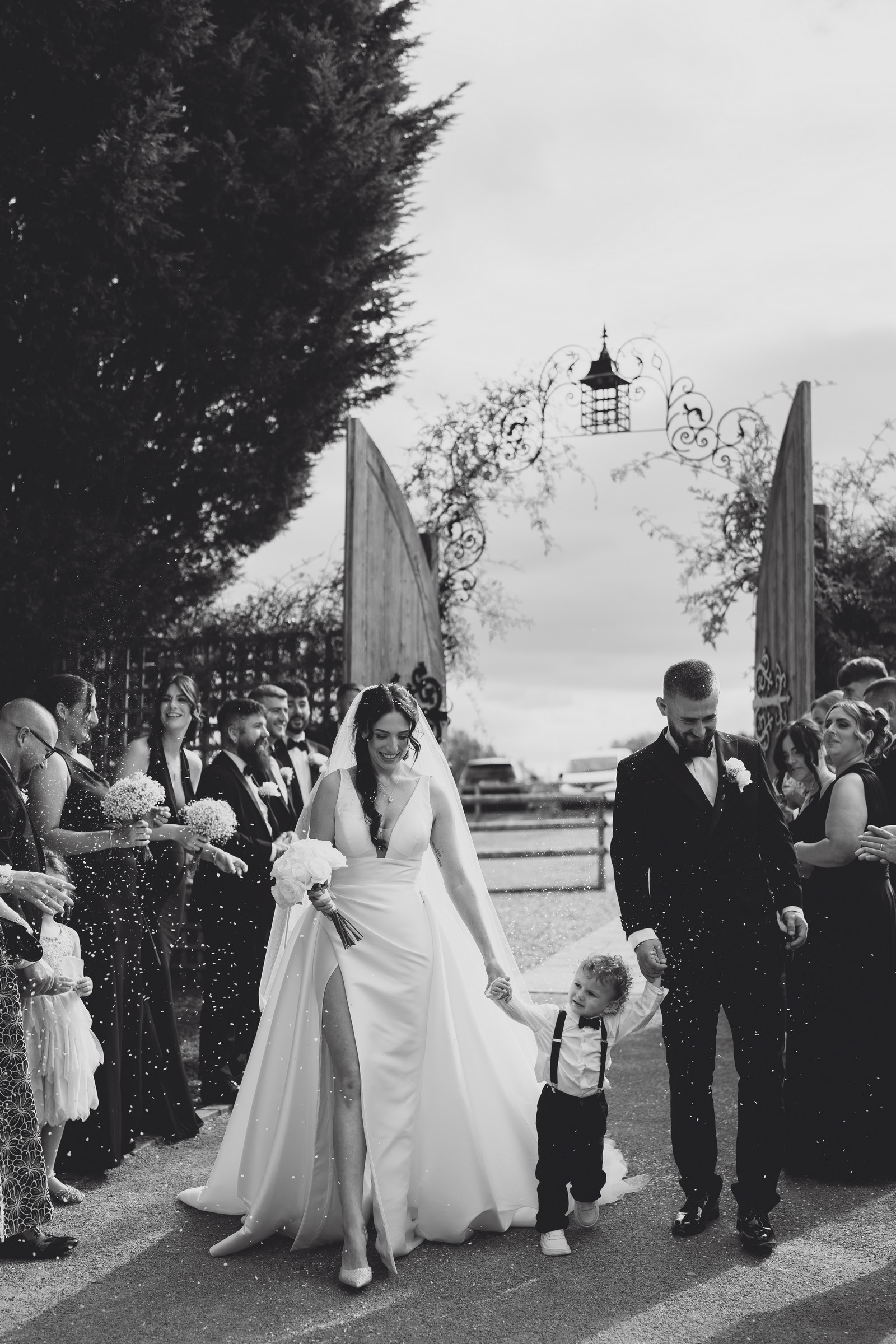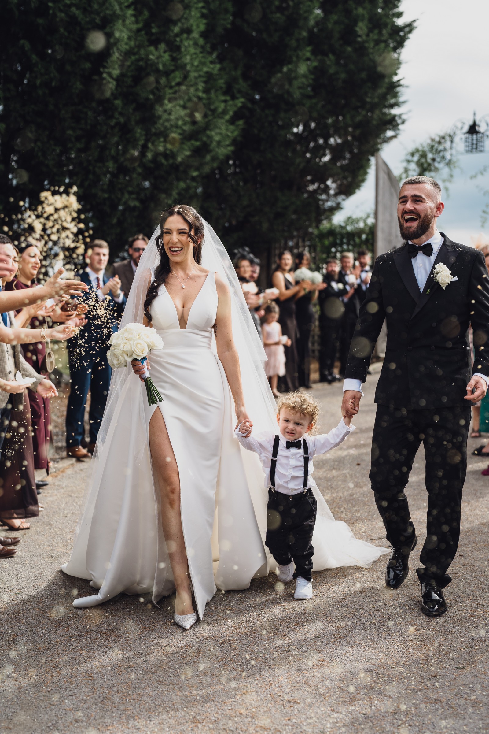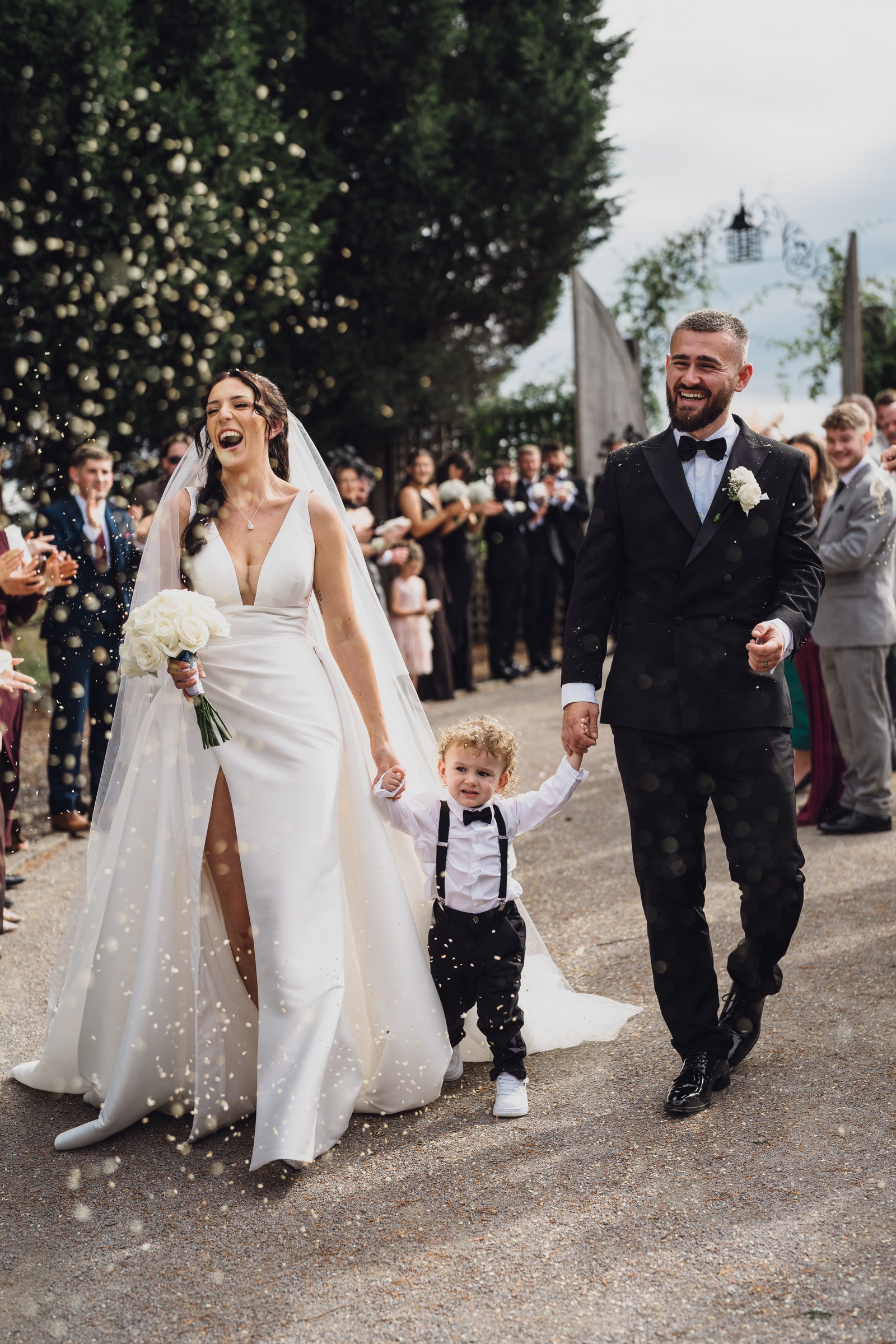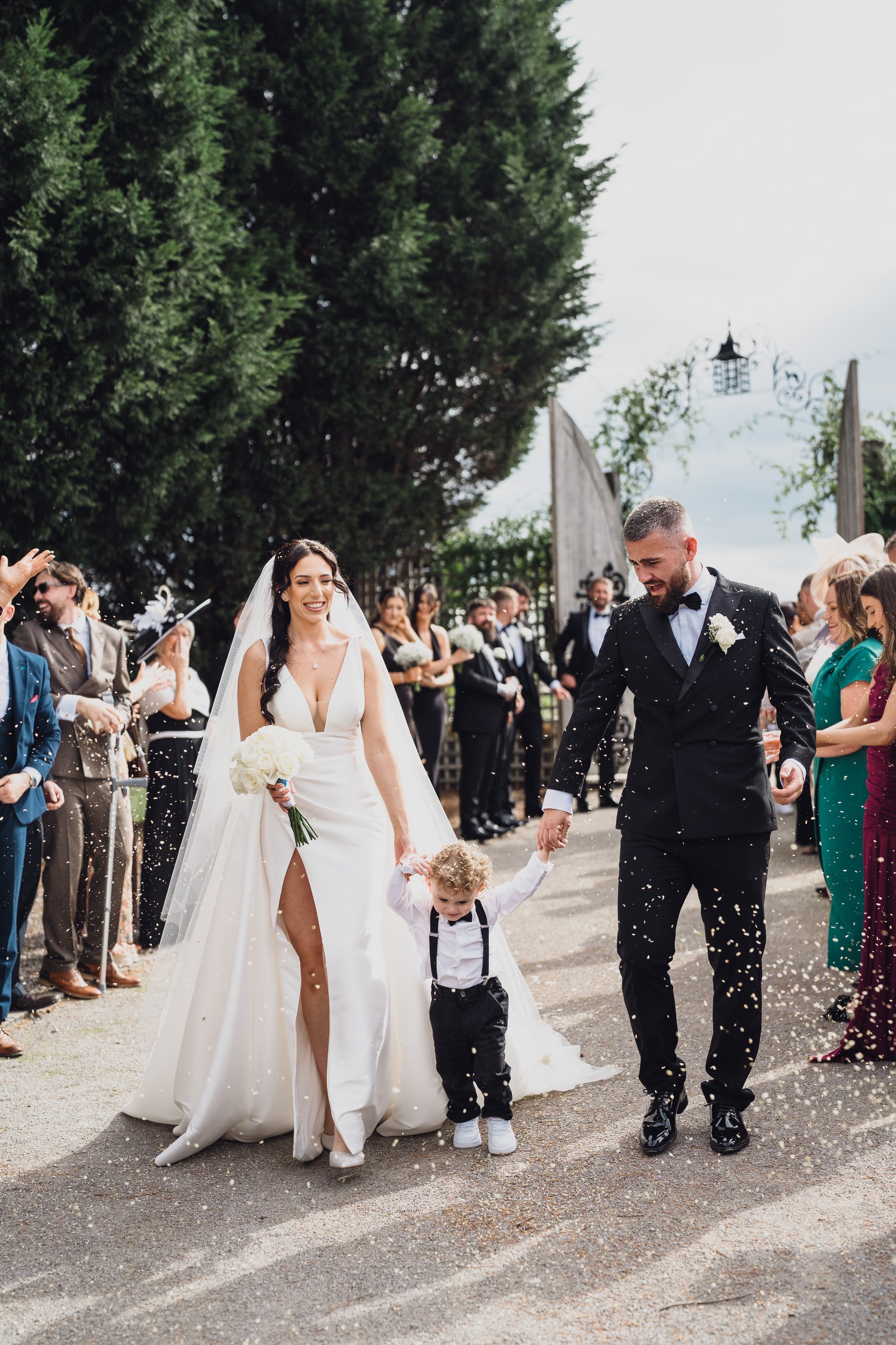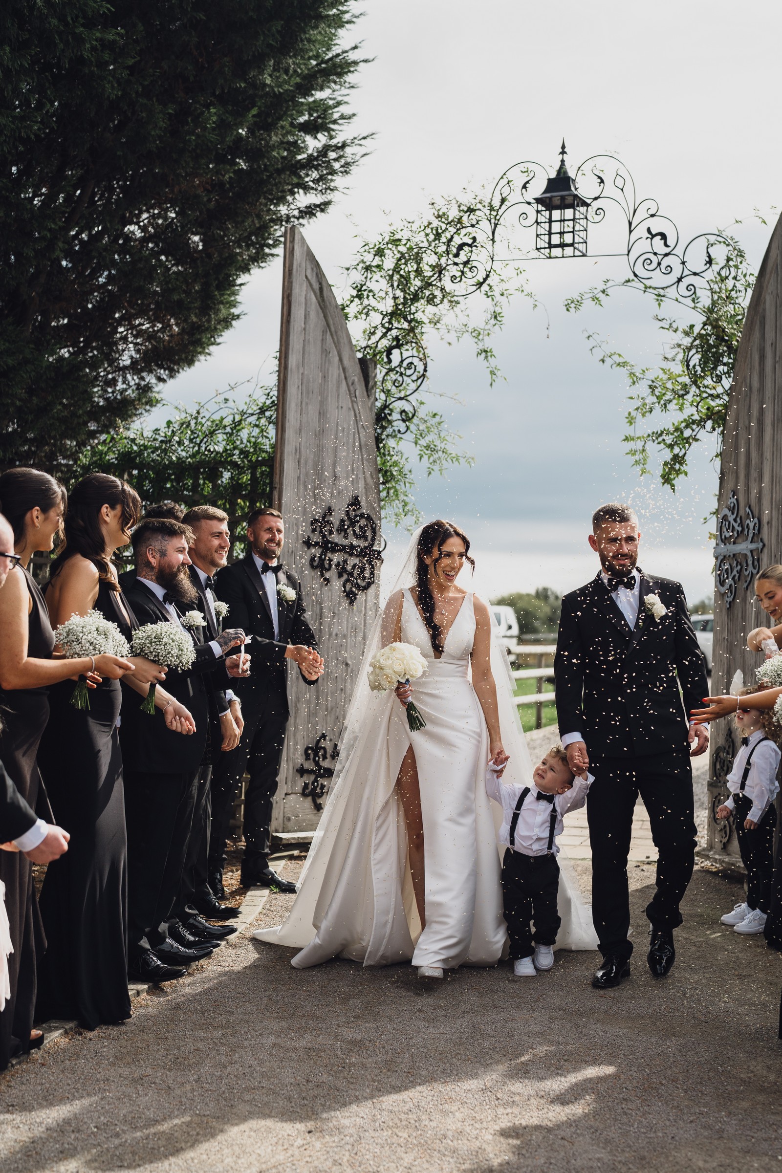 As the newlyweds stepped out hand-in-hand, guests lined the pathway, cheering and filling the air with fluttering petals. The images show pure joy – Chelsea laughing as confetti swirls around her, Elliot smiling proudly, and their little one holding their hands, taking in the excitement with adorable curiosity.