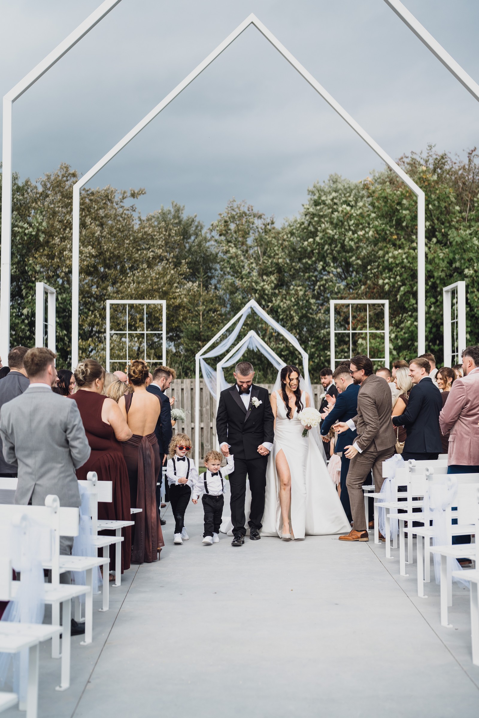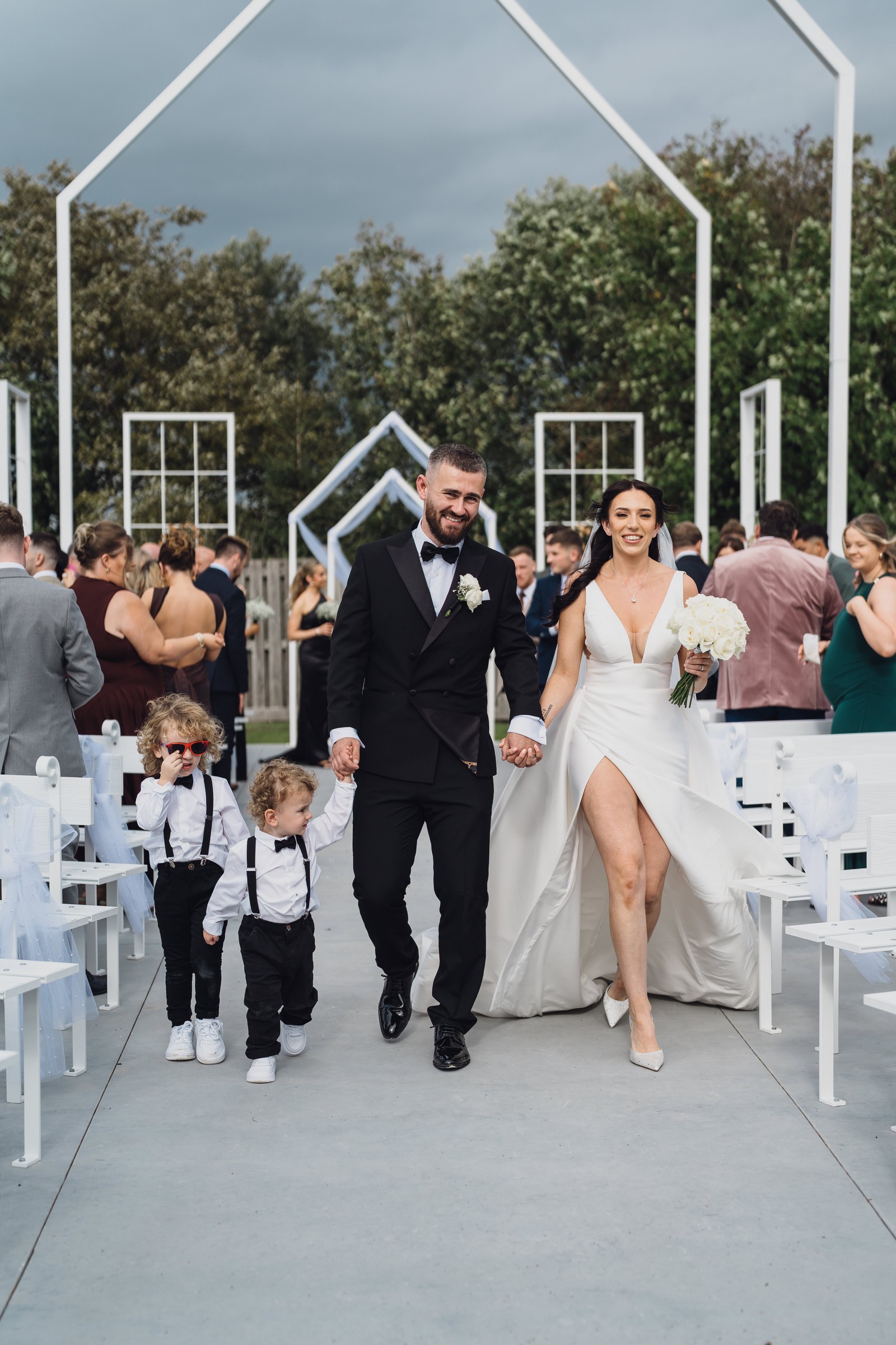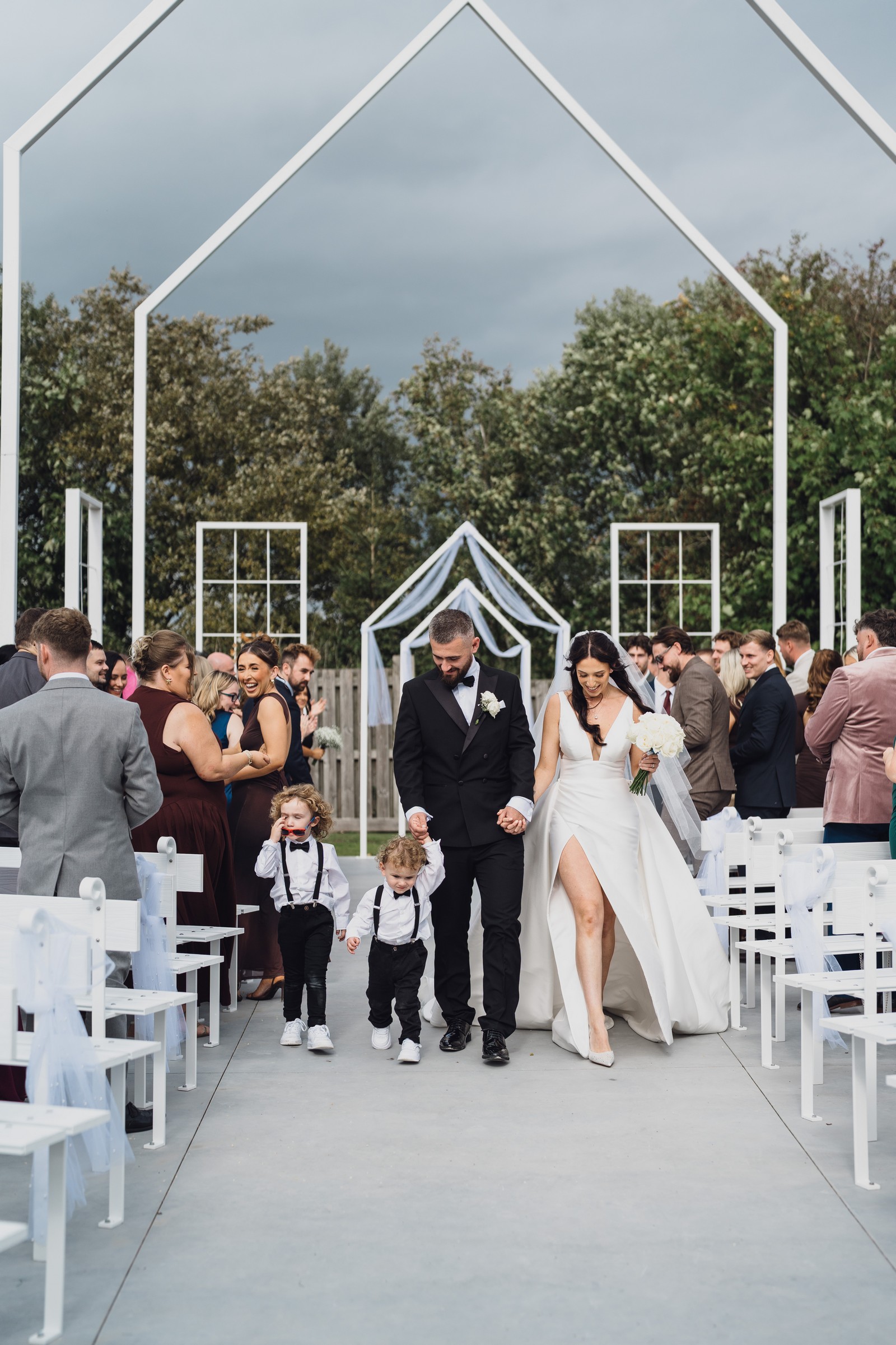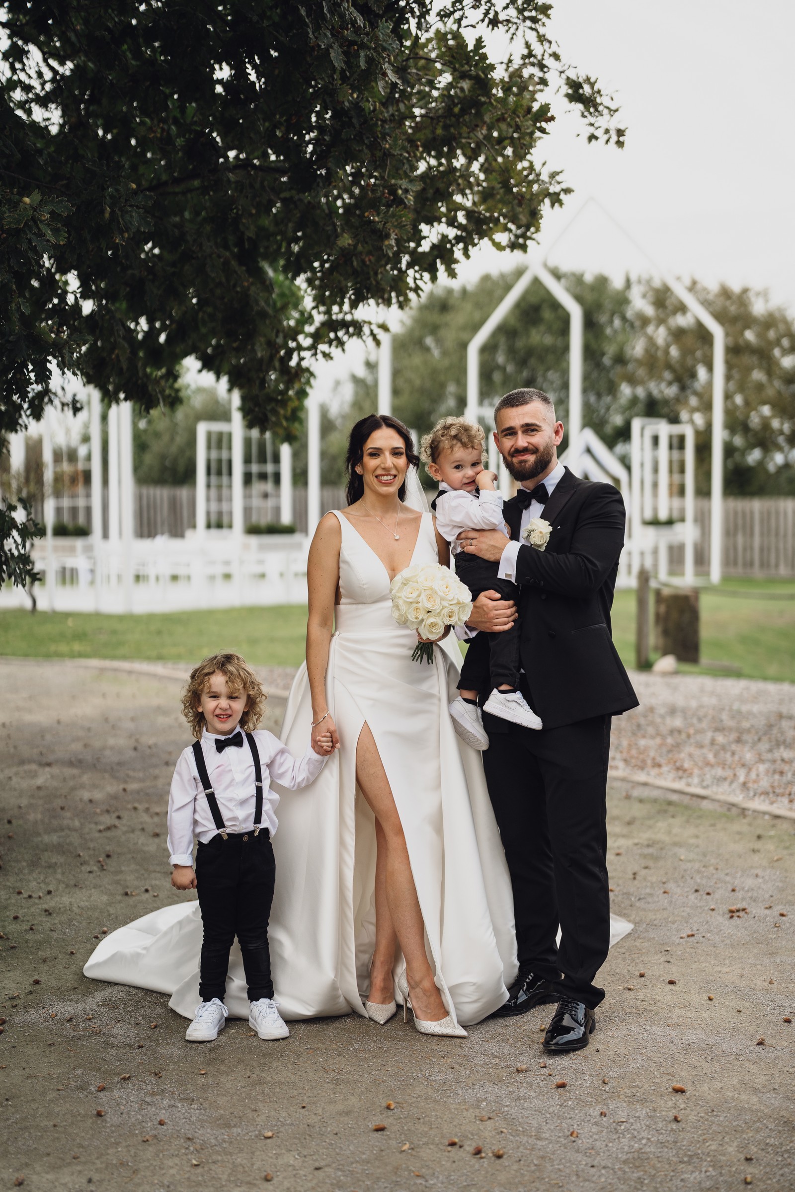As the newlyweds stepped out hand-in-hand, guests lined the pathway, cheering and filling the air with fluttering petals. The images show pure joy – Chelsea laughing as confetti swirls around her, Elliot smiling proudly, and their little one holding their hands, taking in the excitement with adorable curiosity.