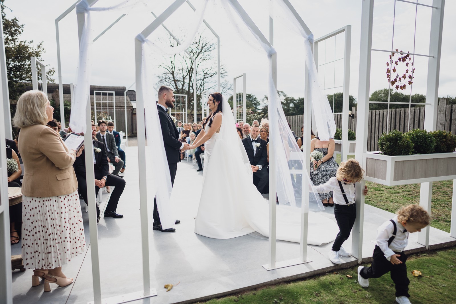 Set against Alcumlow Barn’s charming countryside backdrop, Chelsea and Elliot exchanged vows in a serene outdoor ceremony. The open wooden gates, the sweeping greenery, and the soft Cheshire light created a setting that felt both intimate and cinematic.