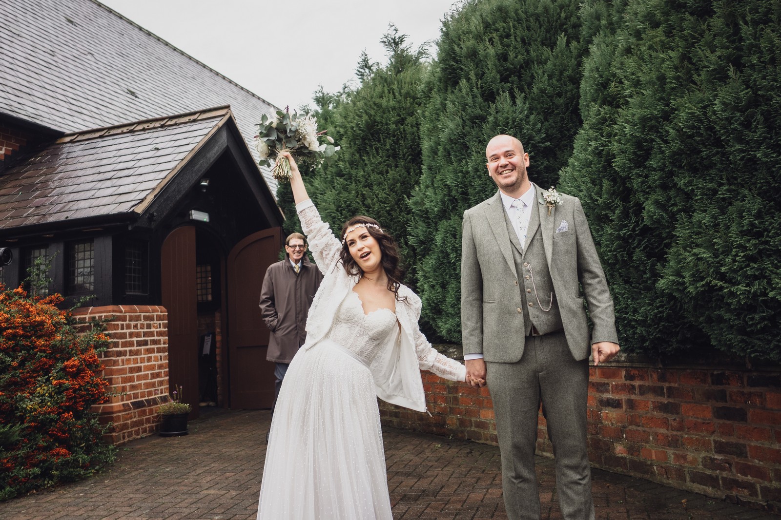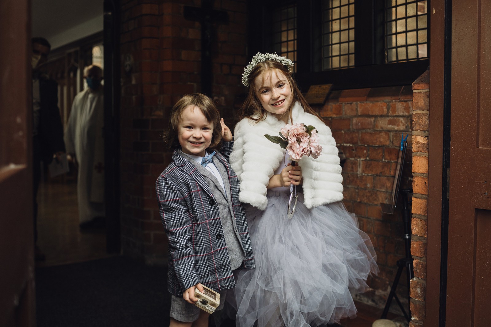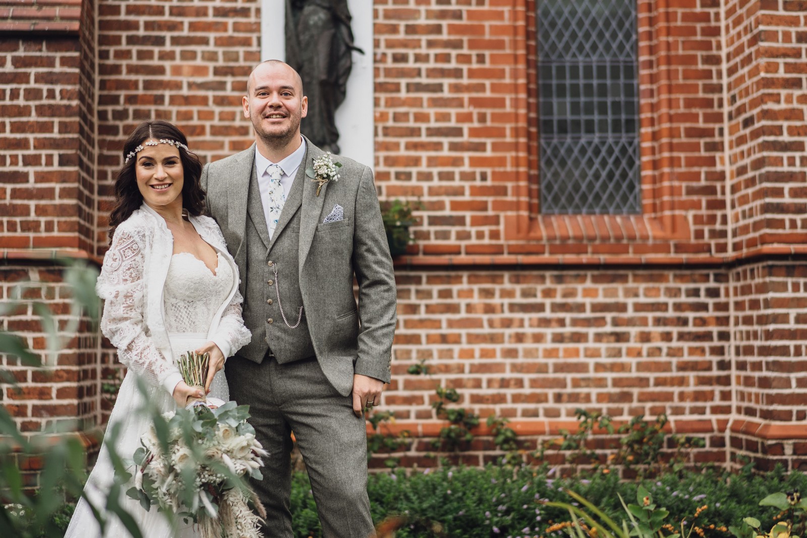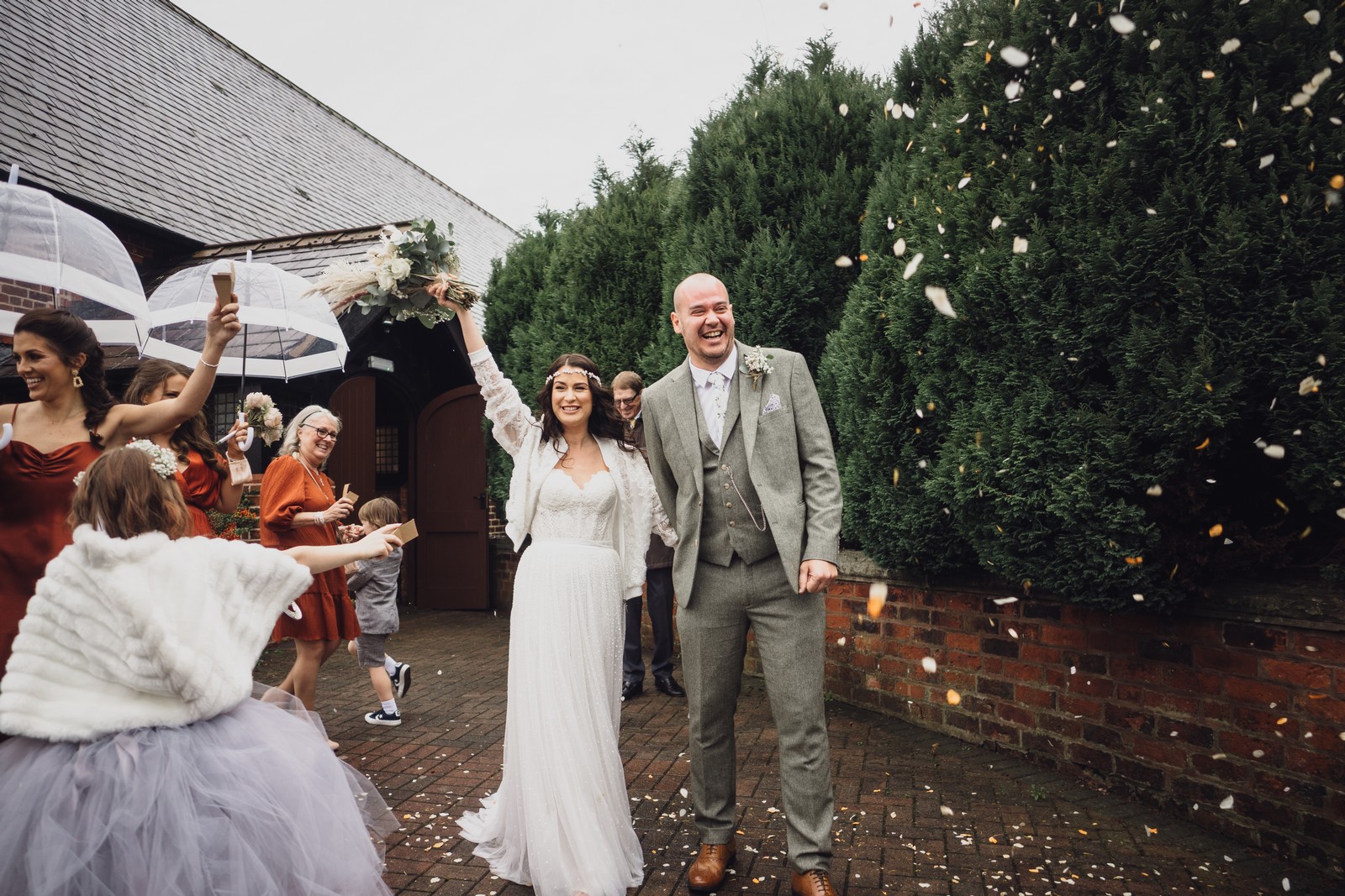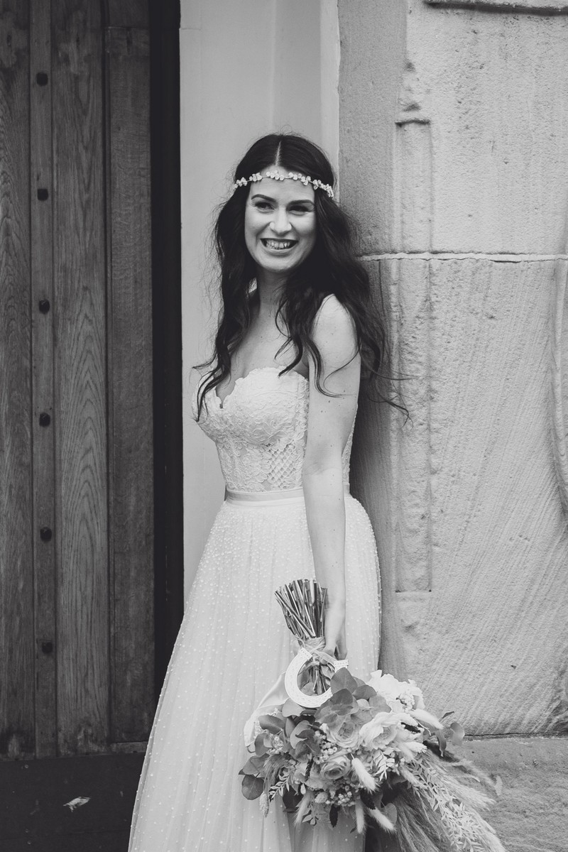 Cheshire wedding photographer covering the Northwest. I loved absolutely everything about Sophie and Tush’s wedding. It was small and intimate but so much fun! They didn’t let covid or the rain stop them and they married after 13 years together in their beautiful local church. Sophie had always longed for a Maid Marion wedding and she certainly didn’t disappoint! With the help of local suppliers Flossies and Lucinka Hodnett MUA she pulled off the look perfectly. The gorgeous bouquet filled with eucalyptus and pampas was the perfect accent to the beautiful make up and Sophie’s incredible dress. She wore flowers in her hair and donned an elegant but modern bridal jacket which I LOVED! Her veil was long and covered in tiny pearls which looked just stunning.