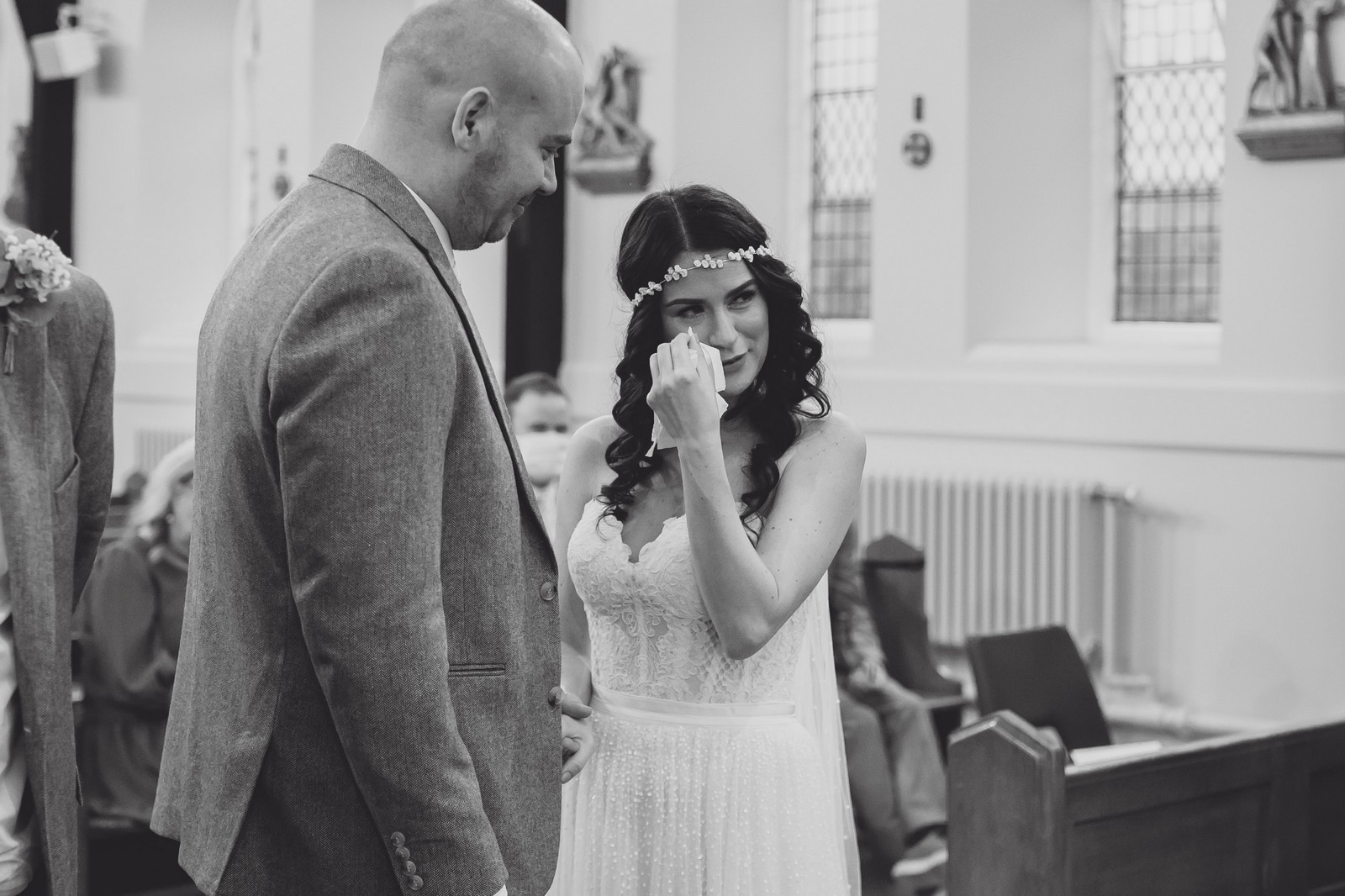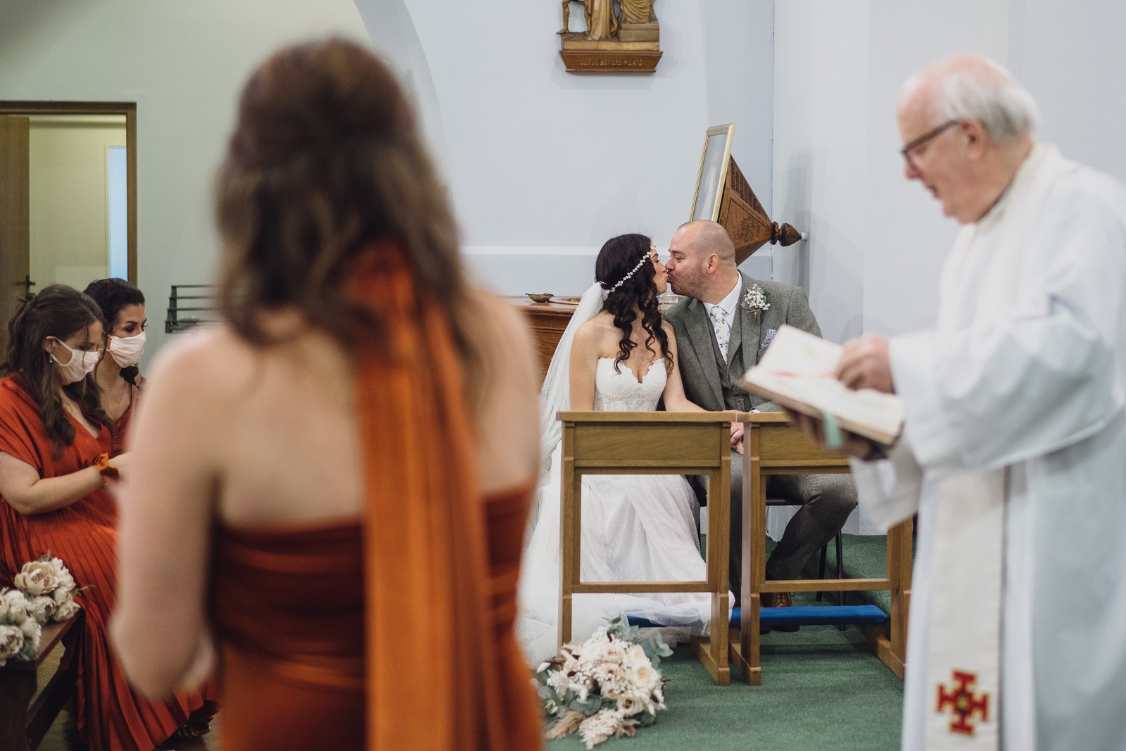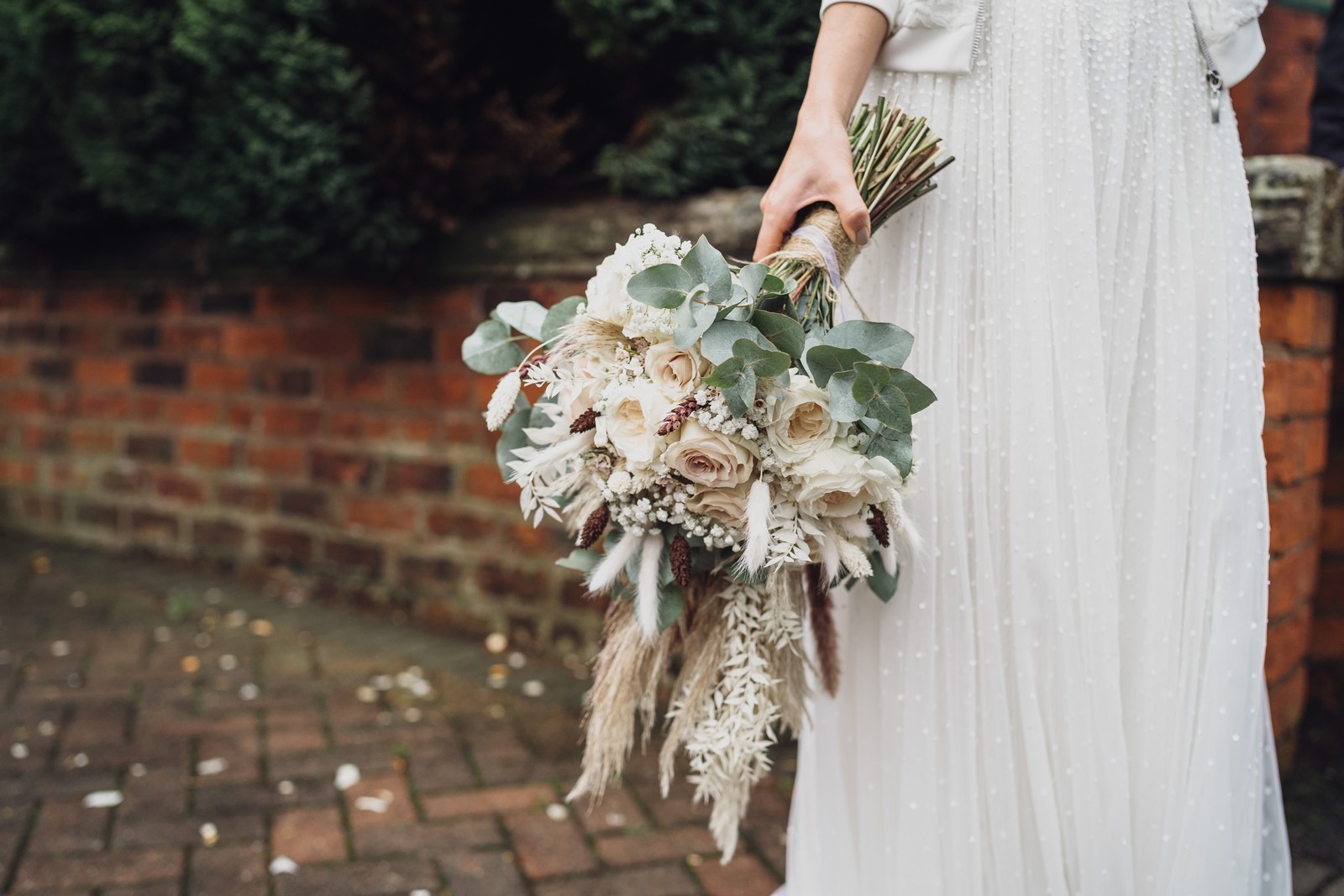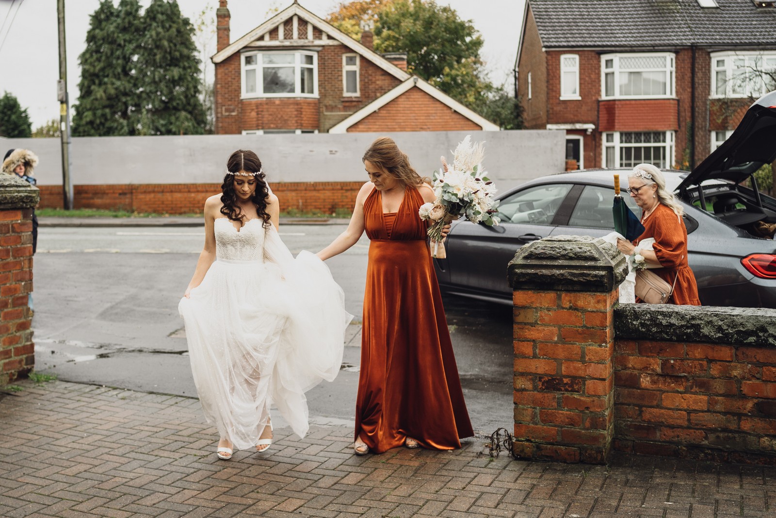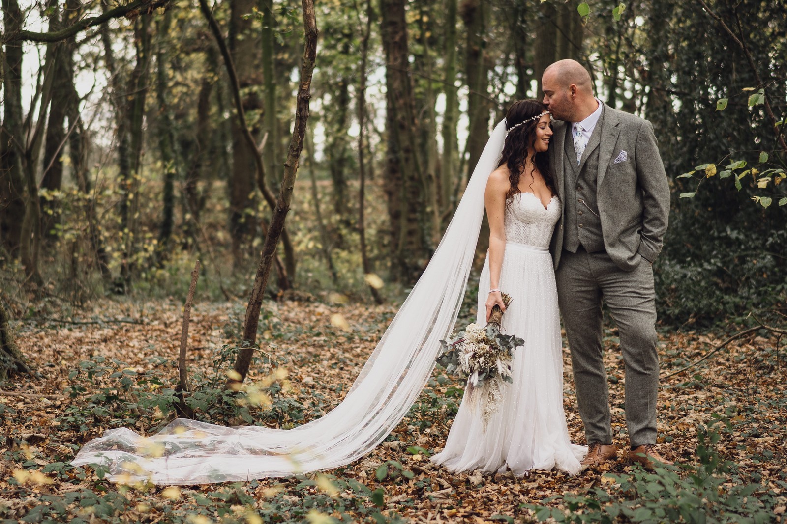 Cheshire wedding photographer covering the Northwest. I loved absolutely everything about Sophie and Tush’s wedding. It was small and intimate but so much fun! They didn’t let covid or the rain stop them and they married after 13 years together in their beautiful local church. Sophie had always longed for a Maid Marion wedding and she certainly didn’t disappoint! With the help of local suppliers Flossies and Lucinka Hodnett MUA she pulled off the look perfectly. The gorgeous bouquet filled with eucalyptus and pampas was the perfect accent to the beautiful make up and Sophie’s incredible dress. She wore flowers in her hair and donned an elegant but modern bridal jacket which I LOVED! Her veil was long and covered in tiny pearls which looked just stunning.