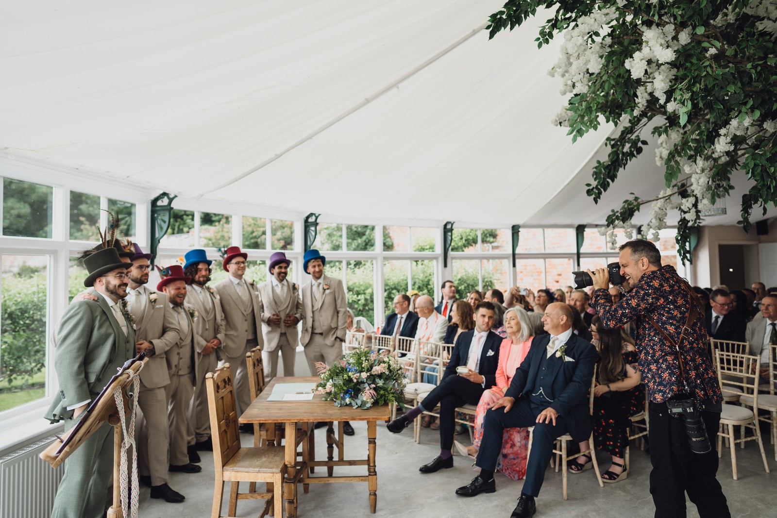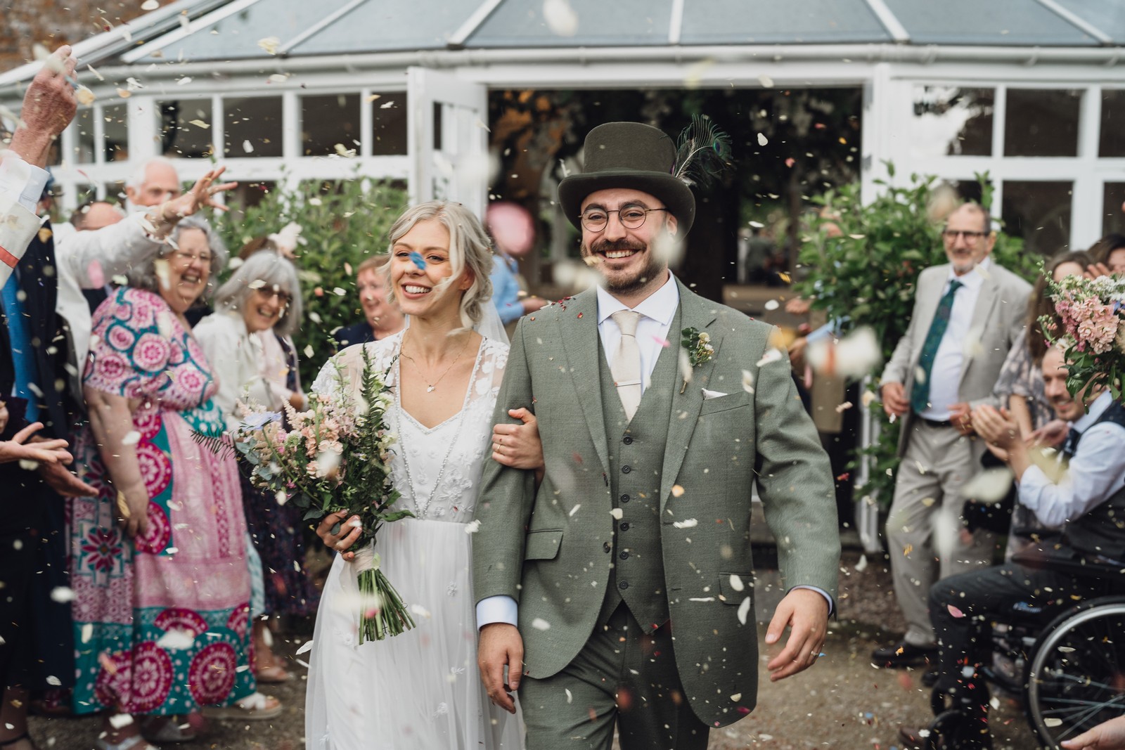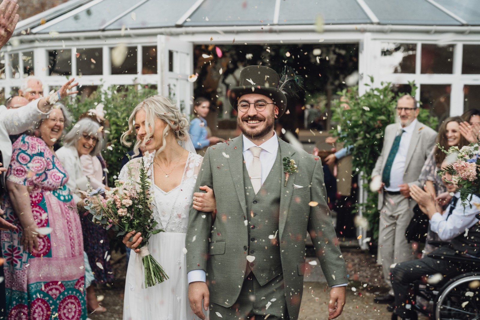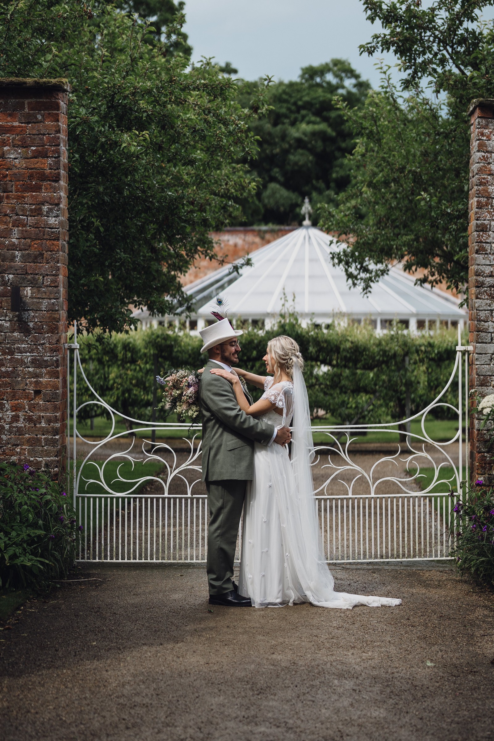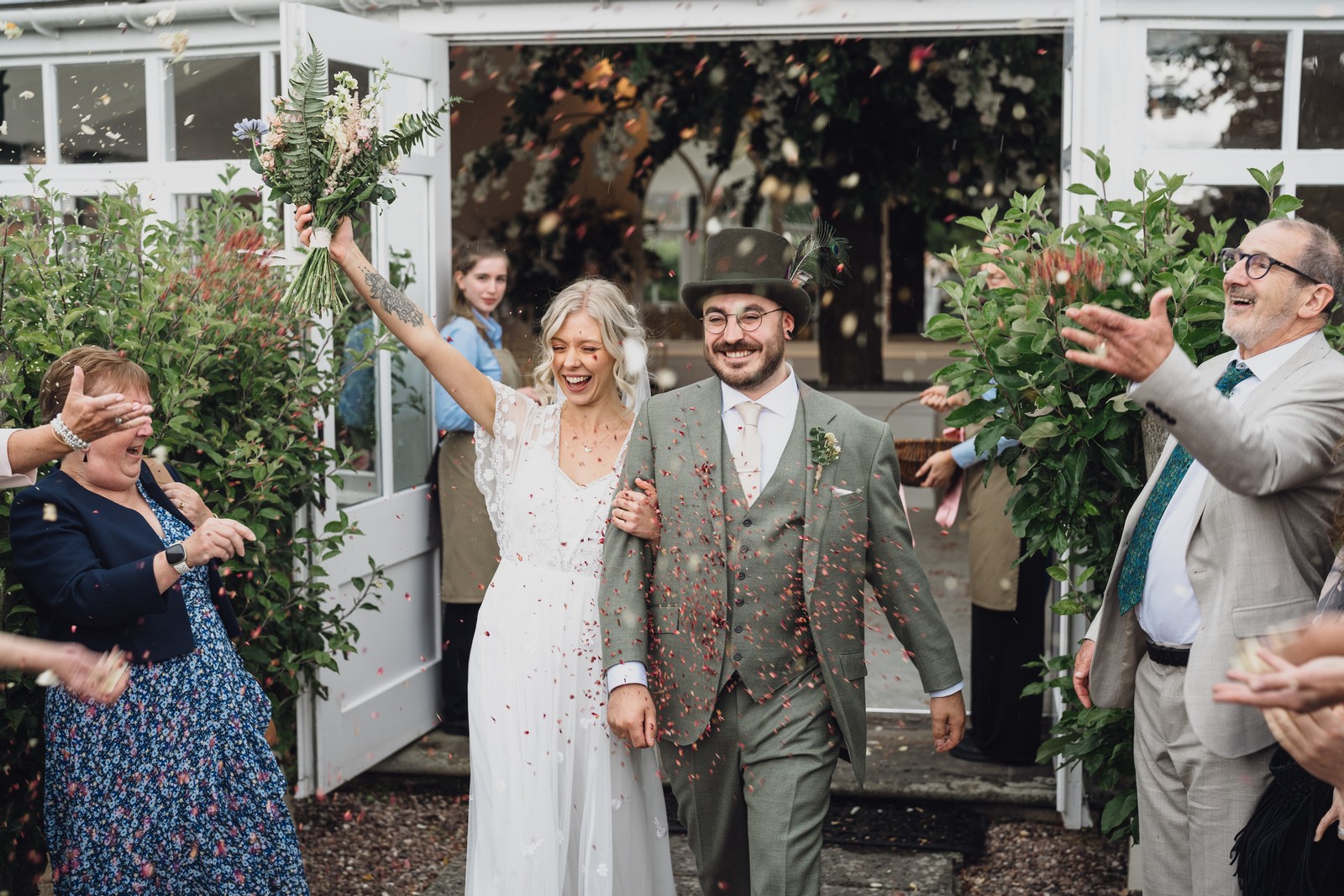 The couple exchanged vows in the enchanting Glasshouse, a sunlit space filled with natural beauty and charm. Ewa looked radiant in a timeless gown, while Sam was dapper in a classic suit, complemented by his groomsmen, who sported stylish top hats—adding a touch of sophistication to the occasion. Their guests, dressed in elegant attire, created a picture-perfect scene as they gathered to witness the heartfelt ceremony.