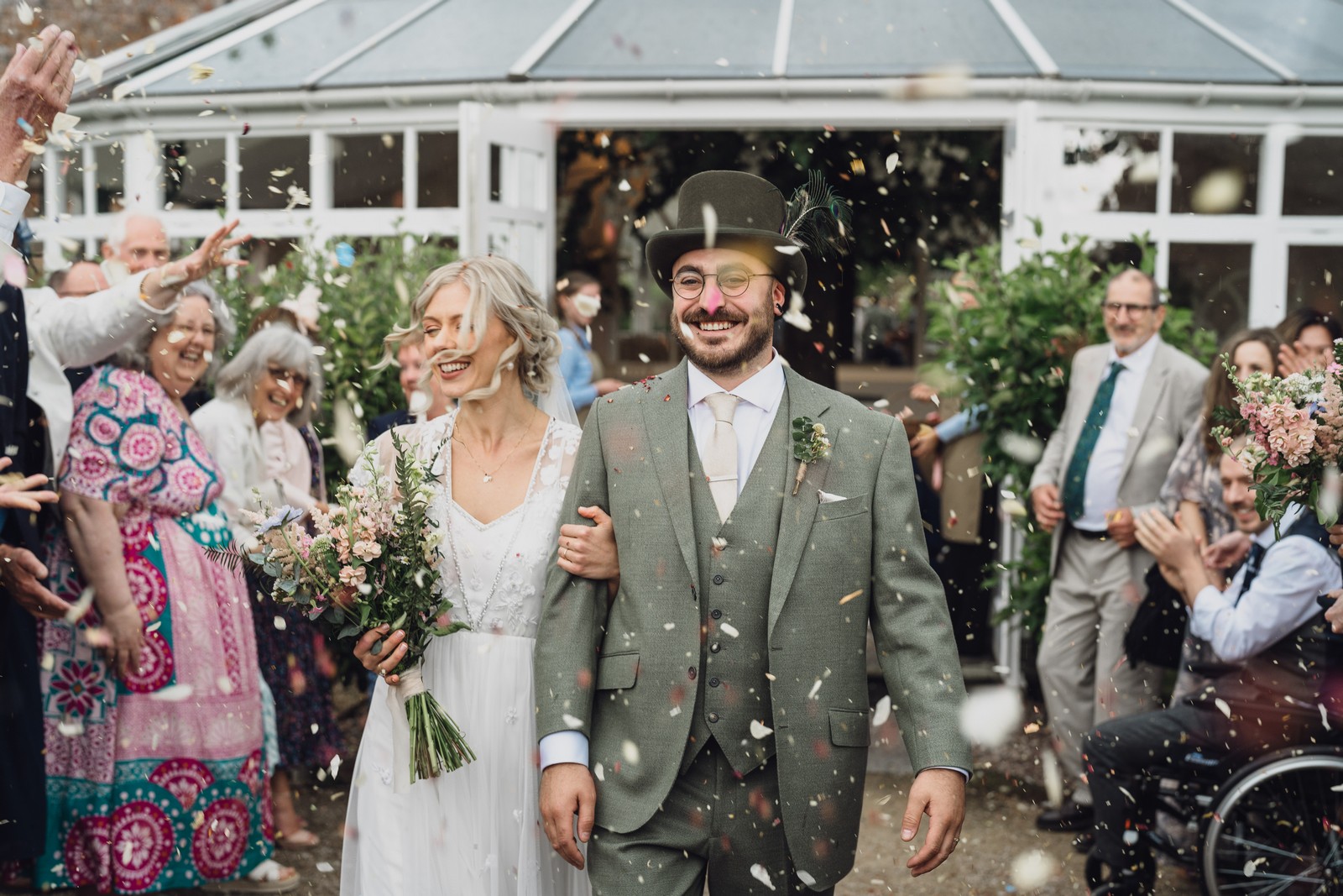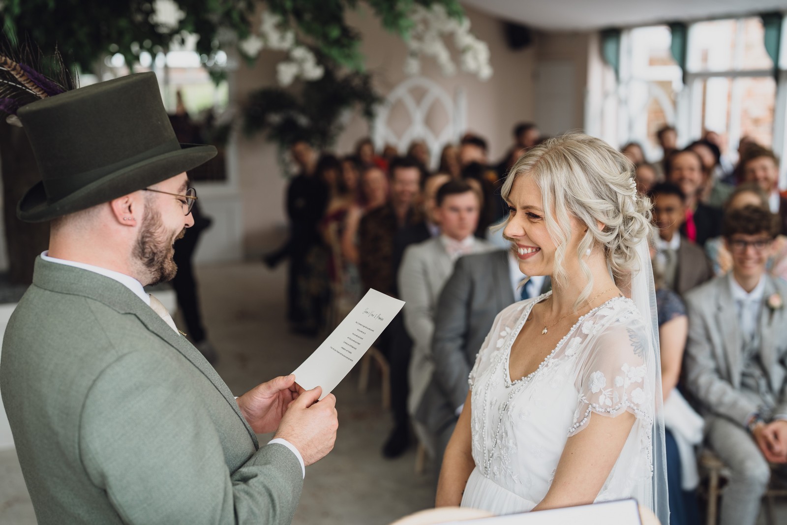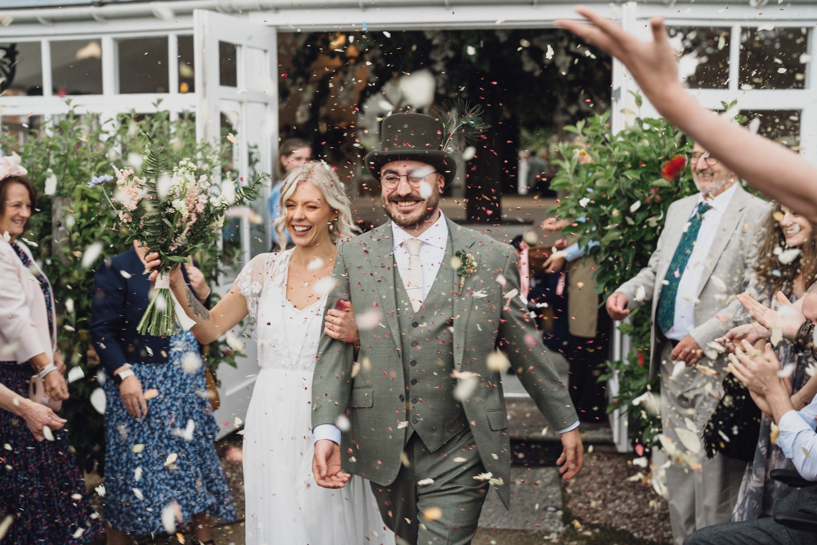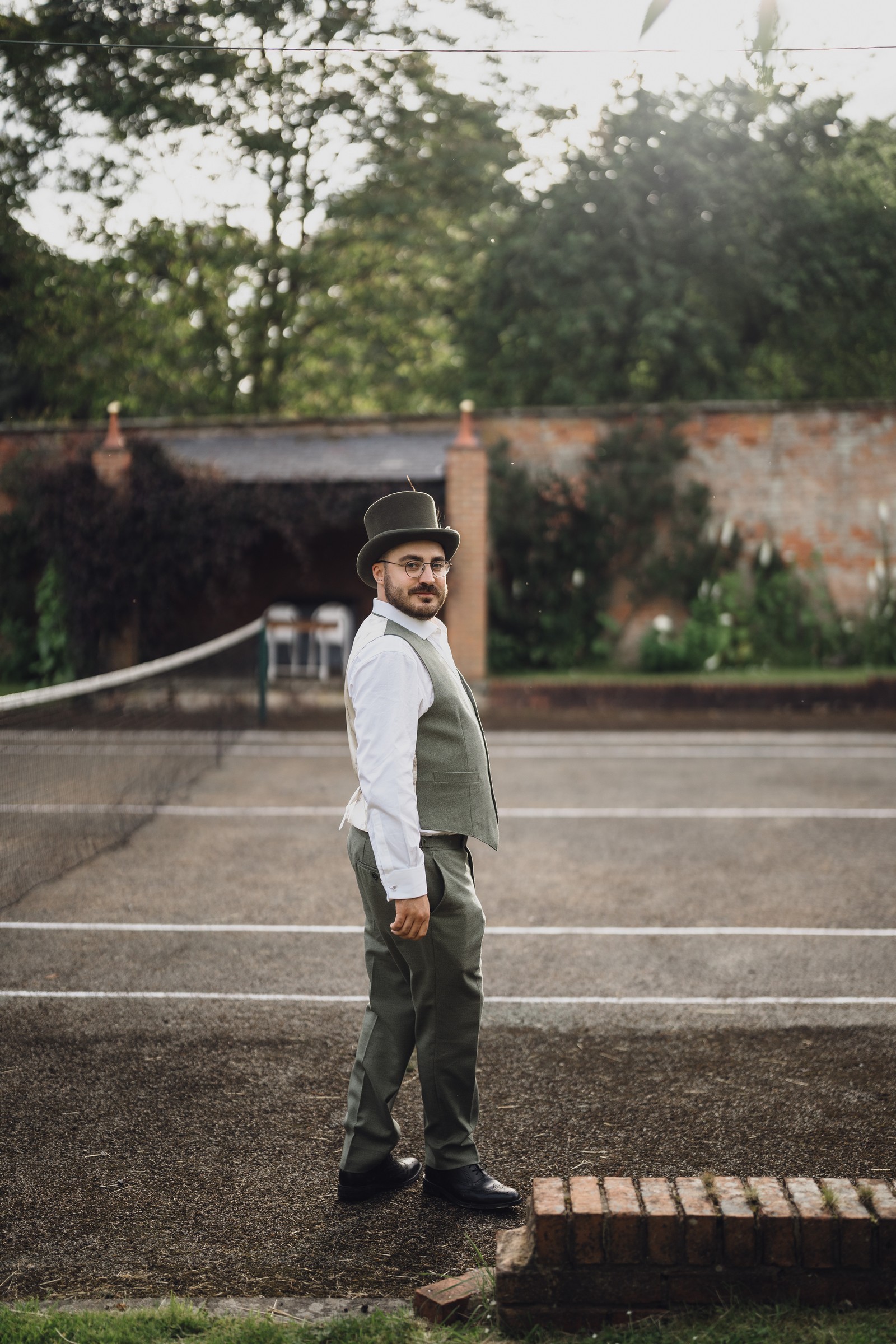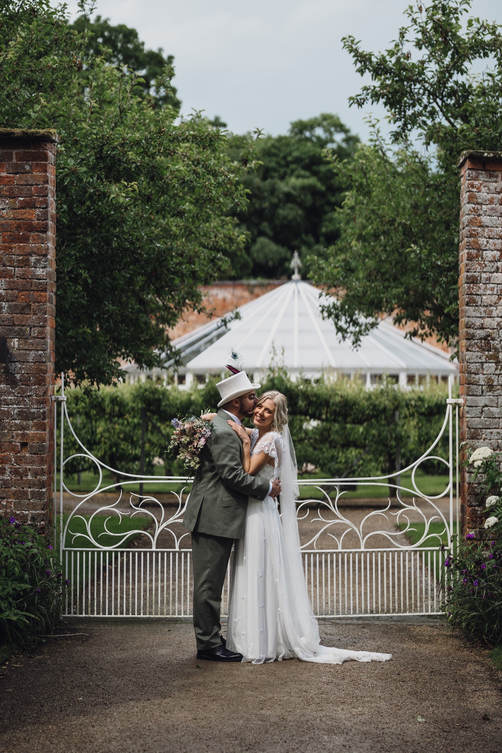 The couple exchanged vows in the enchanting Glasshouse, a sunlit space filled with natural beauty and charm. Ewa looked radiant in a timeless gown, while Sam was dapper in a classic suit, complemented by his groomsmen, who sported stylish top hats—adding a touch of sophistication to the occasion. Their guests, dressed in elegant attire, created a picture-perfect scene as they gathered to witness the heartfelt ceremony.