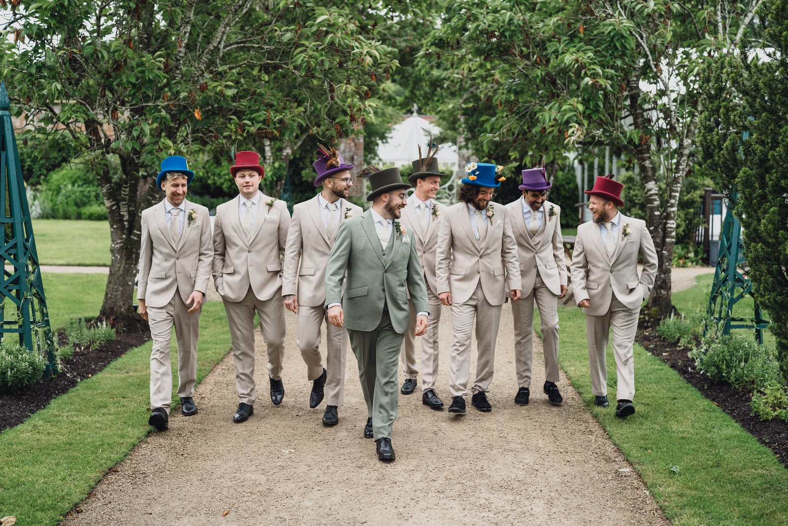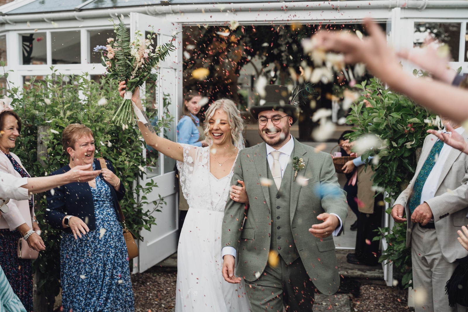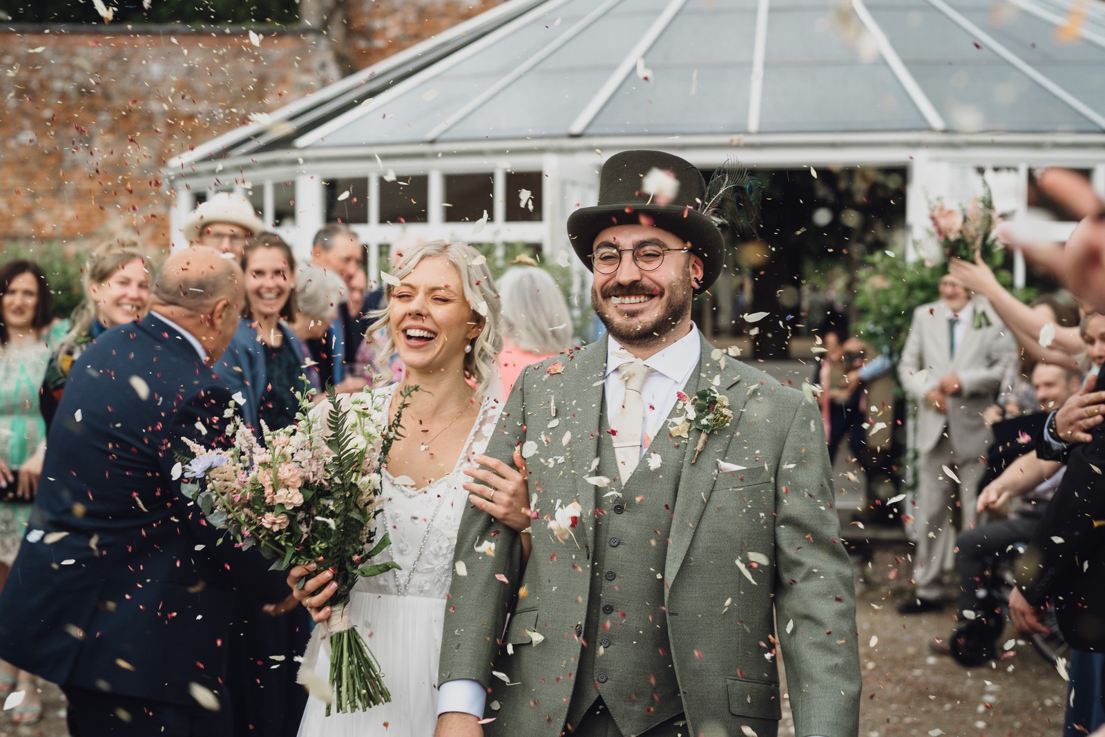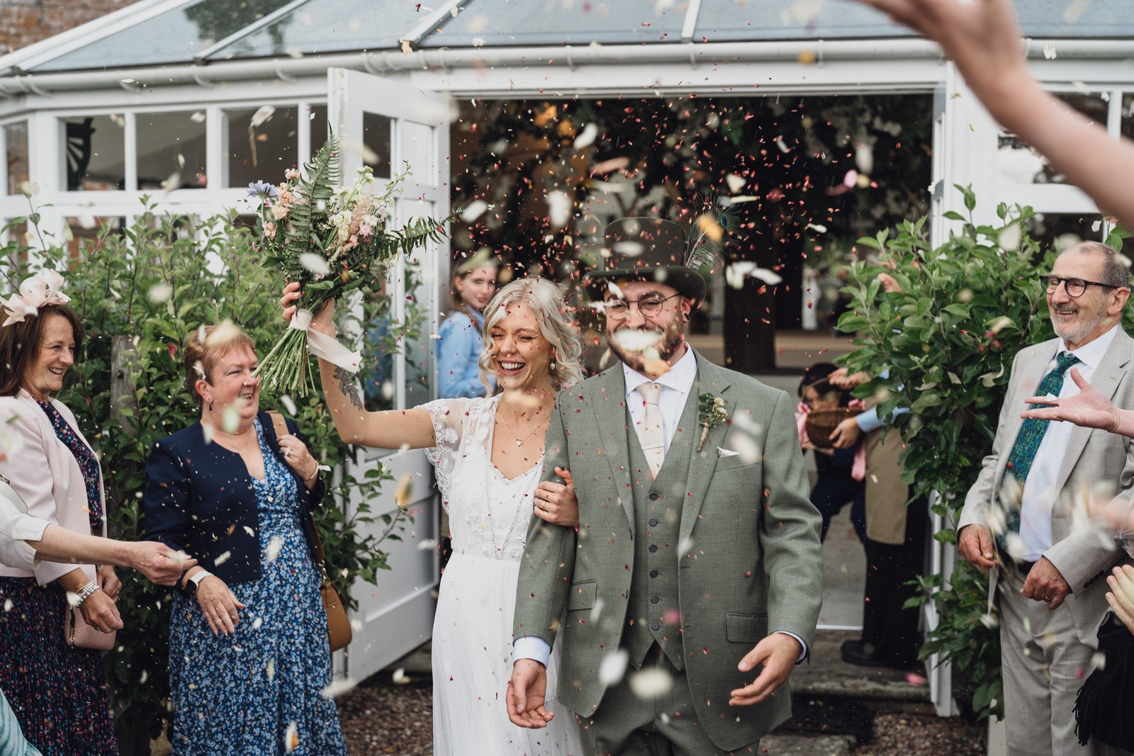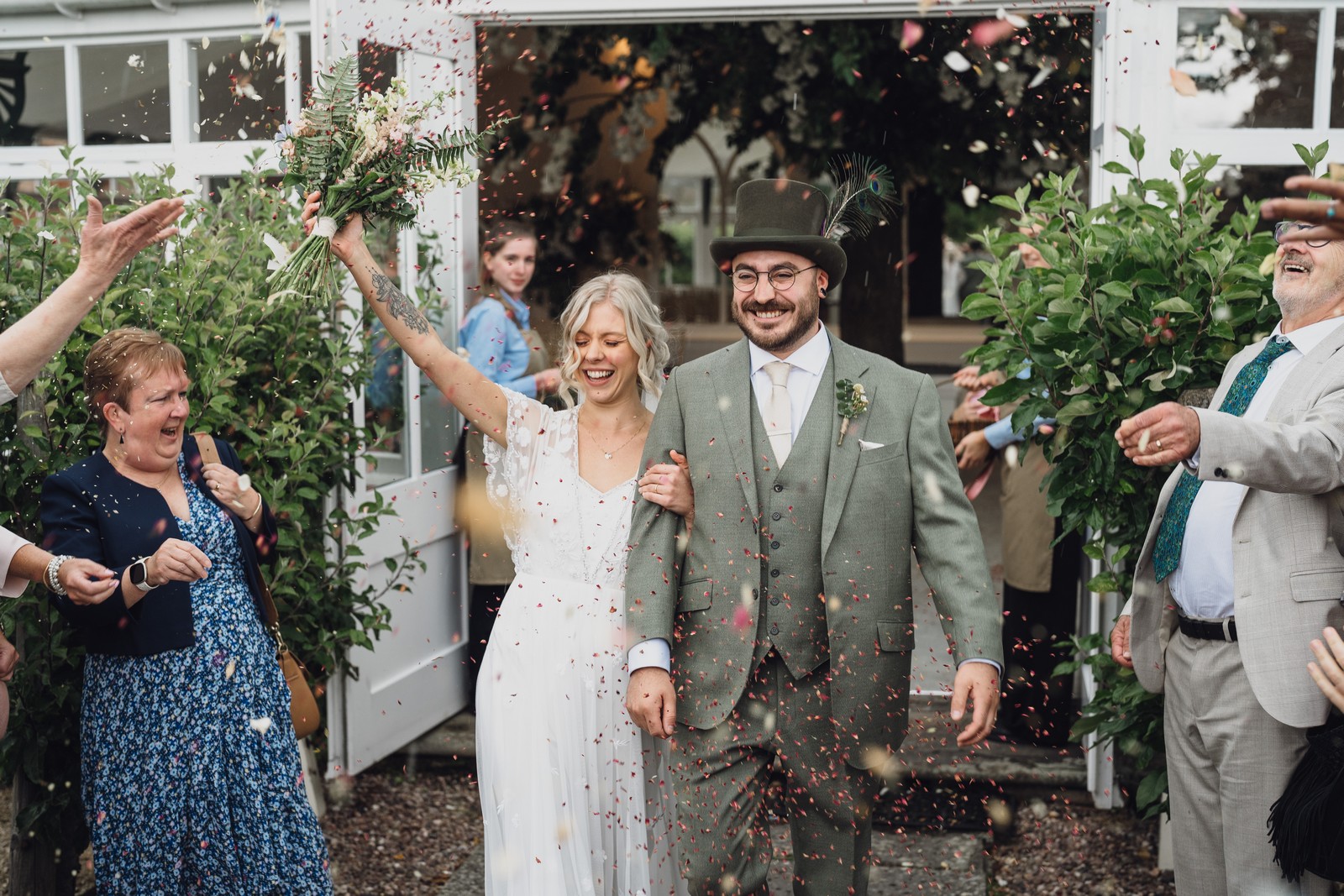 The couple exchanged vows in the enchanting Glasshouse, a sunlit space filled with natural beauty and charm. Ewa looked radiant in a timeless gown, while Sam was dapper in a classic suit, complemented by his groomsmen, who sported stylish top hats—adding a touch of sophistication to the occasion. Their guests, dressed in elegant attire, created a picture-perfect scene as they gathered to witness the heartfelt ceremony.