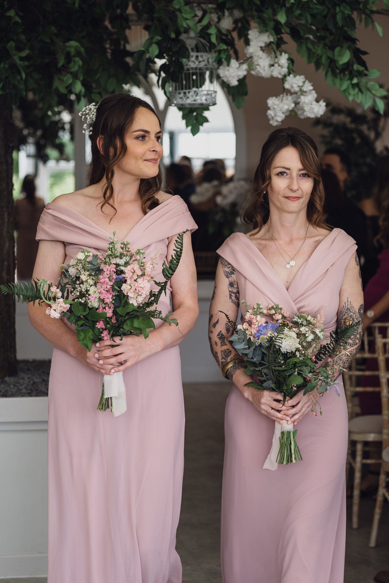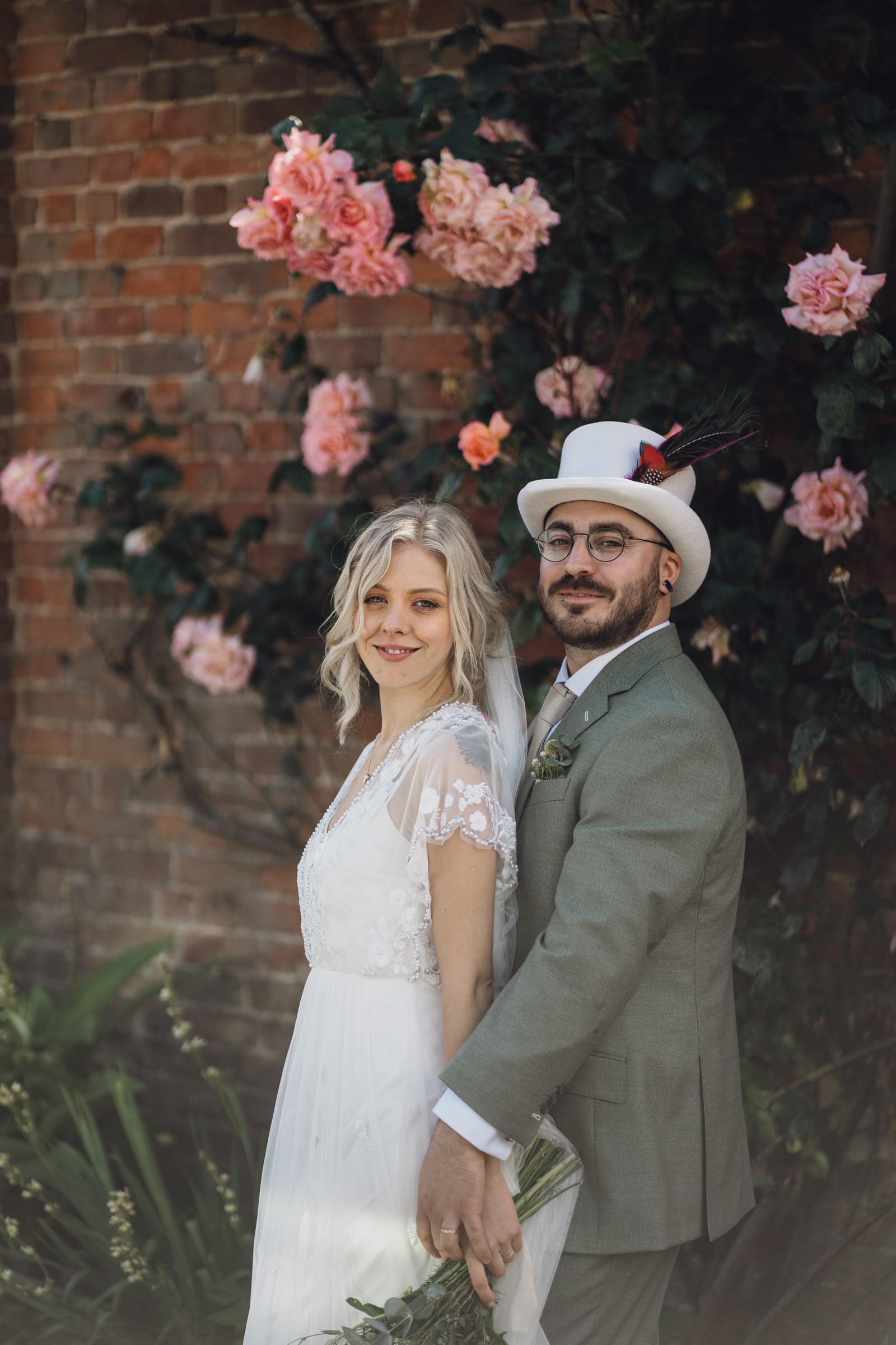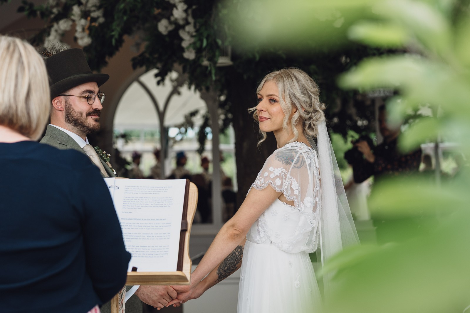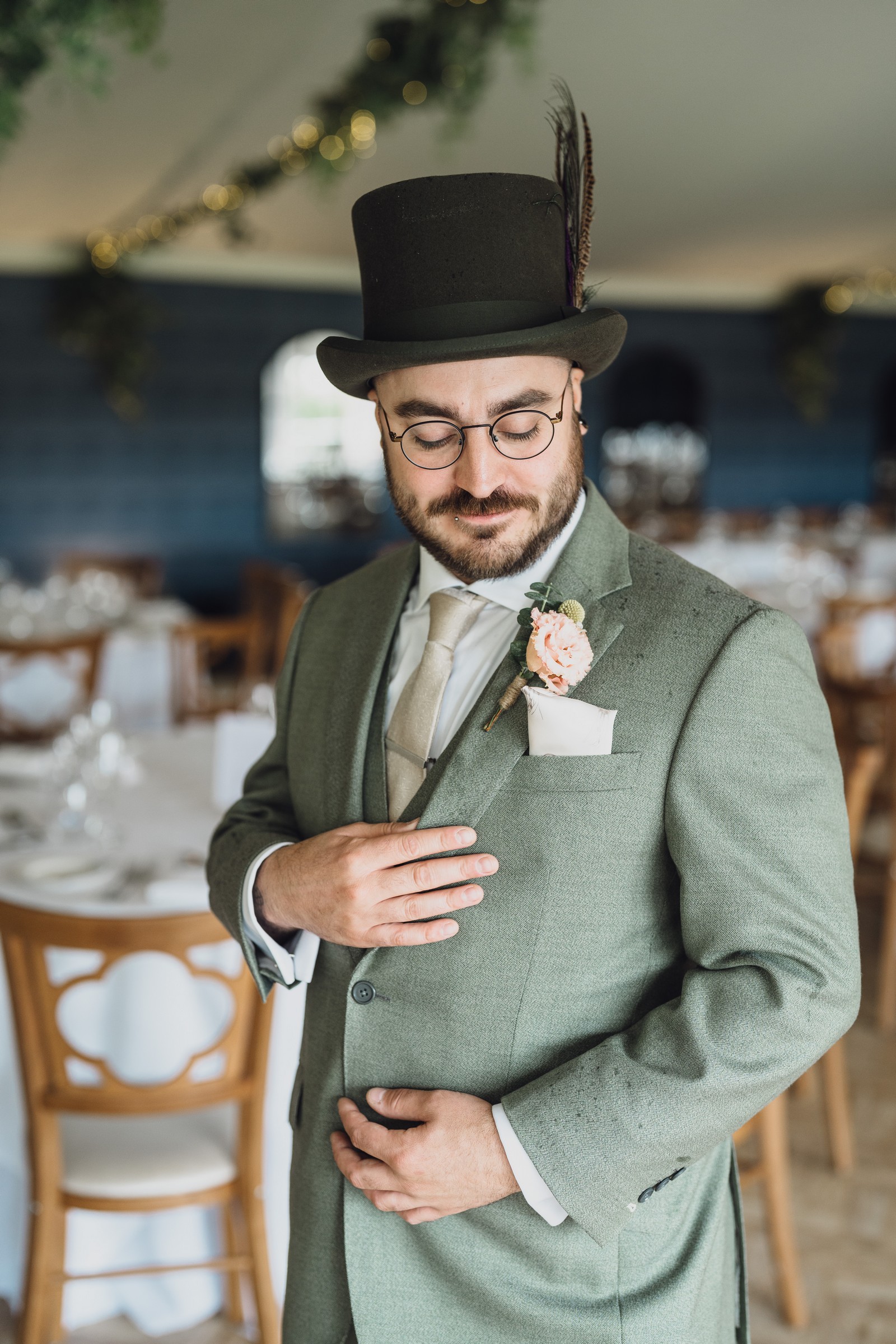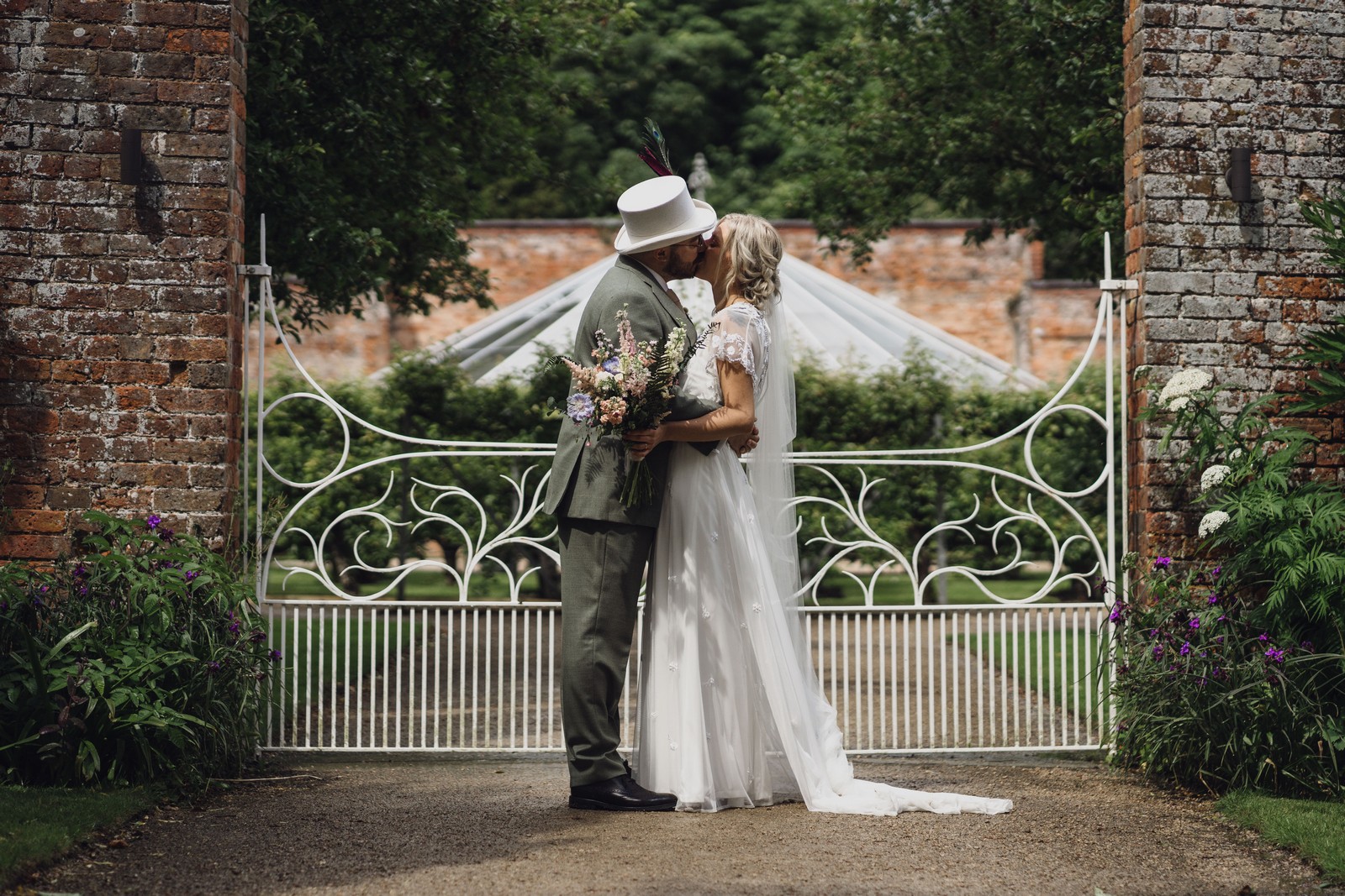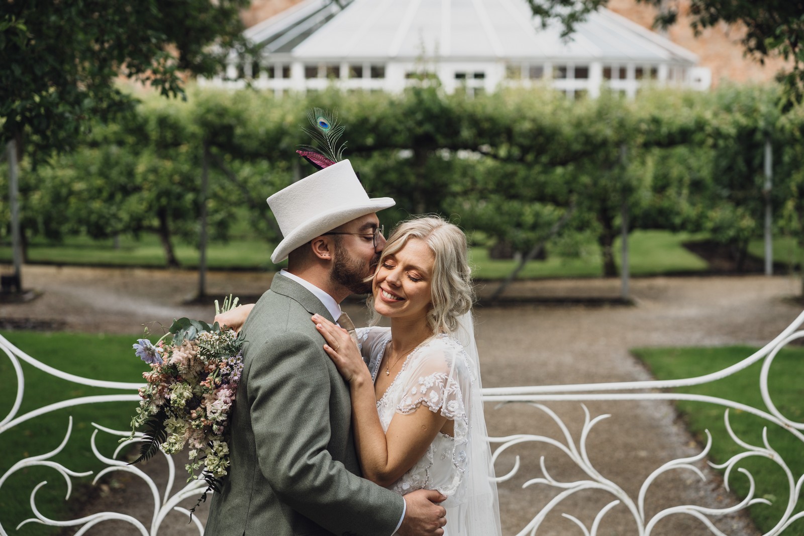 The couple exchanged vows in the enchanting Glasshouse, a sunlit space filled with natural beauty and charm. Ewa looked radiant in a timeless gown, while Sam was dapper in a classic suit, complemented by his groomsmen, who sported stylish top hats—adding a touch of sophistication to the occasion. Their guests, dressed in elegant attire, created a picture-perfect scene as they gathered to witness the heartfelt ceremony.