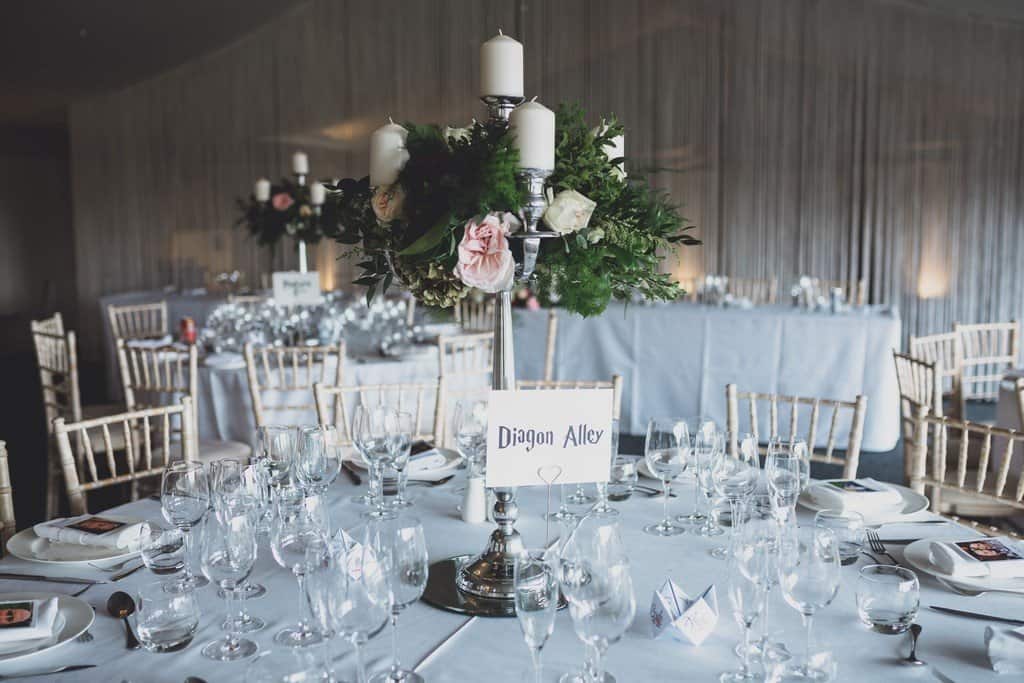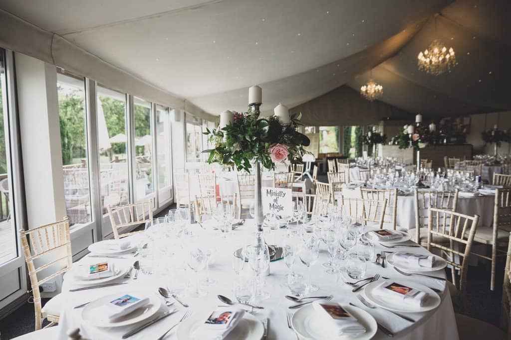 A Harry Potter theme inside the venue and stunning flowers adorned the walls and ceiling. The weather was lush and so after speeches everyone gathered outside to play garden lawn games.