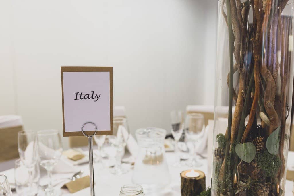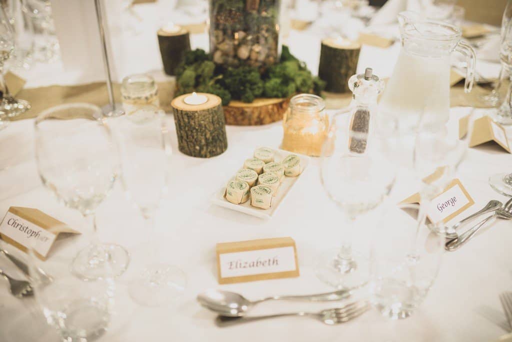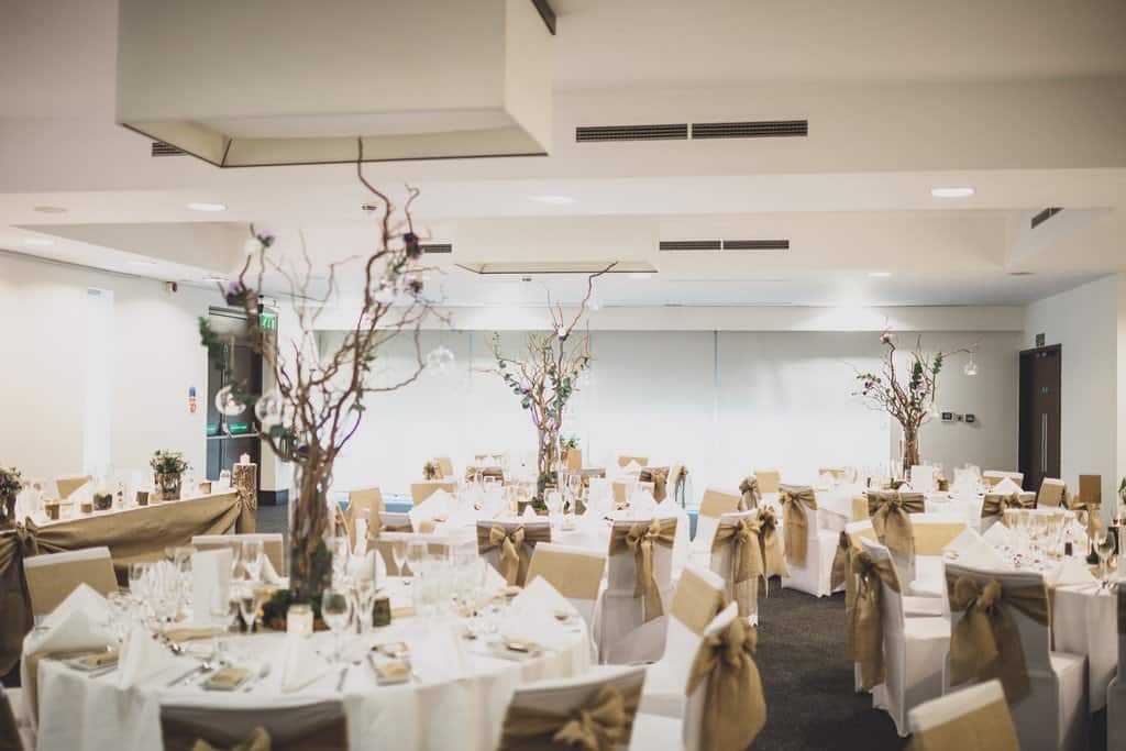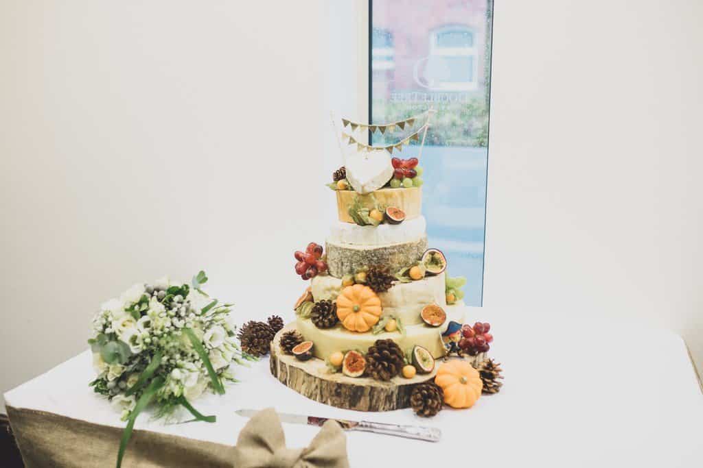 The couple wanted a really rustic wedding theme that suited the autumnal time of year and they created a gorgeous rustic vibe in the surroundings of the Double Tree Hilton. They had an epic rustic wedding cake made entirely of the couples favourite cheeses. It was decorated with seasonal touches like little pumpkin gourds, fruits and a small pirate! The tables had soft hessian rustic swags, bark covered candlesticks, stunning rustic twig tree centre pieces with flowers, mosses and pine cones too. Their guest book was a cute little wooden heart theme frame and the letter box was so unusual, loved it!