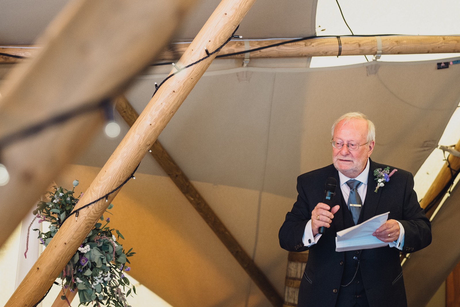 The couple wanted their day to feel soft, romantic, and filled with meaning. They chose a palette of pastel blues and purples to reflect both their personalities and memories. The colours worked beautifully against the rustic tipi setting at Rylands Farmhouse.