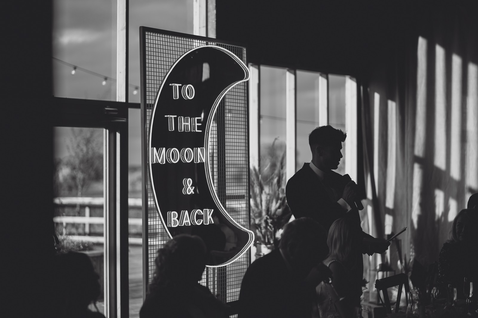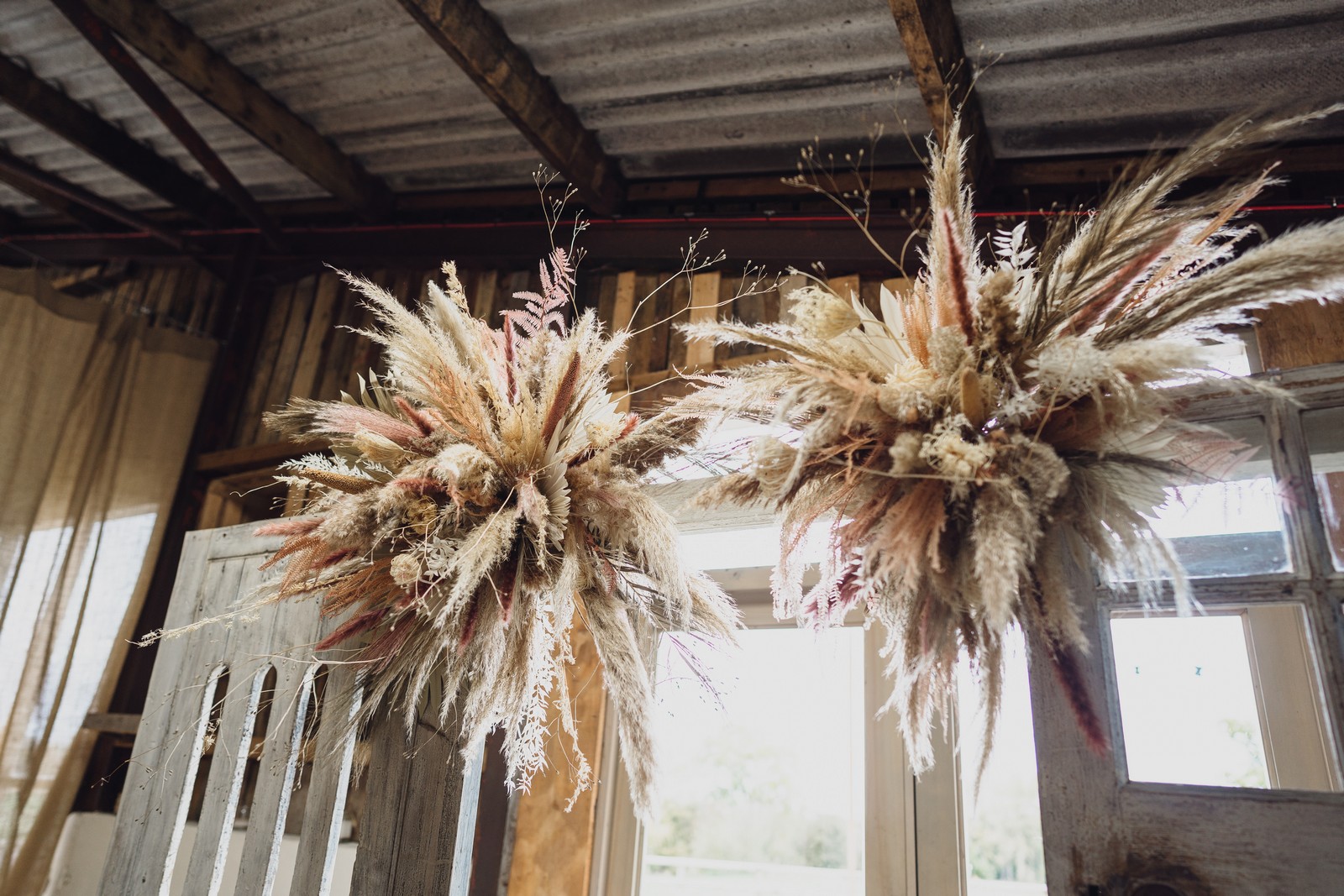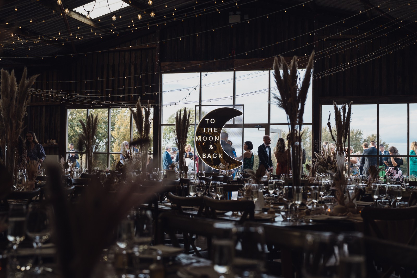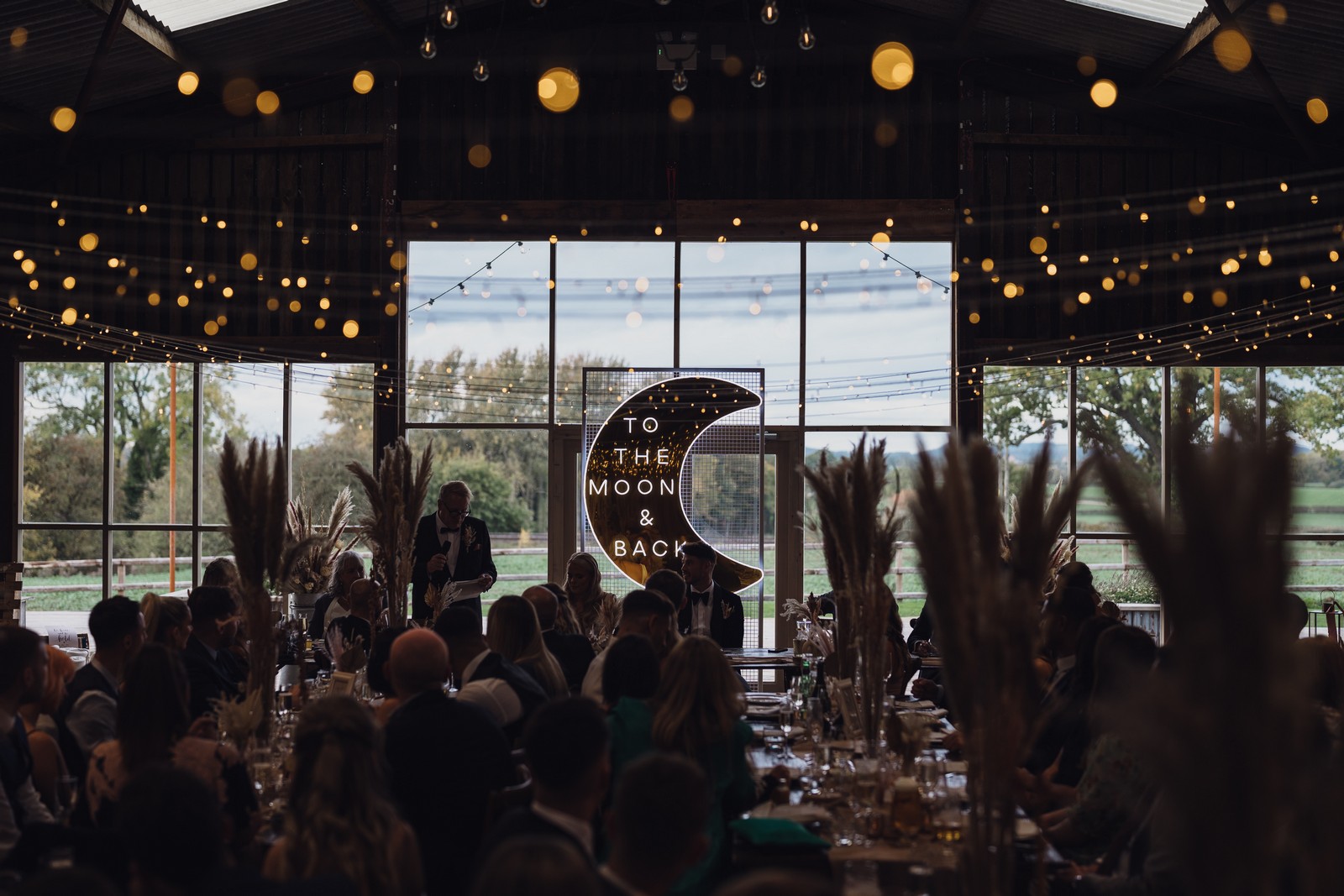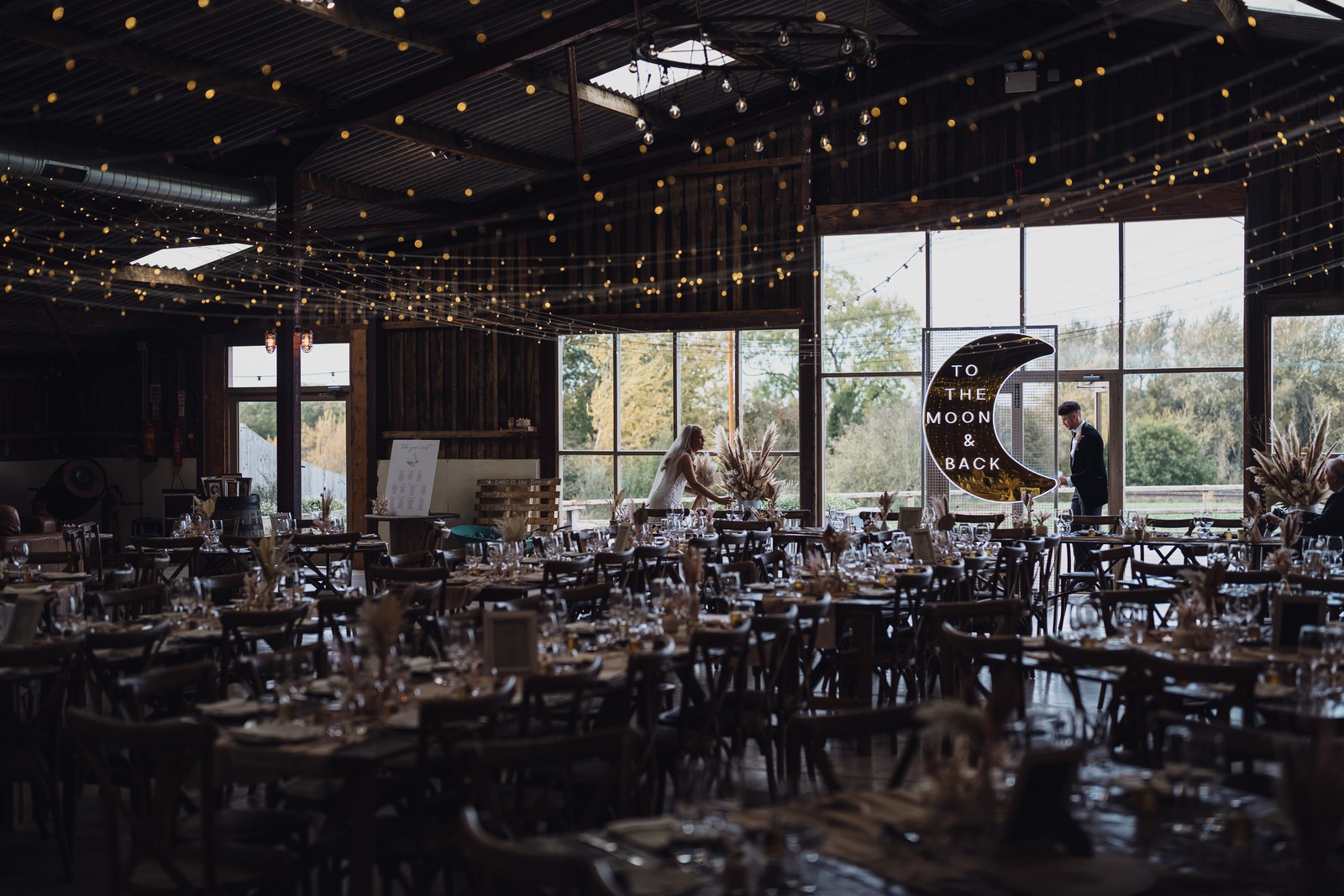We wanted the day to be fun and relaxed. Grange barn was a perfect venue because it’s rustic and didn’t feel too formal. I really love the look of the pampas grass and dried flowers and think this went really well with the venue and suited the time of year too. The fairy lights at Grange Barn and the ‘to the moon and back’ sign we rented from ido hire helped to make the venue feel really magical!