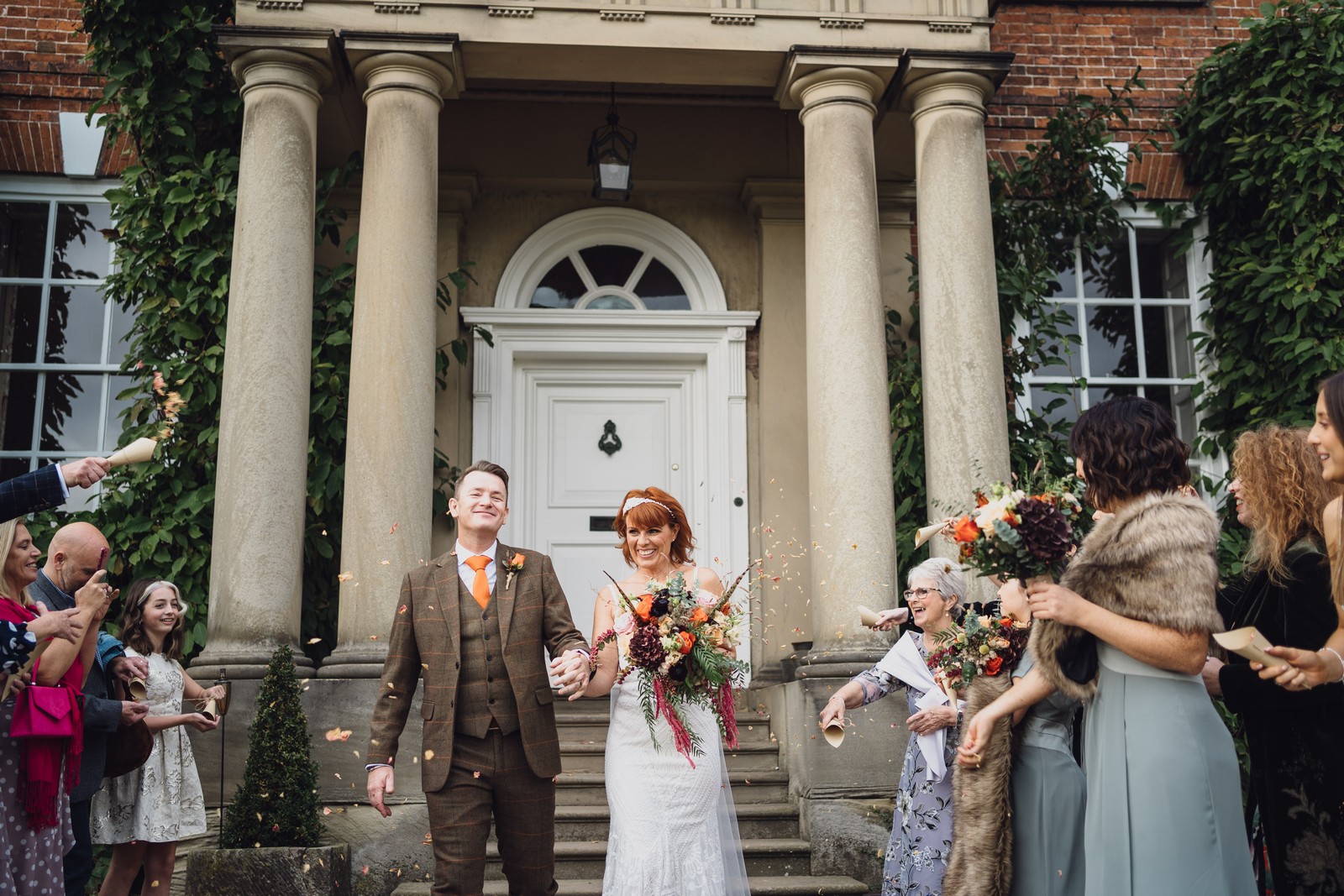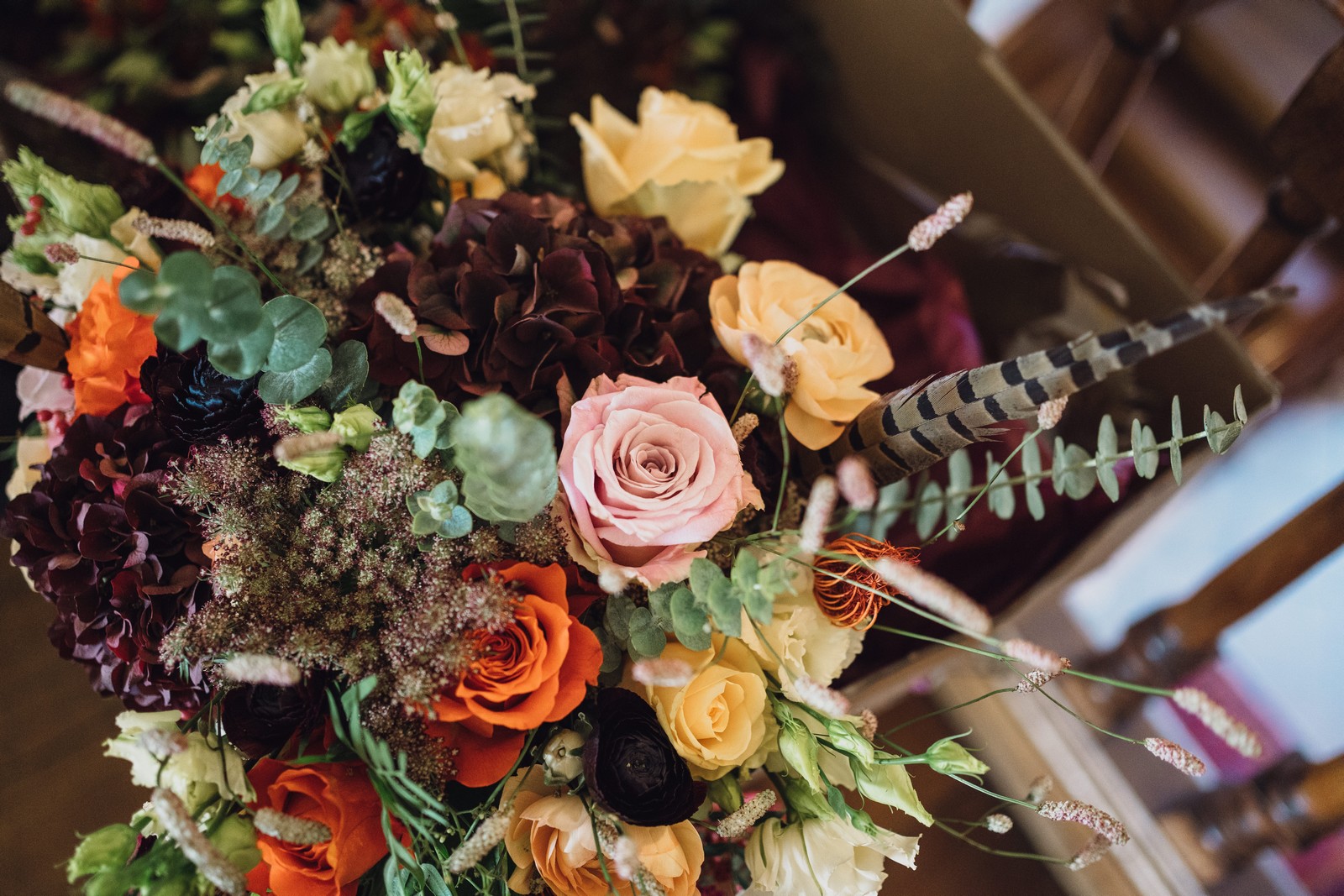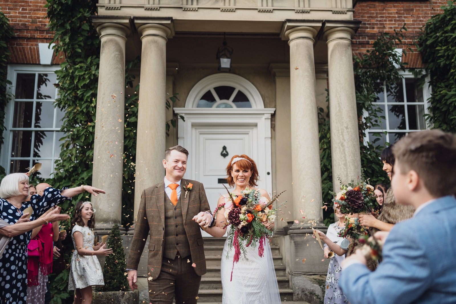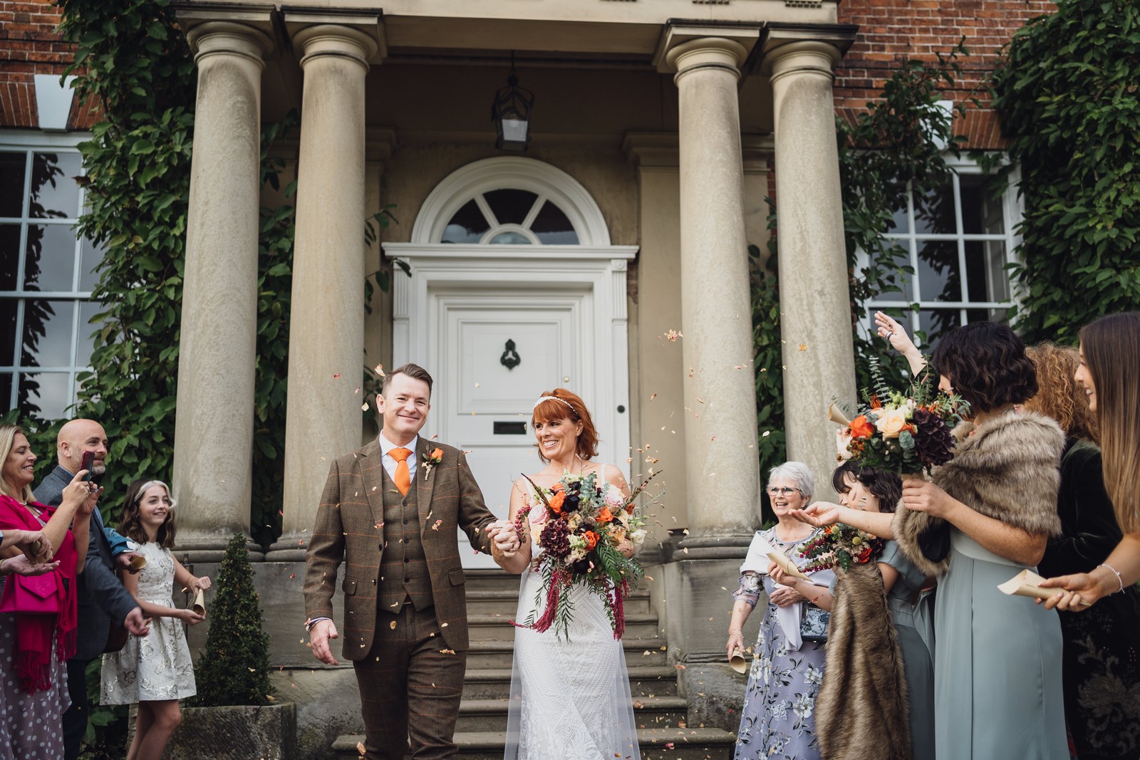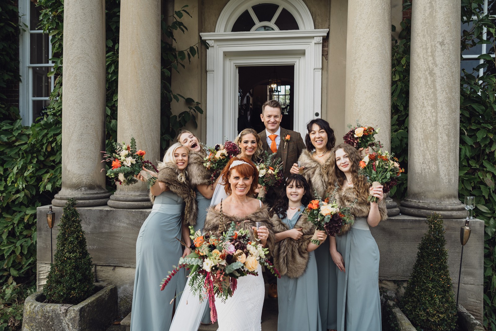Helen & Richard said ‘We love stately homes, British country tradition, elegance and charm but we wanted a cool modern relaxed fun vibe with lots of rich warm colours’ ” The wedding flowers for the bridal party and groomsmen plus decorating the house was supplied by Rustic Bloom and featured a scheme fitting of a fine country estate wedding in late autumn. Colour scheme orange, green, reds, pinks, burgundy, cherry, we also had feathers in the bouquets and table decorations which looked absolutely stunning’