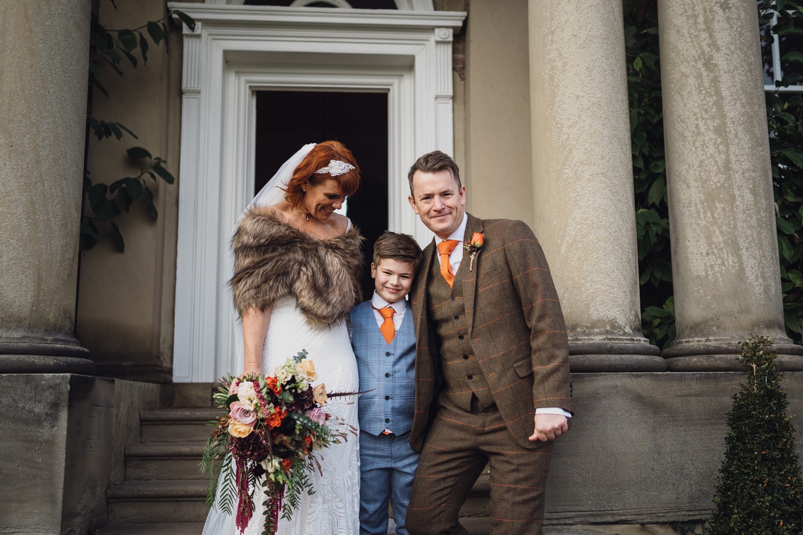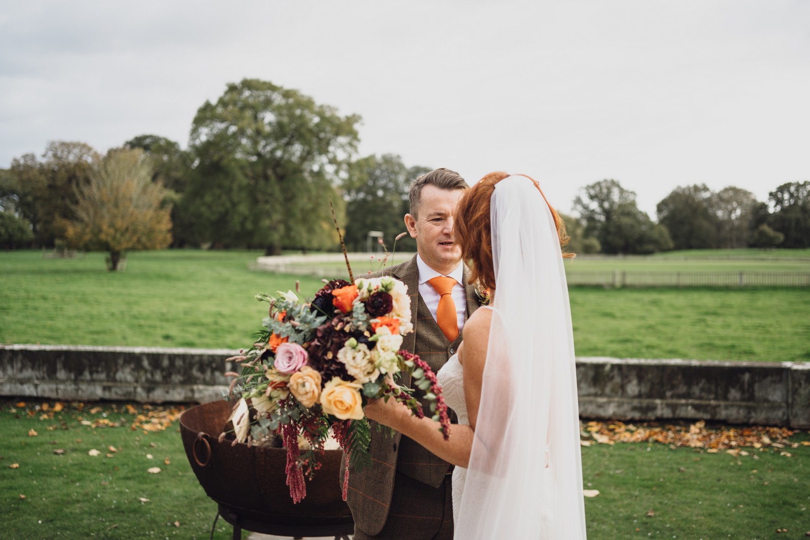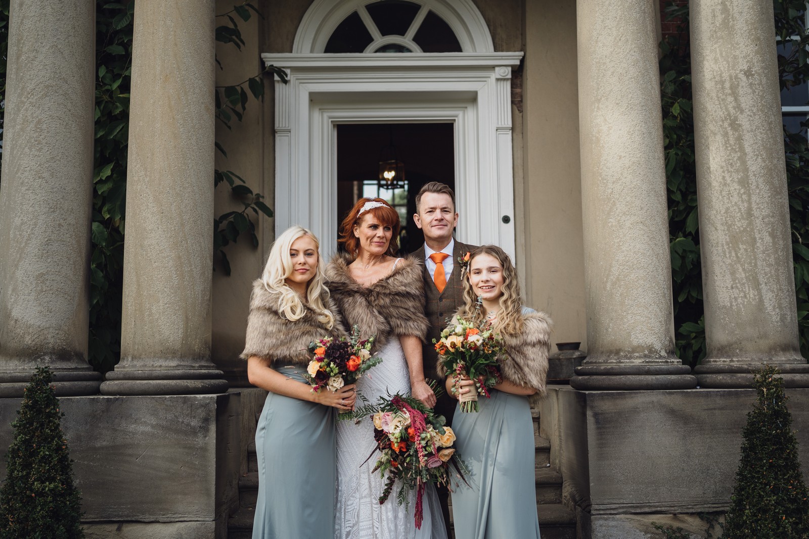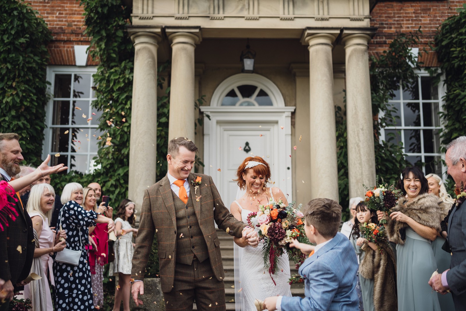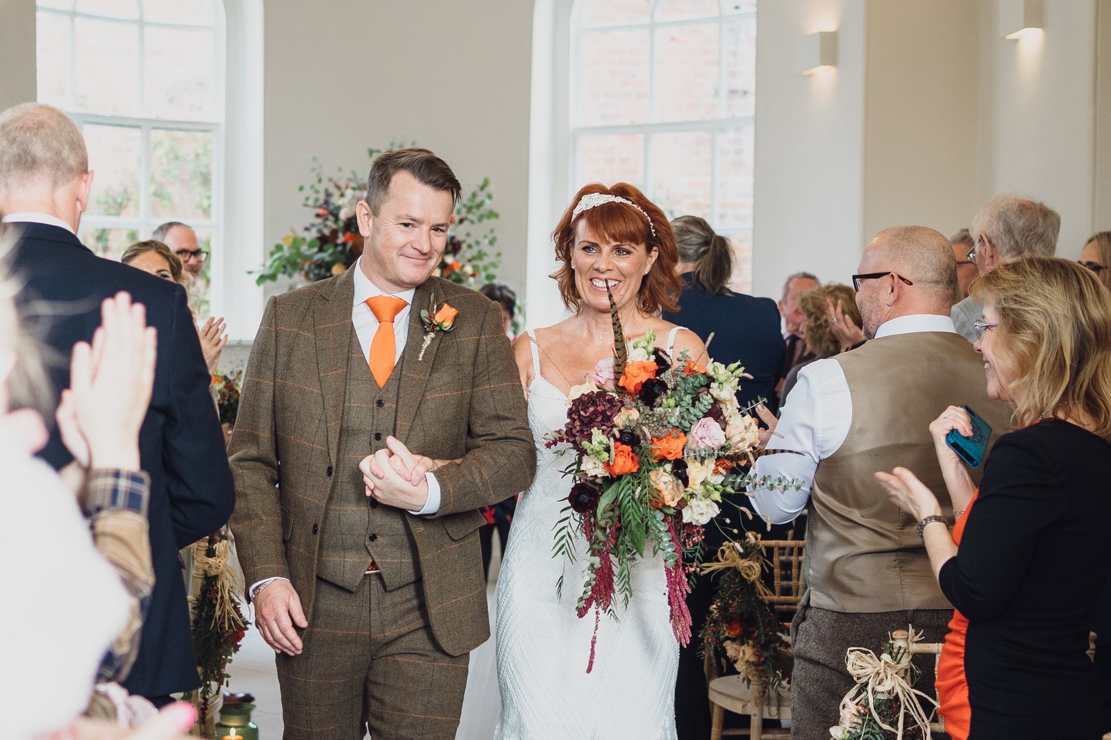 Helen & Richard said ‘We love stately homes, British country tradition, elegance and charm but we wanted a cool modern relaxed fun vibe with lots of rich warm colours’ ” The wedding flowers for the bridal party and groomsmen plus decorating the house was supplied by Rustic Bloom and featured a scheme fitting of a fine country estate wedding in late autumn. Colour scheme orange, green, reds, pinks, burgundy, cherry, we also had feathers in the bouquets and table decorations which looked absolutely stunning’