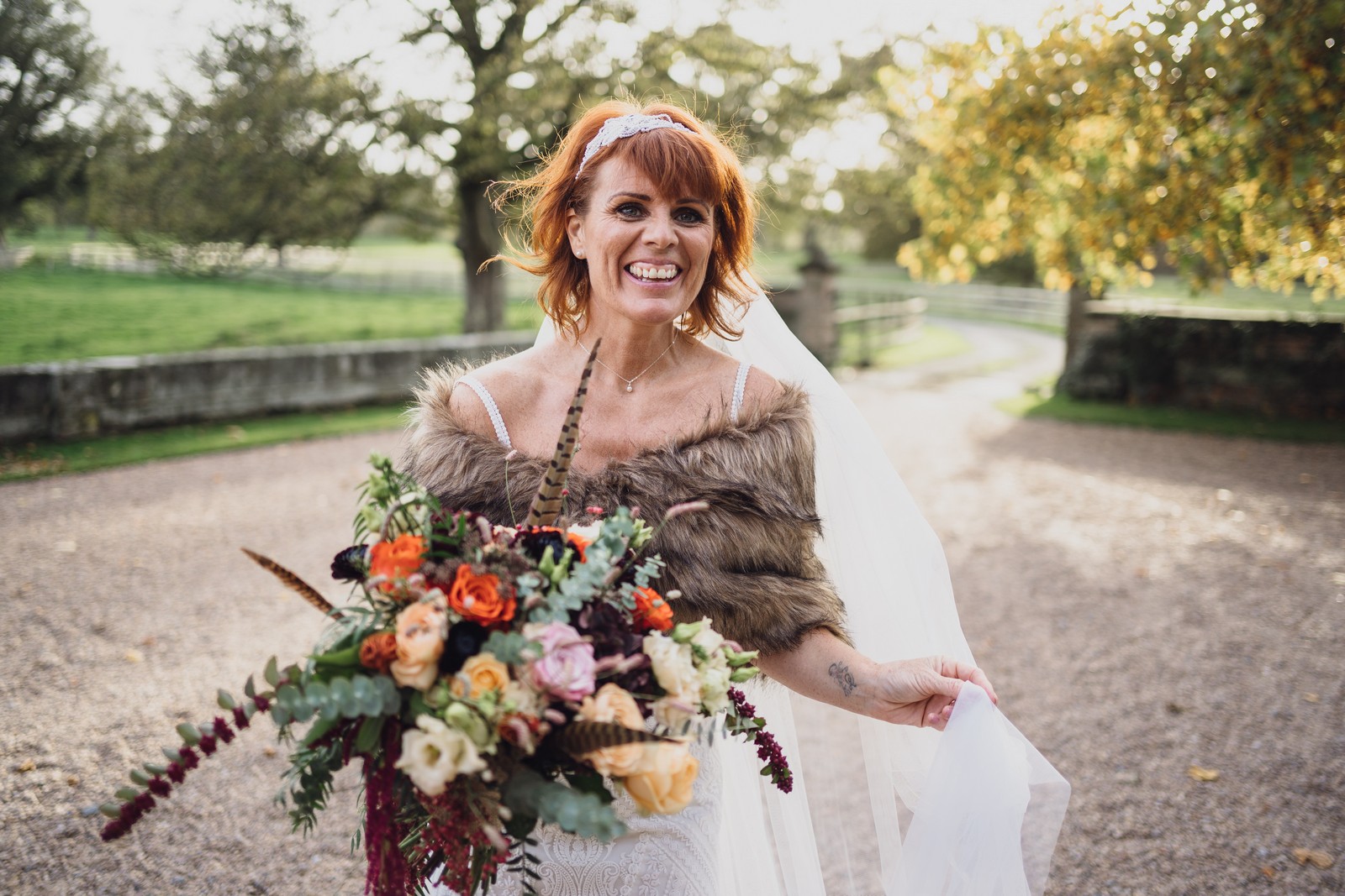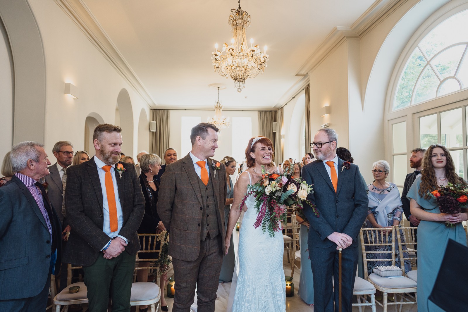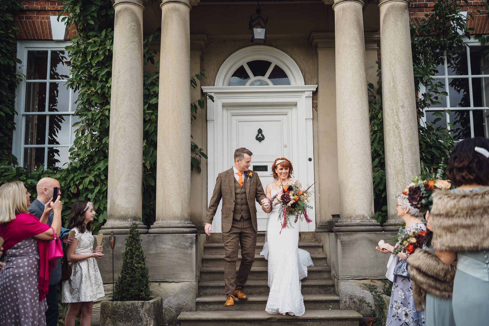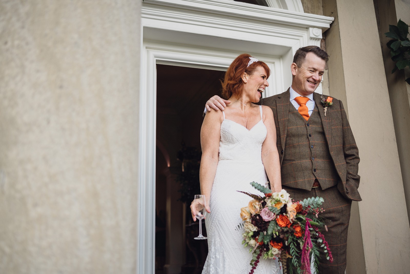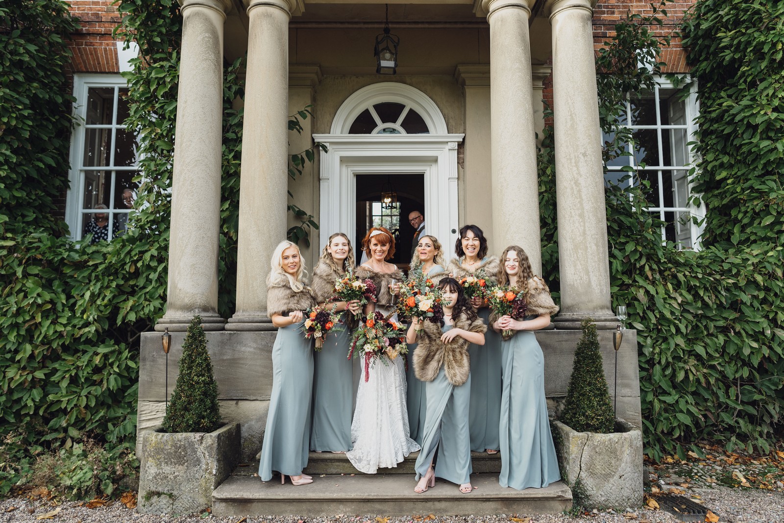Helen & Richard said ‘We love stately homes, British country tradition, elegance and charm but we wanted a cool modern relaxed fun vibe with lots of rich warm colours’ ” The wedding flowers for the bridal party and groomsmen plus decorating the house was supplied by Rustic Bloom and featured a scheme fitting of a fine country estate wedding in late autumn. Colour scheme orange, green, reds, pinks, burgundy, cherry, we also had feathers in the bouquets and table decorations which looked absolutely stunning’