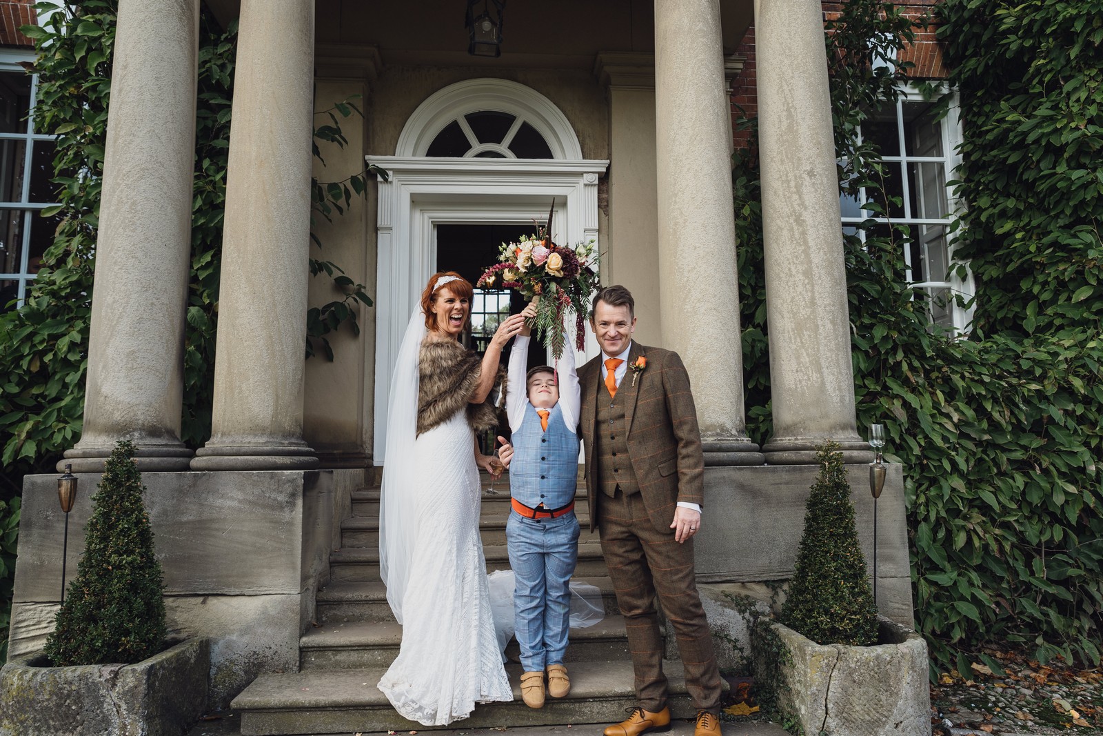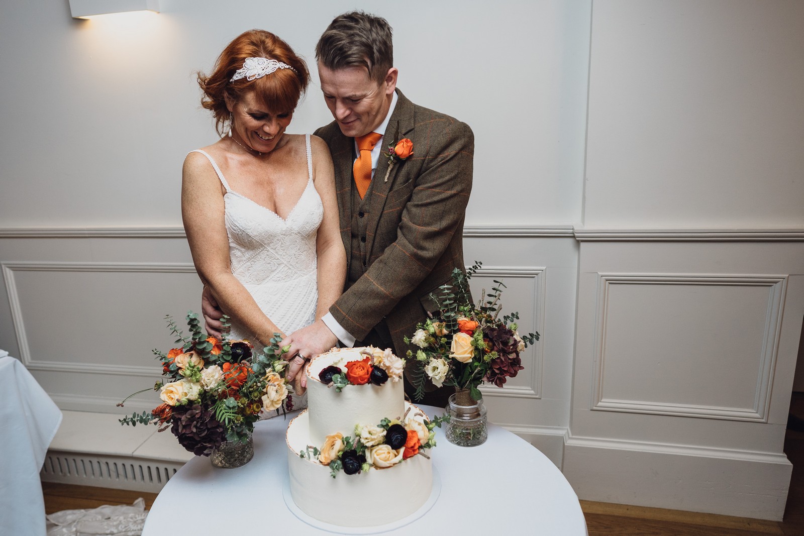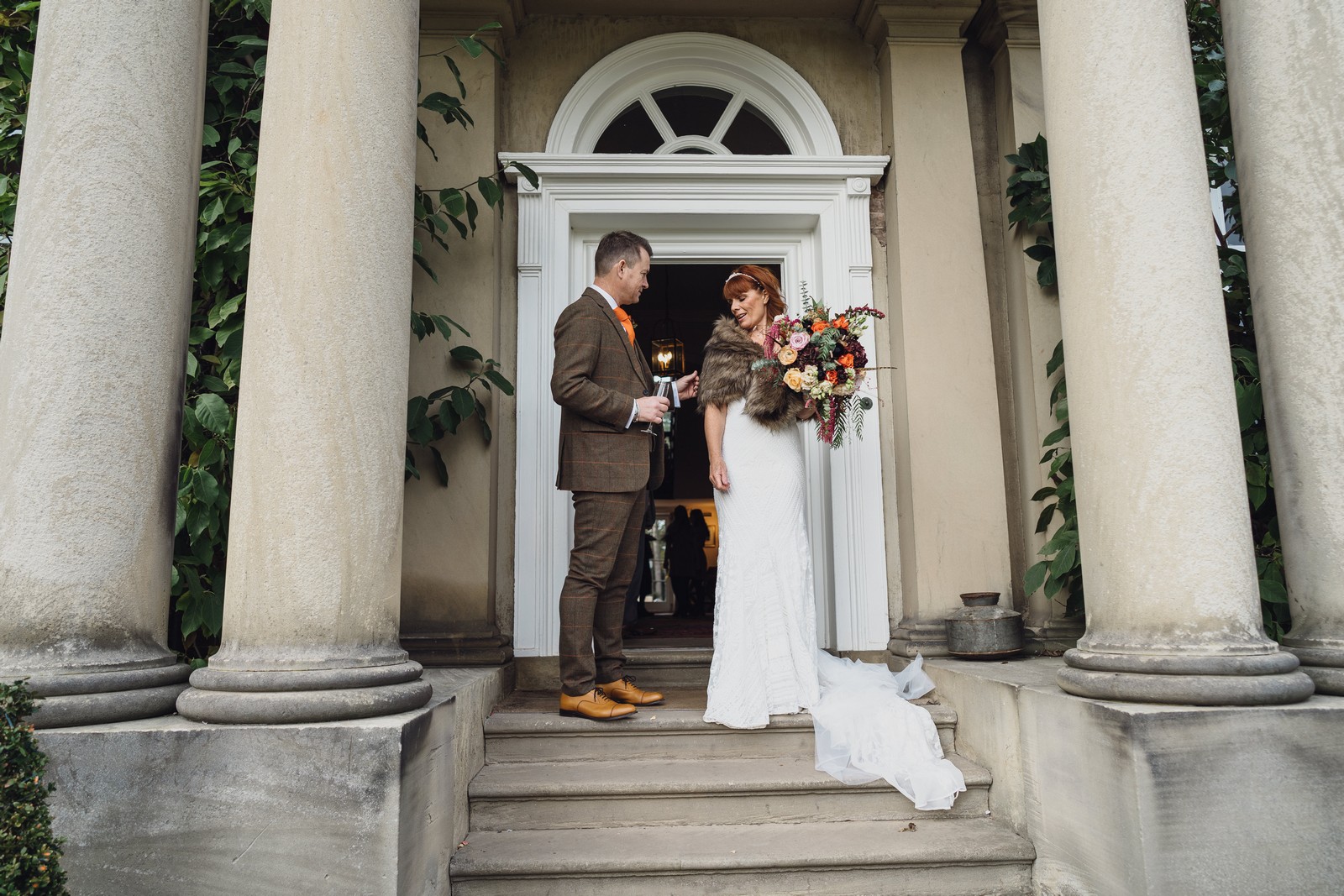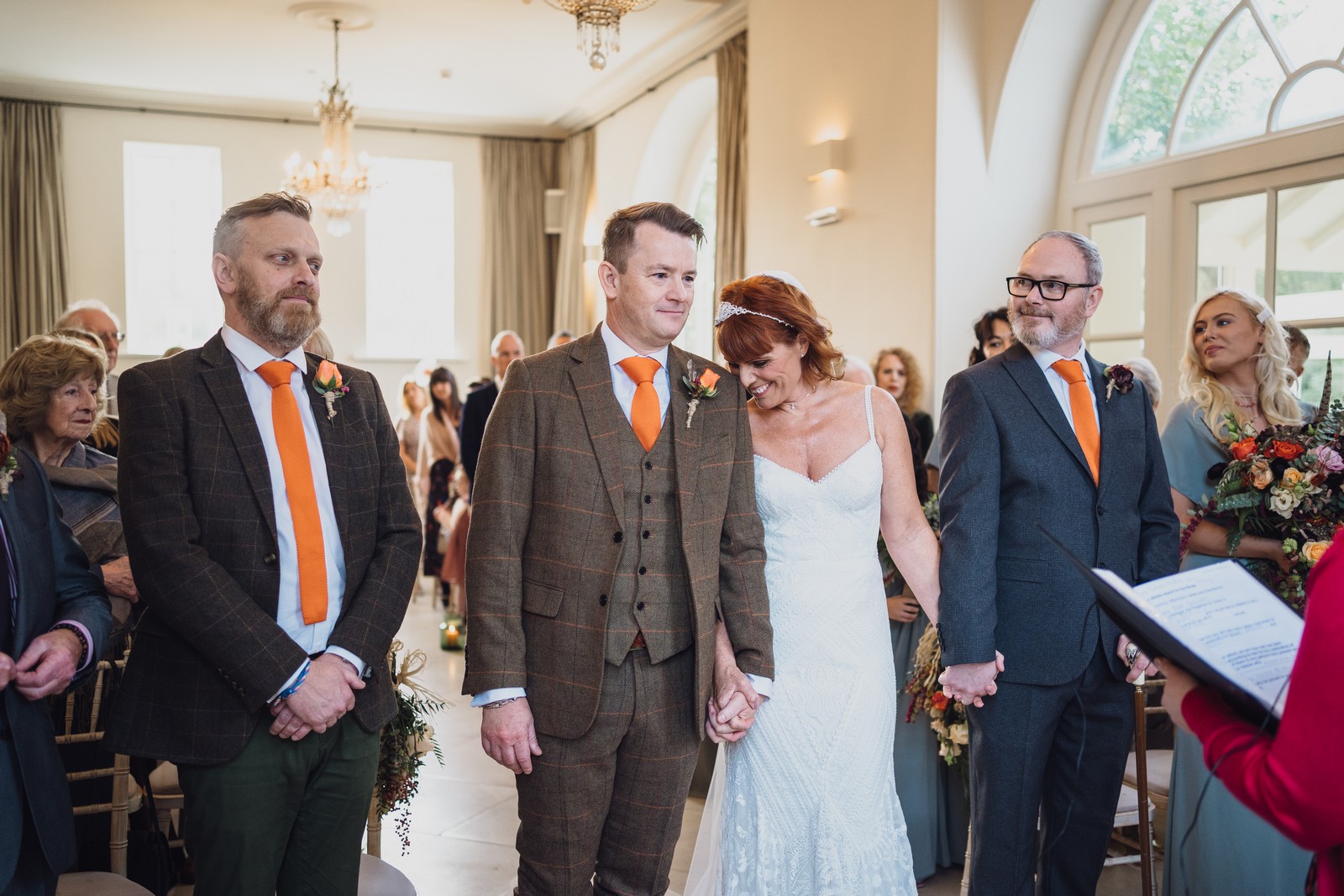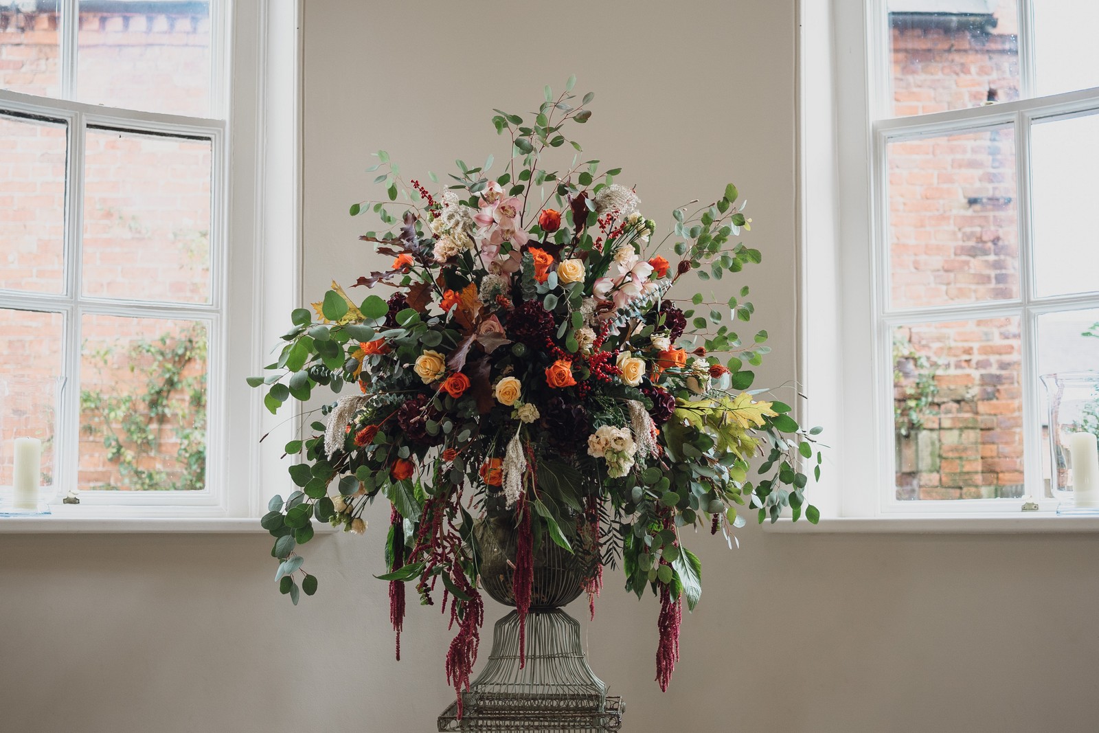 Helen & Richard said ‘We love stately homes, British country tradition, elegance and charm but we wanted a cool modern relaxed fun vibe with lots of rich warm colours’ ” The wedding flowers for the bridal party and groomsmen plus decorating the house was supplied by Rustic Bloom and featured a scheme fitting of a fine country estate wedding in late autumn. Colour scheme orange, green, reds, pinks, burgundy, cherry, we also had feathers in the bouquets and table decorations which looked absolutely stunning’