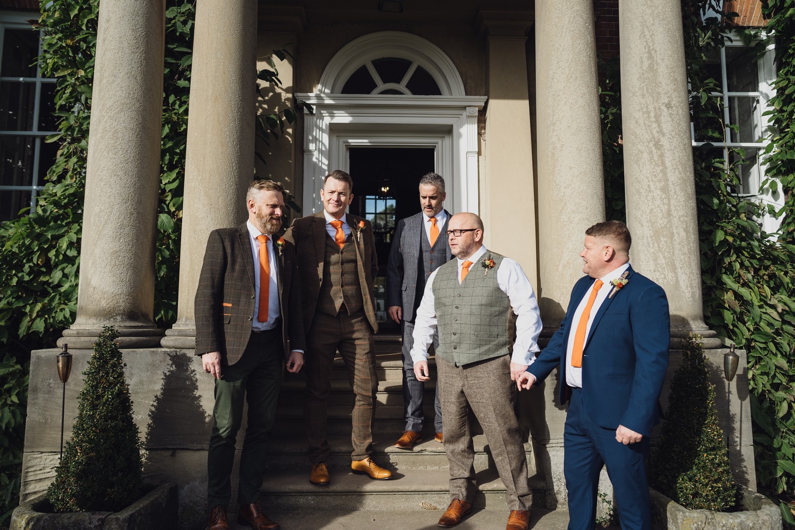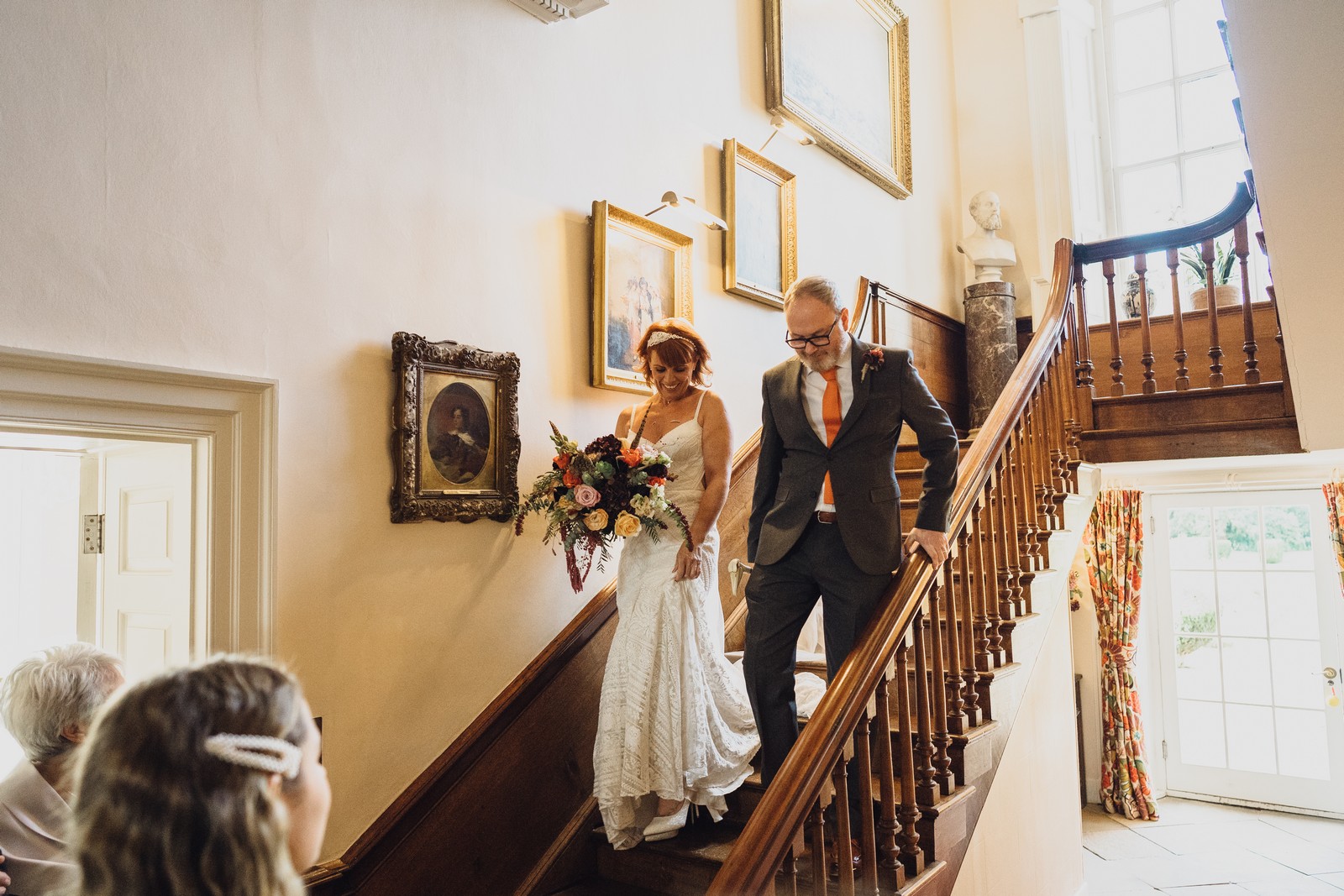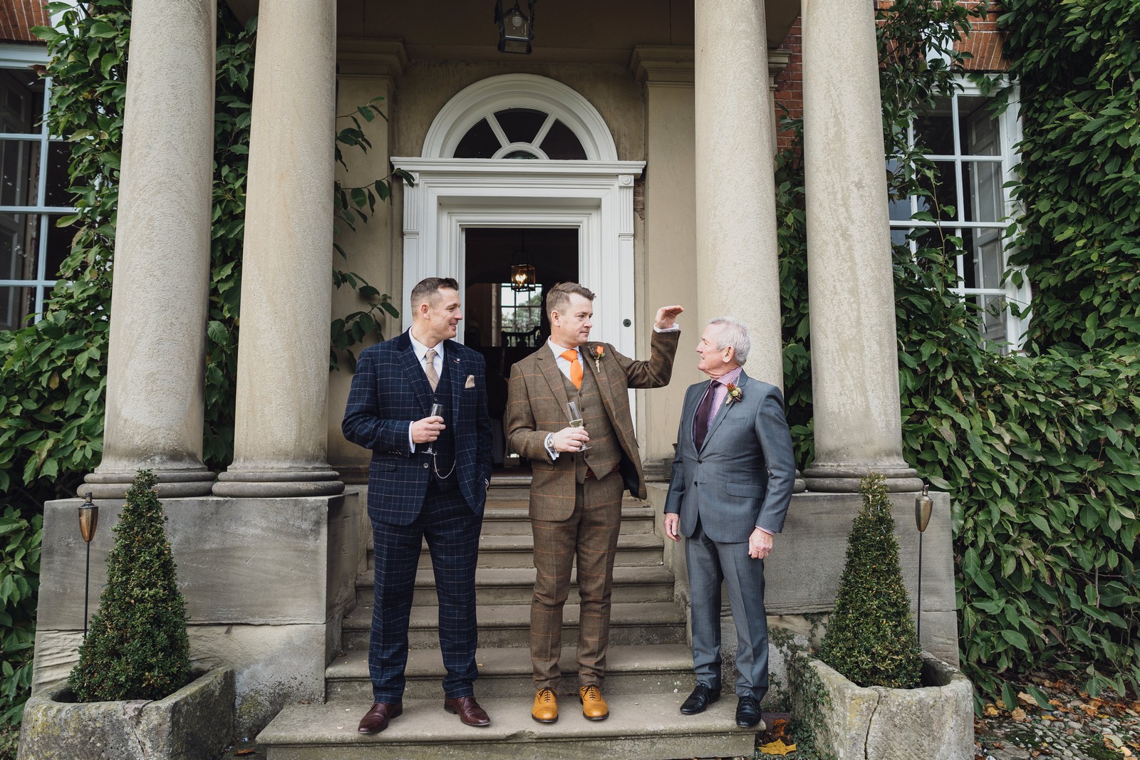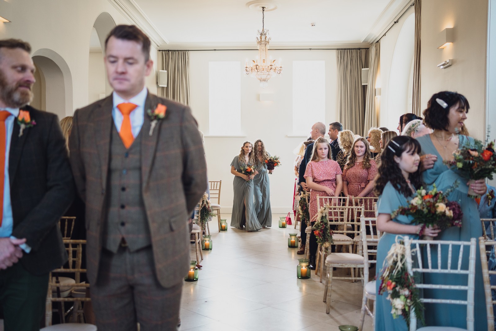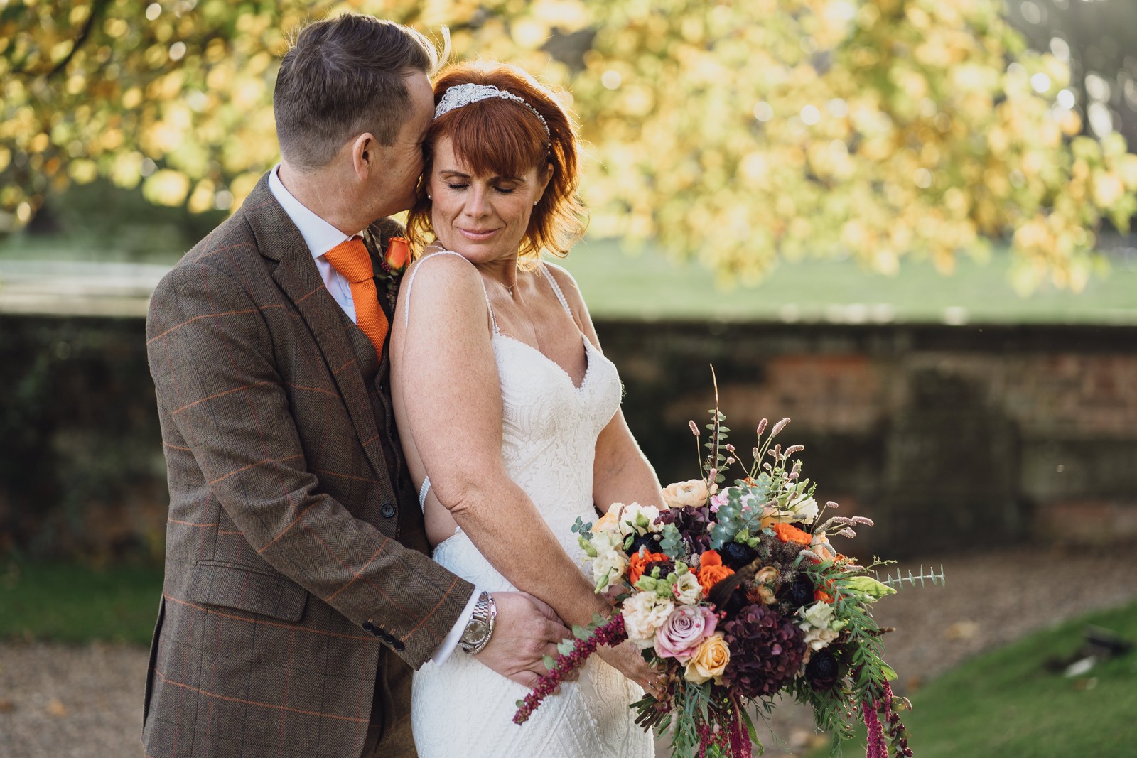 Helen & Richard said ‘We love stately homes, British country tradition, elegance and charm but we wanted a cool modern relaxed fun vibe with lots of rich warm colours’ ” The wedding flowers for the bridal party and groomsmen plus decorating the house was supplied by Rustic Bloom and featured a scheme fitting of a fine country estate wedding in late autumn. Colour scheme orange, green, reds, pinks, burgundy, cherry, we also had feathers in the bouquets and table decorations which looked absolutely stunning’