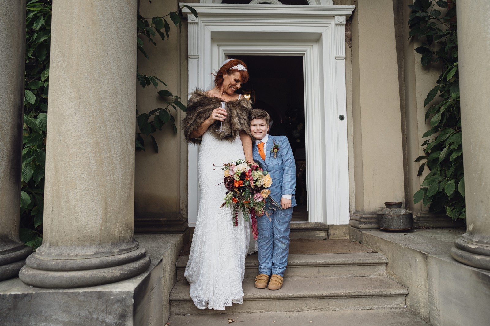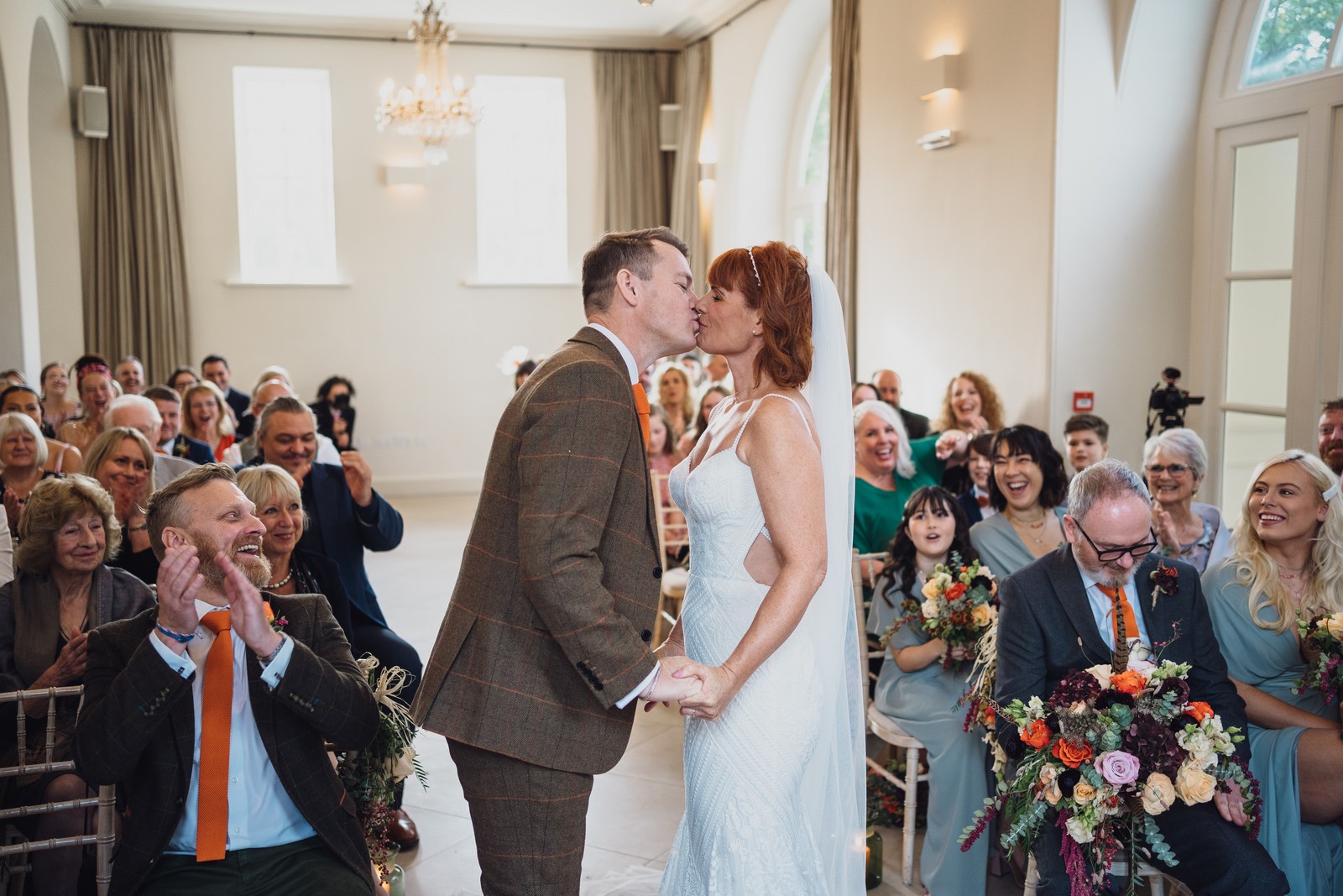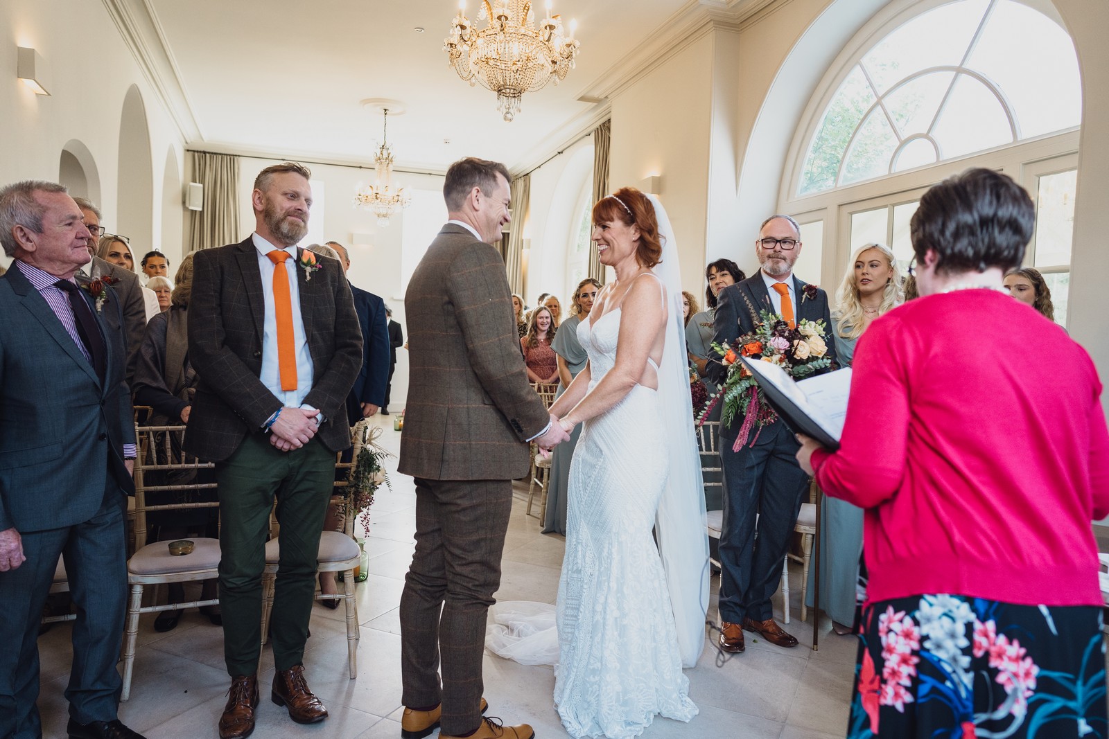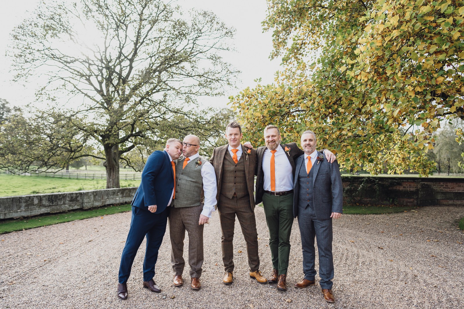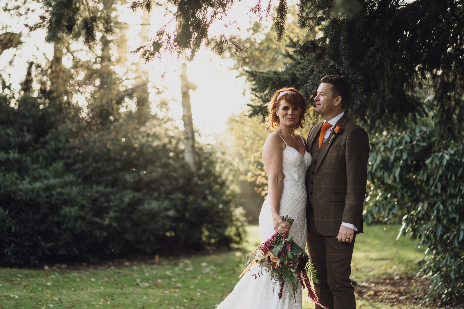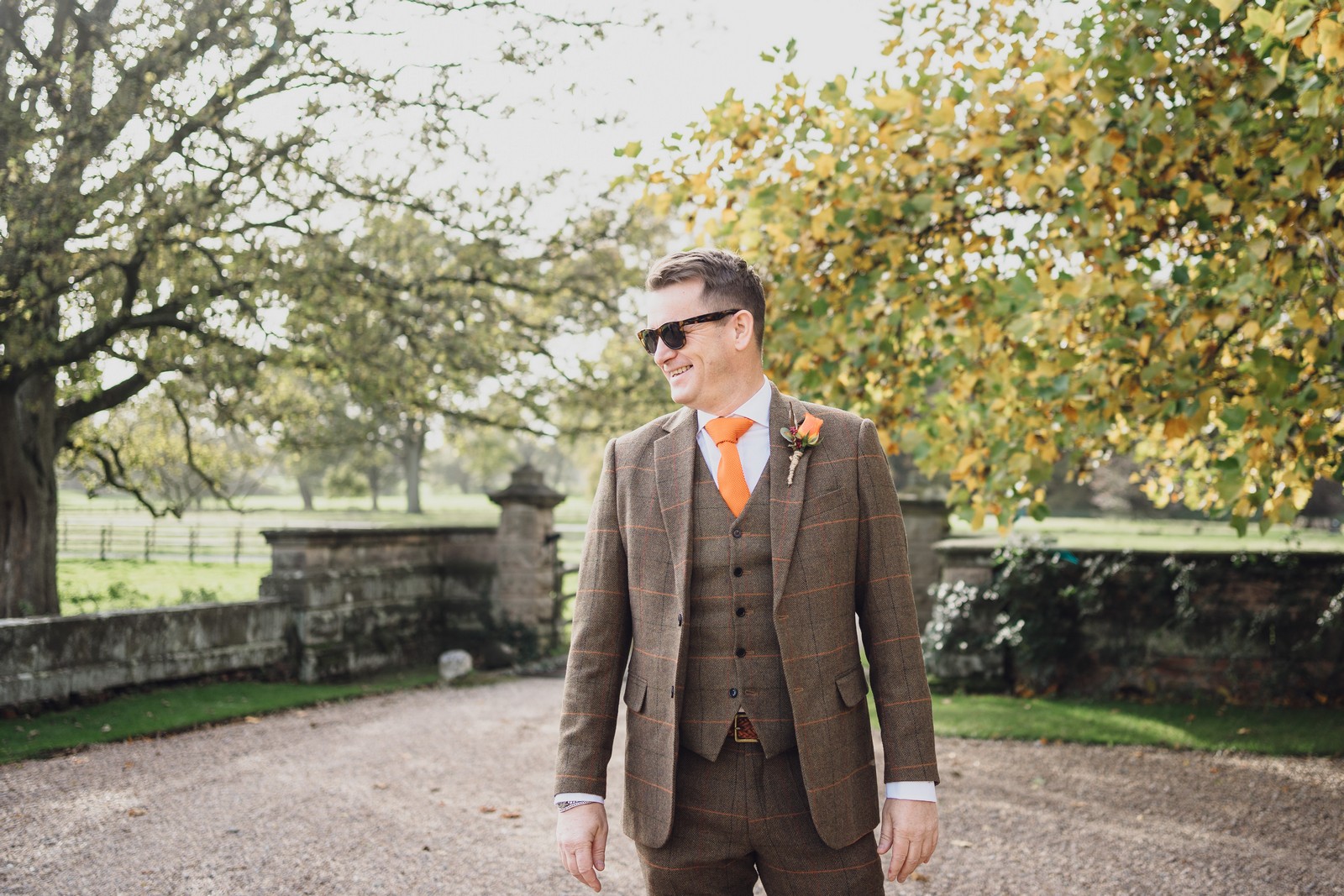 Helen & Richard said ‘We love stately homes, British country tradition, elegance and charm but we wanted a cool modern relaxed fun vibe with lots of rich warm colours’ ” The wedding flowers for the bridal party and groomsmen plus decorating the house was supplied by Rustic Bloom and featured a scheme fitting of a fine country estate wedding in late autumn. Colour scheme orange, green, reds, pinks, burgundy, cherry, we also had feathers in the bouquets and table decorations which looked absolutely stunning’