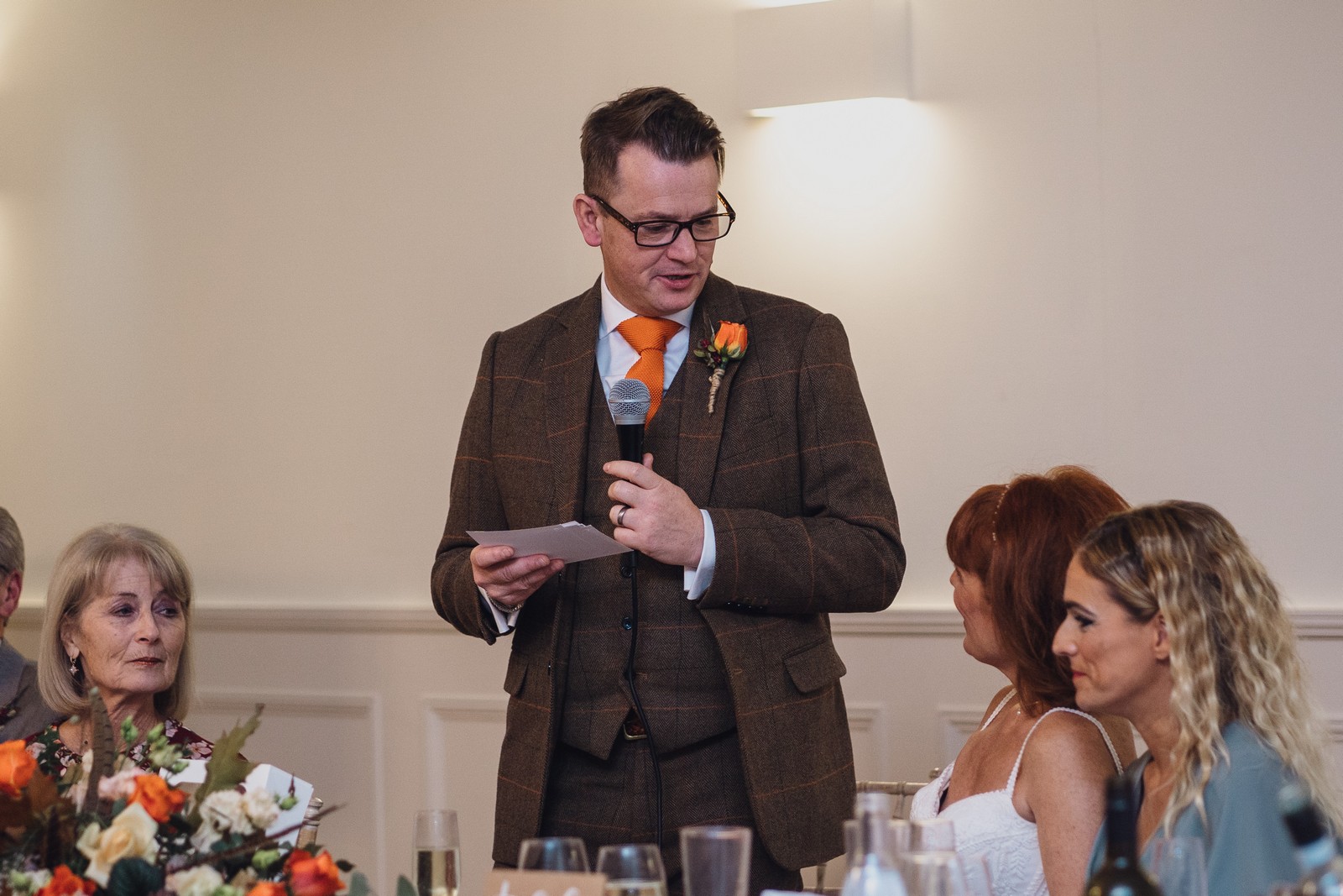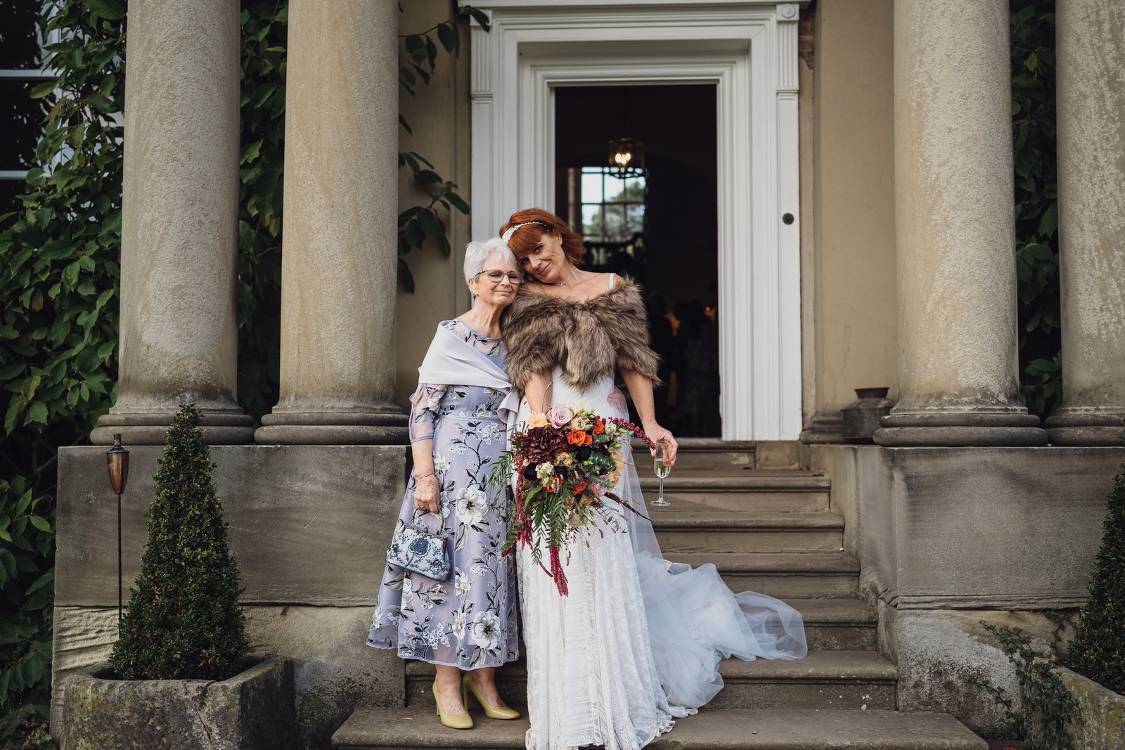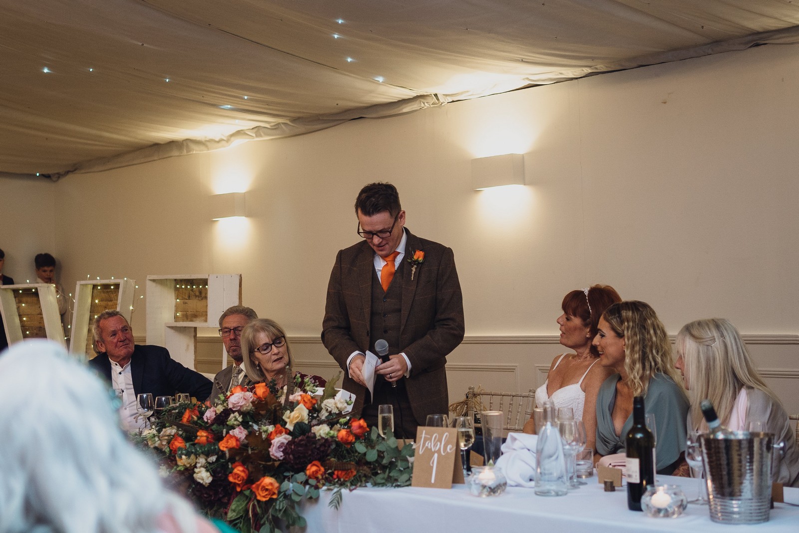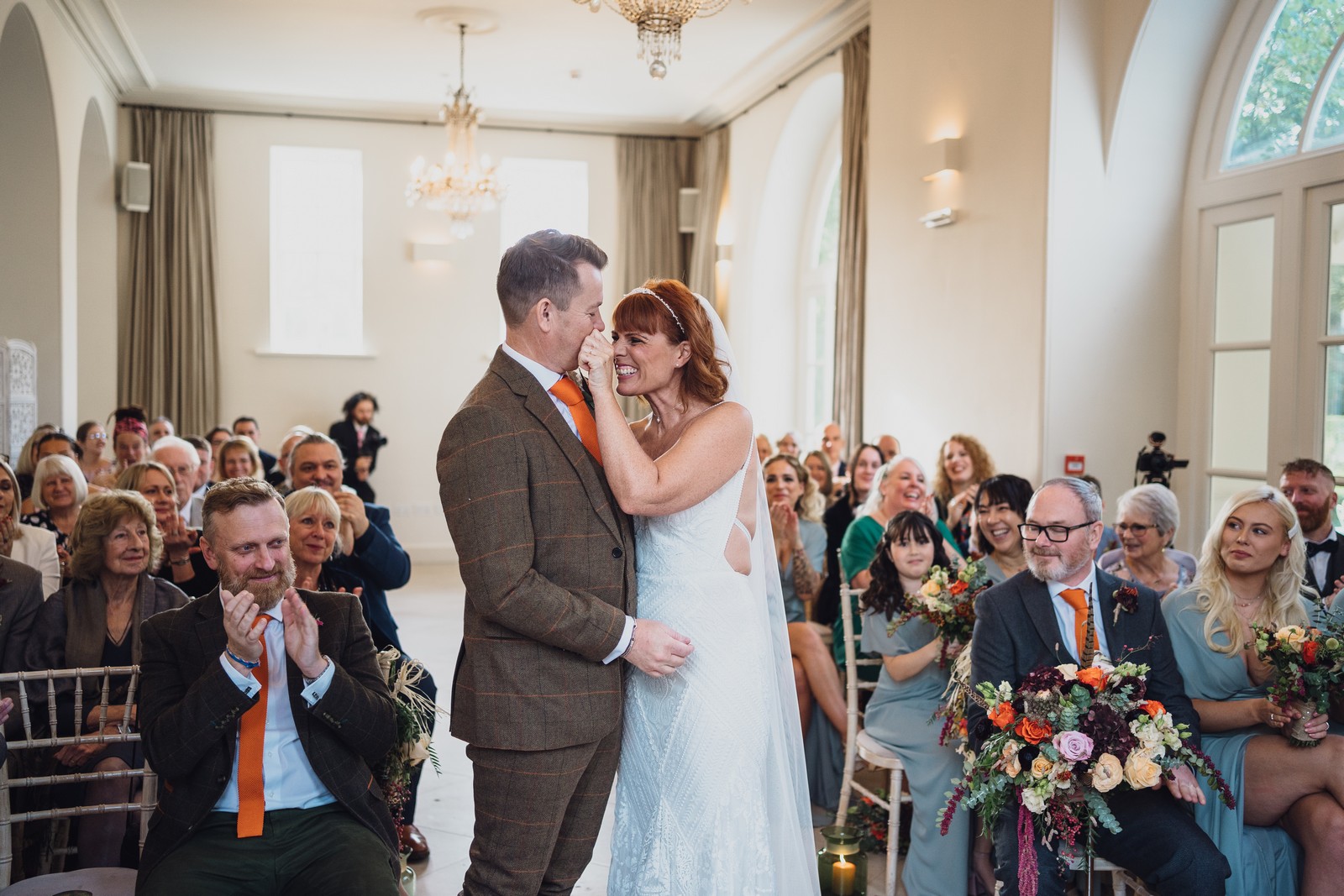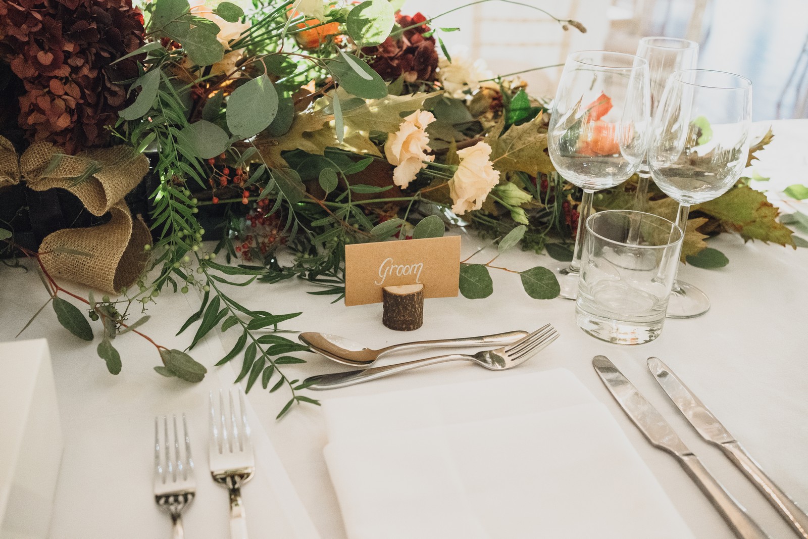 Helen & Richard said ‘We love stately homes, British country tradition, elegance and charm but we wanted a cool modern relaxed fun vibe with lots of rich warm colours’ ” The wedding flowers for the bridal party and groomsmen plus decorating the house was supplied by Rustic Bloom and featured a scheme fitting of a fine country estate wedding in late autumn. Colour scheme orange, green, reds, pinks, burgundy, cherry, we also had feathers in the bouquets and table decorations which looked absolutely stunning’