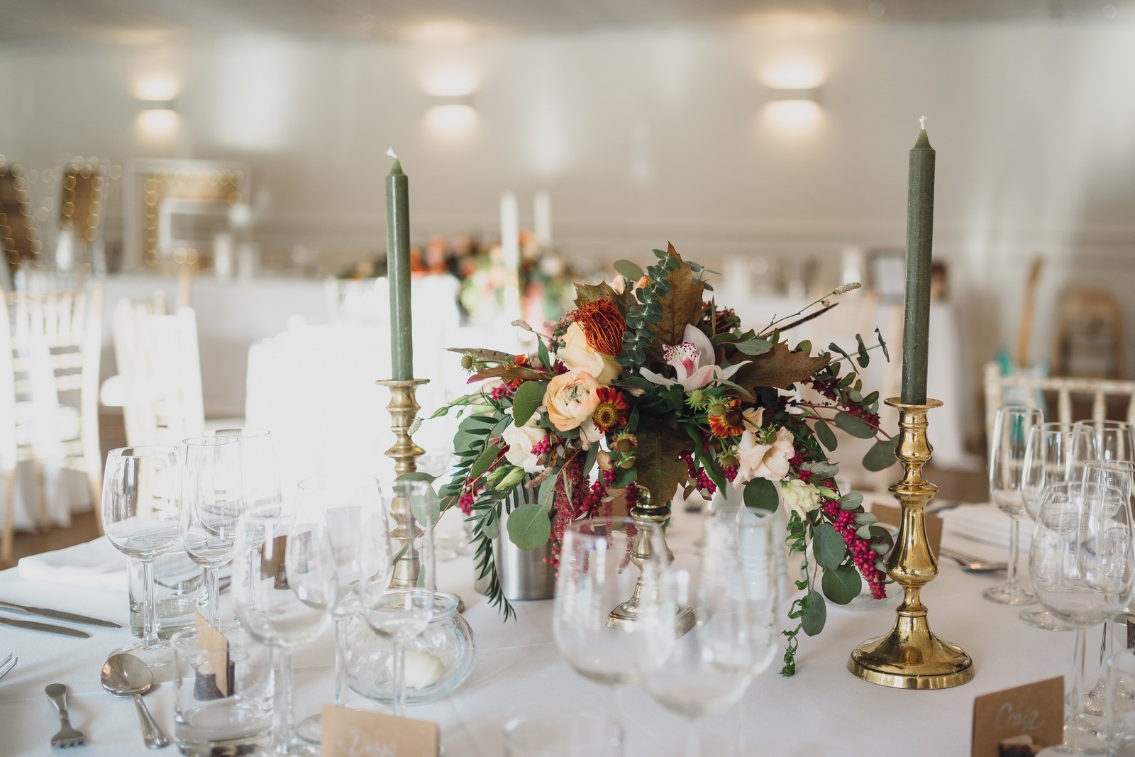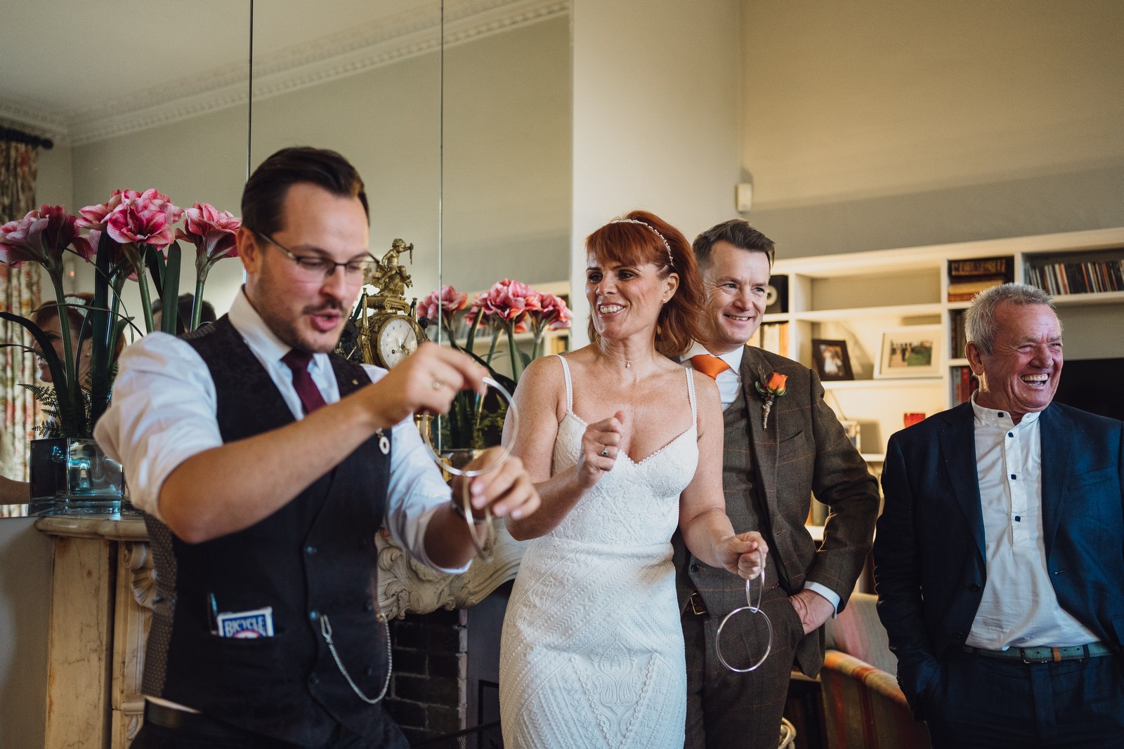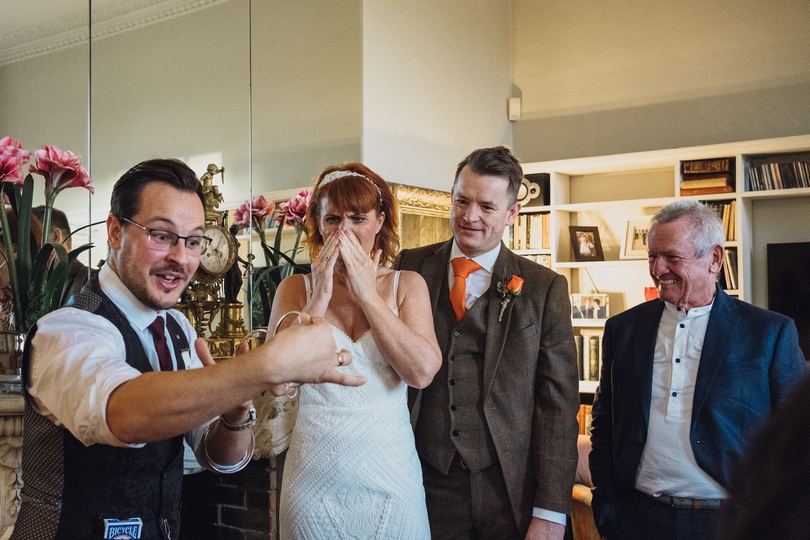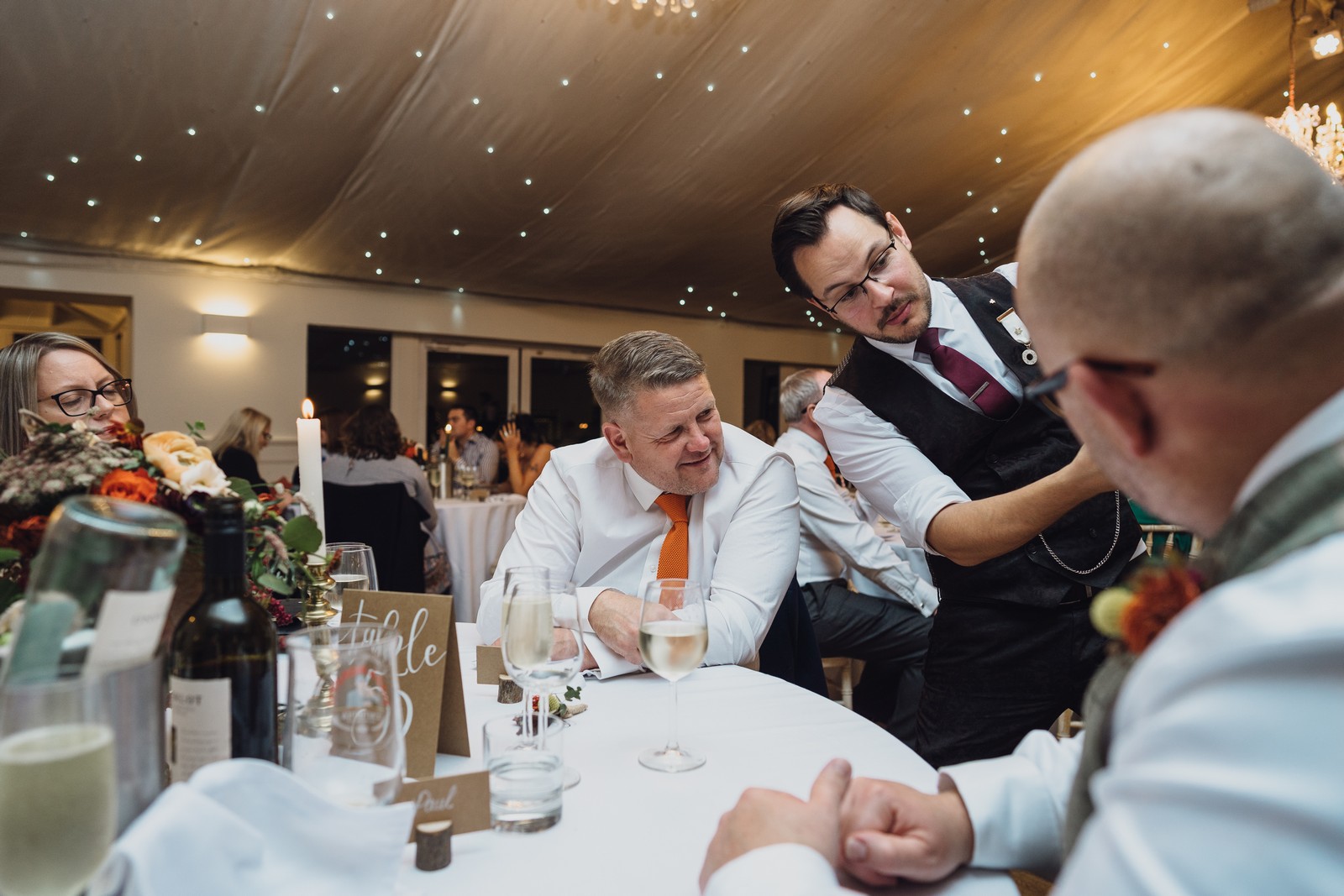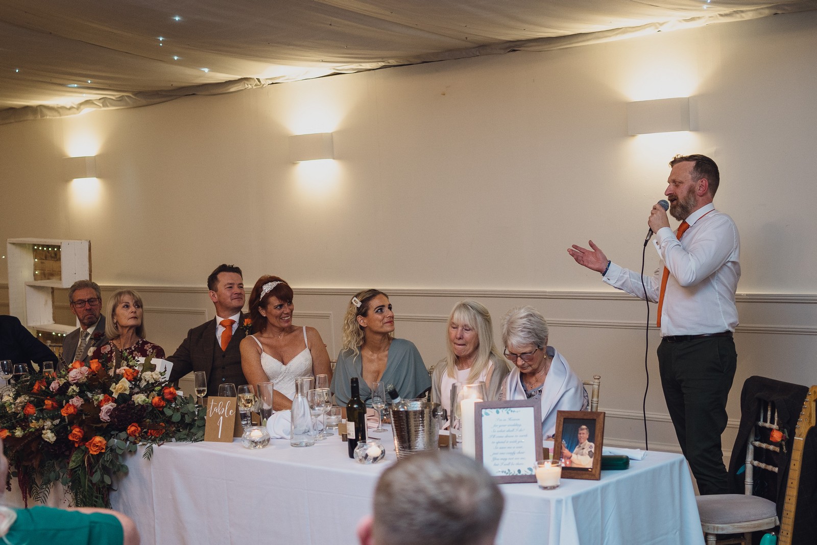 Helen & Richard said ‘We love stately homes, British country tradition, elegance and charm but we wanted a cool modern relaxed fun vibe with lots of rich warm colours’ ” The wedding flowers for the bridal party and groomsmen plus decorating the house was supplied by Rustic Bloom and featured a scheme fitting of a fine country estate wedding in late autumn. Colour scheme orange, green, reds, pinks, burgundy, cherry, we also had feathers in the bouquets and table decorations which looked absolutely stunning’