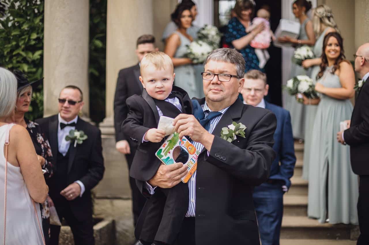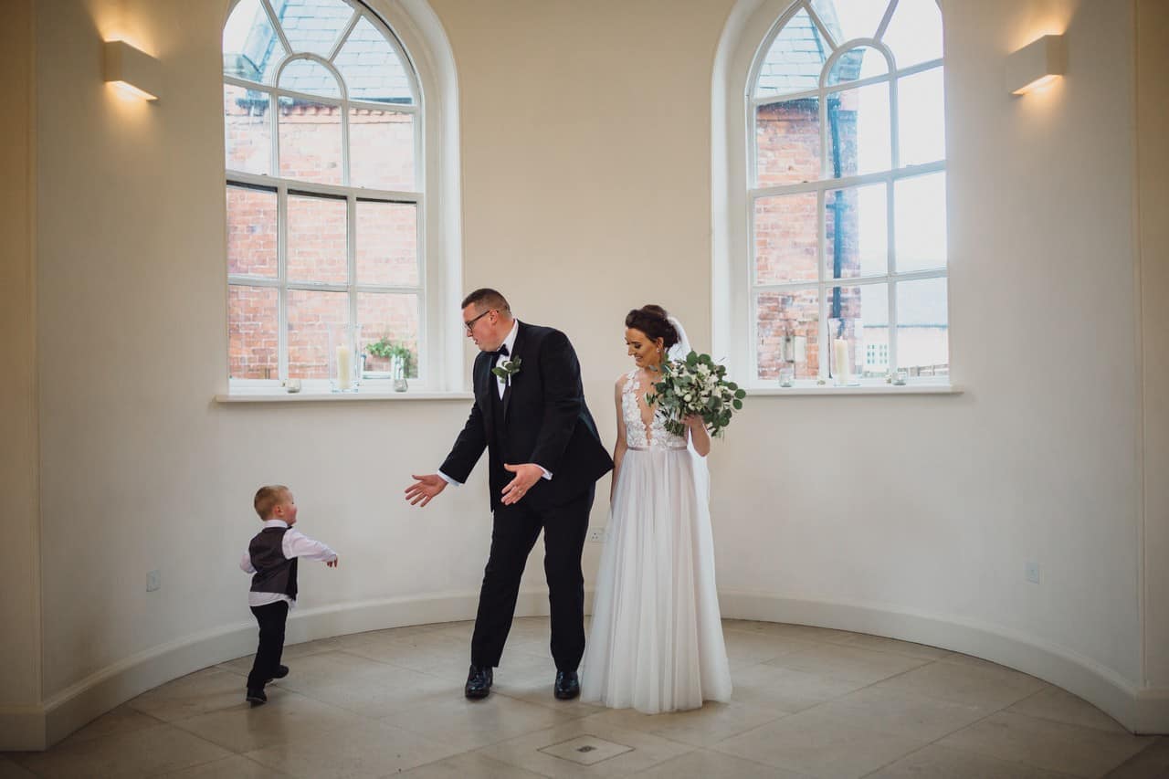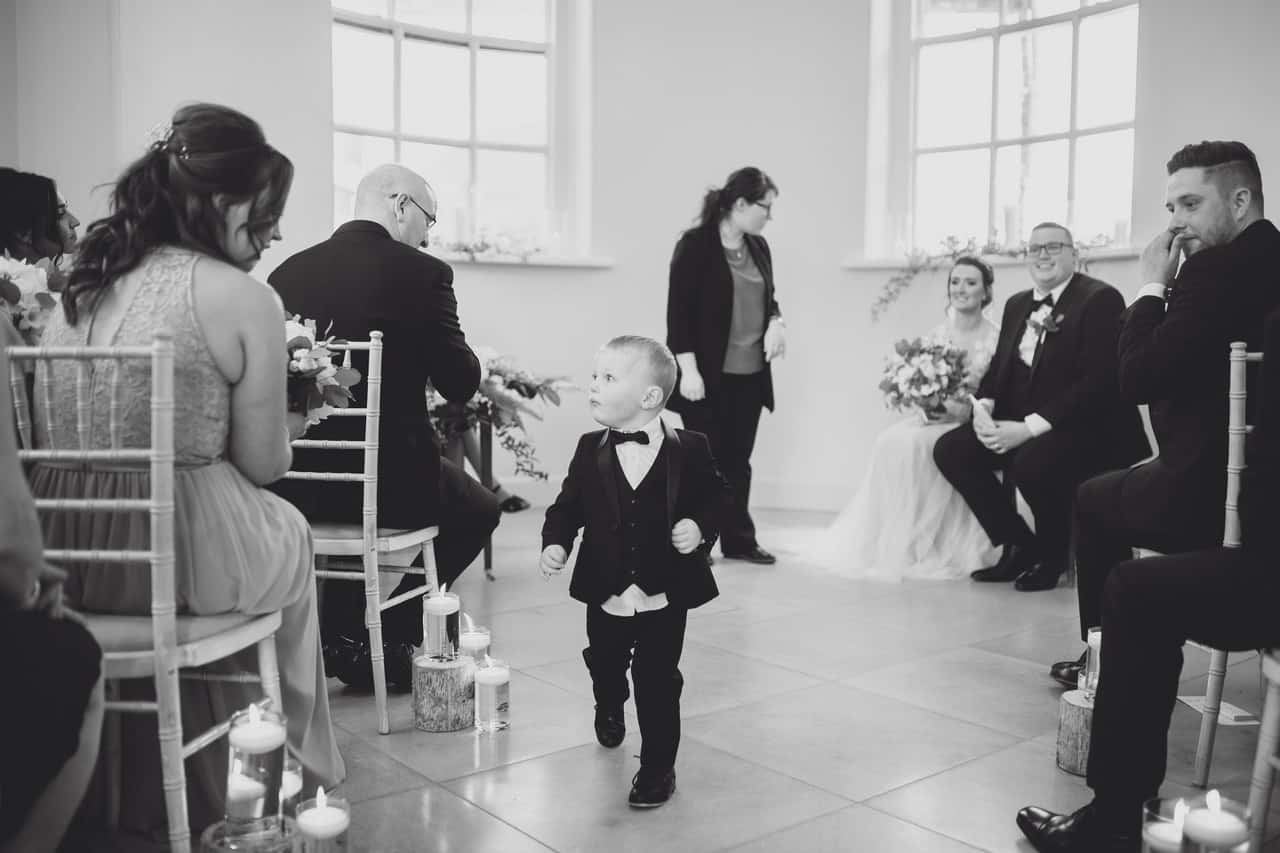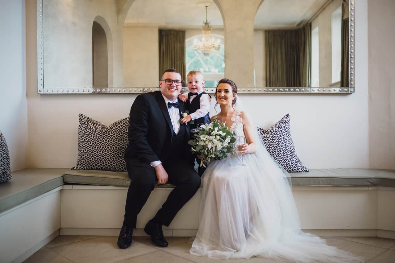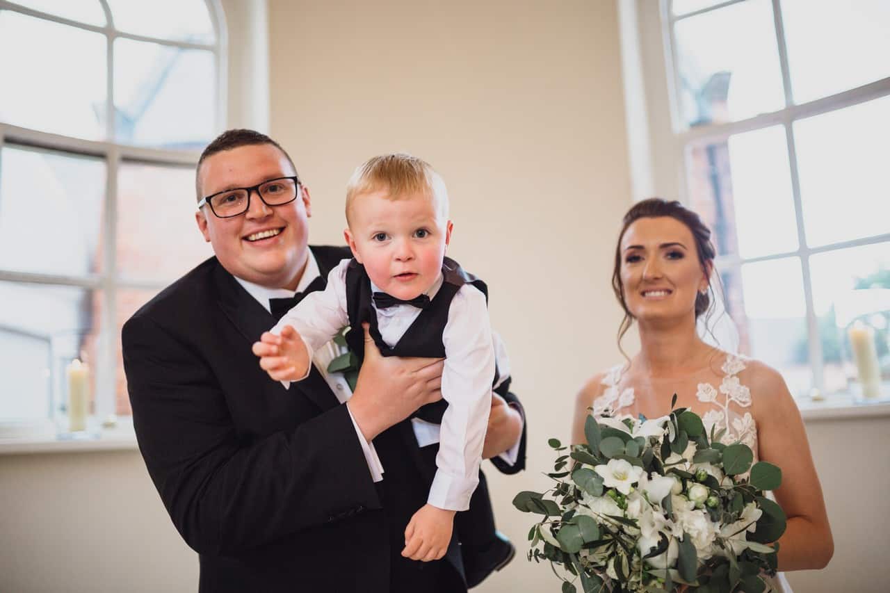 The ceremony room at Iscoyd is just beautiful and so light and it was decorated simply and elegantly for Kelly and James with more beautiful greenery and white flowers from amazing florist Red Floral Architecture. As they said their vows, James and Kelly’s toddler son Elliot got involved, standing between them before running off down the aisle to escape! What a cutie.