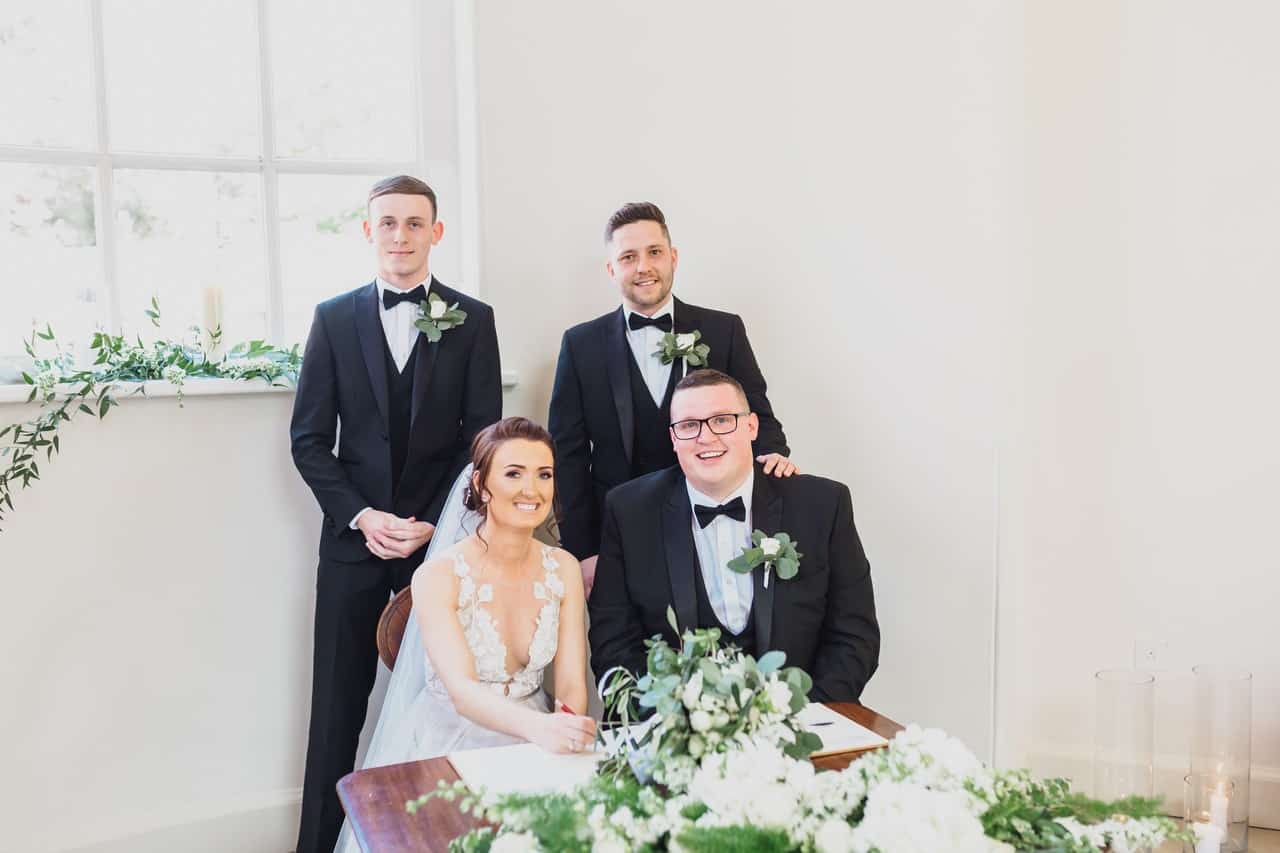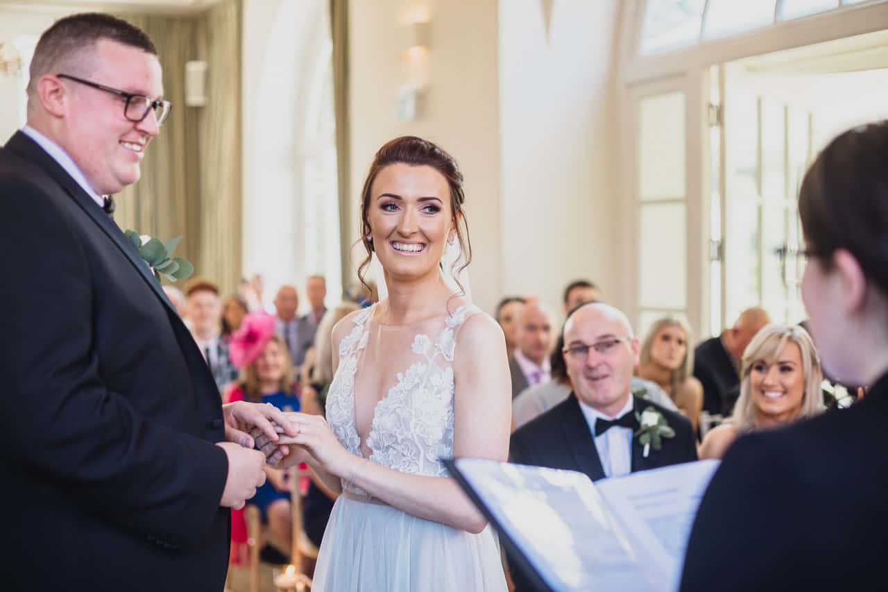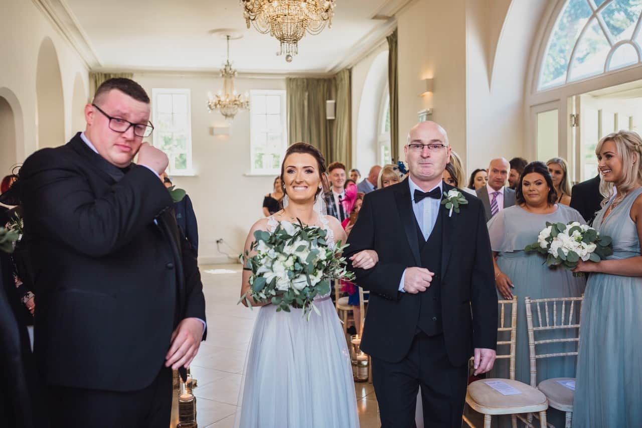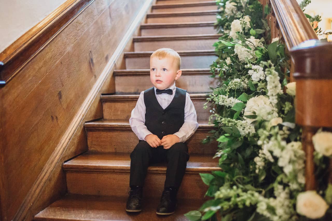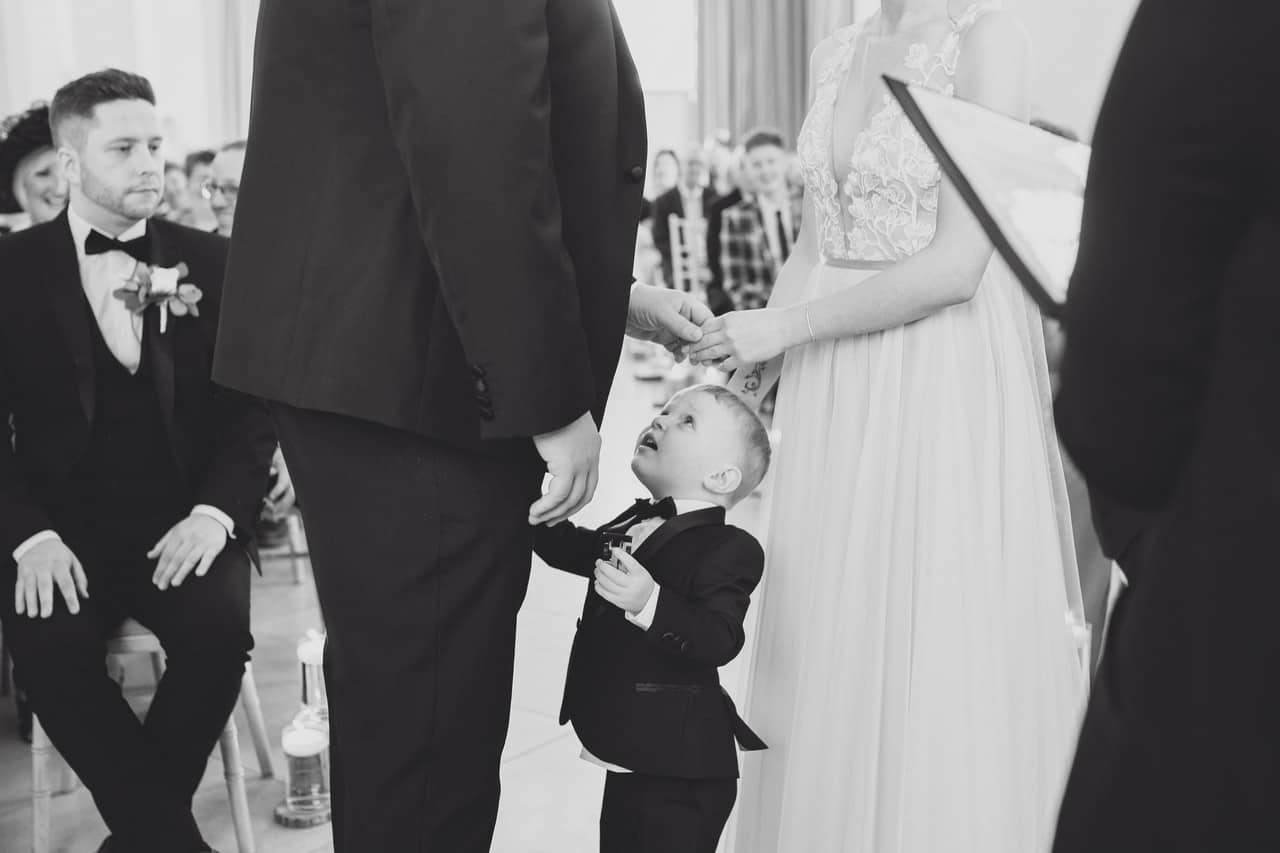 The ceremony room at Iscoyd is just beautiful and so light and it was decorated simply and elegantly for Kelly and James with more beautiful greenery and white flowers from amazing florist Red Floral Architecture. As they said their vows, James and Kelly’s toddler son Elliot got involved, standing between them before running off down the aisle to escape! What a cutie.