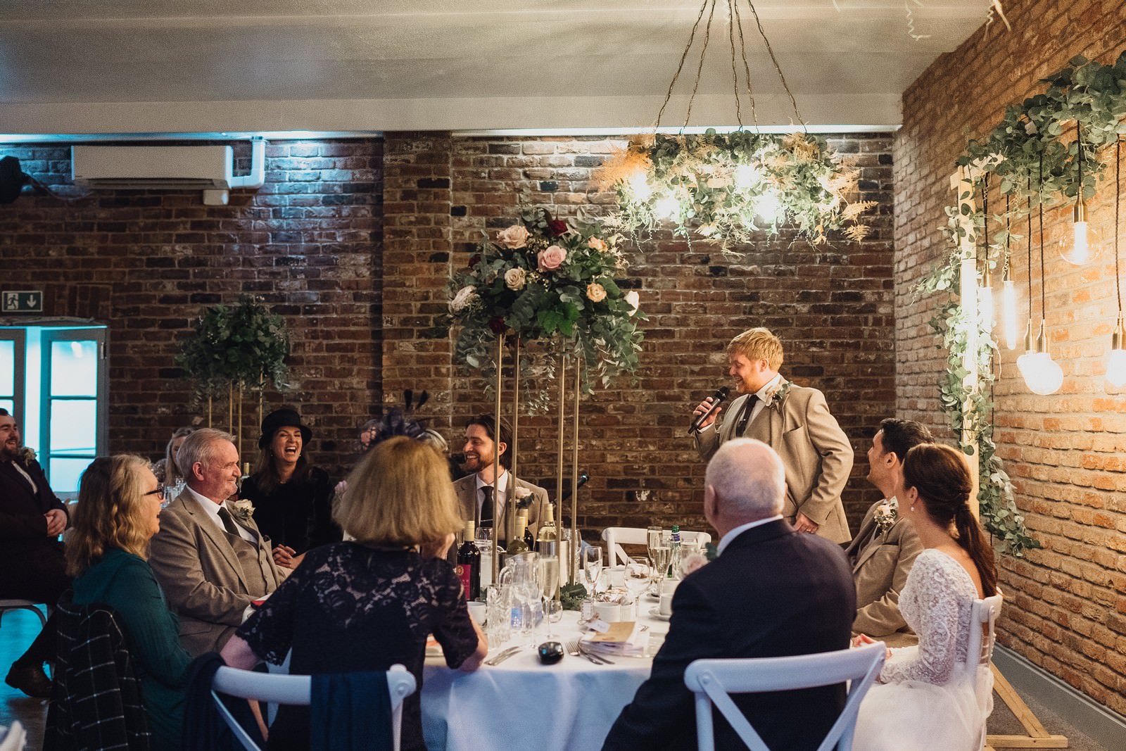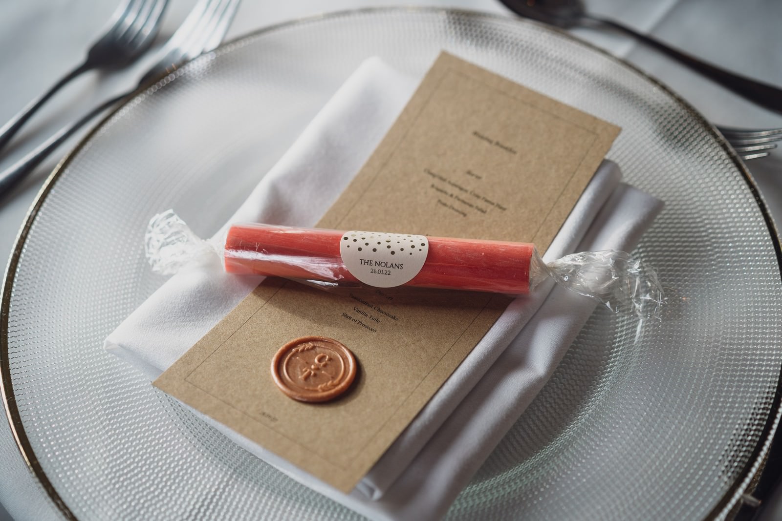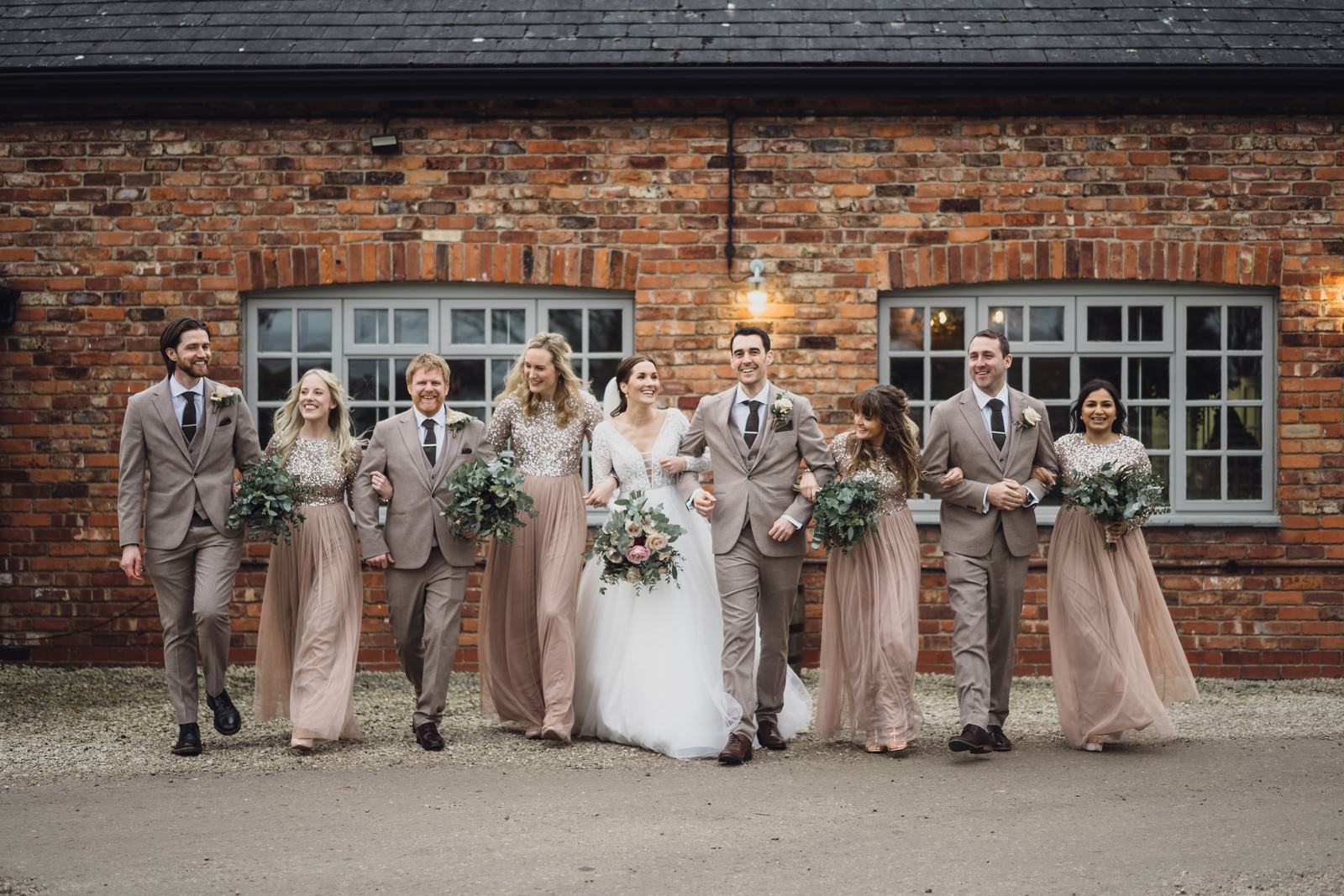We picked the colours of our bridesmaid dresses- dusty pink and groomsmen suits- neutral tweed to fit tonally with the brickwork which looked lovely in the pictures. Finally there were quite a few nice gold touches on the plates, candles and table numbers which matched nicely with the bridesmaid sequin dresses.