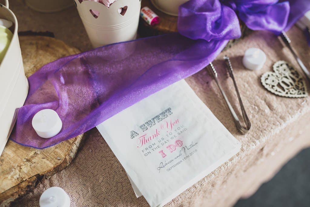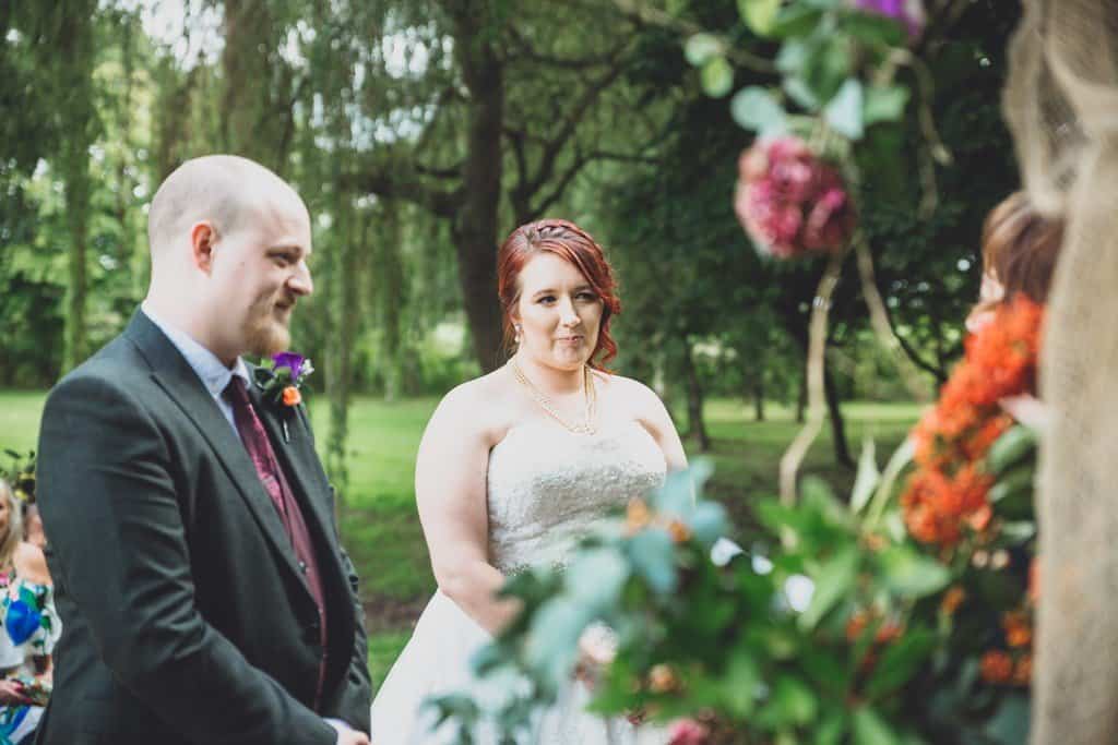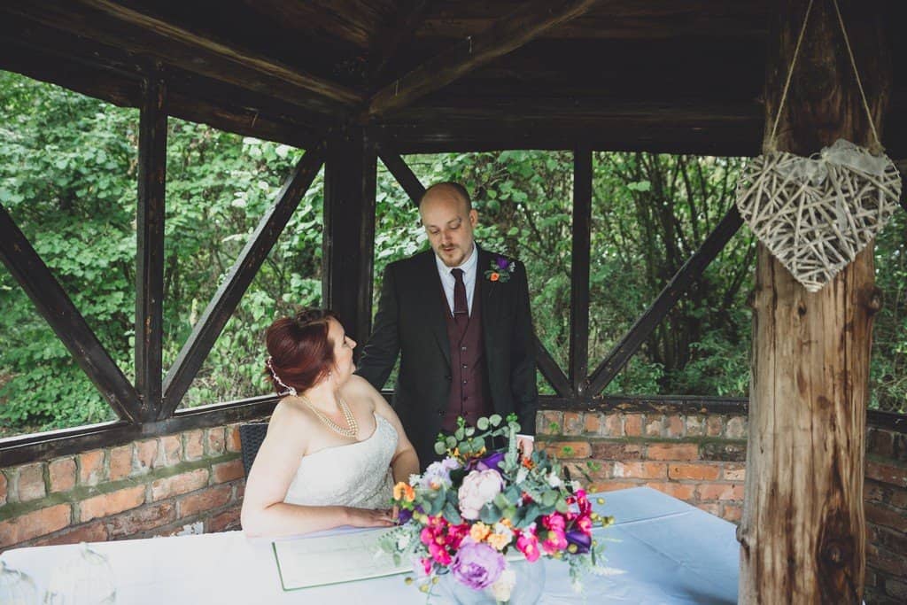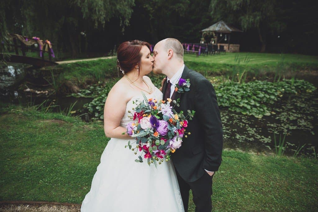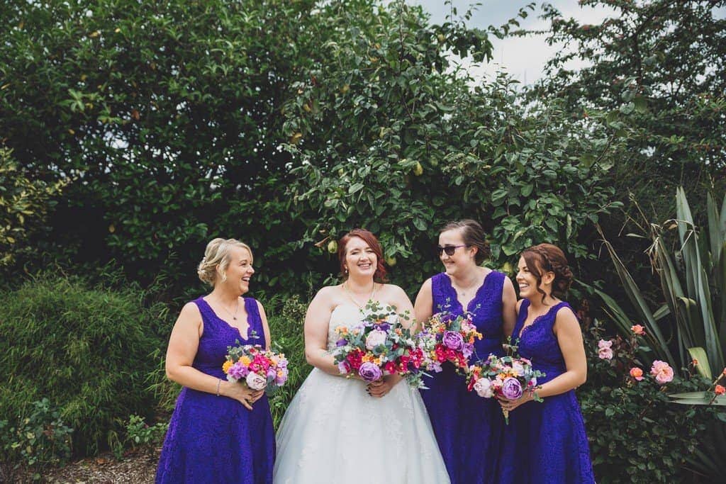 Becki and Nathan wanted an Autumn wedding and the weather at Manley Mere in Cheshire was just perfect for their outdoor ceremony in September. The bridesmaids looked amazing in their ‘Cadbury purple’ dresses against the lush greens of the woodland setting and Becki’s flowers were absolutely incredible, picking out the bright colours from the rest of the theme.