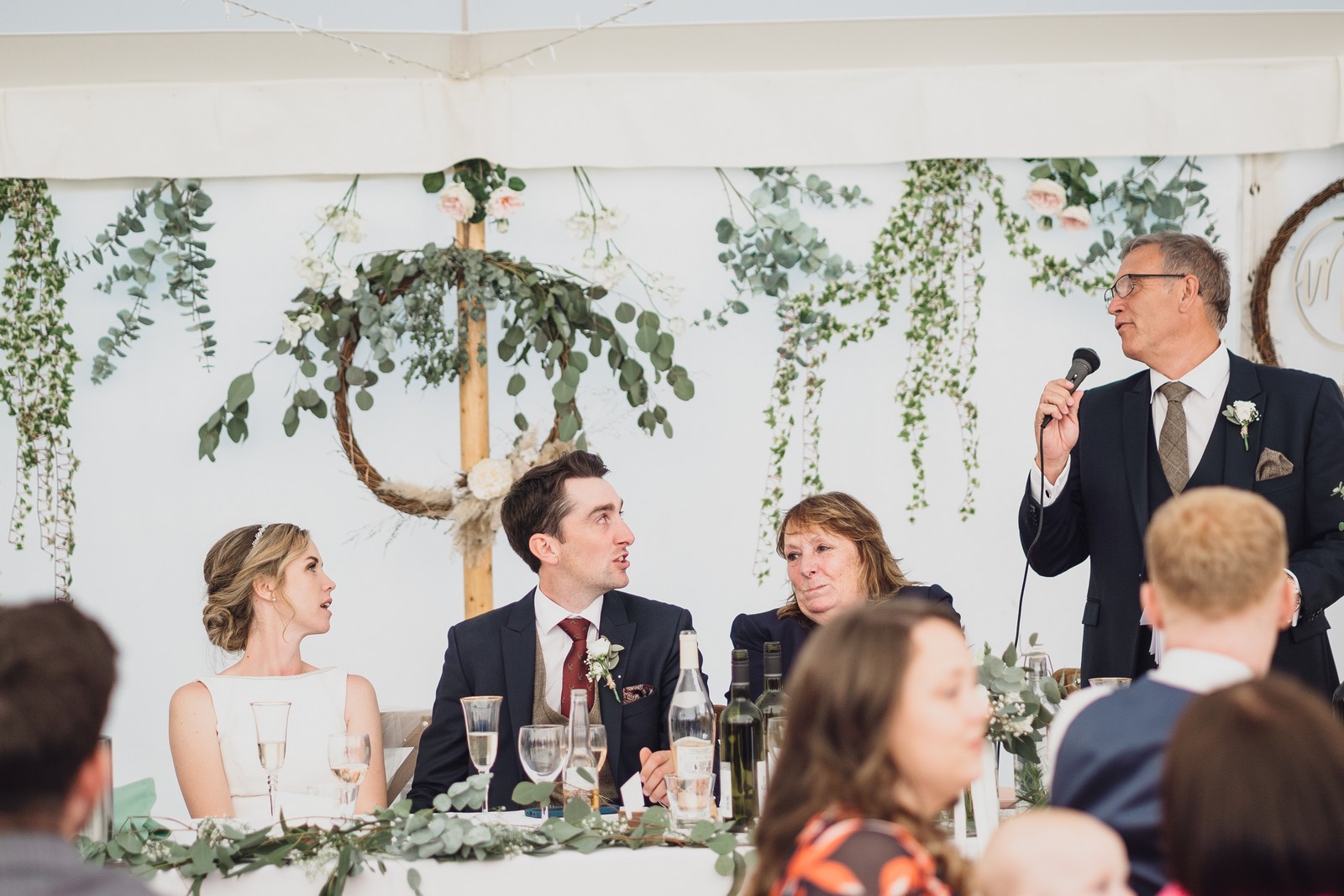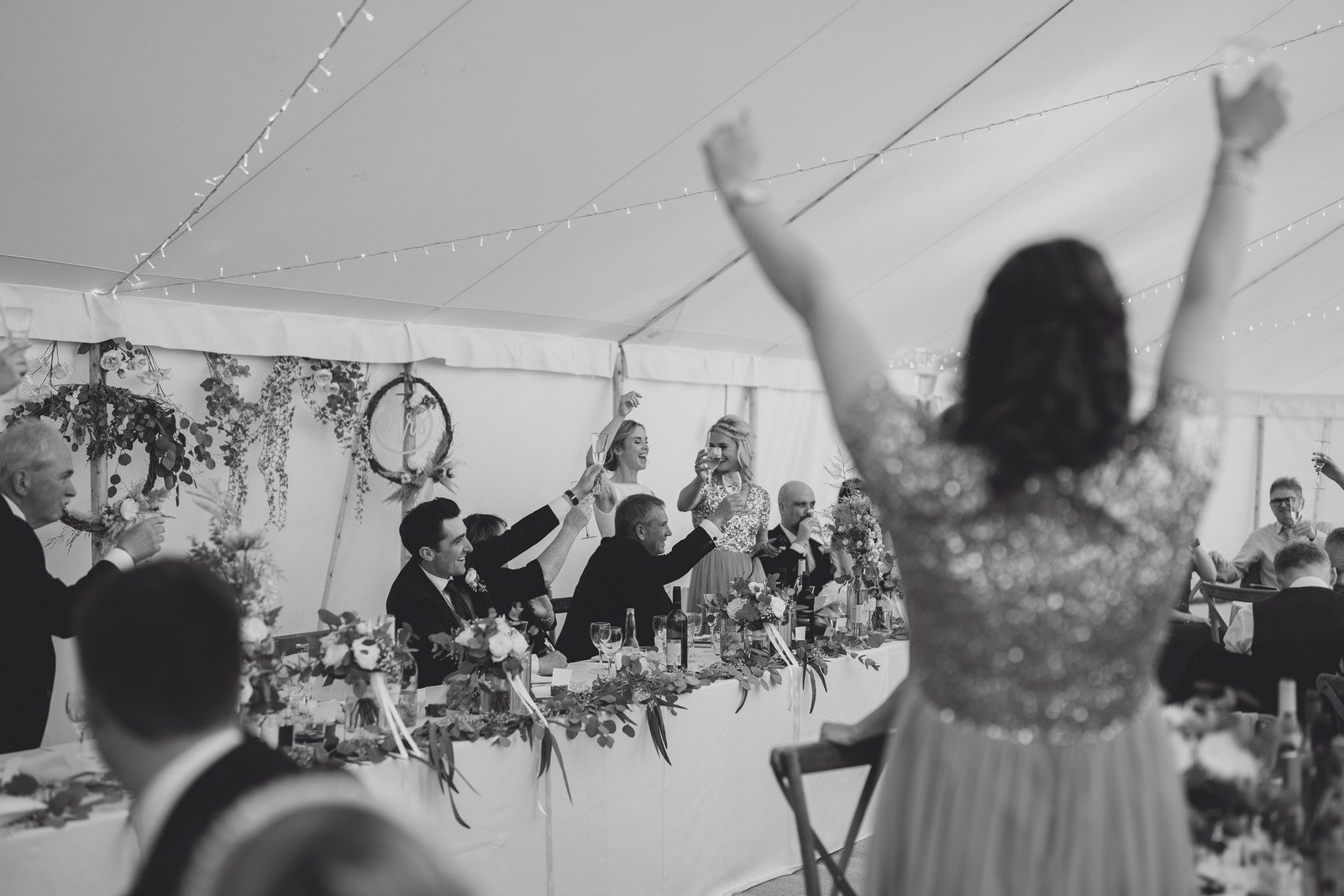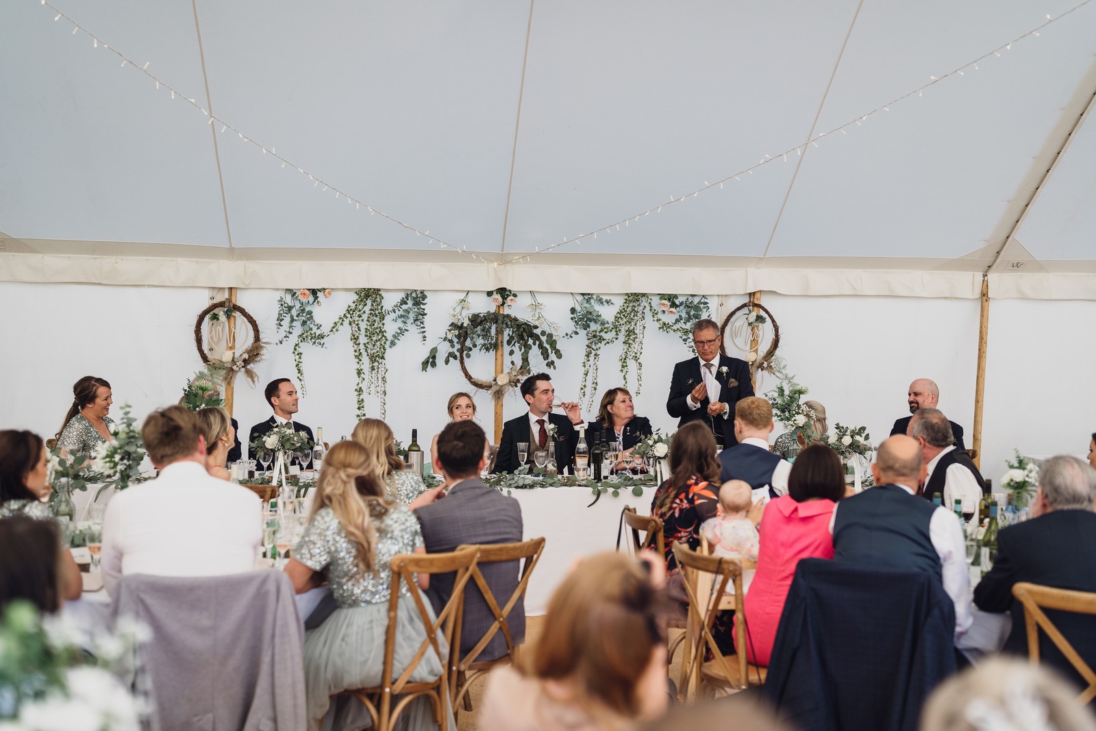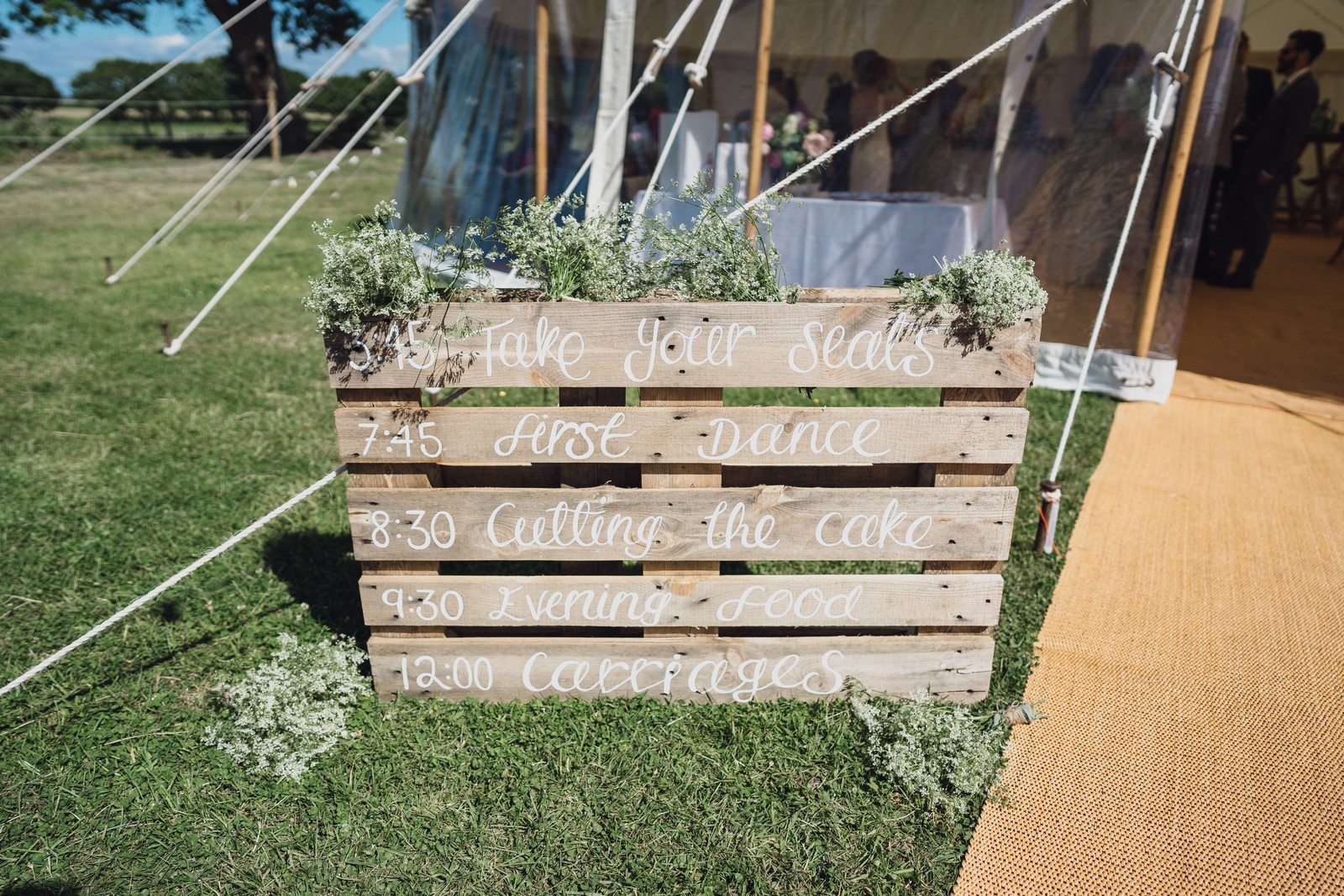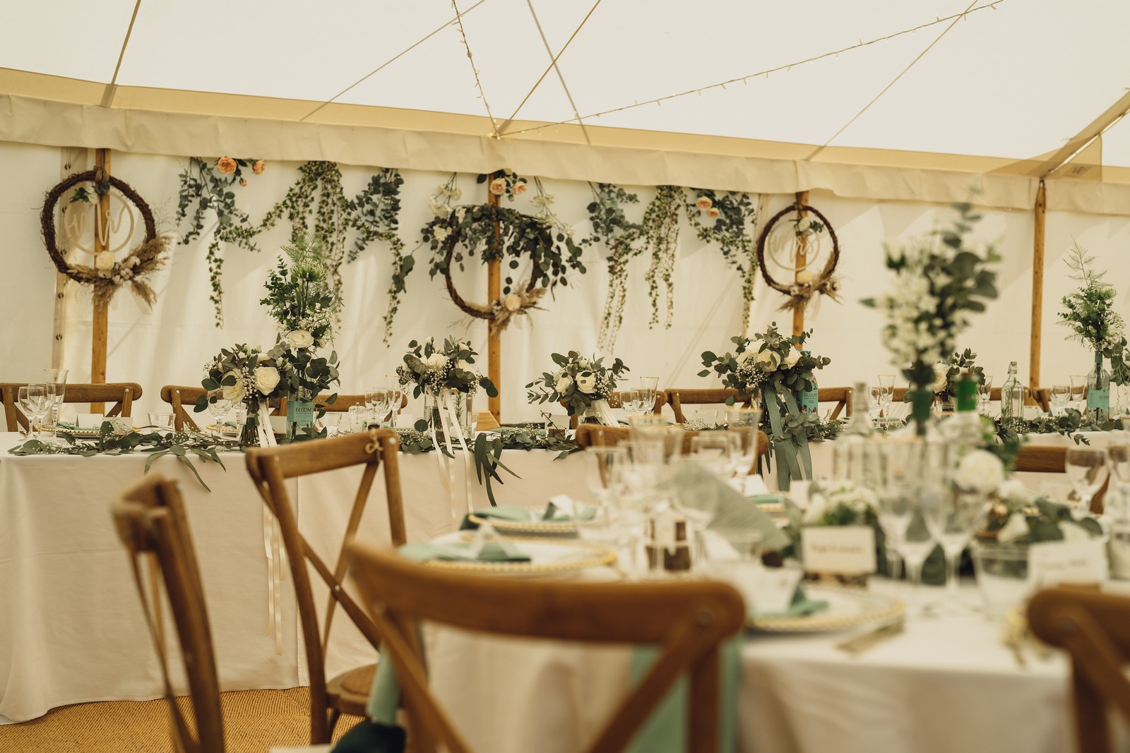 Country, home-made style – marquee at home. Able to create this by the inspiration and help of my amazing bridesmaids who styled and decorated the marquee (including picking wild flowers from the lane/land!)