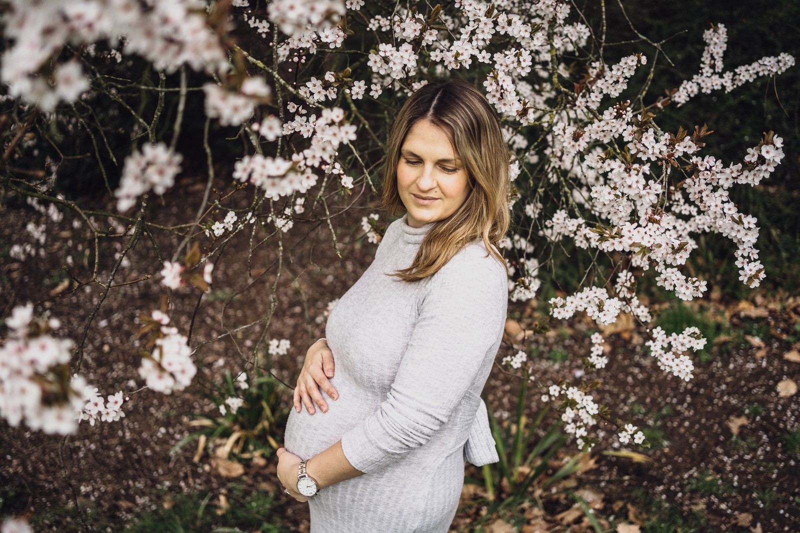 Maternity shoot at Queens Park in Crewe on a spring morning with beautiful blossom trees. Maternity portrait shoots are typically between 28-36 weeks {Emily is 35 weeks here} I recommend to wear something comfortable, one plain colour and fitting, feel free to bring a few outfits.