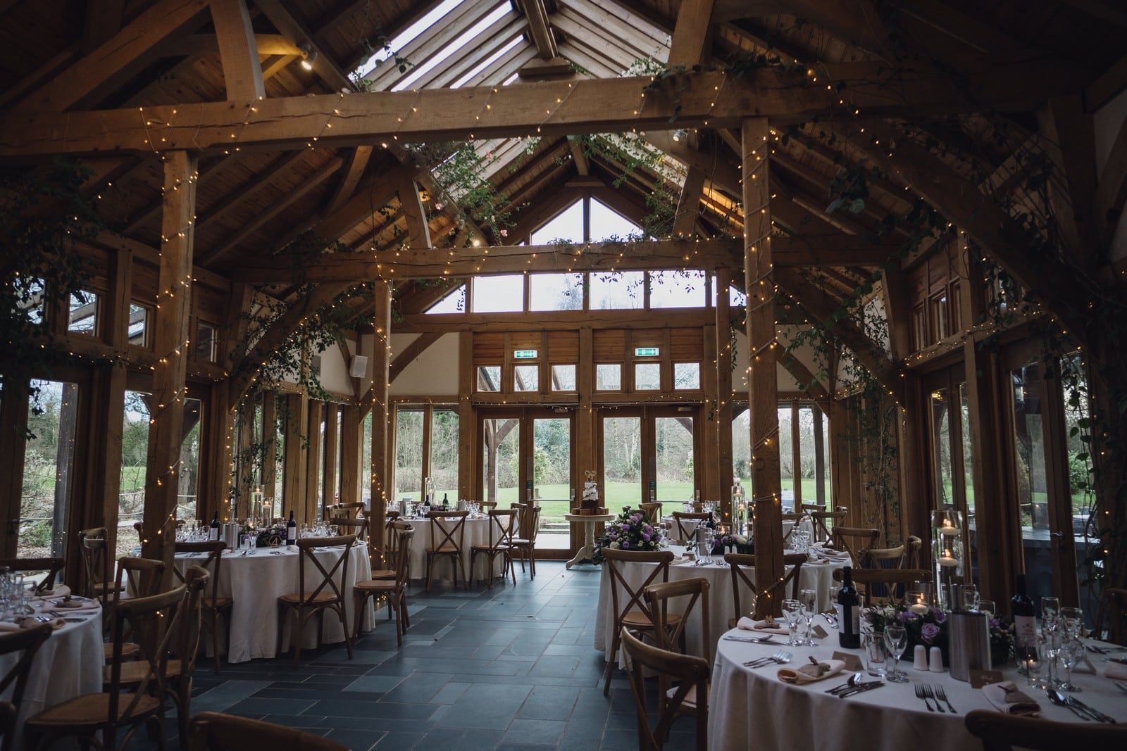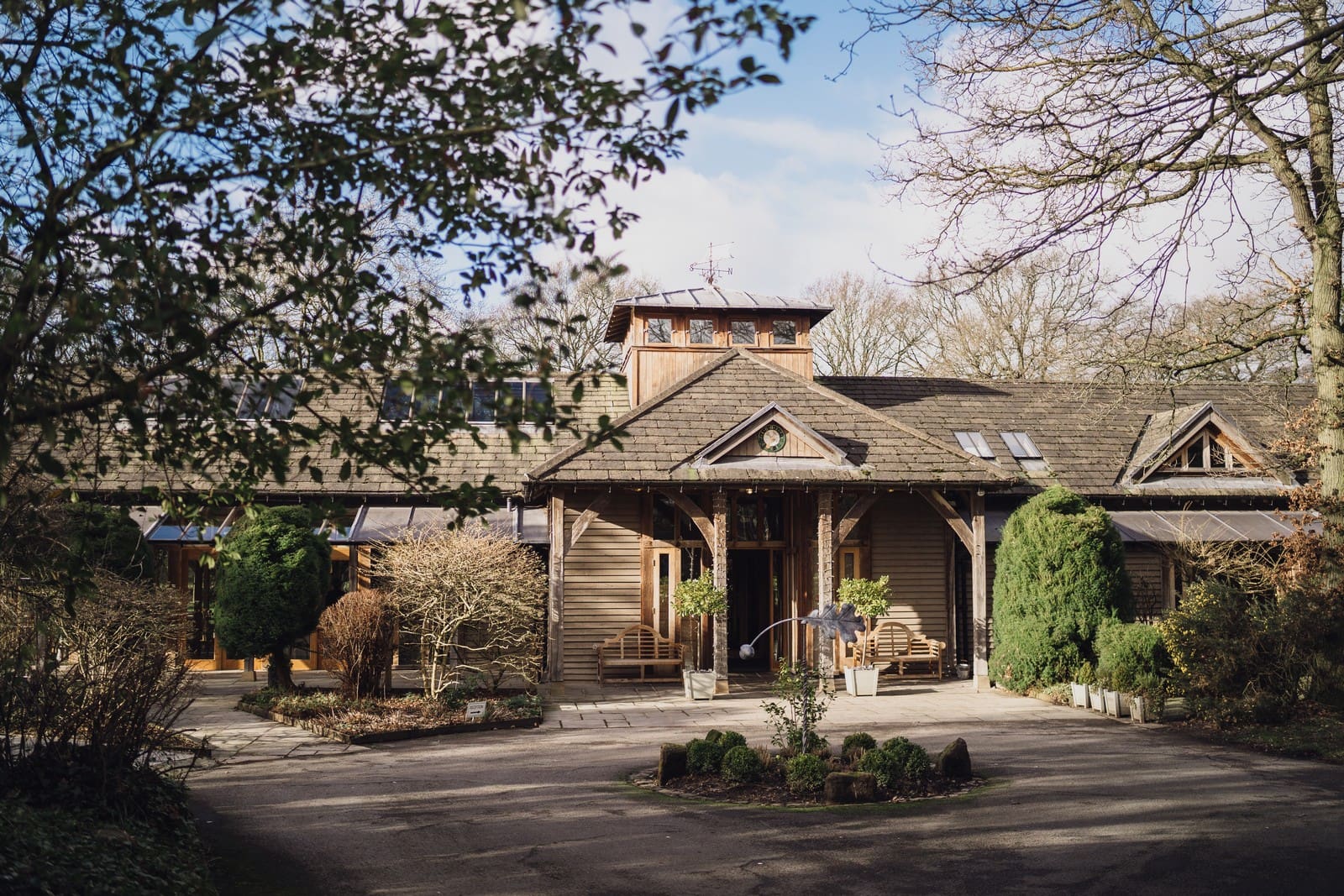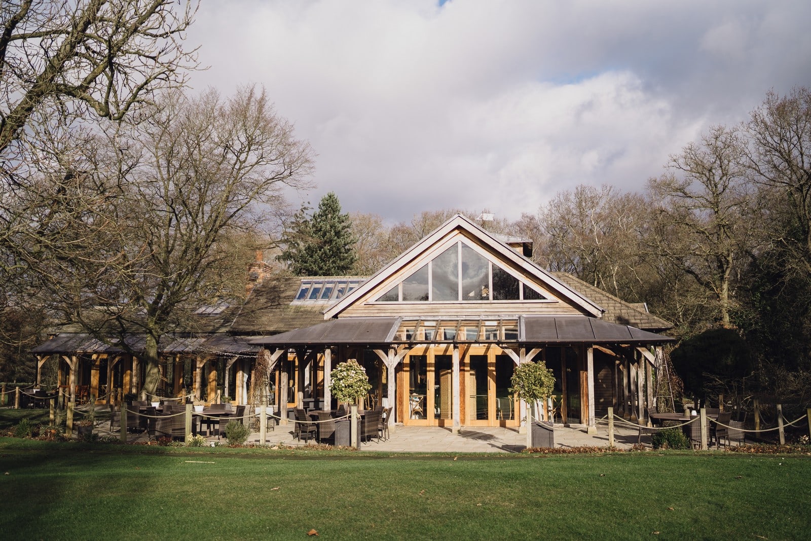 The Oak Tree of Peover is one of the most beautiful barn wedding venues in the country. The 165-acre estate in the heart of Cheshire provides you and your guests complete tranquillity in glorious parkland. Both the Acorn Lounge and Ladybird Room are licensed for civil ceremonies. As your guests start to take their seats, the stunning floor to ceiling windows flood the room with natural light while the high ceilings draw your eyes up to the exposed oak beams. In the warmer months, the Outdoor Pavilion also offers the perfect setting to say, “I do”. Your guests will be seated on handmade wooden benches surrounded by the beautiful surroundings as they await the bridal party. They have a close working relationship with several carefully selected approved caterers. As they all offer their own unique service, they will be sure to match you with the one that best suits your tastes and individual requirements. Surrounded by picturesque countryside the natural beauty of The Oak Tree of Peover is enhanced by the venue’s thoughtful landscaping. While your guests enjoy some refreshments on the stone flagged terrace.