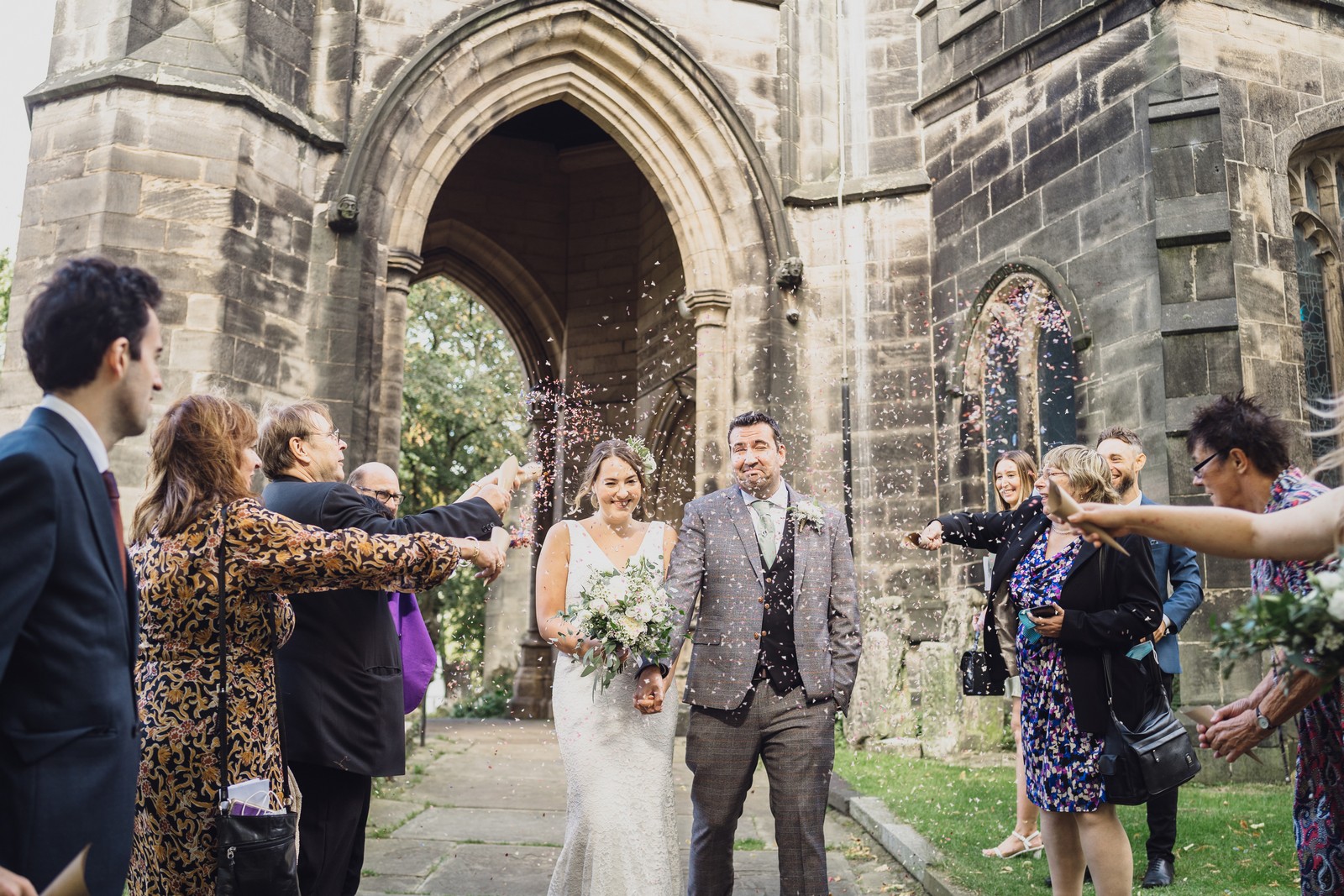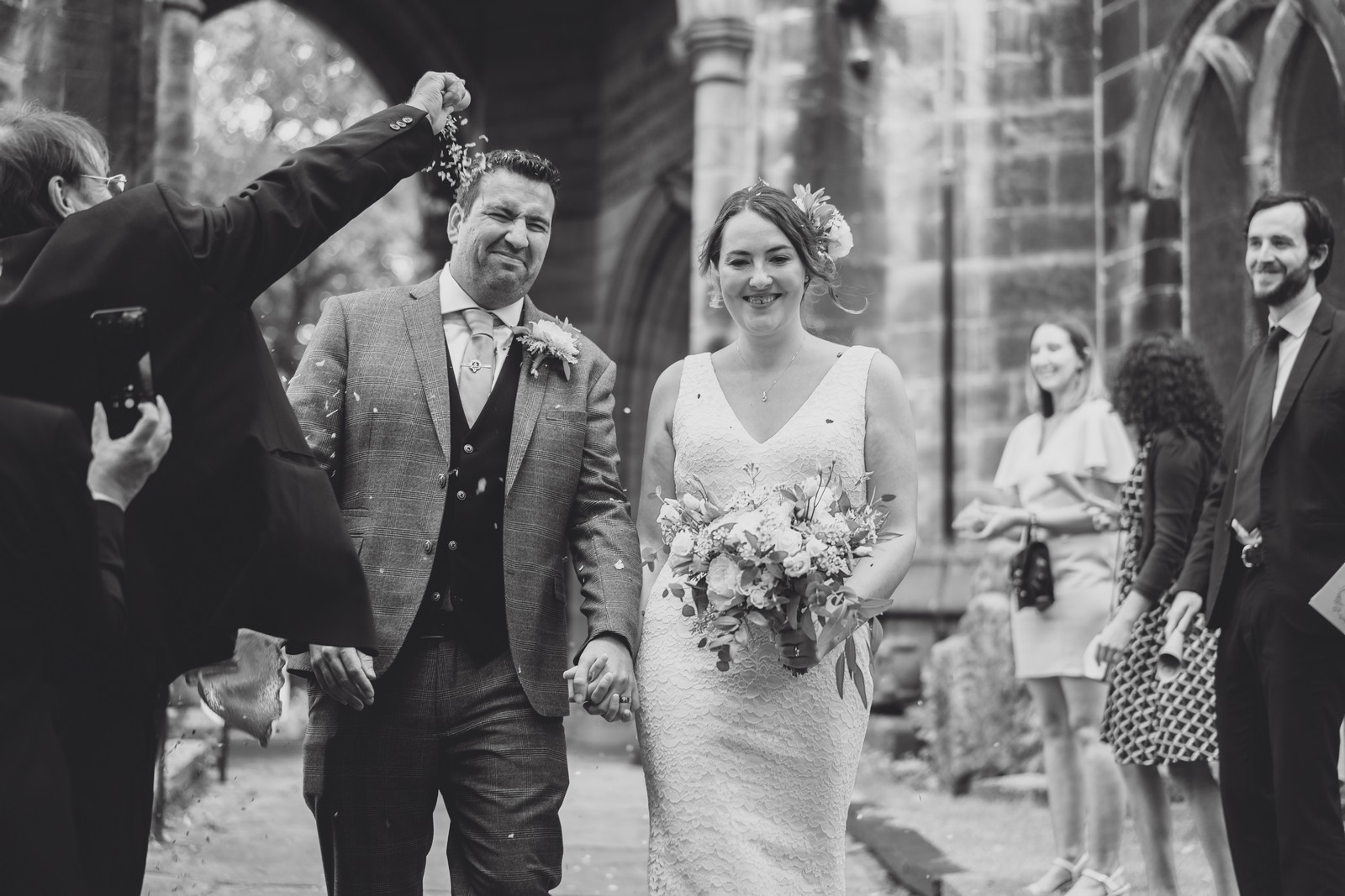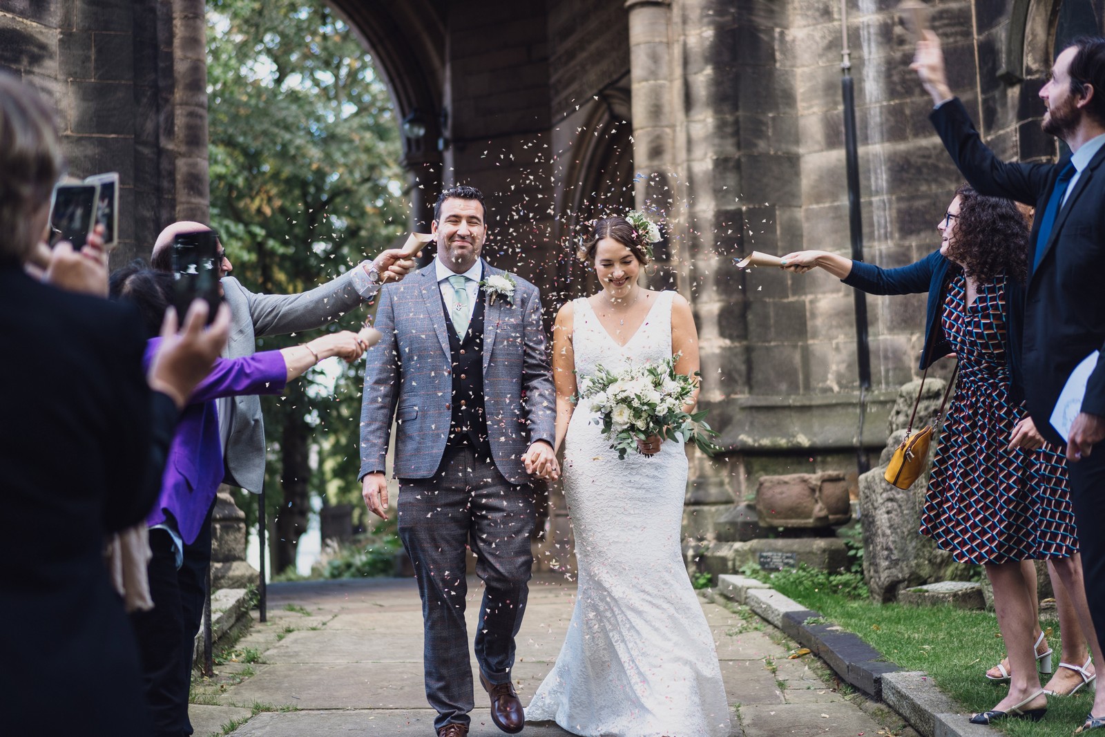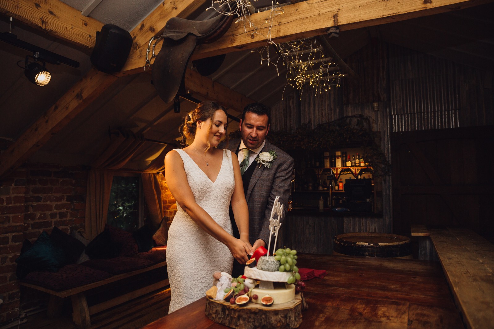 The couple who married at St Mary’s church in Sandbach were keen to do all the normal wedding traditions despite the pandemic so we did an epic confetti throw outside the church. They arrived at The Old Doghouse Barn which is part of the Three Greyhounds pub for their reception in a vintage Bentley which looked so elegant against the beautifully rustic venue in Allostock near Knutsford. There was plenty of room inside for Charlotte and Phil’s friends and family to celebrate their union and I loved the dried flower garlands that adorned the brick arches and exposed beams.