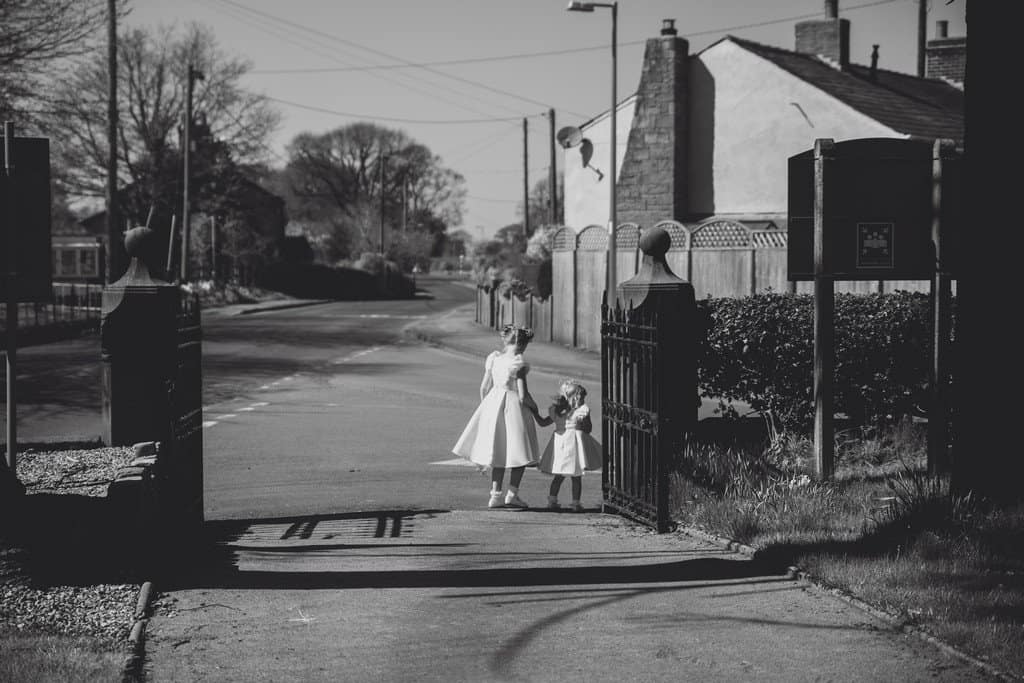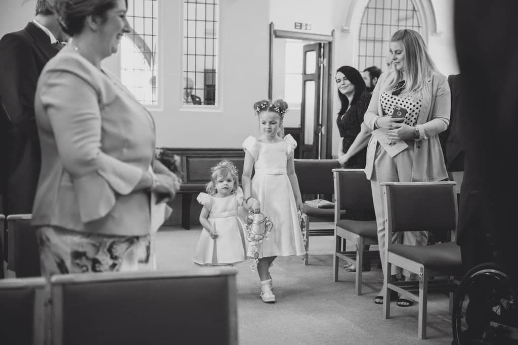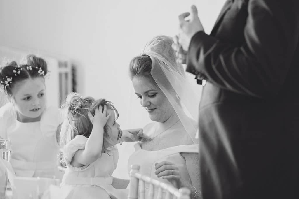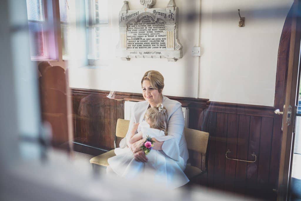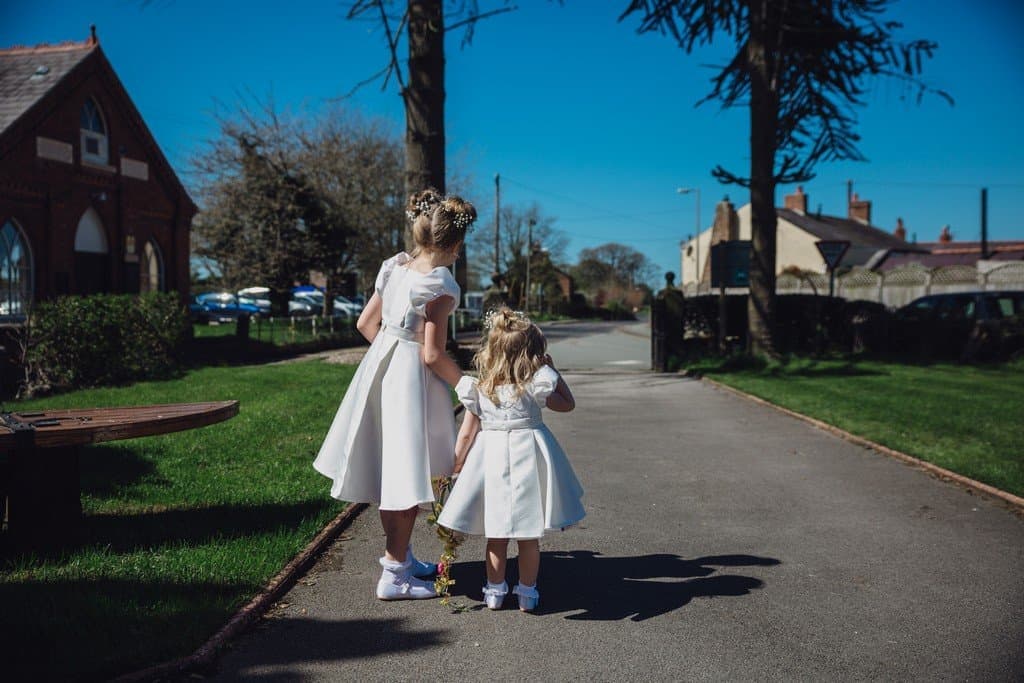 I had such a great time capturing Beki and Chris’s big day, these childhood friends had a brilliant spring wedding day at Trafford Hall near Chester. Beki looked absolutely gorgeous, she wore an elegant fifties/sixties style full length dress (made by herself may I add!) with the cutest bow details with her hair styled in a perfect updo with veil. She looked incredible. They chose a spring wedding at Trafford Hall as Beki loves daffodils and all the flowers on the day were bright spring florals to celebrate the time of year and to fit in with multi coloured theme their daughters chose for them. Luckily the spring weather decided to play along too and it was a divine blue sky day.