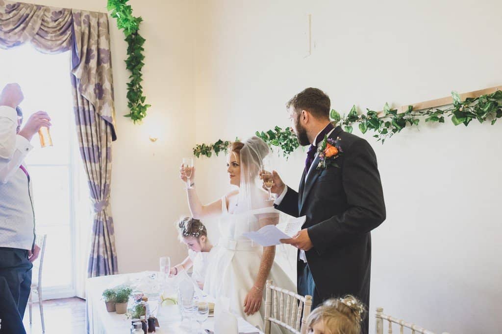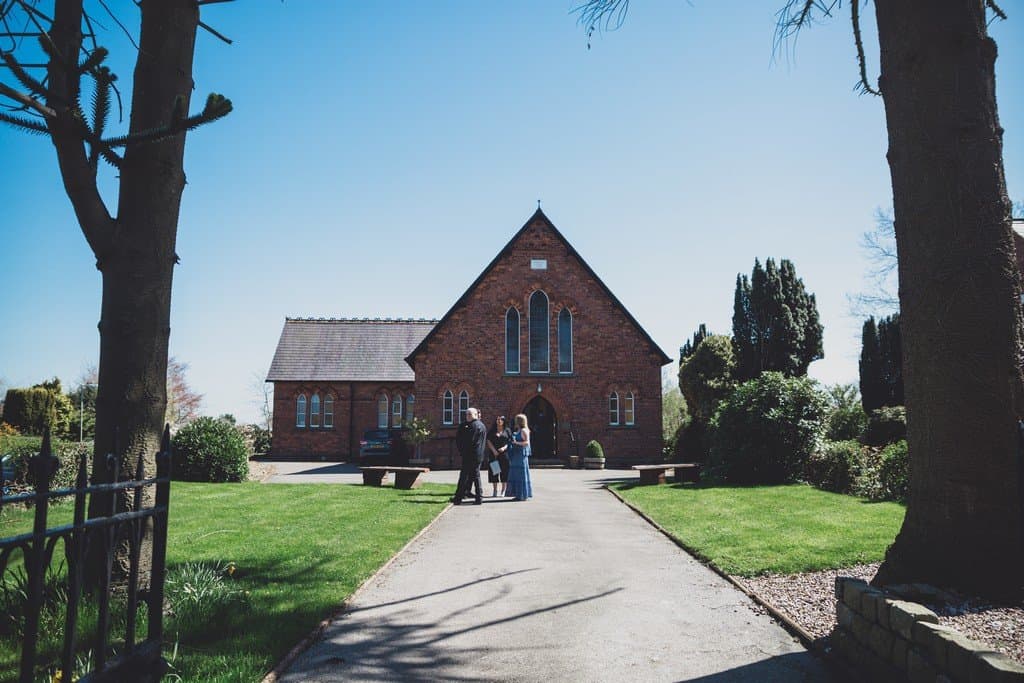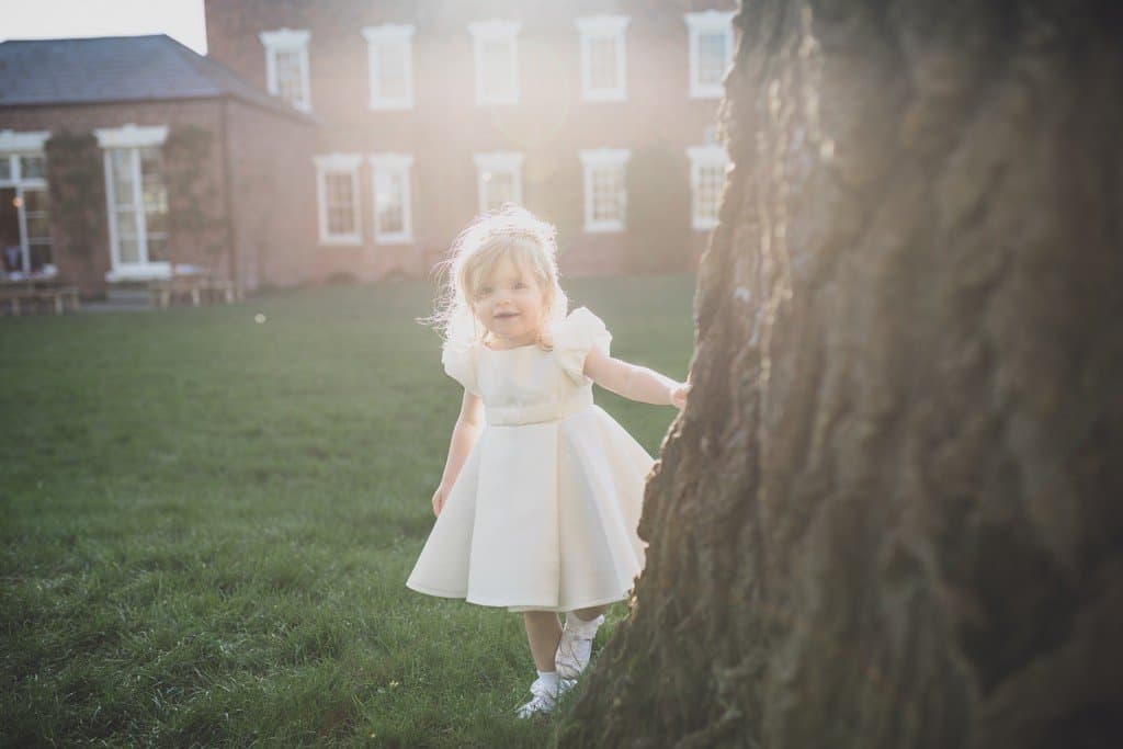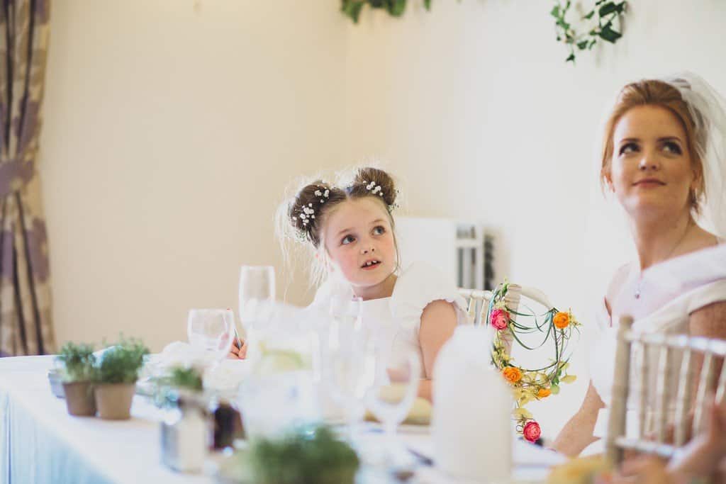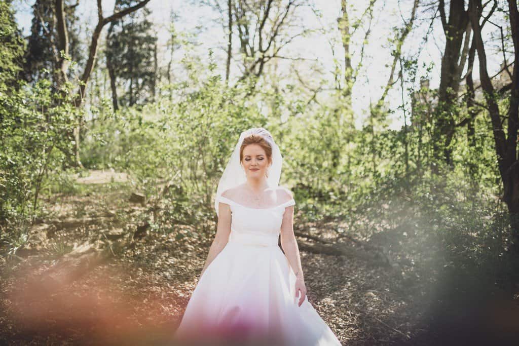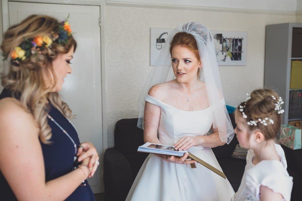 I had such a great time capturing Beki and Chris’s big day, these childhood friends had a brilliant spring wedding day at Trafford Hall near Chester. Beki looked absolutely gorgeous, she wore an elegant fifties/sixties style full length dress (made by herself may I add!) with the cutest bow details with her hair styled in a perfect updo with veil. She looked incredible. They chose a spring wedding at Trafford Hall as Beki loves daffodils and all the flowers on the day were bright spring florals to celebrate the time of year and to fit in with multi coloured theme their daughters chose for them. Luckily the spring weather decided to play along too and it was a divine blue sky day.